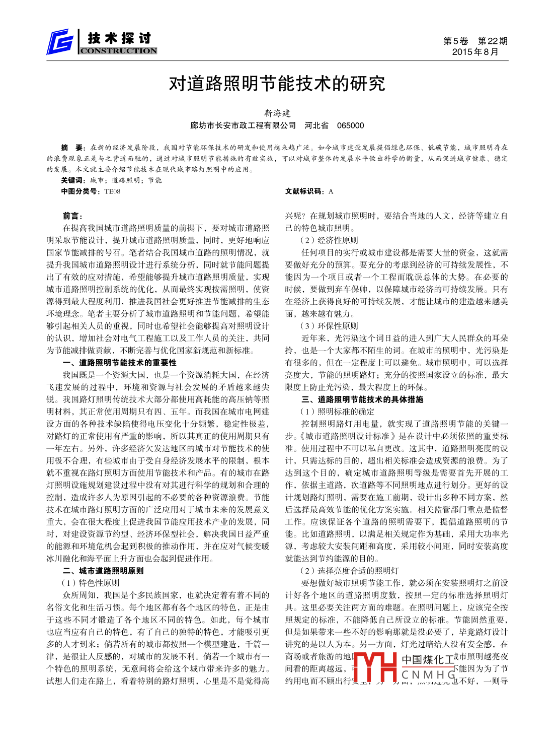 后L技術(shù)探過(guò)第5卷第22期CONSTRUCTION2015年8月對(duì)道路照明節(jié)能技術(shù)的研究靳海建廊坊市長(zhǎng)安市政工程有限公司河北省065000摘要:在新的經(jīng)濟(jì)發(fā)展階段,我國(guó)對(duì)節(jié)能環(huán)保技術(shù)的硏發(fā)和使用越來(lái)越廣泛。如今城市建設(shè)發(fā)展提偈録色環(huán)保、低碳節(jié)能,城市照明存在的浪費(fèi)現(xiàn)象正是與之背道而馳的,通過(guò)對(duì)堿市照眀明節(jié)能措施的有效實(shí)施,可以對(duì)城市整伓的發(fā)展水平攽岀科學(xué)的衡量,從而促進(jìn)城市健康、穩(wěn)定的發(fā)展。本文就主要介紹節(jié)能技術(shù)在現(xiàn)代堿市路燈照明中的應(yīng)用。關(guān)鍵詞:城市;道路照明;節(jié)能中圖分類號(hào):TEO8文獻(xiàn)標(biāo)識(shí)碼:A前言興呢?在規(guī)劃城市照明時(shí),要結(jié)合當(dāng)?shù)氐娜宋?經(jīng)濟(jì)等建立自在提高我國(guó)城市道路照明質(zhì)量的前提下,要對(duì)城市道路照已的特色城市照明明采取節(jié)能設(shè)計(jì),提升城市道路照明質(zhì)量,同時(shí),更好地響應(yīng)(2)經(jīng)濟(jì)性原則國(guó)家節(jié)能減排的號(hào)召。筆者結(jié)合我國(guó)城市道路的照明情況,就任何項(xiàng)目的實(shí)行或城市建設(shè)都是需要大量的資金,這就需提升我國(guó)城市道路照明設(shè)計(jì)進(jìn)行系統(tǒng)分析,同時(shí)就節(jié)能問(wèn)題提要做好充分的預(yù)算。要充分的考慮到經(jīng)濟(jì)的可持續(xù)發(fā)展性,不岀了有效的應(yīng)對(duì)措施,希望能夠提升城市道路照明質(zhì)量,實(shí)現(xiàn)能因?yàn)橐粋€(gè)項(xiàng)目或者一個(gè)工程而耽誤總體的大勢(shì)。在必要的城市道路照明控制系統(tǒng)的優(yōu)化,從而最終實(shí)現(xiàn)按需照明,使資時(shí)候,要做到棄車(chē)保帥,以保障城市經(jīng)濟(jì)的可持續(xù)發(fā)展。只有源得到最大程度利用,推進(jìn)我國(guó)社會(huì)更好推進(jìn)節(jié)能減排的生態(tài)在經(jīng)濟(jì)上獲得良好的可持續(xù)發(fā)展,才能讓城市的建造越來(lái)越美環(huán)境理念。筆者主要分析了城市道路照明和節(jié)能問(wèn)題,希望能麗,越來(lái)越有魅力夠引起相關(guān)人員的重視,同時(shí)也希望社會(huì)能夠提高對(duì)照明設(shè)計(jì)(3)環(huán)保性原則的認(rèn)識(shí),增加社會(huì)對(duì)電氣工程施工以及工作人員的關(guān)注,共同近年來(lái),光污染這個(gè)詞日益的進(jìn)入到廣大人民群眾的耳朵為節(jié)能減排做貢獻(xiàn),不斷完善與優(yōu)化國(guó)家新規(guī)范和新標(biāo)準(zhǔn)。拎,也是一個(gè)大家都不陌生的詞。在城市的照明中,光污染是道路照明節(jié)能技術(shù)的重要性有很多的,但在一定程度上可以避免。城市照明中,可以選擇我國(guó)既是一個(gè)資源大國(guó),也是一個(gè)資源消耗大國(guó),在經(jīng)濟(jì)亮度大,節(jié)能的照明路燈;充分的按照國(guó)家設(shè)立的標(biāo)準(zhǔn),最大飛速發(fā)展的過(guò)程中,環(huán)境和資源與社會(huì)發(fā)展的矛盾越來(lái)越尖限度上防止光污染,最大程度上的環(huán)保銳。我國(guó)路燈照明傳統(tǒng)技術(shù)大部分都使用高耗能的高壓鈉等照三、道路照明節(jié)能技術(shù)的具體措施明材料,其正常使用周期只有四、五年。而我國(guó)在城市電網(wǎng)建(1)照明標(biāo)準(zhǔn)的確定設(shè)方面的各種技術(shù)缺陷使得電壓變化十分頻繁,穩(wěn)定性極差,控制照明路燈用電量,就實(shí)現(xiàn)了道路照明節(jié)能的關(guān)鍵對(duì)路燈的正常使用有嚴(yán)重的影響,所以其真正的使用周期只有步?!冻鞘械缆氛彰髟O(shè)計(jì)標(biāo)準(zhǔn)》是在設(shè)計(jì)中必須依照的重要標(biāo)年左右。另外,許多經(jīng)濟(jì)欠發(fā)達(dá)地區(qū)的城市對(duì)節(jié)能技術(shù)的使準(zhǔn)。使用過(guò)程中不可以私自更改。這其中,道路照明亮度的設(shè)用極不合理,有些城市由于受自身經(jīng)濟(jì)發(fā)展水平的限制,根本計(jì),只需達(dá)標(biāo)的目的,超出相關(guān)標(biāo)準(zhǔn)會(huì)造成資源的浪費(fèi)。為了就不重視在路燈照明方面使用節(jié)能技術(shù)和產(chǎn)品。有的城市在路達(dá)到這個(gè)目的,確定城市道路照明等級(jí)是需要首先開(kāi)展的工燈照明設(shè)施規(guī)劃建設(shè)過(guò)程中沒(méi)有對(duì)其進(jìn)行科學(xué)的規(guī)劃和合理的作,依據(jù)主道路,次道路等不同照明地點(diǎn)進(jìn)行劃分。更好的設(shè)控制,造成許多人為原因引起的不必要的各種資源浪費(fèi)。節(jié)能計(jì)規(guī)劃路燈照明,需要在施工前期,設(shè)計(jì)出多種不同方案,然技術(shù)在城市路燈照明方面的廣泛應(yīng)用對(duì)于城市未來(lái)的發(fā)展意義后選擇最高效節(jié)能的優(yōu)化方案實(shí)施。相關(guān)監(jiān)管部門(mén)重點(diǎn)是監(jiān)督重大,會(huì)在很大程度上促進(jìn)我國(guó)節(jié)能應(yīng)用技術(shù)產(chǎn)業(yè)的發(fā)展,同工作。應(yīng)該保證各個(gè)道路的照明需要下,提倡道路照明的節(jié)時(shí),對(duì)建設(shè)資源節(jié)約型、經(jīng)濟(jì)環(huán)保型社會(huì),解決我國(guó)日益嚴(yán)重能。比如道路照明,以滿足相關(guān)規(guī)定作為基礎(c