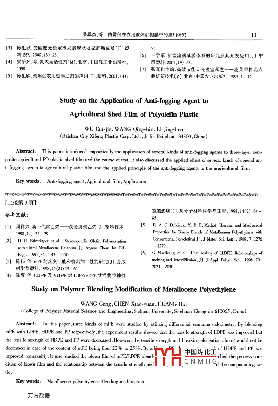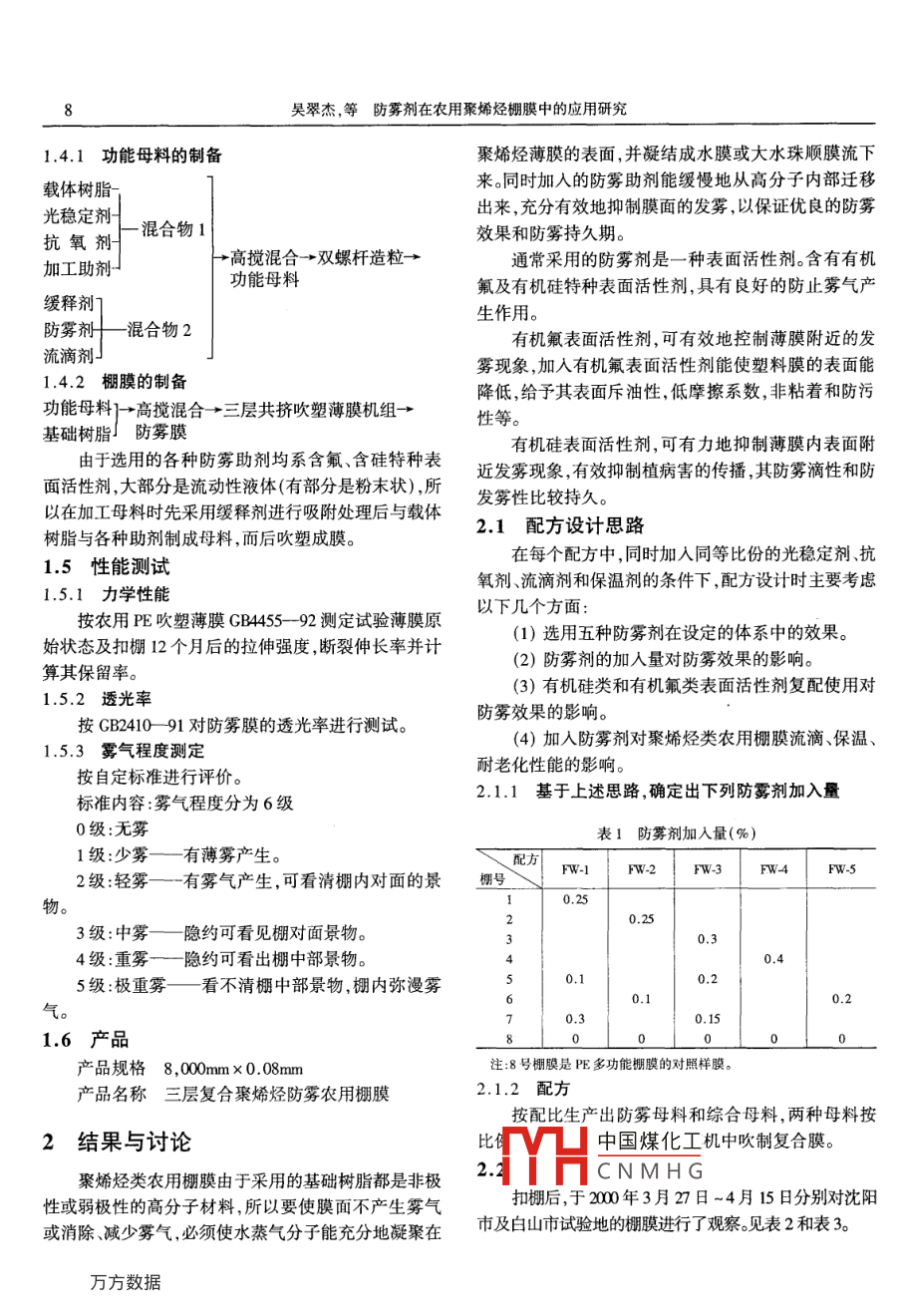 №3(Sum.149)塑料科技June 2002PLASIICS SCI. TECHNOLOGY文章編號:1005-3360(2002)43-0007-05防霧劑在農(nóng)用聚烯烴棚膜中的應(yīng)用硏究吳翠杰,王慶斌,李靜華(白山市喜豐塑料股份有限公司,吉林白山市134300)摘要:著重介紹幾種防霧劑在三層復(fù)合聚烯烴農(nóng)用棚膜中的應(yīng)用及試驗研究過程,并討論了幾種特種防霧劑在農(nóng)用棚膜中的應(yīng)用效果,對農(nóng)膜用防霧劑的應(yīng)用原理等進(jìn)行了探討關(guān)鍵詞:防霧劑;農(nóng)膜;應(yīng)用中圖分類號:TQ927.8320.721文獻(xiàn)標(biāo)識碼:B農(nóng)用棚膜在使用過程中,由于受外界氣候變化的d=0.927gcm3影響以及棚內(nèi)外溫度、濕度的變化,可導(dǎo)致棚內(nèi)產(chǎn)生霧EVA14-0.7VA含量14%MR=0.7g氣10min d=0.937g/cm棚內(nèi)產(chǎn)生霧氣主要發(fā)生于早春和晚秋季節(jié),而且EVA90.7VA含量9%MHR=0.71g/ 10min以早晨和傍晚最為嚴(yán)重。這主要是由于塑料大棚內(nèi)、外d=0.920g/cm3溫度變化大,在外界冷空氣作用下,膜內(nèi)表面附近空間防老化劑 Tinui622 Chimassorb944相對濕度超過飽蒸汽壓,使水蒸氣分子遇到冷空氣達(dá)抗氧劑B215B900到飽和凝固點從而形成微小的顆粒霧氣。當(dāng)外界溫度保溫劑1250目硅藻土、2500目滑石粉變化后膜面霧氣向棚內(nèi)空間擴(kuò)散并隨著飽和蒸汽壓的流滴劑FY-2GF1升高而逐漸消失。防霧劑FW-1#FW2#FW3#FW4#消除霧氣或防止霧氣的產(chǎn)生可改善農(nóng)民的作業(yè)環(huán)FW-5#境減少農(nóng)作物的病蟲害,特別是對葉類作物尤為重1.2主要儀器和設(shè)備要,提高棚膜的透光率,促進(jìn)作物的光合作用,增產(chǎn)增SJ-120×3三層共擠吹塑大連橡塑機(jī)廠收薄膜機(jī)組本文將著重介紹幾種防霧劑在三層復(fù)合聚烯烴農(nóng)WGTS霧度透光率測定儀上海物理光學(xué)儀器廠用棚膜中的應(yīng)用及試驗研究過程。流滴測試儀農(nóng)膜學(xué)會制作霧氣觀察儀自制1試驗部分拉力試驗機(jī)吉林大學(xué)科教試驗廠13扣棚時間地點1.1試驗原料試驗地點:沈陽試驗基地LDE大慶石化公司18DM=1.5g/l0mind白山市試驗點0.919g/c大棚結(jié)構(gòu):鍍鋅管骨架標(biāo)準(zhǔn)大棚L(fēng)LDPE吉化公司DFDA_7042=2.0g/試驗棚數(shù):16個10mnd=0.919g/cm中國煤化EvA北京有機(jī)化工廠EVA503VA含量5%MFR=0.34g/10mn1.4CNMHG收稿日期:2001-1217吳翠杰等防霧劑在農(nóng)用聚烯烴棚膜中的應(yīng)用研究1.4.1功能母料的制備聚烯烴薄膜的表面,并凝結(jié)成水膜或大水珠順膜流下載體樹脂來。同時加入的防霧助劑能緩慢地從高分子內(nèi)部遷移光穩(wěn)定劑出來,充分有效地抑制膜面的發(fā)霧,以保證優(yōu)良的防霧抗氧劑一混合物1效果和防霧持久期。加工助劑高攪混合→雙螺桿造?!ǔ2捎玫姆漓F劑是一種表面活性劑。含有有機(jī)功能母料氟及有機(jī)硅特種表面活性劑,具有良好的防止霧氣產(chǎn)緩釋劑生作用。防霧混合物2有機(jī)氟表面活性劑,可有效地控制薄膜附近的發(fā)流滴劑霧現(xiàn)象,加入有機(jī)氟表面活性劑能使塑料膜的表面能1.4.2梱膜的制備降低,給予其表面斥油性,低摩擦系數(shù),非粘著和防污功能母料}→高攪混合→三層共擠吹塑薄膜機(jī)組→性等基礎(chǔ)樹脂」防霧膜有機(jī)硅表面活性劑,可有力地抑制薄膜內(nèi)表面附由于選用的各種防霧助劑均系含氟、含硅特種表近發(fā)霧現(xiàn)象有效抑制植病害的傳播,其防霧滴性和防面活性劑,大部分是流動性液體(有部分是粉末狀),所發(fā)霧性比較持久。以在加工母料時先采用緩釋劑進(jìn)行吸附處理后與載體樹脂與各種助劑制成母料,而后吹塑成膜。2.1配方設(shè)計思路15性能測試在每個配方中,同時加入同等比份的光穩(wěn)定劑、抗1.5.1力學(xué)性能氧劑、流滴劑和保溫劑的條件下,配方設(shè)計時主要考慮按農(nóng)用PE吹塑薄膜GB45592測定試驗薄膜原以下幾個方面:始狀態(tài)及扣棚12個月后的拉伸強(qiáng)度,斷裂伸長率并計(1)選用五種防霧劑在設(shè)定的體系中的效果。算其保留率(2)防霧劑的加入量對防霧效果的影響。1.5.2透光率(3)有機(jī)硅類和有機(jī)氟類表面活性劑復(fù)配使用對按GB241091對防霧膜的透光率進(jìn)行測試防霧效果的影響15.3霧氣程度測定(4)加入防霧劑對聚烯烴類農(nóng)用棚膜流滴、保溫按自定標(biāo)準(zhǔn)進(jìn)行評價耐老化性能的影響。標(biāo)準(zhǔn)內(nèi)容霧氣程度分為6級2.1.1基于上述思路,確定出下列防霧劑加入量0級:無霧表1防霧劑加入量(%1級:少霧—有薄霧產(chǎn)生。2級:輕霧—有霧氣產(chǎn)生,可看清棚內(nèi)對面的景棚號FW-1FW-2FW-3FW-4FW-5物。0.253級:中霧—隱約可看見棚對面景物。4級:重霧——隱約可看出棚中部景物。5級:極重霧—看不清棚中部景物,棚內(nèi)彌漫霧570.1516產(chǎn)品產(chǎn)品規(guī)格8,00m×0.08mm注:8號棚膜是PE多功能棚膜的對照樣膜。產(chǎn)品名稱三層復(fù)合聚烯烴防霧農(nóng)用棚膜配方按配比生產(chǎn)出防霧母料和綜合母料,兩種母料按2結(jié)果與討論聚烯烴類農(nóng)用棚膜由于采用的基礎(chǔ)樹脂都是非極2.H中國煤化工機(jī)中吹制復(fù)合膜。CNMHG性或弱極性的高分子材料,所以要使膜面不產(chǎn)生霧氣扣棚后,于0003月27日-4月15日分別對沈陽或消除減少霧氣,必須使水蒸氣分子能充分地凝聚在市及白山市試驗地的棚膜進(jìn)行了觀察。見表2和表3吳翠杰,等防霧劑在農(nón
