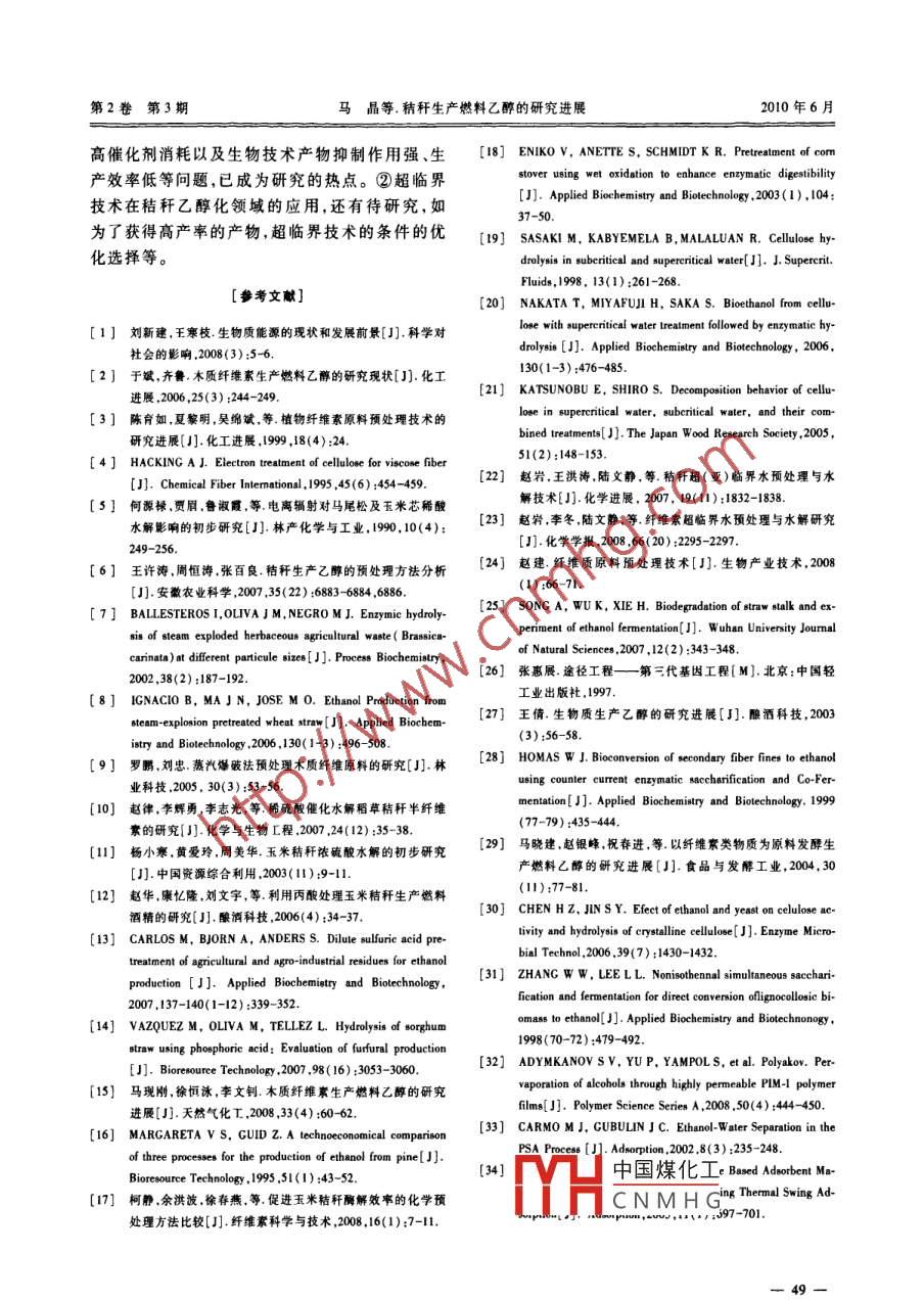 第2卷第3期環(huán)境監(jiān)挖與預(yù)警Vol.2, No.32010年6月Environmental Monitoring and F orewarningJune 2010●控制技術(shù)●doi: 10. 3969/j. isn. 1674-6732. 2010.03. 012秸稈生產(chǎn)燃料乙醇的研究進(jìn)展馬晶, 張鑒達(dá),申哲民(上海交通大學(xué)環(huán)境科學(xué)與工程學(xué)院,上海200240)摘要:稍稈的化學(xué)成分復(fù)雜 ,主要由纖維素、半纖維素和木質(zhì)素三大部分組成。經(jīng)過預(yù)處理、發(fā)酵和脫水可生成燃料乙醇,秸稈乙醇化技術(shù)已經(jīng)備受關(guān)注。針對(duì)預(yù)處理、發(fā)酵和脫水3個(gè)過程的多種化學(xué)或生物技術(shù)的研究進(jìn)展進(jìn)行了分析,同時(shí)也指出其不足。秸稈預(yù)處理中的超臨界技術(shù)雖然設(shè)備制造成本高,但在秸稈資源化中與傳統(tǒng)技術(shù)相比顯示了獨(dú)特的優(yōu)勢(shì),具有反應(yīng)迅速、無需催化劑、無產(chǎn)物抑制等優(yōu)點(diǎn)。關(guān)鍵詞:秸稈;乙醇;預(yù)處理;發(fā)酵;脫水;超臨界中團(tuán)分類號(hào):X71文獻(xiàn)標(biāo)識(shí)碼:A文章編號(hào): 1674-6732(2010)-03-0045-05Advancement of Research on Fuel Ethanol by StrawMA Jing, ZHANG Jian-da, SHEN Zhe-min( School of Environmental Science and Engineering, Shanghai Jiao Tong University, Shanghai 200240, China) .ABSTRACT: In the current cirumstances of energy shortage. the straw , abundant and renewable reources, has great developmentpotential. Straw ethanol production technology has caused widespread concem . Ethanol can be obtained by pretreatment, fermenta-tion and dehydration of straw. Al present, a variety of chemical or biological technologies have been carried out for these threeprocesses, and to be sccessful. This paper outlined the technical progress in these processes, but also pointed out the shortcomingsof some techniceal. At pretreatment, the supereritical technology in the resoureilization technologies of straw demonstrates the uniqueadvantages over traditional technologies, such as not requiring additional catalyst, much higher reaction rate , and no inhibitory reac-tion of product. However there are still some difculie.KEY WORDS: straw; ethanol; pretreatment; fermentaion; dehydration; supercritical0引言子黏合劑結(jié)合在纖維素和木質(zhì)素之間,而木質(zhì)素具生物質(zhì)能源具有存量豐富、環(huán)境友好、可再生有的網(wǎng)狀結(jié)構(gòu),作為支撐骨架包圍并加固纖維素和等特點(diǎn),作為可轉(zhuǎn)化為液體燃料的可再生資源,正半纖維素。纖維索本身的線性巨分子結(jié)構(gòu)使其具日益受到重視,已經(jīng)成為新的研究熱點(diǎn)和投資熱有高度結(jié)晶和難溶性,而且受難降解高聚物木質(zhì)素點(diǎn)。目前,發(fā)達(dá)國(guó)家每年消耗的能源有3%左右來的包裹作用使纖維素難以溶于水解溶劑或與酶接自生物質(zhì)能,而發(fā)展中國(guó)家生物質(zhì)能利用約占這些觸,因此必須采用一定的預(yù)處理手段,使纖維素、半國(guó)家能源消耗的35%“。利用生物質(zhì)制取液體燃纖維素、木質(zhì)素分離開,切斷它們的氫鍵,破壞晶體料的技術(shù)具有光明的發(fā)展前景,其中含木質(zhì)纖維素結(jié)構(gòu),降低聚合度2。的作物秸稈是生產(chǎn)原料酒精的一個(gè)重要來源。作目前,秸稈預(yù)處理的方法主要有物理預(yù)處理物秸稈通常指小麥、水稻、玉米、薯類、油料、棉花、法、化學(xué)預(yù)處理法、生物預(yù)處理法。甘蔗和其他農(nóng)作物收獲子實(shí)后的廢棄物。中國(guó)農(nóng)1.1 物理預(yù)處理法作物秸稈產(chǎn)量約為7億t/a,居世界首位。1.1.1 機(jī)械粉碎農(nóng)作物秸稈經(jīng)過預(yù)處理發(fā)酵和脫水可生成可機(jī)械粉碎主要是利用球磨、振動(dòng)磨、輥筒等將秸燃乙醇,筆者對(duì)相關(guān)的研究進(jìn)展進(jìn)行概述。稈進(jìn)考仍然保留,但木中國(guó)煤化工CNMHG1秸稈預(yù)處理TH作物秸稈的化學(xué)成分復(fù)雜,主要由纖維素、半作者簡(jiǎn)介:馬晶(1986-) ,女,在讀碩士研究生,主要從事環(huán)境纖維素和木質(zhì)素3大部分組成。半纖維素作為分工程和秸桿資源化利用技術(shù)的研究。第2卷第3期馬晶等. 秸稈生產(chǎn)燃料乙醇的研究進(jìn)展2010年6月質(zhì)素和半纖維素與纖維素的結(jié)合層被破壞,其間的有效的木質(zhì)纖維高效分離技術(shù)。但蒸汽爆破法的聚合度降低,纖維素的結(jié)晶構(gòu)造改變。機(jī)械粉碎在高溫高壓蒸汽使部分半纖維素的乙?;?生成成分的量沒有發(fā)生變化的情況下,提高了物料后續(xù)的乙酸、糠醛酸等能夠催化半纖維素繼續(xù)水解生成反應(yīng)的接觸面積,因此粉碎處理可以提高反應(yīng)性能.糠醛等物質(zhì),易導(dǎo)致木糖大量損失,達(dá)50%以和提高水解糖化率,有利于酶解過程中纖維素酶或木質(zhì)索酶的進(jìn)攻。但是粉碎處理的高糖化率的程度1.2 化學(xué)預(yù)處理方法有限,耗能大,其能耗占工藝過程總能耗的50% ~1.2.1 濃酸預(yù)處理法60% ,而且有些材料還是不適合粉碎處理的”。濃酸水解中,纖維素首先在濃酸作用下迅速溶1.1.2 高能輻射.解,然后在溶液中進(jìn)行水解反應(yīng)。纖維素經(jīng)濃酸處.高能輻射是利用高能射線如電子射線Y射線理后形成纖維索糊精,變得易于水解成單糖,但由來對(duì)纖維素原料進(jìn)行預(yù)處理,以獲得所期望的纖維于水分不足,濃酸吸收水分,單糖又可能生成多糖,素聚合度和增加纖維素的