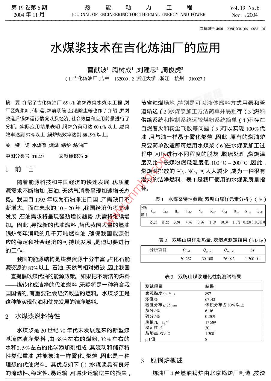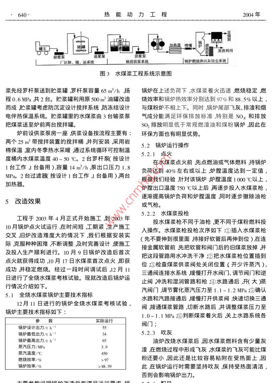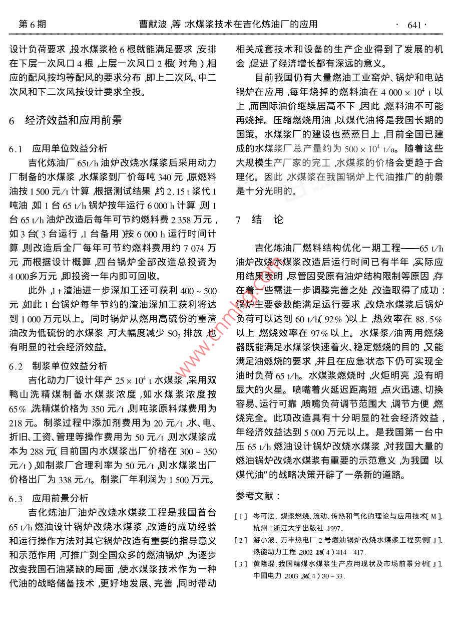 第19卷第6期熱能動力工程Vol. 19 No 62004年11月JOURNAL OF ENGINEERING FOR THERMAL ENERGY AND POWERNov.,2004文章編號:001-206(2004)6-0638-04水煤漿技術(shù)在吉化煉油廠的應用曹獻波'陶樹成劉建忠2周俊虎ˉ1.吉化煉油廠吉林132000;2.浙江大學,浙江杭州310027)摘要介紹了吉化煉油廠65υh油爐改燒水煤漿工程對節(jié)省貯煤場地特別是可以液體燃料方式用泵和管廠區(qū)煤漿卸、儲、運、爐前系統(tǒng)出渣除塵等也作了介紹并對道輸送(2冰煤漿加工方法簡單并易貯存(3)燃料改造后鍋爐運行情況以及經(jīng)濟、社會效益和應用前景進行了供給系統(tǒng)和控制系統(tǒng)遠較煤粉系統(tǒng)簡單(4)不存在分析。實際應用結(jié)果表明鍋爐負荷可達60h以上燃燒自燃著火和粉塵飛散等問題(5)河以實現(xiàn)100%代效率達到卯%以上鍋爐熱效率達到88.5%以上。油且與油一樣易于霧化燃燒因此原有的燃油爐關(guān)鍵詞水煤漿燃燒鍋爐煉油廠只要簡單改造即可燃用水煤漿(6在水煤漿加工過中圖分類號K227文獻標識碼B程中可以進行不同程度的脫灰脫硫處理燃燒溫度又比一般煤粉燃燒溫度低100℃~200℃因此前言燃燒時排放的SO2、NOx可大大減少成為一種很有源需求不斷增加石油天然氣消費呈現(xiàn)加速增長態(tài)今的潔凈燃料。表1是我廠使用的水煤漿質(zhì)量指隨著能源科技和中國經(jīng)濟的快速發(fā)展優(yōu)質(zhì)能潛勢。我國自1993年成為石油凈進口國產(chǎn)需缺口不表1水煤漿特性參數(shù)雙鴨山煤樣元素分析)(%)斷增大。而在未來的10-20年我國經(jīng)濟仍將高速阿ccNOs Oa Si s發(fā)展石油需求將呈現(xiàn)強勁增長趨勢供需將繼續(xù)增加。因此尋找新的代油燃料,替代我國大量的燃油7.2588.523.94.40.%1.0910.3411.720.28830.310鍋爐每年消耗的幾千萬噸燃料油確保我國能源供應的穩(wěn)定和社會經(jīng)濟的可持續(xù)發(fā)展是迫切要進行表2雙鴨山煤樣發(fā)熱量、灰熔點測定結(jié)果(k/kg)的工作。分析項目我國的能源結(jié)構(gòu)是煤炭資源十分豐富占化石能3026730100260921300℃源資源的8%以上石油、天然氣相對短缺因此我國直提倡以煤代油的能源政策。如果把不清潔的燃料表3雙鴨山煤漿理化性能測試結(jié)果煤轉(zhuǎn)化成潔凈的代油燃料無疑將是一種符合我測試項目結(jié)果國國情的、有重要社會經(jīng)濟效益的燃料。水煤漿正是表觀黏度/mPas這種能實現(xiàn)代油和優(yōu)先發(fā)展的潔凈燃料。濃度%67粒度分布≤75m體積分布占80%以上灰分/%6.162水煤漿燃料特性硫分/%0.209熱值/kJk水煤漿是20世紀70年代末發(fā)展起來的新型煤穩(wěn)定性d灰熔點ST/℃300基流體潔凈燃料由68%左右的煤粉、32%左右的H值水和0.5%左右的化學添加劑組成其流動和儲存特性類似重油并能象油一樣霧化、燃燒因此是一種理想的代油燃料。其優(yōu)點如下(1)煤漿具有良好原鍋爐概述的流動性、穩(wěn)定性、易運輸可減少運輸途中的損失,煉油廠4臺燃油鍋爐由北京鍋爐廠制造按渣第6期曹獻波簿水煤漿技術(shù)在吉化煉油廠的應用639油設(shè)計型號為Y-65/3.9-1型。鍋爐采用中壓單燒器該燃燒器為油/水煤漿兩用燃燒器均等布風鍋簡、自然循環(huán)、負壓燃燒、平衡通風、Ⅱ型室內(nèi)布方式,次風噴(即油/水煤漿兩用燃燒器)層,置。爐膛為正方形截面其尺寸為4.5m×4.5m二次風口3層。鍋爐啟動點火時先點燃油或燃料鍋爐采用全懸吊結(jié)構(gòu)利用大直徑下降管集中供水。氣)使爐膛達到一定的溫度水平后再投入水煤漿爐膛為密節(jié)距水冷壁水平煙道及尾部煙道上部布然后逐步增加水煤漿槍減少油槍。為了保證燃油置有過熱器和包墻管。水平煙道里分兩級布置了對時蒸汽參數(shù)和燃瓦斯氣需要保留前墻上排兩個旋流過熱器兩級之間裝設(shè)噴水減溫器以調(diào)節(jié)過熱蒸流燃燒器。根據(jù)燃用水煤漿噴嘴的成功經(jīng)驗及電站汽溫度。經(jīng)濟器為單級布置空預器為臥式尾部垂鍋爐的特點這次改造使用的噴嘴是浙江大學研制井裝有鋼珠除塵及蒸汽消防設(shè)備。原設(shè)計燃燒裝置的撞擊式多級蒸汽霧化型水煤漿噴嘴。為4只重油燃燒器后改為油/氣兩用)分兩排布置在受熱面改造方面過熱器和噴水減溫裝置不于爐室前墻并采用大風箱、切向可動葉片調(diào)風器。作改動,為了提高熱風溫度對經(jīng)濟器和空預器的面鍋爐簡圖見圖1。積和布置進行調(diào)整即在經(jīng)濟器上下兩組之間增加級空預器同時上組經(jīng)濟器去除6排管子增加下高溫級空預器的面積使空預器總面積約增加2000m2改造后的鍋爐示意圖見圖2。此外鍋爐水冷壁和經(jīng)其他受熱面增加吹灰裝置經(jīng)濟器和空預器增加防磨裝置。濟都匚空預器圖1改造前鍋爐示意圖經(jīng)濟原設(shè)計鍋爐的主要技術(shù)參數(shù)(括號內(nèi)數(shù)據(jù)為改燒水煤漿后參數(shù))鍋爐額定蒸發(fā)量65t/(55th)額定蒸汽壓力3.9MPa至電除塵器額定蒸汽溫度450℃(450℃)至撈渣機給水溫度150℃(150℃)冷空氣溫度30°(30℃)圖2改造后鍋爐示意圖排煙溫度1570(148℃)熱空氣溫度220℃(300℃)爐底由原來平爐底改為冷灰斗并增加刮板式鍋爐計算效率91.2%(89.8%)撈渣機。除塵器選用單室三電場靜電除塵器干法燃料種類重泜渣油焦油、瓦斯氣、水煤漿)合利用。出灰經(jīng)刮板送入專用飛灰罐車直接運送并進行綜燃料耗量4891kg/(8890kg/h水煤漿)4.2水