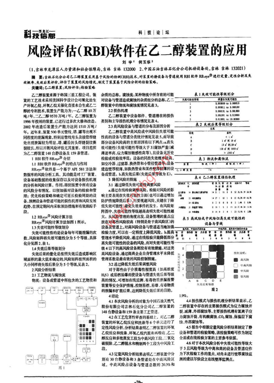 利授愿科|技|論|壇風(fēng)險(xiǎn)評(píng)估(RBn軟件在乙二醇裝置的應(yīng)用劉字1何玉華2(Ⅰ、吉林市龍?zhí)秴^(qū)人力資源和社會(huì)保障局,吉林古林1320002、中國石淘吉林石化分公司機(jī)動(dòng)設(shè)備處,言林吉林132021)摘要:古林石化分公司乙二醇裝置采用基于風(fēng)險(xiǎn)的檢測(cè)(RB技術(shù),對(duì)裝重的靜設(shè)備與管逮使用RI軟件RBy進(jìn)行定量、定性分析及夫斂概率、失效后果評(píng)價(jià),評(píng)估了笮置的風(fēng)險(xiǎn)情況,制定了笨重基于風(fēng)險(xiǎn)分析的檢粒策略關(guān)鍵詞:乙二醇裝置;風(fēng)險(xiǎn)評(píng)估;檢驗(yàn)策略霞的工藝技術(shù)采用科學(xué)設(shè)計(jì)公司氧化法生對(duì)議備與管道收迪的質(zhì)分的總稱乙二類可能性劃分乙二醇裝置來源于韓國三星工程公司。裝雜質(zhì)的總稱。腐蝕流:某種物流中所含有的可能醇的專利技術(shù)裝置生產(chǎn)能力為:乙二醇10萬2拱傷機(jī)理2.0220220:22噸/年,二乙二醇9570萬噸/年。乙二醇裝置為乙二醇裝置中設(shè)備部件、管道潛在的損傷2.9422:2301996年投用的裝置已進(jìn)行過多次大修和改造。類別和主導(dǎo)損傷機(jī)理分布情況見表42002年改造后裝置生產(chǎn)能力達(dá)到150萬噸/23高風(fēng)險(xiǎn)設(shè)備與管道的分布及原因分析表2夾效后果等級(jí)劃分年。近年來裝置500單元管線塔罐等出現(xiàn)不乙二醇裝置中高風(fēng)險(xiǎn)或中風(fēng)險(xiǎn)但失效可能同程度的泄漏現(xiàn)象特別是管線彎頭及接管焊縫性高的設(shè)備與管道分類統(tǒng)計(jì)情況見表5,面導(dǎo)致處出現(xiàn)滑漏較為明足塔罐沿封頭焊縫裂紋撕部分設(shè)備風(fēng)險(xiǎn)高的主要原因有以下兩點(diǎn):高失裂較長(zhǎng)所以開展風(fēng)險(xiǎn)評(píng)估尤其重要。項(xiàng)目范圍效可能性(失效可能性等級(jí)大于3)腐蝕嚴(yán)重(減》:剿》算到10x為乙二醇裝置148臺(tái)靜設(shè)備及159條管道。薄速率高應(yīng)力腐蝕敏感性高等)且設(shè)備無歷史1RB軟件RB~y介紹檢驗(yàn)或檢驗(yàn)效率低;設(shè)備的同類失效概半較高,表3物流和腐飲流RBt軟件RB-8的特點(diǎn)與作用如空冷器過濾器換熱管和小管徑管道等;設(shè)備—x((RBy軟件是一個(gè)基于AP81方法和建造壁厚較薄如換熱管束和某些壁厚較薄的設(shè)x4數(shù)據(jù)庫的風(fēng)險(xiǎn)分析工具,其功能是對(duì)工廠裝置、備或管道。b高失效后果(失效后果等級(jí)為E)設(shè)備基礎(chǔ)數(shù)據(jù)的收集保存以及對(duì)設(shè)備損傷機(jī)理3降低風(fēng)險(xiǎn)的捐施表4乙二醇裝置損傷機(jī)理的分析和風(fēng)險(xiǎn)計(jì)算。作用:得到裝置中所有設(shè)備31通過降低失效可能性調(diào)整風(fēng)險(xiǎn)理;優(yōu)化檢驗(yàn)策略和確定可延長(zhǎng)檢驗(yàn)周期的設(shè)響主要表現(xiàn)在失效可能性方面(也可以通過增加“、,::“認(rèn)的風(fēng)險(xiǎn)分布情況,以便加強(qiáng)對(duì)設(shè)備的檢驗(yàn)和管a通過在線檢驗(yàn)調(diào)整鳳險(xiǎn)。檢驗(yàn)對(duì)風(fēng)險(xiǎn)的影2截趨勢(shì)在預(yù)定期間內(nèi)采取預(yù)防措隨和有效現(xiàn)蹤手低失效可能性,避免失效事件的發(fā)生。在風(fēng)險(xiǎn)矩,3a::;”正,陣圖中失效可能性等級(jí)越高表明失效可能性越1.111作1器12RBs風(fēng)險(xiǎn)計(jì)算方法大。從風(fēng)險(xiǎn)管理的角度出發(fā)設(shè)備管理的重點(diǎn)應(yīng)表5高風(fēng)險(xiǎn)或中風(fēng)險(xiǎn)但高失效可能性的RBe3風(fēng)險(xiǎn)計(jì)算方法如圖1所示。放在對(duì)那些風(fēng)險(xiǎn)較高(特別是處于高風(fēng)險(xiǎn)區(qū))的設(shè)備與管線13失效可能性等級(jí)劃分設(shè)備及管道上對(duì)高風(fēng)險(xiǎn)設(shè)備與管道適當(dāng)?shù)丶訌?qiáng)失效可能性指的是設(shè)備每年可能準(zhǔn)漏的次檢驗(yàn)力度可以在一定程度上降低風(fēng)險(xiǎn),;數(shù)風(fēng)險(xiǎn)矩陣將失效可能性分為5個(gè)等緩,具體管理水平降低風(fēng)險(xiǎn)通過在線檢驗(yàn)只能降低部分,,化分見圖2表1高失效可能性的設(shè)備的風(fēng)險(xiǎn)而對(duì)失效可能性等14失效后果等級(jí)劃分級(jí)4以下的高風(fēng)險(xiǎn)設(shè)備則沒有有效措施對(duì)這類5失效后果的量化是按照失效后造成影響區(qū)高風(fēng)險(xiǎn)設(shè)備通過提高企業(yè)自身管理水平來降低為4域面積的最大值來確定的風(fēng)險(xiǎn)矩陣按照面積的管理系數(shù)是最有效的風(fēng)險(xiǎn)控制措施大小同樣將失效后果分為5個(gè)等級(jí)見表232通過降低失效后果調(diào)整風(fēng)險(xiǎn)□中高風(fēng)除2風(fēng)險(xiǎn)分析結(jié)果對(duì)于那些由于介質(zhì)毒性程度高(如高濃度21工藝物流與腐蝕流HS)或易燃易爆而使設(shè)備與管道失效后果等級(jí)低風(fēng)險(xiǎn)物流:設(shè)備或管道中所包含的工藝物質(zhì)和高的情況可增加在線監(jiān)測(cè)有毒物質(zhì)泄漏報(bào)警失效后策等時(shí)一的微漏擴(kuò)散后果達(dá)到降低失效后果的目的圖24結(jié)論19%41本次風(fēng)險(xiǎn)分析的對(duì)象為中國石油天然氣44損傷模式與損傷機(jī)理分析結(jié)果顯示,乙股份有限公司吉林石化分公司乙二醇裝置的二醉裝置中存在的主要損傷模式為應(yīng)力腐蝕開148臺(tái)靜設(shè)備和159條