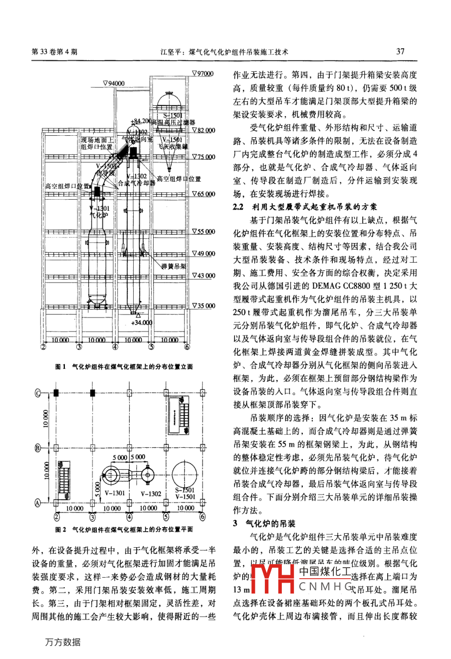 36石油工程建設(shè)2007年8月★)《())日xx5)))))的x5)∈))x三∈))∈)∈★煤氣化氣化爐組件吊裝施工技術(shù)江堅(jiān)平(中國(guó)石化集團(tuán)寧波工程有限公司,浙江寧波315207)摘要:煤氣化關(guān)鍵設(shè)備——?dú)饣癄t組件,其整體形狀呈倒“y”字形,不僅結(jié)構(gòu)復(fù)雜,重量大,吊裝位置高,而且要安裝在煤氣化框架鋼結(jié)構(gòu)內(nèi)部,吊裝難度大。文章結(jié)合湖南岳陽(yáng)、湖北枝江和安徽安慶三套煤氣化項(xiàng)目的吊裝實(shí)踐,介紹了采用1250t大型履帶式起重機(jī)作為吊裝主機(jī)具,采用250t履帶式起重機(jī)作為溜尾吊車(chē),將氣化爐組件分為三大吊裝單元,分別吊裝就位的施工方法。實(shí)踐證明,該方法與利用傳統(tǒng)的門(mén)架吊裝相比,工期短,更方便,更快捷,安全性更高。關(guān)鍵詞:煤氣化;氣化爐組件;吊裝;施工技術(shù)中圖分類(lèi)號(hào):TQ545文獻(xiàn)標(biāo)識(shí)碼:B文章編號(hào):1001-2206(2007)040036-051工程概況裝標(biāo)高),質(zhì)量為540t。作為中國(guó)石化集團(tuán)公司“十五”期間重大工程(3)氣體返向室:內(nèi)直徑為D3400mm,長(zhǎng)的湖南岳陽(yáng)、湖北枝江、安徽安慶三套煤氣化項(xiàng)9700mm,安裝基礎(chǔ)標(biāo)高為74.5m(即合成氣冷卻目,是中國(guó)石化調(diào)整能源結(jié)構(gòu)、實(shí)現(xiàn)化肥企業(yè)扭虧器就位后上口標(biāo)高),質(zhì)量為250t。其兩道口分別為盈的重要戰(zhàn)略舉措,是中國(guó)石化化肥企業(yè)的希望與合成氣冷卻器、傳導(dǎo)段上口對(duì)接。工程。由我公司實(shí)行EPC總承包,于2003年開(kāi)工4)傳導(dǎo)段:內(nèi)直徑為D3020mm,安裝基礎(chǔ)建設(shè),目前正處在建設(shè)收尾、試車(chē)階段。標(biāo)高為659m(即氣化爐就位后上口標(biāo)高),質(zhì)量該項(xiàng)目主要設(shè)備都集中在氣化框架與磨煤框架為98t。其兩道口分別與氣化爐上口、氣體返向室這兩大煤氣化框架內(nèi)。氣化框架總高度為97m,對(duì)接。其中35m標(biāo)高以下為鋼筋混凝土結(jié)構(gòu),35m標(biāo)高氣化爐組件在氣化框架上的分布位置見(jiàn)圖1和以上為鋼結(jié)構(gòu),本項(xiàng)目氣化爐這一關(guān)鍵設(shè)備就位于圖2。氣化框架內(nèi)。磨煤框架總高度為82m,其中35m2總體吊裝方案選擇標(biāo)高以下也為鋼筋混凝土結(jié)構(gòu),35m標(biāo)高以上為2.1傳統(tǒng)的門(mén)架吊裝方法存在的問(wèn)題鋼結(jié)構(gòu)。在國(guó)外已經(jīng)建成的所有煤氣化裝置中,氣化爐在以上三套煤氣化項(xiàng)目中,各有1臺(tái)關(guān)鍵設(shè)組件的吊裝都是利用傳統(tǒng)的門(mén)架采用液壓提升吊裝備—?dú)饣癄t組件。該組件由氣化爐、合成氣冷卻工藝吊裝就位的。即在氣化框架頂部設(shè)置兩根鋼立器、氣體返向室和傳導(dǎo)段4部分組成,其結(jié)構(gòu)形狀柱桅桿,氣化框架邊的地面上再樹(shù)立兩根鋼立柱桅呈倒“y”字形,整體質(zhì)量為1398t。各件設(shè)備的桿,在桅桿頂部架設(shè)4根大箱形梁作為提升承重基本吊裝參數(shù)如下梁,在門(mén)架承重梁上設(shè)立提升機(jī)具進(jìn)行設(shè)備的提(1)氣化爐:內(nèi)直徑為D3020/D4630mm,升。長(zhǎng)30900mm,安裝在氣化框架35m標(biāo)高層的鋼中國(guó)煤化工(根據(jù)氣化框架的筋混凝土基礎(chǔ)上,質(zhì)量為510t??傮wHCNMHG00m以上),要提(2)合成氣冷卻器:內(nèi)直徑為D3400mm,長(zhǎng)升的設(shè)備重量大,考慮到立柱的壓桿穩(wěn)定性,應(yīng)設(shè)40500mm,安裝基礎(chǔ)標(biāo)高為55m(彈簧吊架的安計(jì)出龐大的桅桿結(jié)構(gòu)才能滿(mǎn)足安全承載要求。另第33卷第4期江堅(jiān)平:煤氣化氣化爐組件吊裝施工技術(shù)970作業(yè)無(wú)法進(jìn)行。第四,由于門(mén)架提升箱梁安裝高度V94000高,質(zhì)量較重(每件質(zhì)量約80t),仍需要500t級(jí)左右的大型吊車(chē)才能滿(mǎn)足門(mén)架頂部大型提升箱梁的架設(shè)安裝要求,機(jī)械費(fèi)用較高。器事82000受氣化爐組件重量、外形結(jié)構(gòu)和尺寸、運(yùn)輸?shù)垃F(xiàn)場(chǎng)地面路、吊裝機(jī)具等諸多條件的限制,無(wú)法在設(shè)備制造組焊驚置出王出半750廠內(nèi)完成整臺(tái)氣化爐的制造成型工作,必須分成4部分,也就是氣化爐、合成氣冷卻器、氣體返向高空組焊口像四補(bǔ)空組界中置室、傳導(dǎo)段在制造廠制造后,分件運(yùn)輸?shù)桨惭b現(xiàn)場(chǎng),在安裝現(xiàn)場(chǎng)進(jìn)行焊接。22利用大型履帶式起重機(jī)吊裝的方案基于門(mén)架吊裝氣化爐組件有以上缺點(diǎn),根據(jù)氣中王又5∞0化爐組件在氣化框架上的安裝位置和分布特點(diǎn)、吊裝重量、安裝高度、結(jié)構(gòu)尺寸等因素,結(jié)合我公司由王中|中出舊490大型吊裝裝備、技術(shù)條件和現(xiàn)場(chǎng)特點(diǎn),經(jīng)過(guò)對(duì)工彈簧吊架430期、施工費(fèi)用、安全各方面的綜合權(quán)衡,決定采用我公司從德國(guó)引進(jìn)的 DEMAG CO8800型1250t大型履帶式起重機(jī)作為氣化爐組件的吊裝主機(jī)具,以V35000250t履帶式起重機(jī)作為溜尾吊車(chē),分三大吊裝單元分別吊裝氣化爐組件,即氣化爐、合成氣冷卻器10000 10000 101000以及氣體返向室與傳導(dǎo)段組合件的吊裝就位,在氣化框架上焊接兩道黃金焊縫拼裝成型。其中氣化圖1氣化爐組件在煤氣化框架上的
