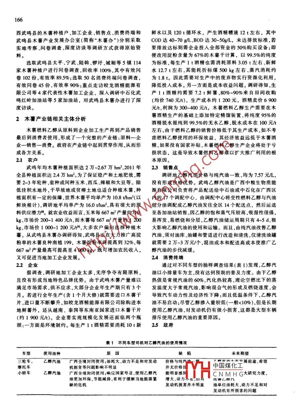 廣東農(nóng)業(yè)科學(xué)2012年第1期165政府主導(dǎo)下的我國木薯燃料乙醇產(chǎn)業(yè)發(fā)展戰(zhàn)略李清林,田亮',王健2,郭娟3,段永超(1同濟(jì)大學(xué)政治與國際關(guān)系學(xué)院,上海2000:2.上海理工大學(xué)能源與動力工程學(xué)院,上海20003;3同濟(jì)大學(xué)環(huán)境科學(xué)學(xué)院,上海200092;4同濟(jì)大學(xué)理學(xué)部,上海20002)摘要:發(fā)展非糧燃料乙醇是我國應(yīng)對能源危機(jī)及發(fā)展低碳經(jīng)濟(jì)的重要途徑,政府在生物質(zhì)能源發(fā)展過程中扮演著十分重要的主導(dǎo)者和管理者的角色,并通過制度供給、調(diào)整能源結(jié)構(gòu)和利益格局,引導(dǎo)和推動其產(chǎn)業(yè)的發(fā)展。通過運(yùn)用訪談、問卷等方法,以農(nóng)戶,企業(yè)、產(chǎn)業(yè)發(fā)展辦公室、加油站和消費(fèi)者作為對象,以全國木薯第一大縣武鳴作為調(diào)研地,以木薯燃料乙醇產(chǎn)業(yè)發(fā)展為切入點(diǎn),提出政府主導(dǎo)的“公司+合作社+農(nóng)戶”合作模式下的發(fā)展戰(zhàn)略。關(guān)鍵詞:政府主導(dǎo);木薯;燃料乙醇;發(fā)展戰(zhàn)略中圖分類號:S533;F307.11文獻(xiàn)標(biāo)識碼:A文章編號:1004-874X(2012)0-0165-03Government-led development strategy of cassavafuel alcohol industry in ChinaLI Qing-lin, TIAN Liang, WANG Jian, GUO Juan, DUAN Yong-chao(1. School of Political Science International Relations, Tongji University, Shanghai 200092, China2. Scholl of Energy Power Engineering, Shanghai University of Science Technology, Shanghai 200093, China3. Scholl of Environmental Science and Engineering, Tongi University, Shanghai 200092, China;4. College of Sciences, Tongji University, Shanghai 200092, China)Abstract: Develop the non-grain fuel ethyl alcohol is an important way to the energy crisis and develop low-earbon economy forChina. The government plays a very important role of leader and manager in the development of biomass energy, and guide and promotethe development of cassara industry. through the supply system, adjusting energy structure and the pattern of interests. Through the useinterviews, questionnaires, cassava farmers, enterprises, service stations and consumers as an object, cassava to the country's largestWuming County as a research, development of cassava fuel ethanol industry as a breakthrough point. Proposed the government leads"theKey words: government-led; cassava; fuel ethanol; development strate 3ompany +cooperative society peasant household"under the cooperation pattern developmental strategy氣候變化和環(huán)境保護(hù)已成為世界各國發(fā)展低碳經(jīng)濟(jì)100000的共識,發(fā)展可再生的清潔能源,成為促進(jìn)低碳經(jīng)濟(jì)發(fā)展2192610000的重要途徑。燃料乙醇作為可再生的清潔能源,與普通汽油相比,能夠顯著降低汽車尾氣中HC和CO的排放量有利于改善環(huán)境叫,而且對國民經(jīng)濟(jì)發(fā)展和國家能源安全面100具有重要戰(zhàn)略意義,生物質(zhì)能源必將成為未來能源發(fā)展的新方向我國人地矛盾比較突出,生產(chǎn)糧食燃料乙醇受到諸Eg區(qū)E多限制,發(fā)展非糧燃料乙醇則成不二之選。木薯制取燃料日如乙醇是國家生物質(zhì)能源發(fā)展戰(zhàn)略重點(diǎn)扶持項目,有利于保障國家糧食安全和能源安全,具有重大研究價值?!犊蓤D12010年全球主要燃料乙醇生產(chǎn)國產(chǎn)量及世界產(chǎn)量再生能源法》、《可再生能源中長期發(fā)展規(guī)劃》以及一系列財政稅收優(yōu)惠政策和鼓勵措施的實施,極大地推動了我(55×10°gal),并逐年增產(chǎn)。由于燃料乙醇具有良好的外國燃料乙醇迅猛發(fā)展,208年,我國已成為繼美國、巴西部性和與公共物品相同的公共利益,是應(yīng)對能源危機(jī)的有后世界第三大燃料乙醇主產(chǎn)國(圖1)叫,產(chǎn)量達(dá)1518萬t效途徑,也是減少碳排放的可行辦法,在燃料乙醇產(chǎn)業(yè)還沒有發(fā)展到完全市場化運(yùn)作的條件下,先期必須要有政府收稿日期:201l-11-11扶持和引導(dǎo),需要得到國家在政策、行政以及資金上的支基金項目:科技部“十一五”支撐計劃重點(diǎn)項目(2009BAC62B01);持。殼牌(中國)集團(tuán)2010新農(nóng)村建設(shè)-能源調(diào)研項目H中國煤化工作者簡介:李清林(1986-),男在讀碩士生,E- mail: Qinglin@1調(diào)研方CNMHG通訊作者:田亮(1965-),男,博士,教投F- mail: tianlinagl(0o@hom本次調(diào)研從2010年6月27日至7月15日,對廣西武鳴縣的木薯種植戶、加工企業(yè)、銷售點(diǎn)、消費(fèi)終端和鮮水以及120t循環(huán)水,產(chǎn)生酒精糟液12t左右,其中武鳴縣木薯產(chǎn)業(yè)發(fā)展辦公室(簡稱“木薯辦”)分別采取COD達(dá)40-70g/L、BOD達(dá)30-50g/L,未達(dá)排放標(biāo)準(zhǔn),若實地考察、問卷調(diào)査、深度訪談等調(diào)研方式獲得原始資要排放達(dá)標(biāo)則需企業(yè)投入全部資金的50%購買設(shè)備;即料便改用淀粉含量為67%的木薯干計算,以995%的純度選取武鳴縣太平、寧武、陸斡、鑼圩、城廂等5鎮(zhèn)114為標(biāo)準(zhǔn),每生產(chǎn)1t酒精也需消耗原料3.05t左右、新鮮家木薯種植戶進(jìn)行問卷調(diào)查,回收率10%,其中有效問水127t左右,其能耗折標(biāo)煤500kg左右、蒸汽消耗約卷102份,有效率895%;選取50名消費(fèi)終端問卷調(diào)查,為18t。因此需要對生產(chǎn)中的廢棄物實行資源化利用,有效問卷45份,有效率90%;重點(diǎn)走訪皎龍酒精能源有降低投入成本。另一方面是成本收