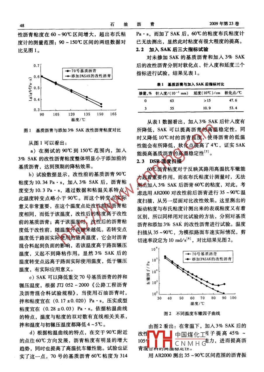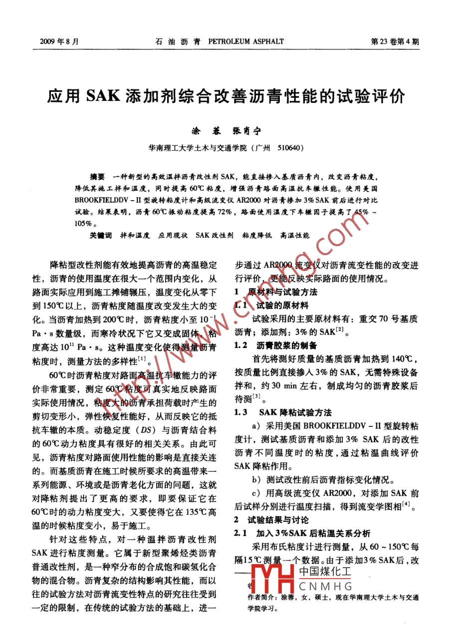 2009年8月石油瀝青PETROLEUM ASPHALT第23卷第4期應(yīng)用SAK添加劑綜合改善瀝青性能的試驗(yàn)評(píng)價(jià)涂蓉張肖寧華南理工大學(xué)土木與交通學(xué)院(廣州510640)摘要一種新型 的高效溫拌瀝青改性劑SAK,能直接摻入基質(zhì)瀝青內(nèi),改變?yōu)r青粘度,降低其施工拌和溫度,同時(shí)提高60C粘度,增強(qiáng)瀝青路面高溫抗車(chē)轍性能。使用美國(guó)BROOKFIELDDV- II型旋轉(zhuǎn)粘度計(jì)和高級(jí)流變儀AR2000對(duì)瀝青摻加3% SAK前后進(jìn)行對(duì)比試驗(yàn)。結(jié)果表明,瀝青60C振動(dòng)粘度提高72%,路面使用溫度下車(chē)轍因子提高了45% ~105%。關(guān)鍵詞拌和溫度應(yīng)用現(xiàn)狀SAK 改性劑粘度降低 高溫性能降粘型改性劑能有效地提高瀝青的高溫穩(wěn)定步通過(guò)AR2000流變儀對(duì)瀝青流變性能的改變進(jìn)性,瀝青的使用溫度在很大-一個(gè)范圍內(nèi)變化,從行評(píng)價(jià),更能反映實(shí)際路面的使用情況。路面實(shí)際應(yīng)用到施工攤鋪輾壓,溫度變化從零下1原材料與試驗(yàn)方法到150以上,瀝青粘度隨溫度改變發(fā)生大的變1.1試驗(yàn)的原材料化。當(dāng)瀝青加熱到200C時(shí),瀝青粘度小至10-1試驗(yàn)采用的主要原材料有:重交70號(hào)基質(zhì)Pa. s數(shù)量級(jí),而寒冷狀況下它又變成固體,粘瀝青;添加劑: 3%的SAK{2)。度高達(dá)10" Pa. s。這種溫度變化使得測(cè)量瀝青1.2瀝青膠漿的制備粘度時(shí),測(cè)量方法的多樣性"。首先將測(cè)好質(zhì)量的基質(zhì)瀝青加熱到140C,60C時(shí)瀝青粘度對(duì)路面高溫抗車(chē)轍能力的評(píng)按質(zhì)量比例直接摻人3%的SAK,無(wú)需特殊設(shè)備價(jià)非常重要,測(cè)定60C粘度可真實(shí)地反映路面拌和,約30min左右,制成均勻的瀝青膠漿后實(shí)際使用情況,粘度大的瀝青承擔(dān)荷載時(shí)產(chǎn)生的待測(cè))。剪切變形小,彈性恢復(fù)性能好,從而反映它的抵1.3 SAK 降粘試驗(yàn)方法抗車(chē)轍的本質(zhì)。動(dòng)穩(wěn)定度(DS)與瀝青結(jié)合料a)采用美國(guó)BROOKFIELDDV - II型旋轉(zhuǎn)粘的60C動(dòng)力粘度具有很好的相關(guān)關(guān)系。由此可度計(jì),測(cè)試基質(zhì)瀝青和添加3% SAK后的改性見(jiàn),瀝青粘度對(duì)路面使用性能的影響是直接關(guān)連瀝青不同溫度時(shí)的粘度,通過(guò)粘溫曲線評(píng)價(jià)的。而基質(zhì)瀝青在施工時(shí)候所要求的高溫帶來(lái)一SAK降粘作用。系列能源、環(huán)境或是瀝青老化方面的問(wèn)題,這就b)測(cè)試改性前后瀝青指標(biāo)變化情況。對(duì)降粘劑提出了更高的要求,即要保證它在c)用高級(jí)流變儀AR2000,對(duì)添加SAK前60時(shí)的動(dòng)力粘度變大,又要使得它在135C高后試樣:分別進(jìn)行溫度掃描,得到流變學(xué)圖相(4]。2試驗(yàn)結(jié)果 與討論溫的時(shí)候粘度變小,易于施工。針對(duì)這些特點(diǎn),對(duì)一種溫拌瀝青改性劑2.1加入3%SAK后粘溫關(guān)系分析SAK進(jìn)行粘度測(cè)量。它屬于新型聚烯烴類(lèi)瀝青采用布氏粘度計(jì)進(jìn)行測(cè)量,從60 ~ 150C每普通改性劑,是一種窄分布的合成飽和碳?xì)浠细?5C測(cè)量一個(gè)數(shù)據(jù)。由于添加3% SAK后,改中國(guó)煤化工物的混合物。瀝青復(fù)雜的結(jié)構(gòu)影響其性能,而以CNMHG往的試驗(yàn)方法對(duì)瀝青流變性特點(diǎn)的研究往往受到作者簡(jiǎn)介:涂蓉,女,碩士,現(xiàn)在華南理大學(xué)土木與交通- -定的限制,在傳統(tǒng)的試驗(yàn)方法的基礎(chǔ)上,進(jìn)一學(xué)院學(xué)習(xí)。48石油歷青2009年第23卷性瀝青粘度在60~90C區(qū)間增大,超出布氏粘Pa.s,而加了SAK后,60C的粘度布氏粘度計(jì)度計(jì)的測(cè)量范圍;90~1509區(qū)間的兩組數(shù)據(jù)對(duì)已無(wú)法測(cè)出,顯然此時(shí)粘度有很大程度的提高。比見(jiàn)圖1。2.2加入 SAK后三大指標(biāo)試驗(yàn)對(duì)未摻加SAK的基質(zhì)瀝青和加入3% SAK0.7[后的改性瀝青分別對(duì)軟化點(diǎn)、針入度和延度三個(gè)+70號(hào)基質(zhì)瀝青指標(biāo)進(jìn)行試驗(yàn),結(jié)果見(jiàn)表1。.0.6+添加3%SAK的改性瀝青I表1基質(zhì)瀝青與加入 SAK后指標(biāo)對(duì)比S 0.5|摻量,%針人度/(10-1 mm)_延度(10C)/cm 軟化點(diǎn)/心凹0.406>1547.6R0.3L35:10.953.4301012035 150 165溫度/C從表1數(shù)據(jù)看出,加入3% SAK后針人度有1基質(zhì)瀝青與添加3% SAK改性瀝青粘度對(duì)比所降低,SAK可以提高瀝青的高溫穩(wěn)定性,同時(shí)又降低10C時(shí)的瀝青延度,使得瀝青的低溫從圖1可以看出:a)在測(cè)試的90C到150C范圍內(nèi),加入.性能會(huì)有所降低,軟化點(diǎn)提高了4C,證實(shí)SAK能提高基質(zhì)瀝青的高溫穩(wěn)定性[5]。3% SAK的改性瀝青粘度整體明顯小于添加前的2.3 DSR溫度掃描基質(zhì)瀝青,達(dá)到預(yù)期的降粘效果。609瀝青粘度對(duì)于反映其路用高溫抗車(chē)轍能b)試驗(yàn)數(shù)據(jù)顯示,改性前的基質(zhì)瀝青90C力起著重要作用,而在布氏粘度計(jì)測(cè)量時(shí),無(wú)法粘度為10.34 Pa.s,加入3% SAK后,瀝青粘測(cè)出加入3% SAK 后瀝青60C的粘度,對(duì)此,考度變?yōu)?0.3 Pa.8,通過(guò)數(shù)據(jù)和粘溫關(guān)系特點(diǎn),慮選用AR2000對(duì)改性前后瀝青進(jìn)行35 ~90C溫此溫度轉(zhuǎn)變點(diǎn)略小于90C。而這個(gè)轉(zhuǎn)變點(diǎn)實(shí)際度掃描。從另一