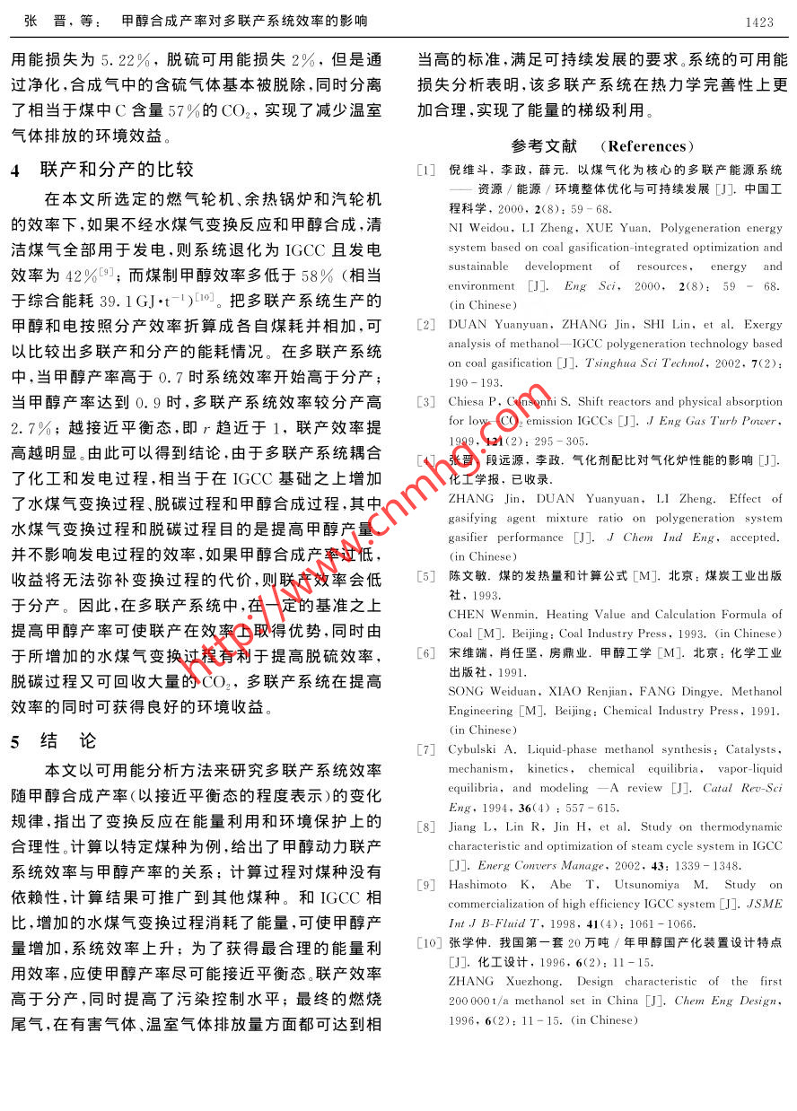 ISSN 1000-0054清華大學(xué)學(xué)報(bào) (自然科學(xué)版)2003年第43卷第10期33/37CN 11-2223/N J Tsinghua Univ (Sci &. Tech),2003, Vol. 43,No. 101420- 1423甲醇合成產(chǎn)率對(duì)多聯(lián)產(chǎn)系統(tǒng)效率的影響張晉,段遠(yuǎn)源(清華大學(xué)熱能工程系,北京100084)摘要:多聯(lián)產(chǎn)是復(fù)雜的、高效環(huán)保的化工能源系統(tǒng),甲醇于工藝過程的熱和電。多聯(lián)產(chǎn)系統(tǒng)能夠提高能源利合成和發(fā)電聯(lián)產(chǎn)是最典型的多聯(lián)產(chǎn)系統(tǒng)。由于不是單一類型用的合理性,滿足可持續(xù)發(fā)展的要求。立足于我國(guó)以的產(chǎn)品,該文采用可用能方法對(duì)系統(tǒng)進(jìn)行能分析,考慮了煤為主的能源結(jié)構(gòu),以煤氣化為核心的多聯(lián)產(chǎn)技術(shù)化工和發(fā)電的物理可用能和化學(xué)可用能。以1 kg干煤粉為是解決我國(guó)未來能源可持續(xù)發(fā)展的方向之一。目前基礎(chǔ),計(jì)算出系統(tǒng)各主要單元的可用能平衡,將聯(lián)產(chǎn)和分產(chǎn)由煤氣化的先進(jìn)技術(shù)出發(fā),無論是單純應(yīng)用于整體.計(jì)算結(jié)果進(jìn)行了比較,說明在聯(lián)產(chǎn)系統(tǒng)中甲醇合成可用能效煤氣化聯(lián)合循環(huán)發(fā)電(IGCC),還是單純用于化工率高于分產(chǎn),增加甲醇轉(zhuǎn)化率可提高系統(tǒng)總效率。計(jì)算給出了甲醇合成產(chǎn)率達(dá)到平衡態(tài)的0.9時(shí)系統(tǒng)的可用能流,此時(shí)產(chǎn)品,因?yàn)楣潭ㄙY產(chǎn)建設(shè)投資比較大,都會(huì)遇到競(jìng)爭(zhēng)聯(lián)產(chǎn)效率比分產(chǎn)高2. 7%。力差的問題。如果在IGCC的基礎(chǔ)上將生產(chǎn)電、化工關(guān)鍵詞:熱力學(xué);變換反應(yīng);甲醇合成;產(chǎn)率;多聯(lián)產(chǎn)系統(tǒng);產(chǎn)品和燃料的工藝有機(jī)結(jié)合在-起,不僅總的能效可用能效率可以提高,而且可以提高其經(jīng)濟(jì)競(jìng)爭(zhēng)力,促進(jìn)它的商中圖分類號(hào): TK 123文獻(xiàn)標(biāo)識(shí)碼: A業(yè)化中。由煤制得的合成氣經(jīng)過變換反應(yīng)達(dá)到滿足甲醇合成要求的氫碳比,這一過程消耗了能量但提文章編號(hào): 1000-0054(2003)10-1420-04 .高了甲醇產(chǎn)率,不同的甲醇產(chǎn)率其多聯(lián)產(chǎn)系統(tǒng)的效率不同。由于多聯(lián)產(chǎn)系統(tǒng)本身十分復(fù)雜,因此現(xiàn)有對(duì)Effect of methanol synthesis ratio多聯(lián)產(chǎn)系統(tǒng)的認(rèn)識(shí)和研究還不夠完善。以煤氣化為on a polygeneration system核心的多聯(lián)產(chǎn)系統(tǒng)中,甲醇合成和發(fā)電是最簡(jiǎn)單、最ZHANG Jin, DUAN Yuanyuan典型的化工和動(dòng)力系統(tǒng),甲醇和電是其主要產(chǎn)品[2]。(Department of Thermal Engineering ,本文以甲醇-發(fā)電系統(tǒng)為例進(jìn)行分析。由于不再Tsinghua University, Beijing 100084, China)是單一類型的產(chǎn)品,在分析的時(shí)候,不能簡(jiǎn)單地用系A(chǔ)bstract: Cogeneration is a complex. efficient and environmental-friendly system to simultaneously generate chemical fuels and統(tǒng)熱效率或可用能效率來表達(dá)系統(tǒng)能量利用的合理程度。對(duì)效率的計(jì)算是以1kg干煤粉為基礎(chǔ),忽略typical components of the simplest cogeneration system. The exergy掉一些次要環(huán)節(jié)后,對(duì)氣化單元、凈化單元、合成單method was used to calculate both the physical exergy and thechemical exergy for various production ratios. The methanol元和蒸汽發(fā)生系統(tǒng)進(jìn)行建模,在能量平衡的基礎(chǔ)上synthesis efficiency in the cogeneration system was higher than in a計(jì)算多聯(lián)產(chǎn)系統(tǒng)各部分的熱效率和可用能損失。stand alone methanol production system. The cogeneration system對(duì)于合成甲醇和發(fā)電比例的研究進(jìn)一步揭示了exergy efficiency increased with increasing methanol synthesis ratio.The exergy flows with a methanol synthesis ratio of 0.9 at多聯(lián)產(chǎn)系統(tǒng)的能量利用率。增加甲醇產(chǎn)率,化學(xué)能轉(zhuǎn)equilibrium show that cogeneration can be 2. 7% more efcient than化為熱能的比例降低,發(fā)電量減少,系統(tǒng)可用能損失separated methanol and power generation systems.減少。對(duì)于由煤制得的煤氣,其主要成分氫碳比遠(yuǎn)小Key words : thermodynamics;shiftingreaction;synthesis; reaction ratio; cogeneration; exergyefficiency收稿日期: 2002-12-20基金項(xiàng)目:國(guó)家重點(diǎn)基礎(chǔ)研究發(fā)展規(guī)劃項(xiàng)目(G1999022304);高等學(xué)校優(yōu)秀青年教師教學(xué)科研獎(jiǎng)勵(lì)計(jì)劃資助項(xiàng)目多聯(lián)產(chǎn)技術(shù)指的是用從單一的設(shè)備(氣化爐)中作者簡(jiǎn)介:張晉(1978-),男(滿),遼寧,碩士研究生。產(chǎn)生的合盛氖來聯(lián)產(chǎn)多種化工產(chǎn)品、液體燃料(甲通訊聯(lián)系人:段遠(yuǎn)源,副教授,醇、FT合成燃料、二甲醚、城市煤氣)、氫氣以及用E- mail: yyduan@ te. tsinghua. edu. cn張晉,等:甲醇合成產(chǎn)率對(duì)多聯(lián)產(chǎn)系統(tǒng)效率的影響1421于2:1 (甲醇合成反應(yīng)中H2、CO化學(xué)計(jì)量比)[3],2系統(tǒng)的能量平衡和物質(zhì)平衡因此為增加甲醇產(chǎn)率需要調(diào)整水煤氣變換過程中的針對(duì)多聯(lián)產(chǎn)系統(tǒng)的流程,本文以1kg山西晉城煤氣成分,對(duì)該過程的設(shè)計(jì)和比較是本文的研究目9