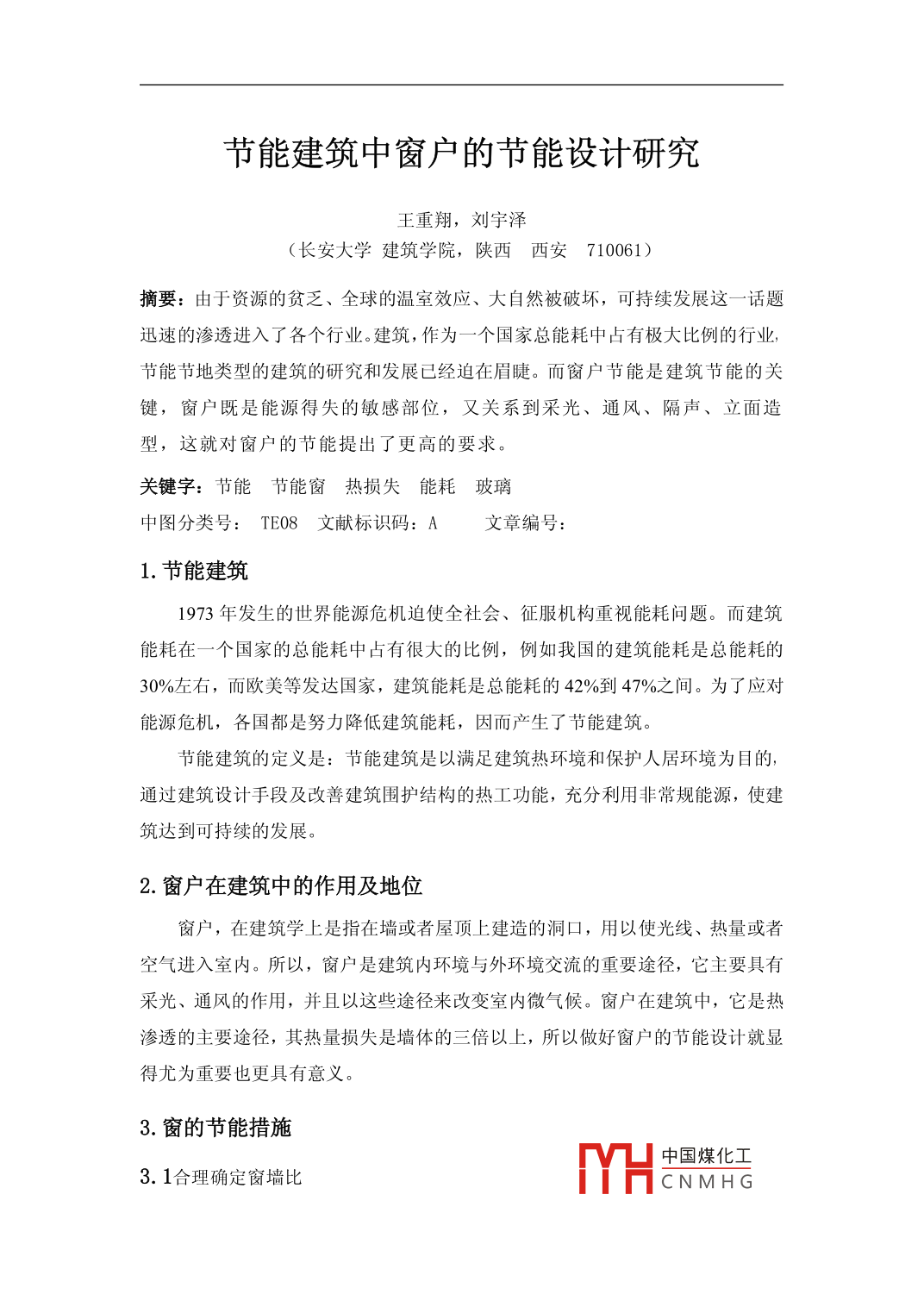 節(jié)能建筑中窗戶的節(jié)能設(shè)計(jì)研究王重翔,劉宇澤(長安大學(xué)建筑學(xué)院,陜西西安710061)摘要:由于資源的貧乏、全球的溫室效應(yīng)、大自然被破壞,可持續(xù)發(fā)展這一話題迅速的滲透進(jìn)入了各個(gè)行業(yè)。建筑,作為一個(gè)國家總能耗中占有極大比例的行業(yè)節(jié)能節(jié)地類型的建筑的研究和發(fā)展已經(jīng)迫在眉睫。而窗戶節(jié)能是建筑節(jié)能的關(guān)鍵,窗戶既是能源得失的敏感部位,又關(guān)系到采光、通風(fēng)、隔聲、立面造型,這就對(duì)窗戶的節(jié)能提出了更高的要求。關(guān)鍵字:節(jié)能節(jié)能窗熱損失能耗玻璃中圖分類號(hào):TE08文獻(xiàn)標(biāo)識(shí)碼:A文章編號(hào)1.節(jié)能建筑1973年發(fā)生的世界能源危機(jī)迫使全社會(huì)、征服機(jī)構(gòu)重視能耗問題。而建筑能耗在一個(gè)國家的總能耗中占有很大的比例,例如我國的建筑能耗是總能耗的30%左右,而歐美等發(fā)達(dá)國家,建筑能耗是總能耗的42%到47%之間。為了應(yīng)對(duì)能源危機(jī),各國都是努力降低建筑能耗,因而產(chǎn)生了節(jié)能建筑節(jié)能建筑的定義是:節(jié)能建筑是以滿足建筑熱環(huán)境和保護(hù)人居環(huán)境為目的,通過建筑設(shè)計(jì)手段及改善建筑圍護(hù)結(jié)構(gòu)的熱工功能,充分利用非常規(guī)能源,使建筑達(dá)到可持續(xù)的發(fā)展。2.窗戶在建筑中的作用及地位窗戶,在建筑學(xué)上是指在墻或者屋頂上建造的洞口,用以使光線、熱量或者空氣進(jìn)入室內(nèi)。所以,窗戶是建筑內(nèi)環(huán)境與外環(huán)境交流的重要途徑,它主要具有采光、通風(fēng)的作用,并且以這些途徑來改變室內(nèi)微氣候。窗戶在建筑中,它是熱滲透的主要途徑,其熱量損失是墻體的三倍以上,所以做好窗戶的節(jié)能設(shè)計(jì)就顯得尤為重要也更具有意義3.窗的節(jié)能措施中國煤化工3.1合理確定窗墻比CNMHG窗墻比是指窗戶洞口面積與立面單元面積的比值,數(shù)值的大小對(duì)房間內(nèi)的熱損失有著重要的影響。在冬季采暖季節(jié),由于窗玻璃具有的透明性,在太陽輻射作用下,可使建筑物獲得一定的得熱量,使維護(hù)結(jié)構(gòu)的熱損失減少。因此,該合理確定窗墻比的數(shù)值,使窗戶的各項(xiàng)功能得以充分發(fā)揮。在滿足室內(nèi)采光、通風(fēng)等要求的基礎(chǔ)上,不同朝向的窗墻比應(yīng)該滿足《民用建筑節(jié)能設(shè)計(jì)標(biāo)準(zhǔn)》(JGJ2695)的要求,即“北向0.25,東向0.3,南向0.35”3.2提高氣密性減少滲透損失在建筑結(jié)構(gòu)中,門窗的縫隙是冷風(fēng)滲透的主要通道。我國多數(shù)門窗的氣密性都較差,在風(fēng)壓和熱壓的作用下,冬季室外冷空氣通過門窗縫隙進(jìn)入室內(nèi),會(huì)增大門窗的熱損失。減少由縫隙滲透的冷空氣量,應(yīng)合理選擇窗戶的結(jié)構(gòu),減少窗與框、扇與玻璃間的縫隙,對(duì)所存在的縫隙,應(yīng)采用相應(yīng)的措施,如在縫隙中鑲密封條、在窗框與墻間的縫隙中用保溫砂漿等材料填充密封等,可使?jié)B入的冷空氣量大為減少,提高其氣密性。3.3減少傳熱量通過對(duì)建筑節(jié)能試點(diǎn)工程門窗熱工性能的測定分析可知,外窗的傳熱耗熱量約占維護(hù)結(jié)構(gòu)總耗熱量的40%以上,而單層玻璃窗能耗是相同面積240磚墻的3.4倍,是節(jié)能墻體的5.6倍,所以應(yīng)加大節(jié)能窗的推廣力度。對(duì)新建住宅應(yīng)推廣使用雙玻璃塑鋼窗或中空玻璃等新型節(jié)能窗。對(duì)既有建筑應(yīng)逐步將原來的木窗、鋼窗改為雙層玻璃塑鋼窗。如采用單框雙玻璃塑鋼窗,窗的傳熱系數(shù)可由原來的6.4W/m2K降到3.0w/m3K,熱工性能大為提高,同時(shí)也具備氣密性高、隔音性能好的特點(diǎn)。根據(jù)國內(nèi)外應(yīng)用經(jīng)驗(yàn),雙層玻璃鋼窗是目前較為理想的選擇。在條件具備的情況下,推廣使用前面提到的新型節(jié)能窗,節(jié)能效果將會(huì)更加明顯。4.節(jié)能窗類型4.1中空玻璃節(jié)能窗普通的中空玻璃窗是由兩層多層平板玻璃構(gòu)成,四周用高強(qiáng)度氣密性的復(fù)合粘合劑將兩片或多片玻璃與鋁條或橡膠條粘合,在密封玻璃之間的空隙處充入惰性氣體,用以獲得良好的保溫、隔熱及隔音性能中國煤化工鍍膜中空玻璃作為中空玻璃窗的一種類型,具有yHiCNMHG他是采用熱反射或吸熱鍍膜玻璃以及由低輻射鍍膜玻璃組成的中空玻璃。通過保溫性能測試,采用低輻射鍍膜玻璃組成的真空玻璃,其傳熱系數(shù)大為減小。與普通真空玻璃相比較,可節(jié)能10%。密封中空玻璃構(gòu)件是國際上流行的第二代產(chǎn)品,其密封空間內(nèi)裝有一定量的干燥劑,在寒冷季節(jié),密封空間內(nèi)的玻璃表面雖然溫度較低,但仍可不低于其中干燥空氣的露點(diǎn)溫度。這樣就可以避免玻璃表面結(jié)露,從而保證了窗戶的潔凈和透明度。而由于密封空間密閉及靜止的空氣層的存在,使其具有極為穩(wěn)定的熱工性能,保溫效果良好4.2塑鋁窗塑鋁窗即為保溫節(jié)能鋁合金窗。它和普通鋁合金窗的區(qū)別在于在塑鋁窗的鋁合金型材內(nèi)注入一條PU樹脂,以此將鋁窗型材分離形成斷橋,來阻止熱量的傳遞。此種節(jié)能窗既有鋁金屬材料的高強(qiáng)度,又有塑料絕熱的特點(diǎn),