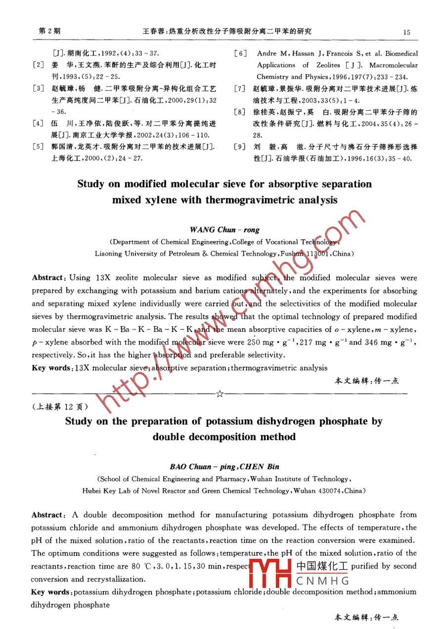 第29卷第2期武漢·工程大學(xué)學(xué)報(bào)Vol 29 No. 22007年03月J. Wuhan Inst. TechMar.2007文章編號(hào):1004-4736(2007)02-0013-03熱重分析改性分子篩吸附分離二甲苯的研究王春蓉(遼寧石油化工大學(xué)職業(yè)技術(shù)學(xué)院化工系,遼寧撫順113001)摘要:用鉀、鋇離子交替交換13X分子篩,經(jīng)六次復(fù)合改性制備了改性分子篩,分別用于吸附二甲苯各異構(gòu)體的實(shí)驗(yàn),并用熱重分析法對(duì)分子篩的改性能力進(jìn)行了研究.實(shí)驗(yàn)結(jié)果表明:制備改性分子篩較優(yōu)改性工藝為K-Ba-K-Ba-K-K;采用該工藝制備的改性分子篩對(duì)鄰、間、對(duì)二甲苯的平均吸附量分別為250mg:g217mg·g-和346mg·g-1;該改性分子篩基本滿(mǎn)足吸附劑應(yīng)具有的高吸附量、高選擇性的要求關(guān)鍵詞:13X分子篩;吸附分離;熱重分析中圖分類(lèi)號(hào):TQ424.25文獻(xiàn)標(biāo)識(shí)碼:A0引言子篩.離子交換方法:用KCl、BaCl2溶液與13X分子篩在75℃下交替交換6次,均交換2h.高溫水在我國(guó),每年都有大量的C芳烴副產(chǎn)品產(chǎn)蒸汽處理方法:將已交換干燥后的分子篩置于管生,其主要組成為鄰、間、對(duì)二甲苯混合二甲苯中式爐的恒溫段,再以一定的速率進(jìn)行升溫焙燒,溫的各同分異構(gòu)體都是重要的化工原料2:間二甲.度升至設(shè)定值后,再通水蒸汽進(jìn)行水熱處理并開(kāi)苯可作為聚脂和苯酐的原料);對(duì)二甲苯主要用始計(jì)時(shí)0.3h.水熱處理溫度即為焙燒最高溫度,于合成對(duì)苯二甲酸或?qū)Ρ蕉姿岫柞スI(yè)活化后即得成品分子篩分離以提高產(chǎn)品附加值和資源利用率凄1.3吸附劑的評(píng)價(jià)方法廉價(jià)出售,資源浪費(fèi)十分嚴(yán)重,有必要將其逐評(píng)選吸附劑的的兩個(gè)指標(biāo)是吸附容量和吸附選擇性采用吸附分離的模擬移動(dòng)床工藝來(lái)分離和提熱重分析方法簡(jiǎn)單程序如下:取0.25~0.42純混合二甲苯的單組分異構(gòu)體口,是一種有效的.mm粒度活化改性分子篩,分別用鄰、間、對(duì)二甲方法.吸附分離工藝關(guān)鍵技術(shù)之一是固體吸附劑苯溶劑密封浸漬,浸漬時(shí)間為12h.用TG/DTA的制備.本研究采用13X沸石分子篩作為改性對(duì)熱分析儀測(cè)量,樣品的失重量為改性分子篩的吸象在徐桂英(等人前期工作的基礎(chǔ)上,對(duì)鉀離子附量.典型TG曲線(xiàn)圖見(jiàn)圖1.和鋇離子交替交換復(fù)合改性的工藝條件進(jìn)行了研究,并采用熱重分析法評(píng)價(jià)改性分子篩對(duì)二甲苯各單組分的吸附性能,同時(shí)還考察了改性工藝的重復(fù)性對(duì)改性效果的影響02.01實(shí)驗(yàn)部分TG 9DTG1.1儀器與試劑13X沸石分子篩,沈陽(yáng)同澤干燥劑廠(chǎng);KCl、Cl2,AR,沈陽(yáng)試劑一廠(chǎng);鄰、間、對(duì)二甲苯,AR,圖1對(duì)二甲苯熱重分析曲線(xiàn)北京金龍化學(xué)試劑公司; Diamond TG/DTA,Fig.1 Thermogravimetric analysis curve for p- xyleneTG/DTA6300,上海珀金埃爾默儀器有限公司吸附劑的制備2結(jié)果與討論選用國(guó)產(chǎn)13X分子篩球狀,經(jīng)粉碎、篩分,取2.1M凵中國(guó)煤化工0.25~0.42mm粒度,細(xì)粒狀分子篩分別與鉀、鋇CNMHG上甲苯(MX)、鄰二離子交替交換,經(jīng)濕焙處理和活化后,制成改性分甲苯(OX)飽和吸附量的比值為吸附分離系數(shù),用收稿日期:2006-10-08費(fèi)猞王春蓉(1974-),女,滿(mǎn)族,遼寧北鎮(zhèn)人,助教,士研究生,研究方向:化工分離14武漢工程大學(xué)學(xué)報(bào)第29卷符號(hào)pxMx和rxox表示.當(dāng)B>1時(shí),表明對(duì)二甲兩次鋇離子六次復(fù)合改性工藝條件進(jìn)行篩選,不苯能從混合組分中分離出來(lái).B值越大,表明分子同交換順序下的改性分子篩吸附二甲苯各異構(gòu)體篩吸附分離對(duì)二甲苯的能力越強(qiáng)的單組分的熱重分析結(jié)果見(jiàn)表1.本實(shí)驗(yàn)在前期工作的基礎(chǔ)上對(duì)四次鉀離子和表1不同改性工藝的熱重分析結(jié)果Table 1 Results of thermogravimetric analysis with different modified technology實(shí)驗(yàn)飽和吸附量/mg·g-1附分離系數(shù)改性方法代號(hào)對(duì)二甲苯鄰二甲苯間二甲苯K-K-K-K309FFFFK-K-K-Ba-Ba-KK-K-Ba- Ba-K-K2.024K-Ba-Ba-K-K-K21501.1061.011K-K-K-Ba-K- Ba1.166FFFFEFK-K-Ba-K-K-Ba2161.108K-K-Ba-K-Ba-K1.287Fs K-Ba-K-K-Ba -K1.293K- Ba-K-Ba-K-K2872.195由表1可知按上述任何一種工藝制取的改250mg·g-1,間二甲苯為217mg·g-1,即改性性分子篩,β值均>1,理論上都具備吸附分離的分子篩吸附對(duì)二甲苯的能力明顯高于吸附鄰、間能力實(shí)驗(yàn)代號(hào)為F1、F4、F的工藝方案吸附量很二甲苯的能力這是因?yàn)閷?duì)二甲苯是線(xiàn)性分子,而高,但β值不高;而F2和F3的工藝方案雖然β很鄰、間二甲苯是非線(xiàn)性分子,分子動(dòng)力學(xué)直徑大高,但吸附容量較低,這些都不符合吸附劑的高吸于對(duì)二甲苯,當(dāng)分子篩孔口修飾到一定尺寸時(shí),對(duì)附容量、高吸附選擇性的要求而代號(hào)為F的工二甲苯分子可以自由出入,而鄰、間二甲苯卻因空藝方案在分離混合二甲苯中選擇性較高,吸附容間位阻的原因,使得改性分子篩對(duì)它們的吸附性量也較高,符合吸附劑的特點(diǎn)能存在差異.由表2還可看出:改性分子篩對(duì)各二2.2重復(fù)實(shí)驗(yàn)的熱重分析甲苯組分的吸附能力還與沸石表面酸性的強(qiáng)弱有將實(shí)驗(yàn)代號(hào)為F1的工藝方案K-
