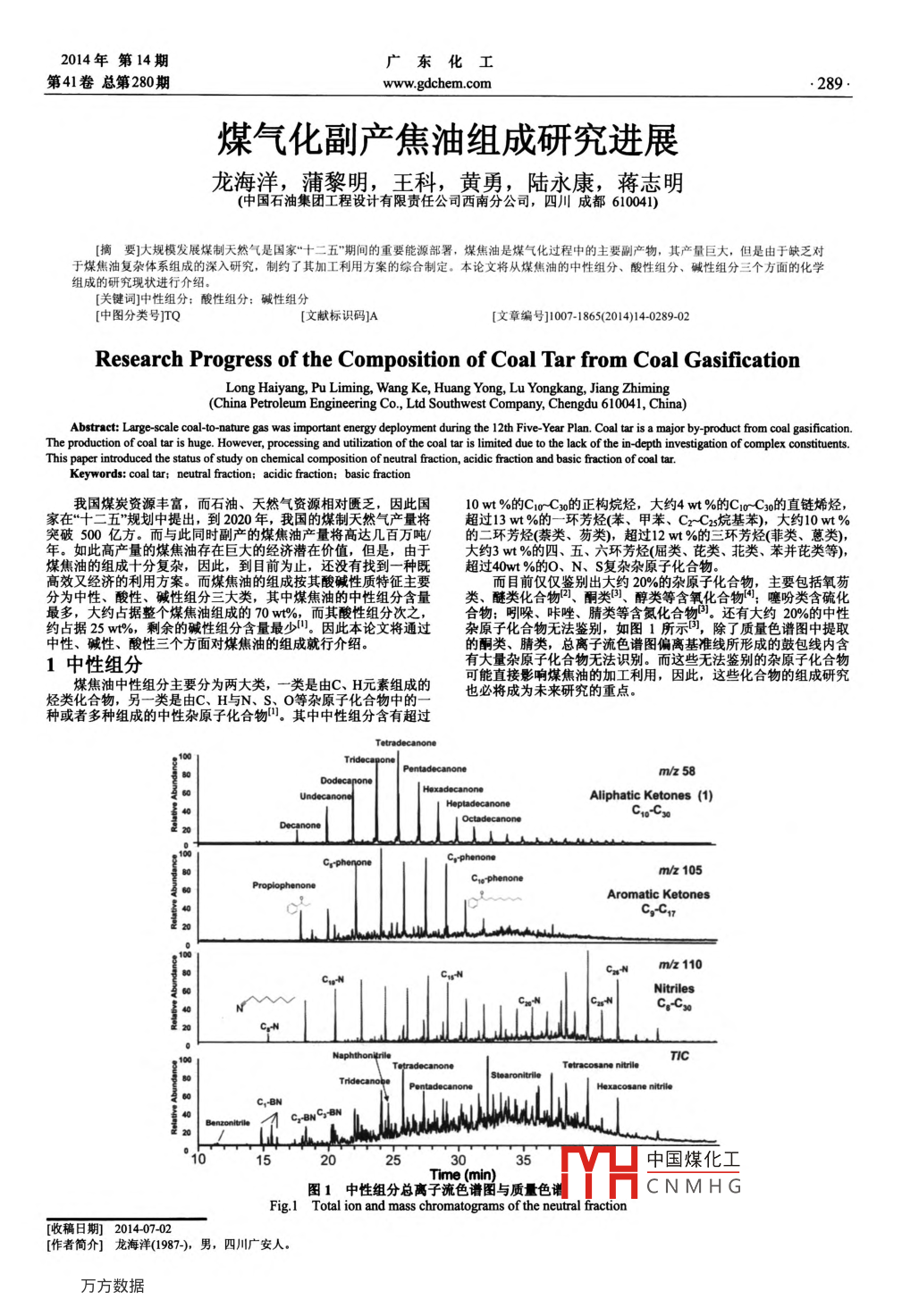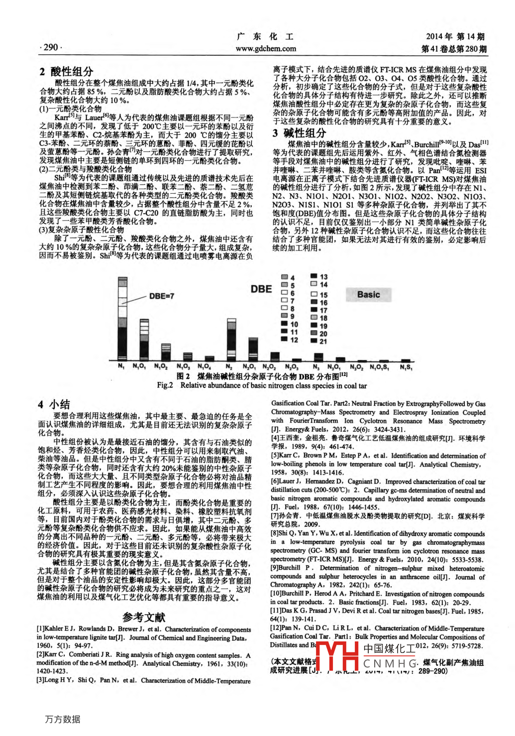 2014年第14期廣東化工第41卷總第280期www.gdchem.com.289.煤氣化副產(chǎn)焦油組成研究進(jìn)展龍海洋,蒲黎明,王科,黃勇,陸永康,蔣志明(中國石油集團(tuán)工程設(shè)計有限責(zé)任公司西南分公司,四川成都610041)摘要]大規(guī)模發(fā)展煤制天然氣是國家“+二五”期間的重要能源部署,煤焦油是煤氣化過程中的主要副產(chǎn)物,其產(chǎn)量巨大,但是由于缺乏對于煤焦油復(fù)雜體系組成的深入研究,制約了其加工利用方案的綜合制定。本論文將從煤焦油的中性組分、酸性組分、堿性組分三個方面的化學(xué)組成的研究現(xiàn)狀進(jìn)行介紹。[關(guān)鍵詞]中性組分: 酸性組分:堿性組分[中圖分類號]TQ[文獻(xiàn)標(biāo)識碼]A[文章編號1007-1865(2014)14-0289-02Research Progress of the Composition of Coal Tar from Coal GasificationLong Haiyang, Pu Liming, Wang Ke, Huang Yong, Lu Yongkang, Jiang ZhimingChinpetroeunEnineeewangKeAbstract: Large scale cal-to-nature gas was important energy deployment during the 12th Five-Year Plan. Coal tar is a major by product from coal gasication.The production of coal tar is huge. However, processing and utilization of the coal tar is limited due to the lack of the in-depth investigation of complex constituents.This paper introduced the status of study on chemical composition of neutral fraction, acidic fraction and basic fraction of coal tar.Keywords: coal tar; neutral fraction; acidic fraction; basic faction我國煤炭資源豐富,而石油、天然氣資源相對匱乏,因此國10 wt %的Cro_C3o的正構(gòu)烷烴,大約4 wt %的Cro-C3o的直鏈烯烴,家在“十二五”規(guī)劃中提出,到2020年,我國的煤制天然氣產(chǎn)量將超過13 wt %的- -環(huán)芳烴(苯、甲苯、Cr~C2s烷基苯),大約10 wt %突破500億方。而與此同時副產(chǎn)的煤焦油產(chǎn)量將高達(dá)幾百萬噸/的二環(huán)芳烴(綦類、蘇類), 超過12 wt %的三環(huán)芳烴(菲類、蔥類),年。如此高產(chǎn)量的煤焦油存在巨大的經(jīng)濟(jì)潛在價值,但是,由于大約3 wt %的四、五、六環(huán)芳烴(屈類、芘類、花類、苯并芘類等),煤焦油的組成十分復(fù)雜,因此,到目前為止,還沒有找到一種超過40wt %的O、N、S復(fù)雜雜原子化合物。高效又經(jīng)濟(jì)的利用方案。而煤焦油的組成按其酸堿性質(zhì)特征主要而目前僅僅鑒別出大約20%的雜原子主要包括氧分為中性酸性堿件組分三大米。其中煤焦油的中性組分含量類、醚類化合物中、酮類中、醇類等含氧化合物:噻吩類含硫化大約占據(jù)整個煤焦油組成的70 wt%而其酸性組分次之,合物:吲哚、咔唑、腈類等含氮化合物0。還有大約20%的中性約占據(jù)25 wt%,剩余的堿性組分含量最少川。因此本論文將通過雜原子化合物無法鑒別,如圖1所示問,除了質(zhì)量色譜圖中提取中性、堿性、酸性三個方面對煤焦油的組成就行介紹。的酮類、睛類,總離子流色譜圖偏離基準(zhǔn)線所形成的鼓包線內(nèi)含1中性組分有大量雜原子化合物無法識別。而這些無法鑒別的雜原子化合物煤焦油中性組分主要分為兩大類,-類是由C、H元素組成的可能直接影響煤焦油的加工利用,因此,這些化合物的組成研究烴類化合物,另一類是由C、H與N、S、0等雜原子化合物中的-也必將成為未來研究的重點。種或者多種組成的中性雜原子化合物"。其中中性組分含有超過TetradecanonePentadecanonem/z 58DodecaponeHexadecanoneUndecanoneAliphatic Ketones (1)C1o-CsogCorphenoneCrphenpnem/z 105CroPhenoneProplophenoneAromatic KetonesC,-C1120m/z 110CrnNNitrilesCg-CxICTetracosane ntileThdecanoke PentadecanoneHexacosane nitriloC,BNC,BNCrBN°101520253035中國煤化工Time (min),圖1中性組分總離 子流色譜圖與質(zhì)色譜JYHCNMHGFig.1 Total ion and mass chromatograms of the neutral fraction[收稿日期] 2014-07-02[作者簡介龍海洋(1987-), 男,四川廣安人。.