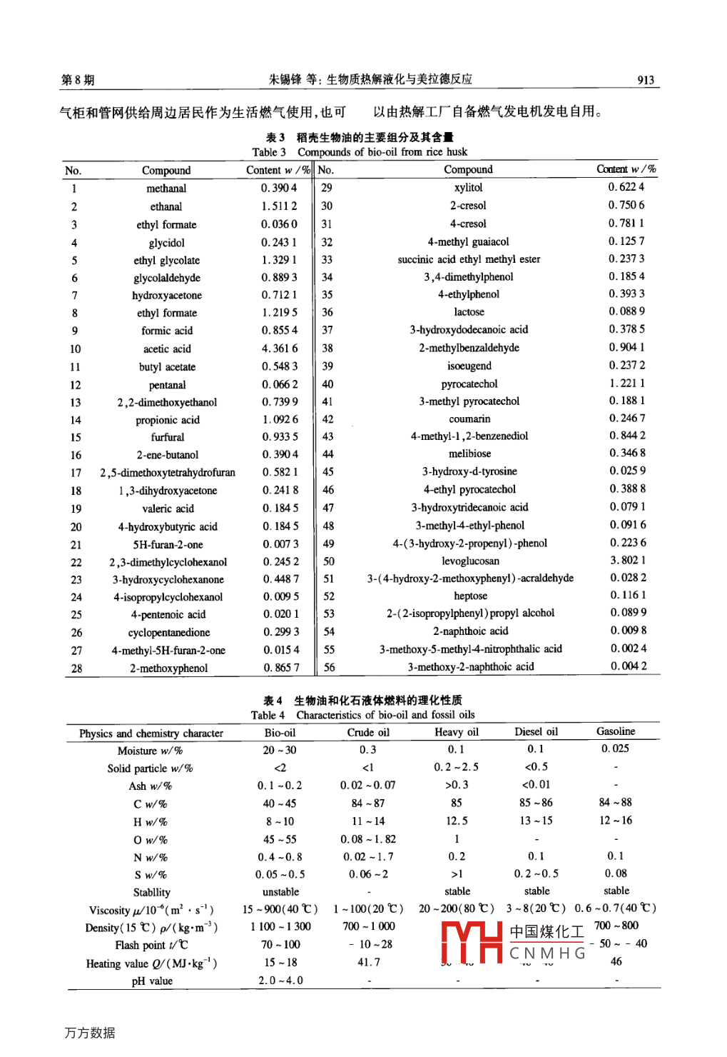 第41卷第8期燃料化學(xué)學(xué)報(bào)Vol 41 No 82013年8月Joumal of Fuel Chemistry and technologyug.2013文章編號(hào):0253-2409(2013)08-0911406生物質(zhì)熱解液化與美拉德反應(yīng)朱錫鋒,朱昌朋(中國(guó)科學(xué)技術(shù)大學(xué)生物質(zhì)潔凈能源安徹省重點(diǎn)實(shí)驗(yàn)室,安徽合肥230026)摘要:對(duì)生物質(zhì)熱解液化和美拉德反應(yīng)進(jìn)行了介紹指出美拉德反應(yīng)不僅存在于生物質(zhì)熱解液化過程中,而且通過引人適量氨等調(diào)控措施,可以促進(jìn)美拉德反應(yīng)有選擇性地生成吡嗪類雜環(huán)化合物等高值化學(xué)品,然后再通過分級(jí)冷凝將生物油分為化工生物油和燃料生物油,前者用于分離提取高值化學(xué)品,后者用于鍋爐和窯爐的燃料。引人美拉德反應(yīng)后,生物質(zhì)熱解液化技術(shù)經(jīng)濟(jì)性將會(huì)得到根本性的改善。關(guān)鍵詞:生物質(zhì);生物質(zhì)熱解;美拉德反應(yīng);生物油中圖分類號(hào):TK6文獻(xiàn)標(biāo)識(shí)碼:ABiomass fast pyrolysis and maillard reactionZHU Xi-feng, ZHU Chang-pengAnhui Key Laboratory for Biomass Clean Energy, University of Science and Technology of China, Hefei 230026, China)Abstract Biomass pyrolysis and Maillard reaction were discussed in this article, Maillard reaction existed notonly in biomass pyrolysis, but also could be facilitated to produce high value-added compounds, such as pyrazineby adding defined ammonia. the condensable gas was condensed into two types of bio-oil which could be usedfor chemical and fuel, respectively. The former could be served as material to obtain valuable chemicals byseparation and extraction, while the latter could be used to burn in boiler or kiln. The economy of biomass fastpyrolysis process would be considerably improved when the Maillard reaction was introducedKey words: biomass; biomass pyrolysis; Maillard reaction; bio-oil生物質(zhì)資源是自然界唯一可再生的碳源,具有化技術(shù)由于具有工藝過程短、原料適應(yīng)性強(qiáng)、反應(yīng)迅數(shù)量巨大、環(huán)境友好、CO2零排放等優(yōu)點(diǎn)。因此,世速、轉(zhuǎn)化率高以及易于商業(yè)化等諸多優(yōu)點(diǎn)故該技術(shù)界各國(guó)都把高效利用生物質(zhì)資源擺在重要位置,中自20世紀(jì)70年代末問世以來,發(fā)展非常迅速6國(guó)更是將生物質(zhì)能利用列為能源領(lǐng)域優(yōu)先發(fā)展的主如荷蘭BTG和加拿大 Dynamotive均于20世紀(jì)90題之一。中國(guó)擁有豐富的生物質(zhì)資源,每年可供年代中期建成萬噸級(jí)示范裝置,中國(guó)科技大學(xué)也于利用的生物質(zhì)資源保守估計(jì)即達(dá)7×10°t標(biāo)煤,實(shí)際2007年通過產(chǎn)學(xué)研合作在合肥建成了中國(guó)第一套可用于能源開發(fā)利用的資源量約合35×10t標(biāo)煤。產(chǎn)業(yè)化示范裝置。但客觀地說,該項(xiàng)技術(shù)迄今在世未來通過技術(shù)進(jìn)步,以及利用邊際土地種植速生林界各國(guó)都沒有真正進(jìn)入市場(chǎng)推廣階段,其原因是多等能源作物將使可用于能源開發(fā)的生物質(zhì)資源高方面的,但根本原因是其經(jīng)濟(jì)性不佳。因此在現(xiàn)有達(dá)10×10t標(biāo)煤2。技術(shù)基礎(chǔ)上加入美拉德反應(yīng)和分級(jí)冷凝措施,使生1982年, bungay在( Science)上提出生物煉物油中高附加值組分的含量顯著增長(zhǎng),從而使之兼制的概念,旨在通過多種技術(shù)途徑將生物質(zhì)轉(zhuǎn)化為其能源產(chǎn)品和化工原料雙重功能,則很可能是提升燃料、電力和化工品等產(chǎn)品。20060年,研究者在生物質(zhì)熱解液化技術(shù)經(jīng)濟(jì)性的重要途徑之一?!?Science)和《Nare)上進(jìn)一步強(qiáng)調(diào),生物煉制1生物質(zhì)熱解液化作為一種新的工業(yè)制造概念,為實(shí)現(xiàn)生物能源和生1.1生物質(zhì)熱解液化物材料的可持續(xù)生產(chǎn)提供了可能,并將成為一種新生物質(zhì)熱解液化是指在中溫(約500℃)缺氧的制造技術(shù)典范條件下使生物質(zhì)快速受熱分解,熱解氣體再經(jīng)快速作為生物煉制的重要手段之一,生物質(zhì)熱解液冷凝而獲得液體產(chǎn)物(生物油)和一部分氣體產(chǎn)物收稿日期:201306-17;修回日期:20130702。中國(guó)煤化工基金項(xiàng)目:國(guó)家自然科學(xué)基金(5090060);國(guó)家高技術(shù)研究發(fā)展計(jì)劃(863計(jì)劃,201THCNMHG署項(xiàng)目(KGZDEW3043)。聯(lián)系作者:朱錫鋒,男,教授,主要從事生物質(zhì)熱解的研究; E-mail:xfhu@ustc.edu.912燃料化學(xué)學(xué)報(bào)第41卷(可燃?xì)?及固體產(chǎn)物(炭粉)的熱化學(xué)轉(zhuǎn)化過程。原因是熱解反應(yīng)為吸熱反應(yīng),吸收的熱量轉(zhuǎn)變?yōu)榛绊懮镔|(zhì)熱解的因素主要有加熱速率、熱解學(xué)能儲(chǔ)藏在了熱解產(chǎn)物之中。反應(yīng)溫度、氣相滯留時(shí)間和熱解高溫氣體的淬冷等。為減少熱解過程對(duì)商品能源的消耗,可以采用在最佳反應(yīng)條件下,農(nóng)林廢棄物生物質(zhì)熱解產(chǎn)物的熱解副產(chǎn)物可燃?xì)饣蛱糠廴紵尫诺臒崃繛闊峤馓岙a(chǎn)率和熱值見表1。由表1可知,不論采用何種原供熱源,從而實(shí)現(xiàn)自熱式熱解。料,三種熱解產(chǎn)物的能量產(chǎn)率之和都大于100%,其表1農(nóng)林廢棄物類生物質(zhì)熱解產(chǎn)物的產(chǎn)率和熱值Table 1 Yields and heating values of pyrolysis products of variousPyrolysis productBio-oi