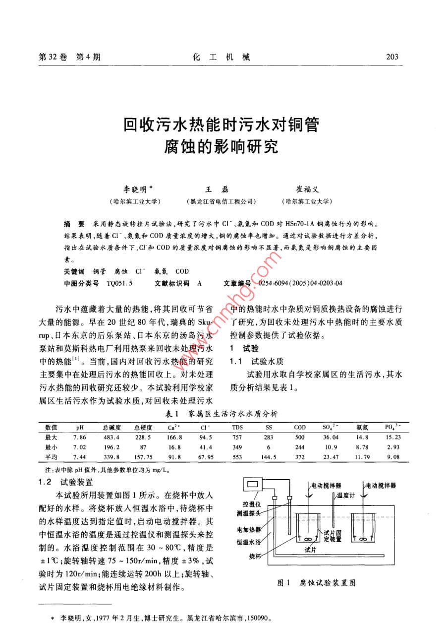 回收污水熱能時(shí)污水對(duì)銅管腐蝕的影響研究