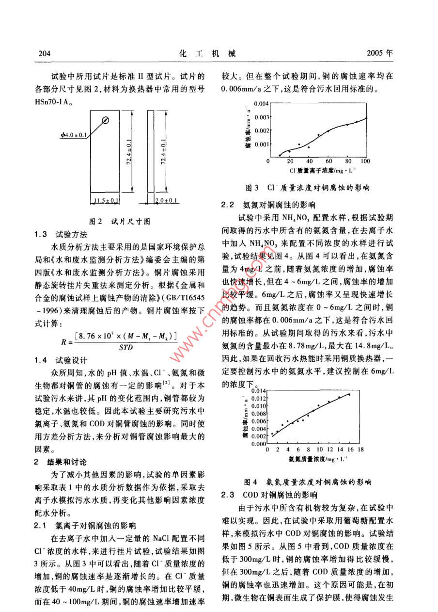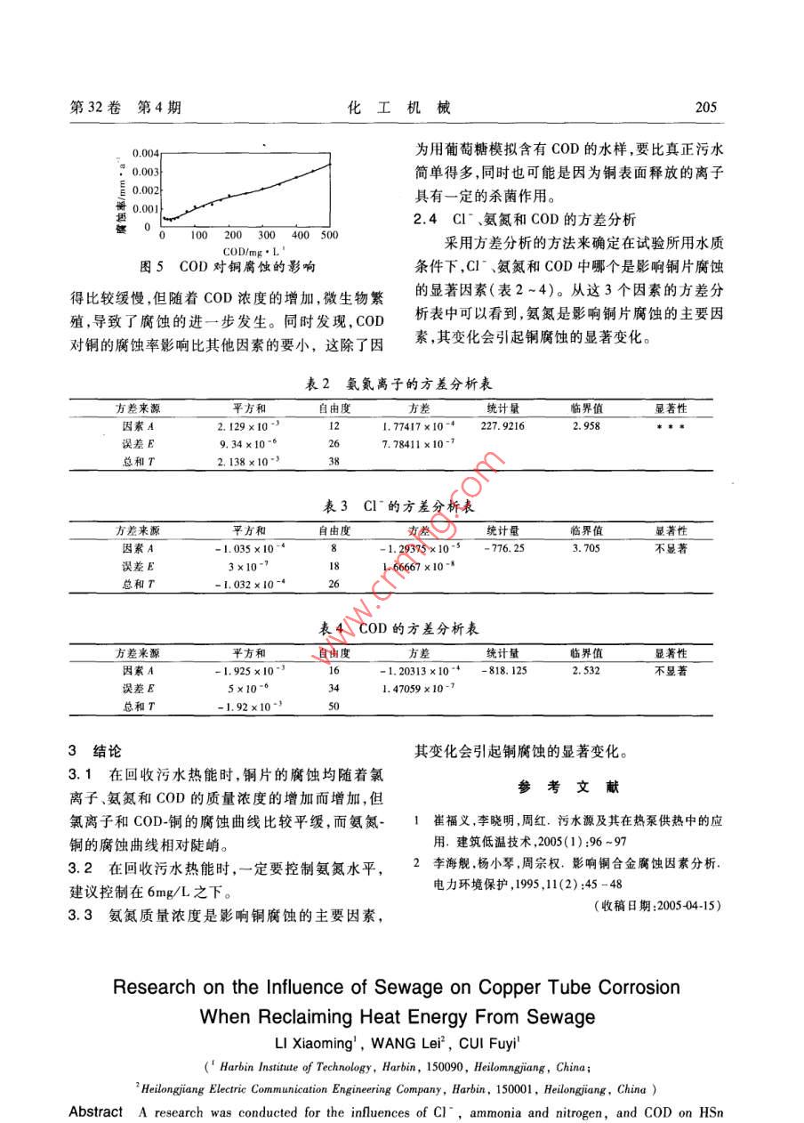 第32卷第4期化工機(jī)械203回收污水熱能時(shí)污水對(duì)銅管腐蝕的影響研究李曉明王磊崔福義(哈爾濱工業(yè)大學(xué))(黑龍江省電信工程公司)(哈爾濱工業(yè)大學(xué)摘要杗用靜態(tài)旋轉(zhuǎn)掛片試驗(yàn)法,研究了污水中C|、氯氦和COD對(duì)HSn70-1A銅腐蝕行為的影響。結(jié)果表明,隨著Clˉ、氨氪和COD質(zhì)量濃度的增大,銅的腐蝕率也增加。通過(guò)對(duì)試驗(yàn)數(shù)據(jù)進(jìn)行方差分析指出在試驗(yàn)水質(zhì)條件下,Cl和COD的質(zhì)量濃度對(duì)銅腐蝕的影響不顯著,而氧氮是影響銅腐蝕的主要因關(guān)鍵詞銅管腐蝕C氯氮COD中圖分類號(hào)TQ051.5文獻(xiàn)標(biāo)識(shí)碼A文章編號(hào)02546094(2005)04020304污水中蘊(yùn)藏著大量的熱能,將其回收可節(jié)省中的熱能時(shí)水中雜質(zhì)對(duì)銅質(zhì)換熱設(shè)備的腐蝕進(jìn)行大量的能源。早在20世紀(jì)80年代,瑞典的Sku-了研究,為回收未處理污水中熱能時(shí)的主要水質(zhì)rup、日本東京的后樂(lè)泵站、日本東京的湯島污水控制參數(shù)提供了試驗(yàn)依據(jù)。泵站和莫斯科熱電廠利用熱泵來(lái)回收未處理污水1試驗(yàn)中的熱能。當(dāng)前,國(guó)內(nèi)對(duì)回收污水熱能的研究1.1試驗(yàn)水質(zhì)主要集中在處理后污水的熱能回收上。對(duì)未處理試驗(yàn)用水取自學(xué)校家屬區(qū)的生活污水,其水污水熱能的回收研究還較少。本試驗(yàn)利用學(xué)校家質(zhì)分析結(jié)果見(jiàn)表1。屬區(qū)生活污水作為試驗(yàn)水質(zhì),對(duì)回收未處理污水表1家屬區(qū)生活污水水質(zhì)分析數(shù)值PH總堿度總硬度Ca2CTss5c0050,2氨氮PO3最大7.86483.4228.566.875715.23最小144.57223.4711.799.08注:表中除pH值外,其他參數(shù)單位均為mg/L1.2試驗(yàn)裝置電動(dòng)攪拌器電動(dòng)攪拌器本試驗(yàn)所用裝置如圖1所示。在燒杯中放入溫度計(jì)配好的水樣。將燒杯放入恒溫水浴中,待燒杯中控溫儀測(cè)溫探頭的水樣溫度達(dá)到指定值時(shí),啟動(dòng)電動(dòng)攪拌器。其中恒溫水浴的溫度是通過(guò)控溫儀和測(cè)溫探頭來(lái)控電加熱器恒溫水浴制的。水浴溫度控制范圍在30~80℃,精度是±1℃;旋轉(zhuǎn)軸轉(zhuǎn)速75~150r/min,精度±3%,試驗(yàn)時(shí)為120r/min;能連續(xù)運(yùn)轉(zhuǎn)200h以上;旋轉(zhuǎn)軸、試片固定裝置和燒杯用電絕緣材料制作。圖1腐蝕試驗(yàn)裝置圖李曉明,女,1977年2月生,博士研究生。黑龍江省哈爾濱市,150090。204化工機(jī)械2005年試驗(yàn)中所用試片是標(biāo)準(zhǔn)Ⅱ型試片。試片的較大。但在整個(gè)試驗(yàn)期間,銅的腐蝕速率均在各部分尺寸見(jiàn)圖2,材料為換熱器中常用的型號(hào)0.006mm/a之下,這是符合污水回用標(biāo)準(zhǔn)的HSn70-1A。0.0040.002d4.0±0.1擺0C質(zhì)量離子濃度mg·L圖3Cl質(zhì)量濃度對(duì)銅腐蝕的影響15±022氨氮對(duì)銅腐蝕的影響圖2試片尺寸圖試驗(yàn)中采用NH4NO3配置水樣,根據(jù)試驗(yàn)期1.3試驗(yàn)方法間取得的污水中所含有的氨氮含量,在去離子水水質(zhì)分析方法主要釆用的是國(guó)家環(huán)境保護(hù)總中加入NH2NO,來(lái)配置不同濃度的水樣進(jìn)行試局和《水和廢水監(jiān)測(cè)分析方法》編委會(huì)主編的第驗(yàn)試驗(yàn)結(jié)果見(jiàn)圖4。從圖4可以看出,在氨氮含四版《水和廢水監(jiān)測(cè)分析方法》。銅片腐蝕采用量為4mg/L之前,隨著氨氮濃度的增加腐蝕率靜態(tài)旋轉(zhuǎn)掛片失重法來(lái)測(cè)定分析。根據(jù)《金屬和也快速增長(zhǎng),但在4-6mg/L之間,腐蝕率的增加合金的腐蝕試樣上腐蝕產(chǎn)物的清除》(GBT16545比較平緩。6mg/L之后,腐蝕率又呈現(xiàn)快速增長(zhǎng)199來(lái)清理腐蝕后的產(chǎn)物。銅片腐蝕率按下的趨勢(shì)。而且氨氮濃度在0-6mgL之間時(shí),銅式計(jì)算的腐蝕率都在0.006mm/a之下,這是符合污水回[8.76×10×(M-M,-M)]用標(biāo)準(zhǔn)的。從試驗(yàn)期間取得的污水來(lái)看,污水中STD氨氮的含量最小在8.78mg/L,最大在148mg/L。1.4試驗(yàn)設(shè)計(jì)因此,如果在回收污水熱能時(shí)采用銅質(zhì)換熱器眾所周知,水的pH值、水溫、Cl-、氨氮和微定要控制污水中的氨氮水平,建議控制在6mg/L生物都對(duì)銅管的腐蝕有一定的影響。對(duì)于本的濃度下b+試驗(yàn)污水來(lái)講,其pH的變化范圍內(nèi),銅管都較為穩(wěn)定,水溫也較低。因此本試驗(yàn)主要研究污水中0.0100.008氯離子、氨氮和COD對(duì)銅管腐蝕的影響。同時(shí)使0.0060.004用方差分析方法,來(lái)分析對(duì)銅管腐蝕影響最大的0.002因素。0246810121416182結(jié)果和討論氨氮質(zhì)量濃度/mg·L為了減小其他因素的影響,試驗(yàn)的單因素影響采取表1中的水質(zhì)分析數(shù)據(jù)作為依據(jù),采取去圖4氨氦質(zhì)量濃度對(duì)銅腐蝕的影響離子水模擬污水水質(zhì),再變化其他影響因素濃度23c0D對(duì)銅腐蝕的影響配水分析。由于污水中所含有機(jī)物較為復(fù)雜,在試驗(yàn)中1氯離子對(duì)銅腐蝕的影響難以實(shí)現(xiàn)。因此,在試驗(yàn)中采取用葡萄糖配置水在去離子水中加人一定量的NaC配置不同樣來(lái)模擬污水中COD對(duì)銅腐蝕的影響。試驗(yàn)結(jié)C濃度的水樣,來(lái)進(jìn)行掛片試驗(yàn)試驗(yàn)結(jié)果如圖果如圖5所示。從圖5中看到,COD質(zhì)量濃度在3所示。從