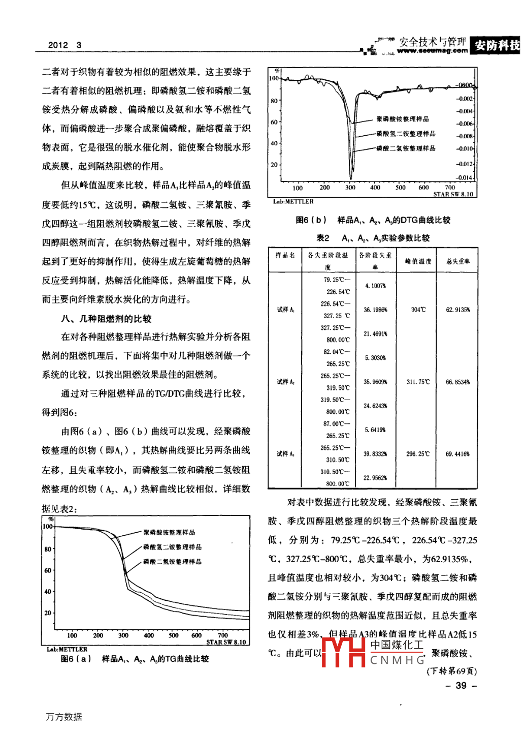 安防科技安全技術(shù)與管理201234.oiag裝飾織物的熱解特性研究安麗麗'高晶1.安順市消防支隊,貴州,5610002.唐山市消防支隊,河北,063000【摘要】本文用三種阻燃配方分別對織物進行阻燃整理,并用熱重分析儀對各阻燃樣品進行熱重實驗,得到各樣品的TG曲線和DTG曲線。對曲線進行分析,得到各阻燃樣品各熱解階段的溫度范圍、失重率、主要熱解階段的峰值溫度等參數(shù)。【關(guān)鍵詞】裝飾織物阻燃熱解熱重分析引言、阻燃劑的配制及阻燃方案隨著科學技術(shù)的不斷發(fā)展以及紡織業(yè)的進步,織阻燃劑的配制和阻燃方案見表1:物在人們?nèi)粘I罴吧a(chǎn)中的應(yīng)用范圍及數(shù)量大幅增表1阻燃劑的配制及阻燃方案阻燃劑配比(質(zhì)量比)水的用量加,無論是在居民家庭、辦公場所,還是在賓館飯店、歌舞劇院,為了追求時尚,營造溫馨宜人的環(huán)方案1聚磷酸銨:三聚氟膠:季皮四醇=3.1:1400方案2磷酸氫二銨:三聚氟胺:季戊四醇=3:1:1400g境,各種色彩艷麗、美觀大方的織物被廣泛應(yīng)用,但方萊3“酸氧鐵:二聚胺:季戊四:31這同時也帶來了極大的火災(zāi)隱患。按照表1中的方案,將阻燃劑配制成10%的溶1994年的新疆克拉瑪依友誼館火災(zāi)、遼寧阜新藝液,對織物進行阻燃整理,所得阻燃樣品分別標記為苑歌舞廳火災(zāi)以及1985年的哈爾濱天鵝飯店火災(zāi),都A,A,A,未阻燃整理織物樣品標記為A。是由于織物不具備阻燃性能被引燃并蔓延引起的。三、織物的阻燃整理據(jù)火災(zāi)原因調(diào)查統(tǒng)計,約有20%的火災(zāi)是由于織物引實驗用織物為純棉印花布起的。因此,對織物進行阻燃研究,賦予織物阻滯燃阻燃整理工藝流程:燒的性能,減少其燃燒危險性以及燃燒時有毒氣體浸軋阻燃整理液(ih)→◆預(yù)烘(98℃-105的釋放是一項刻不容緩的工作?!?3min)TTH中國煤化工—≯水洗→烘干(110℃CNMHG20123安全技術(shù)與管理安防科斗四、實驗儀器為三個階段:初始熱解階段、主要熱解階段和殘渣熱解階段。各個階段的熱解溫度范圍及失重率可由圖2中讀出。初始熱解階段溫度范圍為90℃-322.52℃,這個階段是纖維素熱解的開始,主要表現(xiàn)為纖維物理性能的變化及少量失重,失重率為6.8292%;32.52℃一4392℃屬于主要熱解階段,這一階段的失重速率很圖1TGA851型熱重分析儀(瑞士梅特勒公司)快,失重量很大,失重率為750249%,出現(xiàn)最大失重TGA85型熱重分析儀是具有同步DTA及DSC功時的峰值溫度T為378.85℃;43972℃-800屬于能的最新一代熱重分析儀。它具有溫度范圍寬、溫度殘渣熱解階段,熱解進行到該階段后,脫水、炭化熱準確度髙、可明確確定氣氛、單坩堝等特點。全程測解反應(yīng)的方向更加明顯,纖維素燃燒殘渣繼續(xù)脫水、量點達一百萬個,最高升溫速率可達100℃c/min,最脫羧,放出水和二氧化碳等,并進行重排反應(yīng),形成高溫度為1600℃,溫度波動控制在±0.25℃,重量靈雙鍵、羰基和羧基產(chǎn)物,殘渣中碳含量越來越高敏度為±0.1μg。,但只表現(xiàn)出少量失重,失重率僅為41791%。CS101-E電熱鼓風干燥箱(重慶四達實驗儀器七、阻燃織物的熱解過程及分析有限公司)經(jīng)阻燃整理后,纖維的三個熱解階段仍舊存在五、實驗條件但溫度范圍及失重率有了較大的變化。同時,由于不初始溫度30℃,終止溫度80℃,升溫速率15℃同阻燃劑具有不同的阻燃效果,因此,實驗中使用了/min,天平保護性氣體N2,流量30 ml/min,反應(yīng)性氣六種不同的阻燃劑分別對織物進行阻燃整理,通過對體N2,流量30m/min。熱解曲線( TG/DTG曲線)進行比較,得到最佳的阻六、織物熱解的典型過程燃配方。圖2所示是未阻燃整理樣品(即A)的熱解曲通過對聚磷酸銨(APP)、三聚氰胺、季戊四醇線阻燃整理的織物(即樣品A1)進行熱解實驗,得到曲線如圖3所示:80空白樣:9.7560mg00050010聚磷酸銨、三聚氰胺60李四酶整理樣品00100015001STAR SWLah: METTLER圖2樣品A熱解曲線中國煤化由圖2可以看出,未經(jīng)阻燃整理的織物熱解可分Lab: METTlERCNMHG37安防科技安個技術(shù)與理”20123由圖3可以看出,經(jīng)聚磷酸銨、三聚氰胺、季戊℃-3195℃,失重率為359609%;最大失重所對應(yīng)四醇阻燃整理的織物,其初始熱解階段溫度范圍為的峰值溫度T為311.75℃;殘渣熱解階段的溫度范圍7925℃-22654℃,失重率為41007%;主要熱解階為3195℃-80℃,失重率為246243%。段溫度范圍為226.54℃-327.25℃,失重率為通過對磷酸二氫銨、三聚氰胺、季戊四醇阻燃整361986%,最大失重對應(yīng)的峰值溫度T。為304℃,殘理的織物(即樣品A3)進行熱解實驗,得到曲線如圖渣熱解階段溫度范圍為32725℃-800℃,失重率為5所示:21.4691%。在對聚磷酸銨的阻燃機理進行分析后,發(fā)現(xiàn)聚磷801重二感、聚架酸銨具有以下幾方面作用:00061.釋放出聚磷酸,作為氧的物理屏障,阻隔了織0m08物與氧氣的接觸,起到絕熱和隔絕空氣的作用;2.作為親核劑,可促進鄰近的懸垂腈基發(fā)生低聚反應(yīng)以形成階梯聚合物;100200300400500600700STAR SW 83.作為催化劑,具有很強的催化脫水作用,促使圖4樣品A熱解曲線階梯結(jié)構(gòu)去氫向全碳質(zhì)炭轉(zhuǎn)變(聚磷酸基牢固地聯(lián)結(jié)在碳質(zhì)炭上),其經(jīng)驗式為CH1P200020004同時,由于聚磷酸銨屬于氮磷化合物,是磷氮系阻燃樣品阻燃劑的一種,具有很好的磷-氮協(xié)效作用,其協(xié)同效應(yīng)的機理主要體現(xiàn)在以下幾點:(1)氮與磷