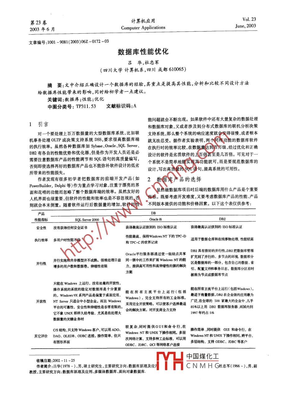 第23卷計算機應(yīng)用Vol. 232003年6月Computer ApplicationsJune, 2003文章編號:1001 -9081(2003)06Z -0172 -03數(shù)據(jù)庫性能優(yōu)化呂華,杜忠軍(四川大學(xué)計算機系,四川成都610065)摘要:文中介紹正確設(shè)計一個數(shù)據(jù)庫的經(jīng)驗,其重點是提高其性能,分析和比較不同設(shè)計方法給數(shù)據(jù)庫性能帶來的影響,同時給初學(xué)者-點建議。關(guān)鍵詞:數(shù)據(jù)庫;性能;優(yōu)化中圖分類號: TP311.53文獻標識碼:A能問題就會不斷出現(xiàn)。如果軟件中還有大量復(fù)雜的數(shù)據(jù)處理引言和數(shù)據(jù)庫對象,又或者涉及到分布式數(shù)據(jù)庫的聯(lián)機分析決策對一個要處理.上百萬數(shù)據(jù)量的大型數(shù)據(jù)庫系統(tǒng),比如聯(lián)支持系統(tǒng),那么整個系統(tǒng)的響應(yīng)速度就會變得很慢,或者根本機事務(wù)處理OLIP或決策支持系統(tǒng)DSS,要求很高數(shù)據(jù)庫端就無法忍受。據(jù)作者實驗表明,兩個同樣功能的數(shù)據(jù)庫軟件的執(zhí)行效率。雖然各種數(shù)據(jù)庫如Sybase、Oracle、SQL Server、在執(zhí)行時的效率比較,在數(shù)據(jù)量達到百萬級,經(jīng)過優(yōu)化和正確DB2有各自的性能優(yōu)勢和優(yōu)化器,但是作為開發(fā)人員還是必設(shè)計的軟件是劣質(zhì)軟件的上百倍甚至是幾百倍。可見對于一需要注意數(shù)據(jù)庫產(chǎn)品的性能調(diào)節(jié)和SQL語句的高質(zhì)量編寫,個系統(tǒng)不是簡單地能實現(xiàn)其功能就可,而是要規(guī)范數(shù)據(jù)庫的否則即使選擇再好的數(shù)據(jù)庫產(chǎn)品也不能彌補軟件設(shè)計的低劣設(shè)計,寫出高質(zhì)量的SQL語句,提高系統(tǒng)的可用性。所帶來的性能損失。作者發(fā)現(xiàn)有很多初學(xué)者把數(shù)據(jù)庫的前端開發(fā)產(chǎn)品(如2數(shù)據(jù)庫產(chǎn)品的選擇.PowerBuilder, Delphi等)作為重點學(xué)習(xí)對象,注重于漂亮的界顯然做數(shù)據(jù)庫項目時后端的數(shù)據(jù)庫用什么產(chǎn)品是個重要面和花哨的功能而忽略了整個數(shù)據(jù)庫端的效率。雖然友好的指標。既要考慮開發(fā)難度,又要考慮數(shù)據(jù)庫產(chǎn)品的性能、產(chǎn)品人機界面也很重要,但軟件的性能和效率也是不容忽視的,否則就會本末倒置。隨著軟件運行后數(shù)據(jù)量的增加,軟件的性不同版本提供的功能和價格因素。以下這個表僅供參考:產(chǎn)品DB性能指標SQL Server 2000Oracle 8iDB2安全性沒有獲得任何安全證書獲得最高認證級別的Iso標準認證執(zhí)行效率多用戶時性能不佳性能最高,保持Windows NT下的TPC-D適用于數(shù)據(jù)倉庫和在線事物處理,性能較高和TPC-C的世界記錄Oraele平行服務(wù)器通過使-組結(jié)點共享DB2具有很好的并行性。DB2把數(shù)據(jù)庫管理并行實施和共存模型并不成熟。很難處理日益同一簇中的工作來擴展 Windows NT的能擴充到了并行的、多節(jié)點的環(huán)境數(shù)據(jù)庫分并行性區(qū)是數(shù)據(jù)庫的一部分, 包含自己的數(shù)據(jù)、索增多的用戶數(shù)和數(shù)據(jù)卷。伸縮性有限力,提供高可用性和高伸縮性的簇的解決引配置文件和事務(wù)日志。數(shù)據(jù)庫分區(qū)有時方案.被稱為節(jié)點或數(shù)據(jù)庫節(jié)點只能在Windows上運行,沒有絲毫的開放性,操作系統(tǒng)的系統(tǒng)的穩(wěn)定對數(shù)據(jù)庫是十分重要能在所有主流平臺上運行(包括能在所有主流平臺上運行(包括Windows)。的。Windows 9X系列產(chǎn)品是偏重于桌面應(yīng)用,Windows)。完全支持所有的工業(yè)標準。最適于海量數(shù)據(jù)。DB2在企業(yè)級的應(yīng)用最為開放性NT Server只適合中小型企業(yè)。而且Windows采用完全開放策略??梢允箍蛻暨x擇最適廣泛,在全球的500 家最大的企業(yè)中兒乎平臺的可靠性,安全性和伸縮性是非常有限的。合的解決方案。對開發(fā)商全力支持85%以上用DB2 數(shù)據(jù)庫服務(wù)器,而國內(nèi)到它不象UNX那樣久經(jīng)考驗,尤其是在處理大1997年約占5%數(shù)據(jù)量的關(guān)鍵業(yè)務(wù)時cIs結(jié)構(gòu),只支持Windows客戶,可以用ADO、較復(fù)雜,同時提供GUI和俞令行.在操作簡單,同時提供GUI 和命令行,在其它評價DAO、 OLEDB. ODBC連接。操作簡單,但只Windows NT和UNX下操作相同。多層Windows NT和UNIX下操作相同??缙脚_,次網(wǎng)絡(luò)計算,支持多種工業(yè)標準,可以用有圈形界面ODBC. JDBC、0CI等網(wǎng)絡(luò)客戶連接多層結(jié)構(gòu),支持0DBC、JDBC等客戶中國煤化工收稿日期:2002-11-25作者簡介:昌華(1978-),男,碩士研究生,主要研究方向:數(shù)據(jù)庫原理及應(yīng),MYHCN M H G杜忠軍(1966-),男,副教授,主要研究方向:數(shù)據(jù)庫原理及應(yīng)用多媒體數(shù)據(jù)庫、面向?qū)ο髷?shù)據(jù)庫.呂華等:數(shù)據(jù)庫性能優(yōu)化6月如果應(yīng)用程序設(shè)計不當(dāng)就會造成過多的網(wǎng)絡(luò)V0,嚴重影響3優(yōu)化的數(shù)據(jù)庫設(shè)計整個系統(tǒng)的性能。通常對于C/S系統(tǒng)網(wǎng)絡(luò)流量是整個系統(tǒng)要提高- -個數(shù)據(jù)庫產(chǎn)品的質(zhì)量,最重要的就是要提高其的瓶頸。提高網(wǎng)絡(luò)vo原則是盡量使數(shù)據(jù)處理在數(shù)據(jù)庫端批執(zhí)行效率。整個數(shù)據(jù)庫產(chǎn)品的性能取決于三方面:前端功能量執(zh