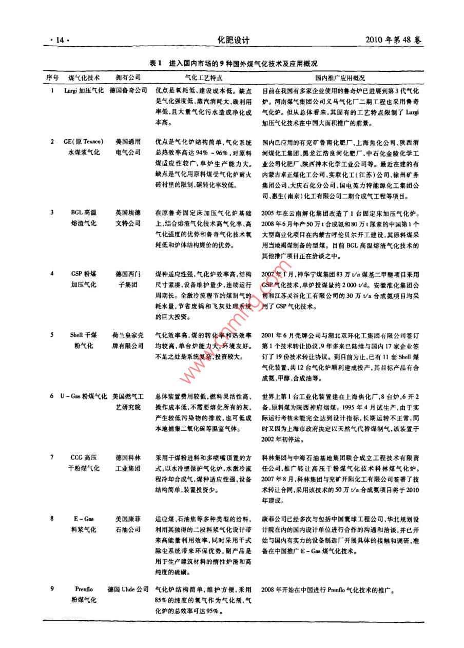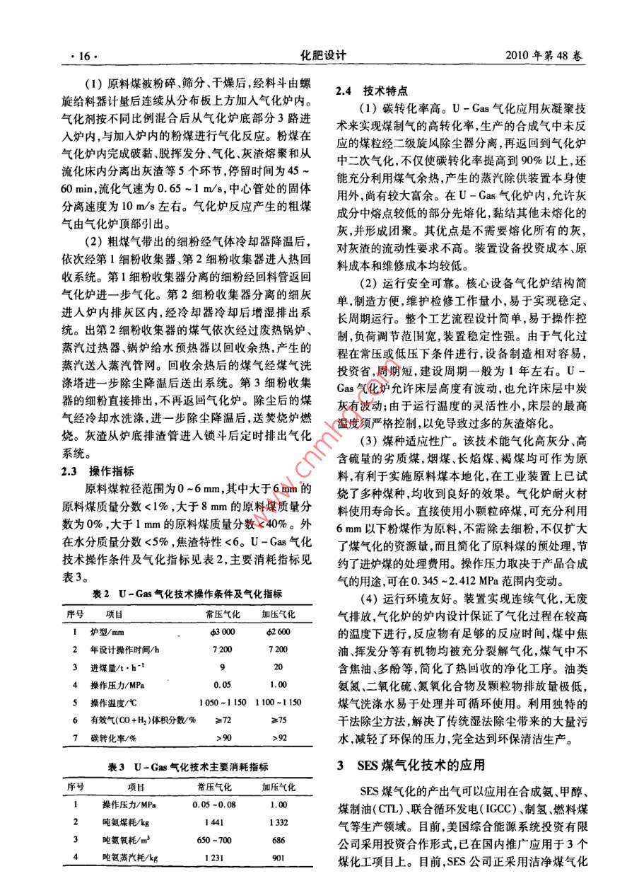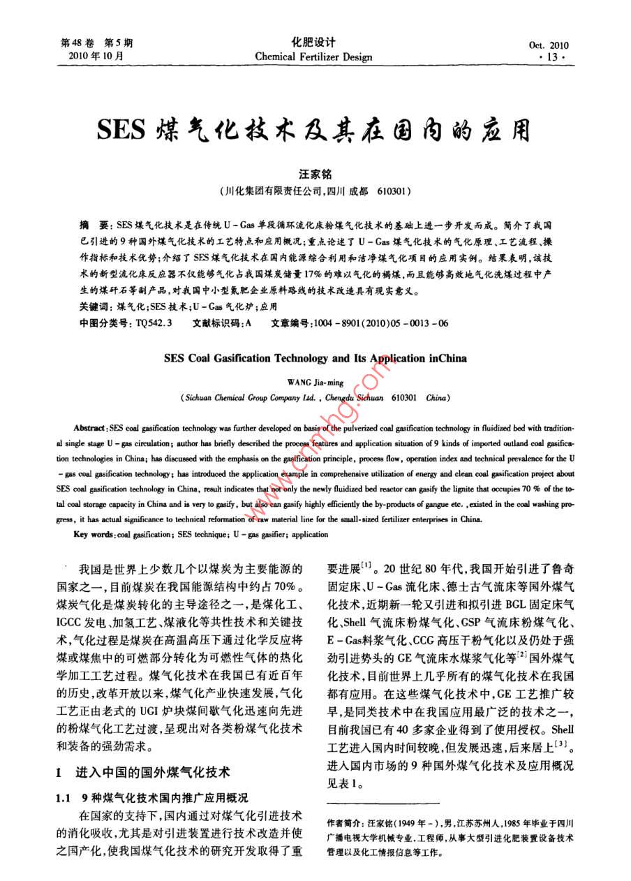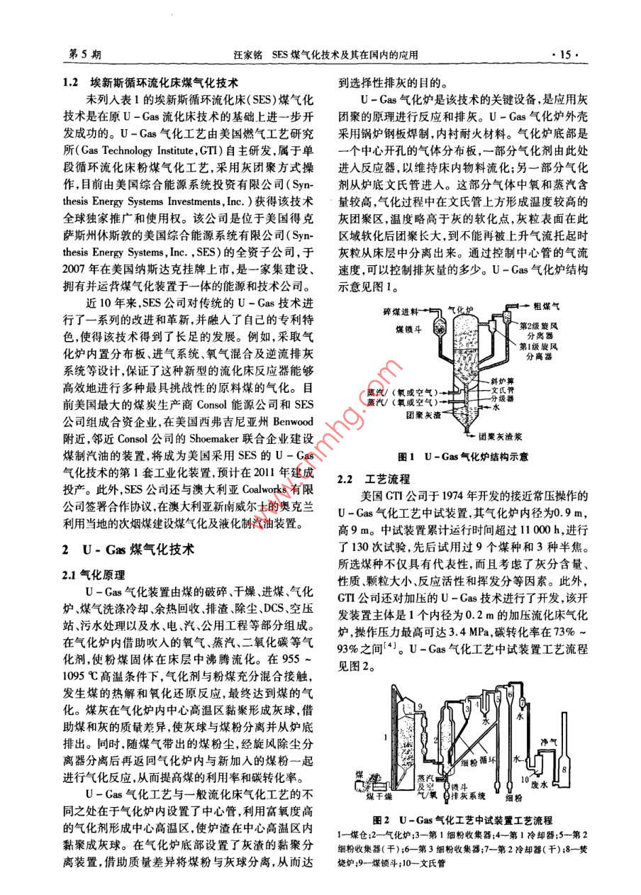 第48卷第5期化肥設(shè)計(jì)Oet. 20102010年10月Chemical Fertilizer Design●13●SES煤氣化技術(shù)及其在國(guó)內(nèi)的應(yīng)用汪家銘(川化集團(tuán)有限責(zé)任公司,四川成都610301)摘要: SES煤氣化技術(shù)是在傳統(tǒng)U- Cas單段循環(huán)流化床粉煤氣化技術(shù)的基礎(chǔ)上進(jìn)一步開發(fā)而成。簡(jiǎn)介了我國(guó)已引進(jìn)的9種國(guó)外煤氣化技術(shù)的工藝特點(diǎn)和應(yīng)用概況;重點(diǎn)論述了U-Gas煤氣化技術(shù)的氣化原理、工藝流程、操作指標(biāo)和技術(shù)優(yōu)勢(shì);介紹了SES煤氣化技術(shù)在國(guó)內(nèi)能源綜合利用和潔凈煤氣化項(xiàng)目的應(yīng)用實(shí)例。結(jié)果表明,該技術(shù)的新型流化床反應(yīng)器不僅能夠氣化占我國(guó)煤炭?jī)?chǔ)量17%的難以氣化的褐煤.而且能夠高效地氣化洗煤過程中產(chǎn)生的煤矸石等副產(chǎn)品,對(duì)我國(guó)中小型氮肥企業(yè)原料路線的技術(shù)改造具有現(xiàn)實(shí)意義。關(guān)鍵詞:煤氣化;SES技術(shù);U-Cas氣化爐;應(yīng)用中圄分類號(hào): TQ542.3文獻(xiàn)標(biāo)識(shí)碼:A 文章編號(hào):1004 - 8901 (2010)05 -0013 -06SES Coal Gasification Technology and Its Application inChinaWANG Jia- ming(Sichuan Chemical Group Companry Id.,Chengdu Sichuan 610301 China)Abstract:SES coal gasifcation technology was further developed on basis of the pulverized coal gasification technology in fluidized bed with tradition-al single stage U - gas cireultion; author has briely deseribed the procee features and pplication siuatio of 9 kinds of imponted ouland coal gasificaetion technologies in China; has discussed with the emphasis on the gasification principle, process flow , operation index and technical preralence for the U- gas coal gasification lechnology ; has introduced the application example in comprechensive uizaion of energy and clean coal gasifieation project aboutSES coal gasifieation technology in China, reulht indicates that not only the newly fluidized bed reactor can gasify the lignite that occupies 70 % of the to-tal coal storage capacity in China and is very to gasif, but also can gasify highly eficienly the by-products of gangue etc. ,cxisted in the coal washing pro-ges, it has actual sigifcance to lechnical eormation of raw material line for the small- sized frilier enterprises in China.Key words:coal gasification; SES technique; U - gas gasifier; application我國(guó)是世界上少數(shù)幾個(gè)以煤炭為主要能源的要進(jìn)展'。20世紀(jì)80年代,我國(guó)開始引進(jìn)了魯奇國(guó)家之一,目前煤炭在我國(guó)能源結(jié)構(gòu)中約占70%。固定床、U- Gas流化床、德士古氣流床等國(guó)外煤氣煤炭氣化是煤炭轉(zhuǎn)化的主導(dǎo)途徑之一,是煤化工、化技術(shù),近期新-輪又引進(jìn)和擬引進(jìn)BGL固定床氣ICCC發(fā)電、加氫工藝、煤液化等共性技術(shù)和關(guān)鍵技化Shell氣流床粉煤氣化、GSP氣流床粉煤氣化、術(shù),氣化過程是煤炭在高溫高壓下通過化學(xué)反應(yīng)將E-Cas料漿氣化、CCG高壓干粉氣化以及仍處于強(qiáng)煤或煤焦中的可燃部分轉(zhuǎn)化為可燃性氣體的熱化勁引進(jìn)勢(shì)頭的CE氣流床水煤漿氣化等123國(guó)外煤氣學(xué)加工工藝過程。煤氣化技術(shù)在我國(guó)已有近百年化技術(shù),目前世界上幾乎所有的煤氣化技術(shù)在我國(guó)的歷史,改革開放以來,煤氣化產(chǎn)業(yè)快速發(fā)展,氣化都有應(yīng)用。在這些煤氣化技術(shù)中,CE工藝推廣較工藝正由老式的UCI爐塊煤間歇?dú)饣杆傧蛳冗M(jìn)早,是同類技術(shù)中在我國(guó)應(yīng)用最廣泛的技術(shù)之一,的粉煤氣化工藝過渡,呈現(xiàn)出對(duì)各類粉煤氣化技術(shù)目前我國(guó)已有40多家企業(yè)得到了使用授權(quán)。Shell和裝備的強(qiáng)勁需求。工藝進(jìn)入國(guó)內(nèi)時(shí)間較晚,但發(fā)展迅速,后來居上[3]。進(jìn)入國(guó)內(nèi)市場(chǎng)的9種國(guó)外煤氣化技術(shù)及應(yīng)用概況1進(jìn)入中 國(guó)的國(guó)外煤氣化技術(shù)見表1。1.1 9 種煤氣化技術(shù)國(guó)內(nèi)推廣應(yīng)用概況在國(guó)家的支持下,國(guó)內(nèi)通過對(duì)煤氣化引進(jìn)技術(shù)作者簡(jiǎn)介:汪家銘(1949年-),男,江蘇蘇州人,1985年畢業(yè)于四川的消化吸收,尤其是對(duì)引進(jìn)裝置進(jìn)行技術(shù)改造并使廣播電視大學(xué)機(jī)械專業(yè).工程師,從事大型引進(jìn)化肥裝置設(shè)備技術(shù)之國(guó)產(chǎn)化,使我國(guó)煤氣化技術(shù)的研究開發(fā)取得了重管理以及化工情報(bào)信息等工作。. 14●化肥設(shè)計(jì)2010年第48卷表1進(jìn)入國(guó)內(nèi)市場(chǎng)的9種國(guó)外煤氣化技術(shù)及應(yīng)用概況序號(hào)煤氣化技術(shù)擁有公司氣化L藝特點(diǎn).國(guó)內(nèi)推廣應(yīng)用概況1 Lungj 加壓氣化德國(guó)魯奇公司優(yōu)點(diǎn)是氧耗低、建設(shè)成本低。 缺點(diǎn)目前在我國(guó)有 多家企業(yè)使用的魯奇爐已進(jìn)展到第3代氣化是氣化強(qiáng)度低蒸汽消耗大、碳利用爐。 河南煤氣集團(tuán)公司義馬氣化廠二期工程也采用魯奇率低,且大量氣化污水造成凈化成氣化爐。 但從總體看來,其固有的工藝特點(diǎn)限制了Lurgi本高。:加壓氣化技術(shù)在中國(guó)大面積推廣的前景。2 GE(原Texaco)美國(guó)通用優(yōu)點(diǎn)是氣化爐結(jié)構(gòu)簡(jiǎn)單,氣化系統(tǒng)國(guó)內(nèi)已應(yīng)用的有 