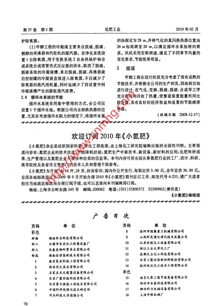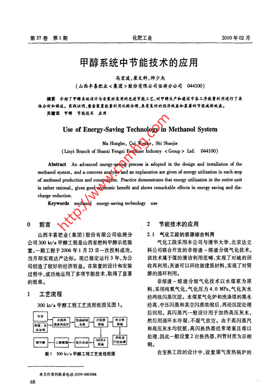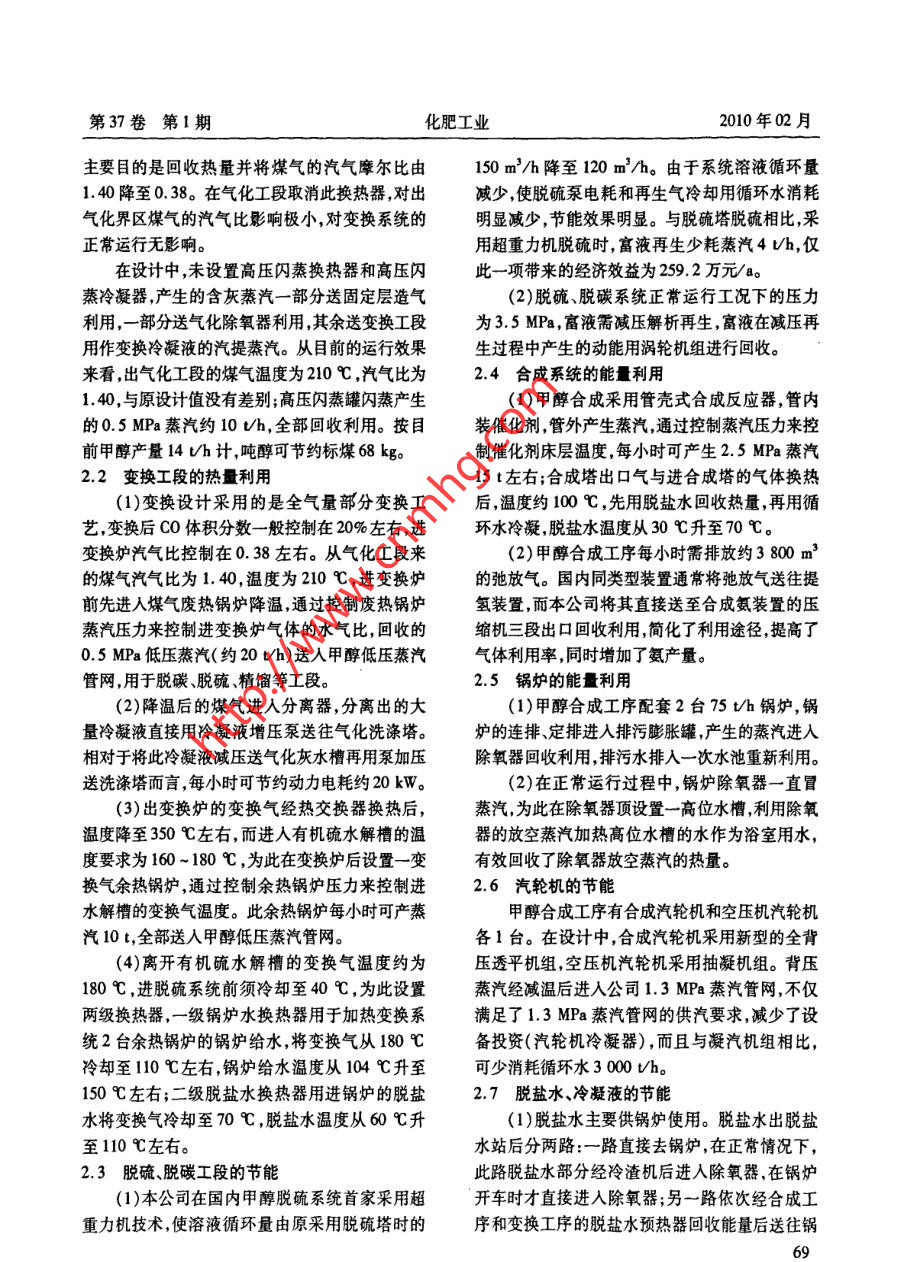 第37卷第1期化肥工業(yè)2010年02月甲醇系統(tǒng)中節(jié)能技術(shù)的應(yīng)用馬宏波,崔文科,師少杰(山西豐喜肥業(yè)<集團>股份有限公司臨猗分公司044100)摘要介紹了 甲醇系統(tǒng)設(shè)計與安裝時采用的先進節(jié)能工藝,對甲醇生產(chǎn)和建設(shè)中各工序能量利用進行了具體分析和闡述。實踐證明,整套裝置能量利用比較合理,具有良好的經(jīng)濟效益和顯著的節(jié)能減排效益。關(guān)鍵詞甲醇節(jié)能技術(shù)應(yīng)用Use of Energy-Saving Technology in Methanol SystemMa Hongbo, Cui Wenke, Shi Shaojie(Linyi Branch of Shanxi Fengxi Fertilizer Industry Ltd. 044100)Abstract An advanced energy -saving process is adopted in the design and intallation of themethanol system, and a concrete analysis and an explanation are given of energy utilization in each stepof methanol production and construction. Practice demonstrates that energy utilization in the entire unitis rather rational, gives good economic benefit and shows remarkable effects in energy saving and dis-charge reduction.Keywords methanol energy-saving technology use0前言2節(jié)能技術(shù)的應(yīng)用山西豐喜肥業(yè)(集團)股份有限公司臨猗分2.1氣化工段的資源綜合利用公司300 kU/a甲醇工程是山西省燃料甲醇示范裝氣化工段采用本公司與清華大學(xué)、北京達立置,一期工程于2006年1月23日一次投料成功,科公司聯(lián)合開發(fā)的非熔渣-熔渣分級氣化技術(shù)。當(dāng)月即實現(xiàn)達產(chǎn)達標(biāo)。現(xiàn)已穩(wěn)定運行3年,為公該技術(shù)屬于煤的清潔利用范疇,實現(xiàn)了對硫的回.司創(chuàng)造了較好的經(jīng)濟效益。在裝置的設(shè)計和安裝收再利用;灰渣可以回收做建筑材料,實現(xiàn)了對資過程中,成功地運用了多項節(jié)能技術(shù),取得了顯著源的循環(huán)利用。的效果。非熔渣-熔渣分級氣化技術(shù)以水煤漿為原料,采用純氧氣化,氣化壓力4. 0 MPa,氣化灰水1工藝流程經(jīng)兩級閃蒸沉淀。水煤漿氣化爐和洗滌塔的黑水300 kt/a甲醇工程工藝流程框圖見圖1。經(jīng)高、中壓閃蒸和真空閃蒸濃縮后,再經(jīng)沉淀處理后回用。高閃蒸汽一般設(shè)計用于加熱高壓灰水,t書錦清,低溫時碗。你限胺物合鐵1然后用循環(huán)水冷凝,不凝氣放空。由于高閃蒸汽煙煤、水-培渣兩段加廣L安換FL 脫硫廣脫碗L中加劑」和高壓灰水均較臟,高閃換熱器經(jīng)常堵塞且難以處理,因此-般設(shè)置2臺換熱器,列管材質(zhì)為雙相精平解三塔一低瓜風(fēng)一1回收驗磺鋼。圖1 300 kVa甲醇工程工藝流程框圖在變換工段的設(shè)計中,設(shè)置煤氣廢熱鍋爐的本文作者的聯(lián)系電話:0359 4063068第37卷第1期化肥工業(yè)2010年02月爐除氧器。.的揚程定為28 m,并將氣化的真閃換熱器位置由(2)甲醇工程的冷凝液主要來自脫硫、脫碳、26m標(biāo)高調(diào)至20m,以滿足循環(huán)水泵揚程的要精醇的再沸器和汽輪機的凝汽器。在凈化系統(tǒng)設(shè)求。風(fēng)機采用變頻調(diào)速,滿足了不同季節(jié)風(fēng)量的置1臺除氧器,用于變換系統(tǒng)2臺余熱鍋爐和合變化要求,節(jié)能效果明顯。成系統(tǒng)合成塔管殼式反應(yīng)器的供水,取消了脫硫、結(jié)語脫碳系統(tǒng)的冷凝液槽,來自脫硫、脫碳、再沸器液位控制罐的冷凝液直接進人除氧器,不僅減少了甲醇工程在設(shè)計階段充分考慮了現(xiàn)有成熟的除氧器的蒸汽消耗量,同時也減少了因設(shè)置中間節(jié)能技術(shù),并根據(jù)全公司的生產(chǎn)狀況,因地制宜地冷凝液槽產(chǎn)生的膨脹蒸汽浪費。進行設(shè)計,在氣化、變換、脫硫、脫碳合成等工序2.8循環(huán)水系統(tǒng)的節(jié)能充分利用和回收了熱量,使整套裝置能量利用比循環(huán)水系統(tǒng)采用集中管理的方式,全公司僅較合理,具有良好的經(jīng)濟效益和顯著的節(jié)能減排設(shè)置1個循環(huán)水池。根據(jù)公司內(nèi)全部換熱器的位效益。置,尤其在考慮循環(huán)水阻力的情況下,將循環(huán)水泵(收稿日期2008-12-17)0o00000000000000000000000000000000000000000o0歡迎訂閱2010年《小氮肥》《小氮肥》雜志是經(jīng)原國家科委、原化工部批準(zhǔn),由上海化工研究院編輯出版的全國性刊物。主要報道內(nèi)容有:氮肥企業(yè)的技術(shù)改造、節(jié)能降耗經(jīng)驗;氮肥生產(chǎn)中新技術(shù)、新設(shè)備、新材料的應(yīng)用;化肥科研成果、生產(chǎn)管理以及氮肥企業(yè)開展多種經(jīng)營的信息等。本刊內(nèi)容可供全國從事氮肥行業(yè)的工廠、設(shè)計、科研、高等院校及各省市主管部門的技術(shù)人員和管理干部參考。.《小氮肥》為月刊,大16開,28頁,封面彩印,國內(nèi)外公開發(fā)行,每期定價3.00元,全年定價36. 00元。全國各地郵政局已于2009年9月開始辦理2010年<小氮肥》期刊征訂工作,郵發(fā)代號4-233,請廣大讀者前往當(dāng)?shù)鼐徒]政局辦理訂閱手續(xù),也可以直接向本刊編輯部訂閱。地址:.上海市云嶺東路345號郵碼 :00062電話 :(021)52800372 52500962( 兼?zhèn)髡?《小氮肥》編輯部廣告目次頁碼單位彩色8洛陽市國奧重工機械有限公司封面湖南華自科技有限公司山西科靈催化凈化技術(shù)發(fā)展公司封二無錫市長慶化工防腐設(shè)備廠10江蘇世能化工設(shè)備有限公司封三長春東獅科貿(mào)實業(yè)有限公司11浙江工業(yè)大學(xué)化工廠封底湖南安淳高新技術(s