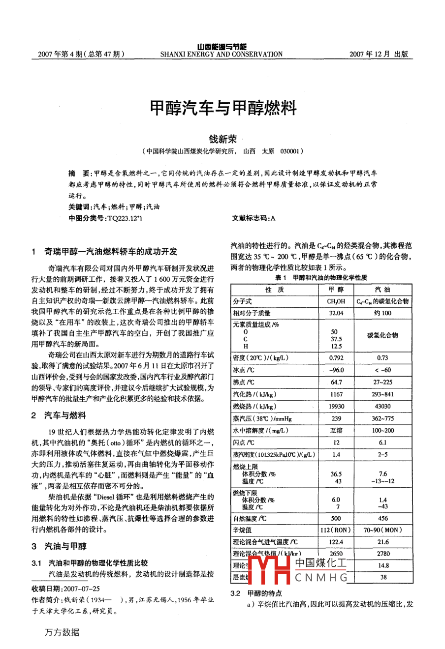 山西能與節(jié)能2007年第4期(總第47期)SHANXI ENERGY AND CONSERVATION2007年12月出版甲醇汽車與甲醇燃料錢新榮(中國科學(xué)院山西煤炭化學(xué)研究所,山西太原030001)摘要:甲醇是含氧燃料之一,它同傳統(tǒng)的汽油存在一定的差別,因此設(shè)計(jì)制造甲醇發(fā)動(dòng)機(jī)和甲醇汽車都應(yīng)考慮甲醇的特性,同時(shí)甲醇汽車所使用的燃料必須符合燃料甲醇質(zhì)量標(biāo)準(zhǔn),以保證發(fā)動(dòng)機(jī)的正常運(yùn)行。關(guān)鍵詞:汽車;燃料;甲醇;汽油中圖分類號(hào):TQ223121文獻(xiàn)標(biāo)志碼:A1奇瑞甲醇一汽油燃料轎車的成功開發(fā)汽油的特性進(jìn)行的。汽油是C~C1的烴類混合物,其沸程范圍寬達(dá)35℃-200℃,甲醇是單一沸點(diǎn)(65℃)的化合物,奇瑞汽車有限公司對國內(nèi)外甲醇汽車研制開發(fā)狀況進(jìn)兩者的物理化學(xué)性質(zhì)比較如表1所示。行大量的前期調(diào)研工作,接著又投人了1600萬元資金進(jìn)行表1甲醇和汽油的物理化學(xué)性質(zhì)發(fā)動(dòng)機(jī)和整車的研制,經(jīng)過不斷努力終于成功開發(fā)了擁有自主知識(shí)產(chǎn)權(quán)的奇瑞新旗云牌甲醇汽油燃料轎車。此前分子式CHOHC-C,的碳?xì)浠衔镂覈状计嚨难芯渴痉豆ぷ髦攸c(diǎn)是在各種比例甲醇的摻相對分子質(zhì)量32.04約100燒以及“在用車”的改裝上,這次奇瑞公司推出的甲醇轎車元素質(zhì)量組成填補(bǔ)了我國自主生產(chǎn)甲醇汽車的空白,開創(chuàng)了我國推廣應(yīng)碳?xì)浠衔镉眉状计嚨男戮置?。C奇瑞公司在山西太原對新車進(jìn)行為期數(shù)月的道路行車試密度(20℃)(kg)0.7920.73驗(yàn)取得了滿意的試驗(yàn)結(jié)果2070年6月11日在大原市召開了泳點(diǎn)r-96.0山西評(píng)價(jià)會(huì),受到與會(huì)的國家發(fā)改委,國內(nèi)汽車行業(yè)及醇汽部門的領(lǐng)導(dǎo)、專家們的高度評(píng)價(jià),并建議今后繼續(xù)擴(kuò)大試驗(yàn)規(guī)模,為沸點(diǎn)℃甲醇汽車的批量生產(chǎn)和產(chǎn)業(yè)化積累更多的經(jīng)驗(yàn)和技術(shù)依據(jù)。汽化熱/(kJ/kg)1167293~8412汽車與燃料蒸汽壓(38℃)/mmHg362-77519世紀(jì)人們根據(jù)熱力學(xué)熱能功轉(zhuǎn)化定律發(fā)明了內(nèi)燃水中溶解度/(mL互溶100-200機(jī)其中汽油機(jī)的“奧托(oto)循環(huán)”是內(nèi)燃機(jī)的循環(huán)之一,閃點(diǎn)r亦即利用液體或氣體燃料,直接在氣缸中燃燒爆震,產(chǎn)生巨蒸汽度(10320c0n)14大的壓力,推動(dòng)活塞往復(fù)運(yùn)動(dòng),再由曲軸轉(zhuǎn)化為平面移動(dòng)作燃燒上功,內(nèi)燃機(jī)是汽車的“心臟”,而燃料則是產(chǎn)生“能量”的“血體積分?jǐn)?shù)隔%液”,兩者是相互依存而密不可分的。13~-12柴油機(jī)是依據(jù)“ Diesel循環(huán)”也是利用燃料燃燒產(chǎn)生的6.0能量轉(zhuǎn)化為對外作功不論是汽油機(jī)還是柴油機(jī)都要依據(jù)所沮度陀用燃料的特性如沸程、蒸汽壓抗爆性等選擇合理的參數(shù)進(jìn)自然溫度rC行內(nèi)燃機(jī)各部件的設(shè)計(jì)。辛烷值112(RON)70-90(MON)3汽油與甲醇理論混合氣進(jìn)氣溫度r122427803.1汽油和甲醇的物理化學(xué)性質(zhì)比較理論中國煤化工汽油是發(fā)動(dòng)機(jī)的傳統(tǒng)燃料,發(fā)動(dòng)機(jī)的設(shè)計(jì)制造都是按層流CNMHG收稿日期:2007-07-2532甲醇的特點(diǎn)作者簡介:錢新榮(1934—),男,江蘇無錫人,1956年畢業(yè)于天津大學(xué)化工系,研究員。a)辛烷值比汽油高,因此可以提高發(fā)動(dòng)機(jī)的壓縮比,發(fā)14山西能與節(jié)能2007年12月動(dòng)機(jī)的熱效率明顯提高?,F(xiàn)有甲醇生產(chǎn)廠都是按照化工甲醇的標(biāo)準(zhǔn)進(jìn)行甲醇生b)甲醇的燃燒速度和火焰?zhèn)鞑ニ俣缺绕涂?所以燃產(chǎn),化工甲醇主要用作化工原料。所以產(chǎn)品純度是質(zhì)量控制燒的定容性較好燃燒持續(xù)期短,過后燃燒程度小,有利于熱的主要內(nèi)容,標(biāo)準(zhǔn)中12項(xiàng)指標(biāo)都是圍繞甲醇化合物自身特效率提高。性制定的。而燃料甲醇作為發(fā)動(dòng)機(jī)燃料必須按照發(fā)動(dòng)機(jī)燃料c)甲醇是含氧燃料,在燃燒過程中有自供氧效應(yīng),在的燃燒特性來制定標(biāo)準(zhǔn),所以兩者的要求有所區(qū)別。內(nèi)燃機(jī)中燃燒較均勻,減少了局部富氧或缺氧的幾率,CO和4.1標(biāo)準(zhǔn)內(nèi)容不同HC的產(chǎn)生量減少,排放量降低,從而使燃燒效率和熱效率均化工甲醇已有質(zhì)量標(biāo)準(zhǔn)GB338-2004。提高,能耗率降低有12項(xiàng)指標(biāo)色度、密度沸程、高錳酸鉀試驗(yàn)、水溶性試驗(yàn)d)甲醇的汽化熱比汽油高兩倍多,當(dāng)其進(jìn)入氣缸后,水份含量酸度、堿度羰基化合物、蒸發(fā)殘?jiān)蛩豳?、乙醇量。能吸收沿途管壁面后周圍高溫零件壁面的熱量而使自己蒸燃料甲醇目前只有山西省地方?biāo)準(zhǔn)DBl4/T93-2002發(fā),利用了廢熱余熱而使自身的能位提高,又降低了氣缸、燃有8項(xiàng)指標(biāo)密度沸程酸度、堿度、蒸發(fā)殘?jiān)?、水分含燒室和氣缸蓋的溫度,從而減少了外傳熱量提高了熱效率。量羰基化合物、辛烷值e)甲醇的著火燃燒濃度界限比汽油的相應(yīng)范圍寬得多,42生產(chǎn)工藝不同所以比汽油更容易稀燃,稀燃是一種節(jié)能燃燒和完善燃燒的化工甲醇生產(chǎn)的目的是純甲