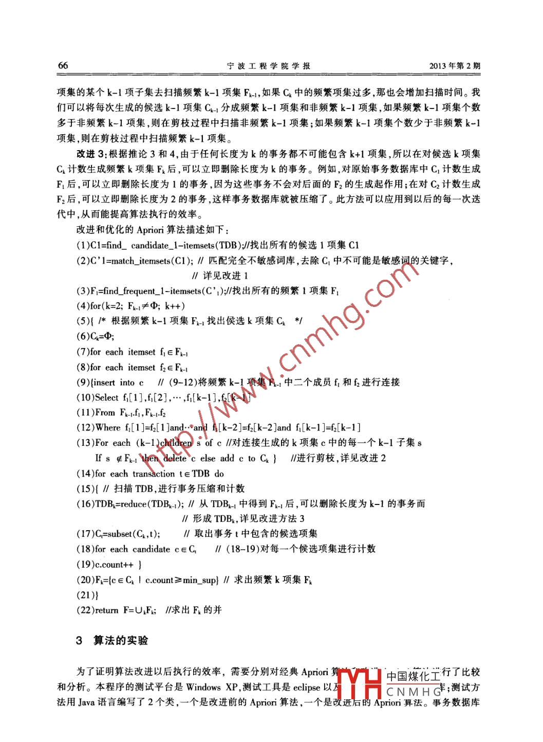 第25卷第2期寧波工程學(xué)院學(xué)報(bào)Vol.25 No.22013年6月JOURNAL OF NINGBO UNIVERSITY OF TECHNOLOGYJun.2013D0103969/.s.1008 -7109.2013.02.014Apriori算法的分析與改進(jìn)黃超君,范劍波(寧波工程學(xué)院,浙江寧波315000)摘要:在輿論分析系統(tǒng)中,高效 、準(zhǔn)確地獲取敏感詞一直是研究的熱點(diǎn)。由于Apriori 算法能較好地挖掘出事務(wù)之間的關(guān)系,并能快速找出新的敏感詞,所以探索改進(jìn)的Apriori算法顯的更為重要。本文分析了經(jīng)典Aprior算法的不足,提出了改進(jìn)的Apriori算法,優(yōu)化了程序執(zhí)行的效率。實(shí)驗(yàn)結(jié)果表明:改進(jìn)后的Aprioni 算法的執(zhí)行效率比經(jīng)典Aprioni算法的執(zhí)行效率要高。關(guān)鍵詞:數(shù)據(jù)挖掘;Aprioni算法;優(yōu)化中囝分類號:017文獻(xiàn)標(biāo)識(shí)碼:A文章編號:1008- -7109(2013)02 -0064-05引言關(guān)聯(lián)規(guī)則挖掘是近年來數(shù)據(jù)挖掘研究中的一個(gè)熱門領(lǐng)域,它反映了事務(wù)數(shù)據(jù)庫中一個(gè)事務(wù)與其他事務(wù)之間的相互依存性和關(guān)聯(lián)性,關(guān)聯(lián)規(guī)則的目的就是為了挖掘出大量數(shù)據(jù)間隱藏的關(guān)聯(lián),方便決策者對事務(wù)進(jìn)行判斷和決策。為了發(fā)現(xiàn)事務(wù)數(shù)據(jù)庫中存在的相互關(guān)聯(lián)的重要規(guī)則,AgrawalR和SrikantRU12I于 1993年首先提出了挖掘顧客交易數(shù)據(jù)庫中項(xiàng)集間關(guān)聯(lián)規(guī)則的問題,其核心方法是基于頻繁項(xiàng)集的遞推方法,并在1994年提出了關(guān)聯(lián)規(guī)則挖掘的快速算法;Park J. S.等人[)提出的DHP算法,縮減了事務(wù)數(shù)據(jù)庫的大小,減小了I/ 0操作時(shí)間,其效率比Apriori算法有了明顯的提高;Shirgaonkar S等人(4)提出了-種應(yīng)用于大學(xué)圖書館的Apriori改進(jìn)算法,還有-些作者8.8分別提出了不同的Apriori 改進(jìn)算法。本文結(jié)合BBS輿情分析系統(tǒng)的案例,提出了三項(xiàng)改進(jìn)措施,優(yōu)化了Apriori 算法,提高了算法的執(zhí)行效率。1 Apriori 算法的分析.1.1經(jīng)典Apriori算法的思想假設(shè)關(guān)聯(lián)規(guī)則挖掘的事務(wù)數(shù)據(jù)庫記為TDB = {T,T2, .. ,Tp,.. ,T,T=i,iz, .. ,小(1≤p≤n,),T .稱為事務(wù),i稱為項(xiàng)目。設(shè)I=( i.,,..... ,i.]是TDB中全體項(xiàng)目組成的集合。每一個(gè)事務(wù)T。是1中一組項(xiàng)目的集合,即T,CI,每個(gè)T。有一個(gè)唯- - 的標(biāo)識(shí)符TID。設(shè)項(xiàng)集X是1中項(xiàng)目的集合,如果X中有k個(gè)項(xiàng)目,那么稱X的長度為k,或稱為k項(xiàng)集。定義1:設(shè)和是項(xiàng)集,且x∩Y=O,規(guī)則X=>Y在TDB中具有支持度s就是TDB中包含X和Y的事務(wù)數(shù)與TDB中事務(wù)總個(gè)數(shù)之比,即:support(X=>Y )=support(XUY )=P(XUY)中國煤化工收稿日期:2013- 04-23作者簡介:黃超君,男,寧波工程學(xué)院電信學(xué)院計(jì)科091班學(xué)生;指導(dǎo)老師:范劍汕.MYHCNMHG授?;痦?xiàng)目:2012年度浙江省大學(xué)生科技創(chuàng)新活動(dòng)計(jì)劃(新苗人才計(jì)劃)項(xiàng)目(2012R422005)。黃超君范劍波:Aprioni算法的分析與改進(jìn)65定義2:設(shè)和是項(xiàng)集,且XY=,規(guī)則XY在TDB中具有置信度c就是TDB中同時(shí)包含和的事務(wù)數(shù)與TDB中包含的事務(wù)數(shù)之比,即:confdence(X=>Y)= sppor(8U)support(X)如果某個(gè)k項(xiàng)集{i,n,...,在TDB中出現(xiàn)的概率大于或等于最小支持度min.sup,則稱為頻繁k項(xiàng)集,記作Fr。經(jīng)典Apriori算法的思想就是將發(fā)現(xiàn)關(guān)聯(lián)規(guī)則的過程分為兩步:第1步是通過迭代,找出源事務(wù)數(shù)據(jù)庫TDB中所有的頻繁項(xiàng)集,即支持度不低于用戶指定的最小支持度min._sup的所有頻繁項(xiàng)集;第2步是根據(jù)第1步找出的頻繁項(xiàng)集構(gòu)造出置信度不低于用戶指定的最小置信度min._conf的強(qiáng)關(guān)聯(lián)規(guī)則。第1步工作的計(jì)算量和磁盤I/0量都很大,幾乎所有的關(guān)聯(lián)規(guī)則挖掘算法都是針對第1步提出的。經(jīng)典Apriori算法使用逐層搜索的迭代方法來產(chǎn)生頻繁項(xiàng)集,每--次迭代包括兩個(gè)步驟:如在第k次迭代中,首先根據(jù)頻繁k-1項(xiàng)集F-1通過自連接產(chǎn)生候選K項(xiàng)集Cr,在其中涉及連接步和剪枝步;然后對候選K項(xiàng)集C.根據(jù)最小支持度min. _sup 計(jì)數(shù)產(chǎn)生頻繁k項(xiàng)集Fr。迭代過程可以表示為:IC1F1C2F2C3F3C4F4。當(dāng)然,剪枝步和算法終止的條件均要用到以下Apriori算法的性質(zhì)。性質(zhì):頻繁項(xiàng)集的所有非空子集也必須是頻繁的。1.2經(jīng)典Apriori算法的不足經(jīng)典Apriori算法能夠比較有效地產(chǎn)生頻繁項(xiàng)集,但也存在著以下不足:(1)數(shù)據(jù)庫掃描的次數(shù)太多,每次尋找頻繁k項(xiàng)集(k=1,,n)時(shí)都需要掃描數(shù)據(jù)庫一次來求得候選項(xiàng)集的支持度,共需要掃描n次。如果遇到海量數(shù)據(jù)庫,或者n太大時(shí),耗時(shí)太長,難以滿足實(shí)際應(yīng)用的需要。(2)經(jīng)典Apriori算法會(huì)產(chǎn)生大量的中間項(xiàng)集,由頻繁k-1項(xiàng)集F-1進(jìn)行連接生成的候選k項(xiàng)集Ck數(shù)量巨大,每一次迭代產(chǎn)生的C,是呈指數(shù)級別增長的。由于C的規(guī)模巨大,所以驗(yàn)證Ck中的項(xiàng)是不