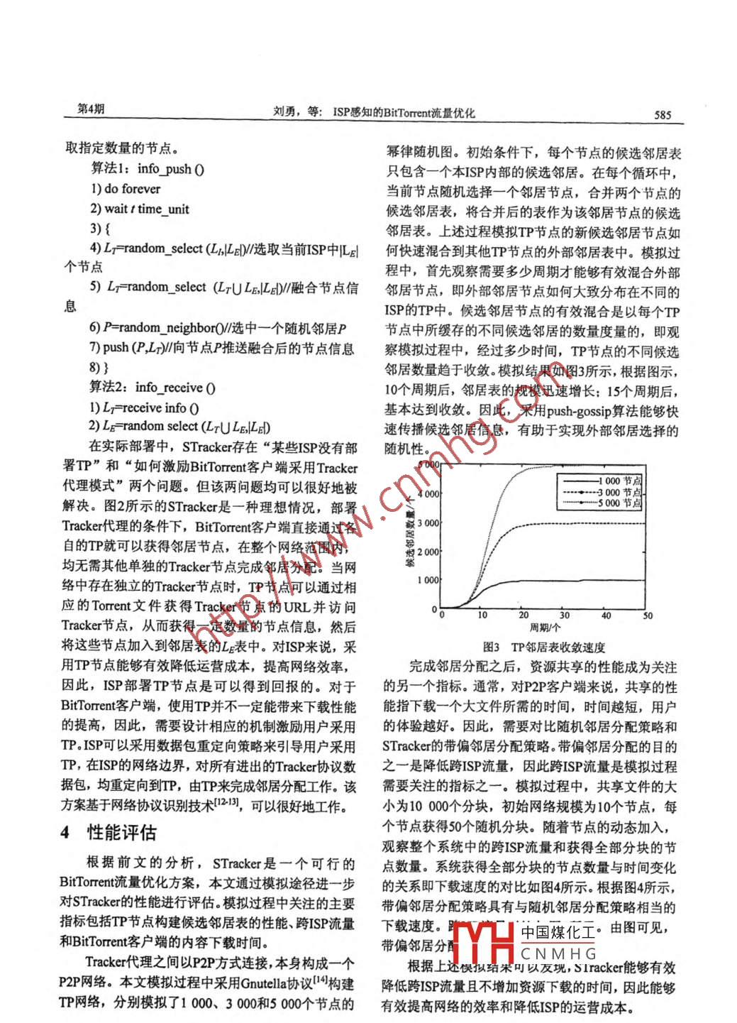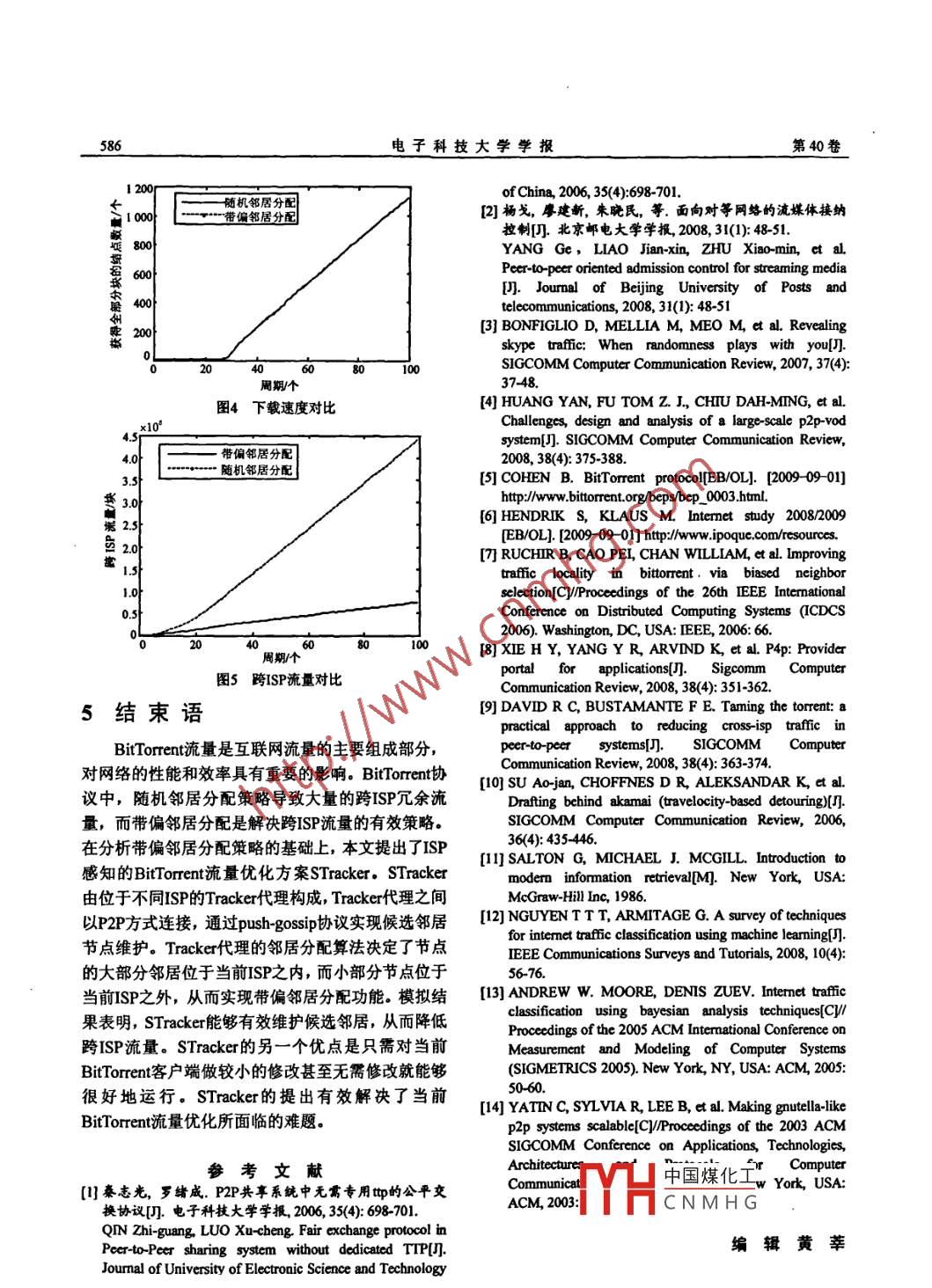 第40卷第4期電子科技大學學報VoL.40 No.42011年7月Joumal of University of Electronic Science and Technology ofChinaJul. 2011ISP感知的BitTorrent流量優(yōu)化劉勇,秦志光(電子科技大學計算機科學與工程學院成都610054)[摘要]跨互聯(lián)網服務提供商(ISP)的Biforrent流量嚴重降低互聯(lián)網的運行效率。結合BitTorrent協(xié)議和不同ISP之間的連接結構,提出了ISP感知的BitTorrent流r優(yōu)化方案STracker. STracker由 不同ISP中的Tracker代理構成,Trackr代理之間以對等聯(lián)網方式連接,通過Tracker代理完成節(jié)點雛護和ISP感知的鄰居分配,從而降低冗余的跨ISP流量.分析和模擬結果表明,STracker能夠在不增加內容下載時間的條件下,大量降低跨ISP流量. STracker能夠有效降低ISP的運營成本,提高互聯(lián)網的效率.關鍵詞Bitorrent; 互聯(lián)網服務提供商; 對等網絡; 流量控制;流量優(yōu)化中圖分類號1P393文獻標識碼Ado:i10.3969/j.is,10010548.2011.03.022ISP-Aware BitTorrent Traffic OptimizationLIU Yong and QIN Zhi-guang(School ofComputer Scicnce md Enginccring, University of Elcronic Science and Tchnology ofChina Chengdu 610054)Abstract BitTorrent-based applications incur massive cross-ISP traffic which heavily decreases Internetefficiency. Taking into account BitTorrent protocol specifications and connection structure among different ISPs,this paper proposes an ISP- aware BitTorrent traffic optimization scheme which is called STracker. STracker iscomposed of tracker proxies in different ISPs. Tracker proxies are connected with a P2P protocol. Tracker proxiesperform node management and biased neighbor allocation. Therefore, the cross-ISP traffic is reduced. Analysis andsimulations show that STracker can efficiently reduce the CrOss-ISP traffic while the download time is not increased. .STracker can reduce the operation cost of ISPs and improve the efficiency of Intermet efficiently.Key words BitTorrent; internet service providers; P2P networks; traffic control; traffic optimization對等(P2P)架構能夠有效聚集網絡邊界資源,如點,節(jié)點之間建立直接的邏輯連接,而不考慮下層網絡帶寬、CPU計算能力和存儲空間等,具有大規(guī)對應的物理連接是否跨越了多個互聯(lián)網服務提供商模、可擴展、健壯、低成本等優(yōu)勢,適宜構建大規(guī)(SP)。BitTorrent的聯(lián)網方 式帶來大量的跨ISP流量,模資源共享系統(tǒng),如基于對等網絡的公平交換"、這些流 量既降低了網絡的性能,又增加了ISP的運營流媒體2等。當前,多種流行的大規(guī)?;ヂ?lián)網應用成本。ISP通常采用流量控制設備來應對該問題,對均基于對等架構,如Skype'), PPLivel4, BiTorrnt']P2P流量進行限流、封堵等,但這些措施既不利于ISP等,大部分互聯(lián)網流量是由該類P2P應用所產生。盈利(客戶流失),也不便于用戶使用,無法從根本上2008~ 2009年的互 聯(lián)網統(tǒng)計結果表明, P2P流量所占解決上述流量問題。比例為42.51%~69.95%,其中BitTorrent所占 的比例解決上述問題的有效方法是帶偏鄰居分配,即為30.02%~80.83%6。由此可見,BitTorrent協(xié)議的將一個節(jié)點的大部分鄰居約束在當前ISP內,而允許運行行為對整個互聯(lián)網的性能具有相當大的影響,小部分鄰居跨ISP.帶偏鄰居分配機制能夠在不增加研究BifTorrent流量優(yōu)化問題能夠提高網絡運行的效下載時間的條件下降低跨ISP流量,同時滿足了ISP率,具有重要的現實意義.和客戶的需求。帶偏鄰居分配在鄰居分配中考慮ISPBitTorrent協(xié)議不考慮下層網絡的連接結構,而的因素,因而可稱為ISP感知的鄰居分配。然而,由且傳輸的內容來自于動態(tài)的用戶節(jié)點,因此對互聯(lián)于互聯(lián)網本身是-一個松散的分布 式系統(tǒng),無集中的網流量工程帶來嚴峻的挑戰(zhàn)。Bitorrent是 -一個應用中央節(jié)點協(xié)調系統(tǒng)的運行,節(jié)點無法有效獲取所需層協(xié)議,采用隨機分配的方式從Tracker獲取鄰居節(jié)的全局信息中國煤化工內鄰居分配仍然YHCNMHG收稿日期: 2009-08-11; 修回日期。 2010-08-24基金項目:國家自然科學基金(60873075)作者簡介:劉勇(1958-)勇, 博士生,主要從事網絡安全對等計算方面的研究第4期.劉勇,等: ISP感知的BitTorrent流 量優(yōu)化583是一個挑戰(zhàn)性難題。Tracker節(jié)點,通過與iTracker通信獲得相關ISP的網為了解決BitTorrent流量優(yōu)化問題,本文提出絡 拓撲信息. peer節(jié)點通過AppTracker的協(xié)調,能夠并實現了ISP感知的鄰居分配方案STracker.首先獲得優(yōu)化的鄰居, 構建流量優(yōu)化的BitTorrent網絡.設計了基于Tracker代理的STracker架構,利用該架在理想條件下,即iTracker、 AppTracker和peer節(jié)點構實現ISP感知的鄰居分配;然后設計了Tracker代完全合作的條件下, P4P能夠獲得優(yōu)化的性能。然而,理的節(jié)點管理算法。本文通過模擬的方法驗證iTracker和AppTracker之間如何建 立信任關系是一個STracker的有效性,模擬結果表明STracker能在不難題. -方面, iTracker由ISP提供,代表ISP的利益;增加下載時間的條件下,大幅降低跨ISP流量.本而AppTracker只是提 供鄰居分配任務,無任何激勵文的主要貢獻包括:使得AppTracker相信并完全利用iTracker提供的信1)基于Tracker代理的Bitorrent流量優(yōu)化架構息.另一方面,由于P4P中采用非隨機的鄰居分配策STracker;略,所構建的P2P網絡的健壯性受到破壞。因此, P4P2) Tracker代理的節(jié)點維護算法。并非-一個完善的P2P流量優(yōu)化方案。需要進一步指出1相關工作的是P4P并非代替P2P網絡,只是提供了- -種
