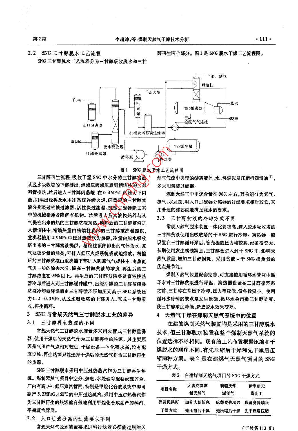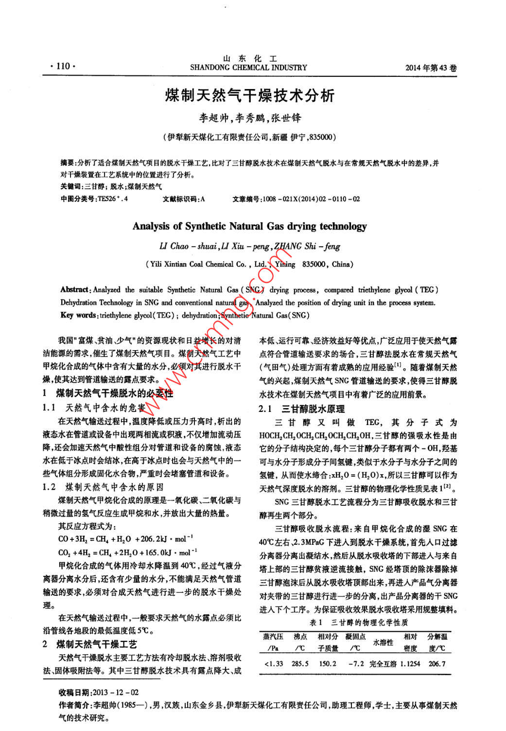山東化工110·SHANDONG CHEMICAL INDUSTRY2014年第43卷煤制天然氣干燥技術(shù)分析李超帥,李秀鵬,張世鋒(伊犁新天煤化工有限責(zé)任公司新疆伊寧,835000)摘要:分析了適合煤制天然氣項目的脫水干燥工藝比對了三甘醇脫水技術(shù)在煤制天然氣脫水與在常規(guī)天然氣脫水中的差異,并對干燥裝置在工藝系統(tǒng)中的位置進行了分析。關(guān)鍵詞:三甘醇;脫水;煤制天然氣中圖分類號:TE526·.4文獻標(biāo)識碼:A文章編號:1008-021X(2014)02-0110-02Analysis of Synthetic Natural Gas drying technologyLI Chao-shuai, LI Xi-peng, ZHANG Shi-feng(Yili Xintian Coal Chemical Co, Ltd, Yining 835000, China)Abstract: Analyzed the suitable Synthetic Natural Gas( SNG drying process, compared triethylene glycol( TEGDehydration Technology in SNG and conventional natural gas, analyzed the position of drying unit in the process system.Key words: triethylene glycol(TEG); dehydration; Synthetic Natural Gas( SNG)我國"富煤、貧油、少氣"的資源現(xiàn)狀和日益增長的對清本低、運行可靠經(jīng)濟效益好等優(yōu)點廣泛應(yīng)用于使天然氣露潔能源的需求催生了煤制天然氣項目。煤制天然氣工藝中點符合管道輸送要求的場合,三甘醇法脫水在常規(guī)天然氣甲烷化合成的氣體中含有大量的水分,必須對其進行脫水干氣田氣)處理方面有著成熟的應(yīng)用經(jīng)驗口。隨著煤制天然燥,使其達到管道輸送的露點要求。氣的興起,煤制天然氣SNG管道輸送的要求,使得三甘醇脫1煤制天然氣干燥脫水的必要性水技術(shù)在煤制天然氣項目中有著廣泛的應(yīng)用前景。1.1天然氣中含水的危害2.1三甘醇脫水原理在天然氣輸送過程中,溫度降低或壓力升高時,析出的三甘醇又叫做TEC,其分子式為液態(tài)水在管道或設(shè)備中出現(xiàn)兩相流或積液不僅增加流動壓HOCH2CH2QOCH2CH2OCH2CH2OH,三甘醇的強吸水性是由降,還會加速天然氣中酸性組分對管道和設(shè)備的腐蝕液態(tài)它的分子結(jié)構(gòu)決定的每個三甘醇分子都有兩個-OH,羥基水在低于冰點時會結(jié)冰在高于冰點時也會與天然氣中的一可與水分子形成分子間氫鍵類似于水分子與水分子之間的些氣體組分形成固化水合物,嚴(yán)重時會堵塞管道和設(shè)備氫鍵,從而使水締合:xH2O=(H2O)x所以三甘醇可以作為1.2煤制天然氣中含水的原因天然氣深度脫水的溶劑。三甘醇的物理化學(xué)性質(zhì)見表12煤制天然氣甲烷化合成的原理是一氧化碳、二氧化碳與SNG三甘醇脫水工藝流程分為三甘醇吸收脫水和三甘稍微過量的氫氣反應(yīng)生成甲烷和水,并放出大量的熱量。醇再生兩個部分。其反應(yīng)方程式為:三甘醇吸收脫水流程:來自甲烷化合成的濕SNG在CO+3H, =CH,+H,O +206. 2k.mol-I40℃左右、23MPaC下進入到脫水干燥系統(tǒng),首先人口過濾CO,+4H,=CH +2H,0 +165 0k. mol"-分離器分離出凝結(jié)水,然后從脫水吸收塔的下部進入與來自甲烷化合成的氣體用冷卻水降溫到40℃,經(jīng)過氣液分塔上部的三甘醇貧液逆流接觸,SNG經(jīng)塔頂?shù)某鞒綦x器分離水分后,還含有少量的水分不能滿足天然氣管道三甘醇泡沫后從脫水吸收塔頂部出來,再進人產(chǎn)品氣分離器輸送的要求,必須對合成天然氣進行進一步的脫水干燥處對夾帶的三甘醇進行進一步的分離出產(chǎn)品分離器的干SNG理。進入下個工序。為保證吸收效果脫水吸收塔采用規(guī)整填料。在天然氣輸送過程中,一般要求天然氣的水露點必須比表1三甘醇的物理化學(xué)性質(zhì)沿管線各地段的最低溫度低5℃。蒸汽壓沸點相對分凝固點相對分解溫2煤制天然氣干燥工藝/℃子質(zhì)量水溶性度度℃天然氣干燥脫水主要工藝方法有冷卻脫水法溶劑吸收法、固體吸附法等。其中三甘醇脫水技術(shù)具有露點降大成<1.33285.5150.2-7.2完全互溶1.1254206.7收稿日期:2013-12-02作者簡介李超帥(1985-),男漢族,山東金鄉(xiāng)縣伊犁新天煤化工有限責(zé)任公司,助理工程師學(xué)士,主要從事煤制天然氣的技術(shù)研究。第2期李超帥,等:煤制天然氣干燥技術(shù)分析1112.2SNG三甘醇脫水工藝流程醇再生兩個部分。圖1是SNG脫水干燥工藝流程圖。SNG三甘醇脫水工藝流程分為三甘醇吸收脫水和三甘精餾柱去火炬閃蒸汽TEG重沸器氣氣提柱出口分高器機械及活性炭過濾器顯SNG脫水吸收塔TEF級沖罐過濾分離器循環(huán)泵冷卻器圖1SNG脫水干燥工藝流程圖三甘醇再生流程吸收了濕SNG中水分的三甘醇富液然氣氣流中夾帶的游離液體、水、烴液以及壓縮機潤滑油,從脫水吸收塔的下部排出經(jīng)減壓閥減壓后到精餾柱的上部多采用聚結(jié)過濾器。列管換熱,然后進入三甘醇閃蒸罐,在0.4MPaG的壓力下閃煤制天然氣中甲烷含量在96%左右,其余組分為氫氣、蒸閃蒸出烴類及水排往系統(tǒng)連續(xù)火炬閃蒸后的三甘醇富氮氣水及氬,對入口過濾器分離器的過濾要求相對較低采液分別經(jīng)過機械過濾器活性炭過濾器機械過濾器除去其用普通的濾芯就能滿足除水的要求。中的機械雜質(zhì)及降解有機物。然后進入貧富液換熱器與從3.3三甘醇貧液的冷卻方式不同氣提柱出來的熱的三甘醇貧液換熱換熱后的三甘醇富液進常規(guī)天然氣脫水裝置一體化要求高,進入脫水吸收塔的入精餾柱中精餾熱量由精餾柱底部的三甘醇重沸器提供,三甘醇貧液使用出吸收塔的干SNG進行冷卻。換熱器一般重沸器使用49MPa中壓過熱蒸汽為熱源冷量由脫水吸收塔出