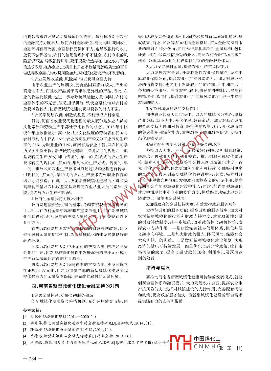 2015年第14期經(jīng)濟(jì)研究導(dǎo)刊No.14,2015總第268期ECONOMIC RESEARCH GUIDESerial No.268新型城鎮(zhèn)化與金融支持研究以河南省為例趙月霞(濟(jì)源職業(yè)技術(shù)學(xué)院,河北濟(jì)源459000)摘要:隨著我國(guó)經(jīng)濟(jì)結(jié)構(gòu)調(diào)整步伐的加快, 以新型城鎮(zhèn)化為主題的改革之音逐漸高亢。新型城鎮(zhèn)化作為一項(xiàng)復(fù)雜的系統(tǒng)。工程已經(jīng)從一個(gè)簡(jiǎn)單的經(jīng)濟(jì)問(wèn)題上升為社會(huì)問(wèn)題。這個(gè)經(jīng)濟(jì)社會(huì)發(fā)展的綜合過(guò)程注重的是城鄉(xiāng)一體化,其要求是不斷提升城鎮(zhèn)化建設(shè)的質(zhì)量?jī)?nèi)涵,同時(shí)要有產(chǎn)業(yè)作為支撐,這就離不開(kāi)金融業(yè)強(qiáng)有力的支持。因此,通過(guò)闡述金融支持對(duì)新型城鎮(zhèn)化建設(shè)的必要性及難以獲得資金支持的困境,分析其原因并給出相應(yīng)的對(duì)策和建議。關(guān)鍵詞:新型城鎮(zhèn)化;金融支持;金融體系中圖分類(lèi)號(hào):F830文獻(xiàn)標(biāo)志碼:A文章編號(hào):1673- -291X(2015)14-0233-02持,但在現(xiàn)實(shí)發(fā)展過(guò)程中,地方財(cái)力明顯不足,難以滿(mǎn)足如此一、概述數(shù)額巨大的資金量的支持。由于新型城鎮(zhèn)化的建設(shè)中基礎(chǔ)設(shè)1.新型城鎮(zhèn)化的概念施建設(shè)具有超前性、社會(huì)性、公益性及周期長(zhǎng)、見(jiàn)效慢、投資新型城鎮(zhèn)化主要體現(xiàn)在“新型”二字上,是不以犧牲農(nóng)業(yè)量大、成本高等特征使得商業(yè)性金融通常不愿涉足。導(dǎo)致新和糧食、生態(tài)和環(huán)境為代價(jià)的以人為本、統(tǒng)籌兼顧的原則全型城鎮(zhèn)化建設(shè)的資金籌措受到約束,制約了新型城鎮(zhèn)化建設(shè)面提升城鎮(zhèn)化質(zhì)量和水平,大、中、小城市和小城鎮(zhèn)協(xié)調(diào)發(fā)展的步伐。的城鎮(zhèn)化建設(shè)新路子。新型城鎮(zhèn)化包括兩重含義:第一- 城市基2.農(nóng)村改革金融需求量大礎(chǔ)設(shè)施的建設(shè);第二,社會(huì)結(jié)構(gòu)模式以工商業(yè)為主代替以農(nóng)農(nóng)村改革發(fā)展進(jìn)程中,主要對(duì)以下三個(gè)方面進(jìn)行投資,因業(yè)為主,其核心是非農(nóng)就業(yè)人口所占總?cè)丝诒戎氐拇蠓岣?。?需要巨額的金融資金的支持。一是對(duì)基礎(chǔ)設(shè)施建設(shè)的投2.金融支持的概念資。包括市內(nèi)交通道路設(shè)施和地下地面管道、橋梁等基礎(chǔ)設(shè)金融支持是一-個(gè)金融術(shù)語(yǔ),是指為了經(jīng)濟(jì)的發(fā)展,金融機(jī)施的建設(shè)都需要大量的資金投人,以確保新型城鎮(zhèn)化順利進(jìn)構(gòu)所提供的專(zhuān)門(mén)的或具有針對(duì)性的優(yōu)惠政策和條件。其作用行。二是對(duì)公用事業(yè)和公共服務(wù)建設(shè)的投資。新型城鎮(zhèn)化的在于:一是促進(jìn)資金的使用率,支持地方經(jīng)濟(jì)的發(fā)展;二是緩核心是人的城鎮(zhèn)化,為給城鎮(zhèn)化后的農(nóng)民提供優(yōu)美安全、方解資金供求矛盾,達(dá)到金融環(huán)境的均衡。實(shí)踐表明,一-個(gè)國(guó)家或便的居住環(huán)境和條件,就要經(jīng)營(yíng)好城市的公共事業(yè)和公共服地區(qū)的經(jīng)濟(jì)發(fā)展水平與金融支持成正比例關(guān)系,即金融體系越務(wù),就需要投人大量的資金來(lái)轉(zhuǎn)變農(nóng)民的生產(chǎn)生活方式。三健全、金融服務(wù)的效率越高,該國(guó)家或地區(qū)的經(jīng)濟(jì)發(fā)展越快。是對(duì)農(nóng)業(yè)產(chǎn)業(yè)化進(jìn)行投資。為加快農(nóng)業(yè)產(chǎn)業(yè)化的發(fā)展,需要3.新型城鎮(zhèn)化與金融支持的關(guān)系大量的資金投人產(chǎn)業(yè)結(jié)構(gòu)的調(diào)整和升級(jí),降低市場(chǎng)風(fēng)險(xiǎn)。新型城鎮(zhèn)化的建設(shè)與金融支持兩者相互影響、互相促進(jìn),3.農(nóng)業(yè)轉(zhuǎn)化為工商業(yè)金融支持力度不夠前者對(duì)后者具有帶動(dòng)作用,后者對(duì)前者具有推動(dòng)作用。具體表在新型城鎮(zhèn)化的建設(shè)過(guò)程中,工商業(yè)慢慢代替農(nóng)業(yè)的經(jīng)現(xiàn)為:加快推進(jìn)新型城鎮(zhèn)化建設(shè),一是城市基礎(chǔ)設(shè)施的建設(shè);濟(jì)結(jié)構(gòu)模式,服務(wù)業(yè)的比重在新型城鎮(zhèn)化的進(jìn)程中不斷提二是以工商業(yè)為主的社會(huì)結(jié)構(gòu)模式都需要強(qiáng)勁且持續(xù)性的資高,必定涌現(xiàn)一大批的中小企業(yè),同時(shí),我國(guó)中小企業(yè)一--直面金支持,這給新型城鎮(zhèn)化建設(shè)的資金供給帶來(lái)巨大挑戰(zhàn)。據(jù)研臨著融資難的瓶頸,為解決其融資瓶頸問(wèn)題來(lái)促使新型城鎮(zhèn)究顯示,城鎮(zhèn)人口每增加1名,就需要基礎(chǔ)設(shè)施、公共服務(wù)措化的建設(shè)步伐,為新型城鎮(zhèn)化的建設(shè)提供有力的支撐。施和住房等城鎮(zhèn)固定資產(chǎn)投資達(dá)10萬(wàn)元以上。因此,要想加三、河南省新型城鎮(zhèn)化發(fā)展所面臨的金融支持快推進(jìn)新型城鎮(zhèn)化的建設(shè),就需要巨大的資金量的支持。困境的原因二、河南省新型城鎮(zhèn)化發(fā)展面臨的金融支持困境1.農(nóng)村金融體系不健全1.農(nóng)村建設(shè)金融供給嚴(
