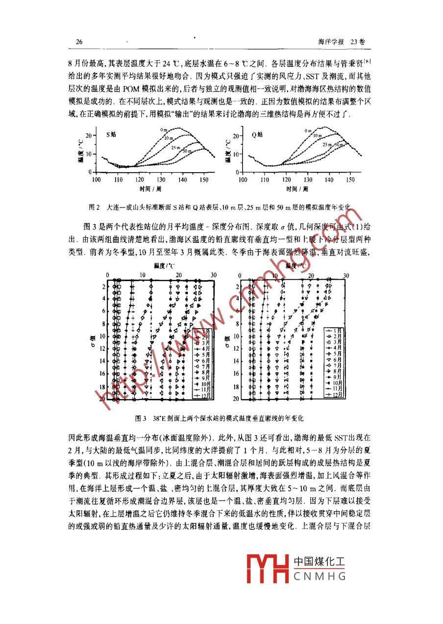 第23卷第6期海洋學報2001-l1ACTA OCEANOLOGICA SINICANovember. 2001渤海、黃海熱結構分析鮑獻文!,王賜震,高郭平1,黃磊(1.青島海洋大學海洋系,山東青島,26600擠要:在多年觀測資料基礎上,以月平均風應力和周平均海表水溫(SST)作為外強迫,對黃海、渤海熱結構迸行了數(shù)值模擬.模擬結果顯示渤海的熱結構特征自10月至翌年3月為水溫垂直均一的冬季型;5~8月為分層結構(由上混合層、躍層、潮混合層組成)的夏季型,4月和9月為兩型的過期,最低水溫出現(xiàn)在2月,最高水溫表層出現(xiàn)在8月,底層則在9~10月.黃?;钸Q淺水區(qū)與渤海有相似的熱結枃,黃海冷水團和黃海暖流對其中央槽深水區(qū)的熱結枃冇重要影響.對底層水的影響而言,前夏李顯著而后者冬季顯著,從而導致黃海(槽)的底層水與環(huán)境相比呈現(xiàn)夏季冷丙冬李瑗旳特征,底層水溫基本上與表面水溫的年變化反相;深水區(qū)的熱結枃與渤海相比,均一型牿構(1~3月)變短,分層型結構(5-11月)變長,底溫年交(5℃以內(nèi))變小,氏層度增強.模擬結果還表明,黃汋暖流的動力仍然是季鳳環(huán)流,而對黃海冷水園的形成和發(fā)展有無動力影啦提出質疑關鍵詞:謝海;黃海;熱結構;數(shù)笪模擬中圖分類號:P73111文獻標識碼:A文章編號:02534193(2001)06-0024-08l引言海洋漁業(yè)與深層海水溫度關系密切海洋水聲又對海洋躍層有著強的依賴性,因此無論從海洋開發(fā)還是從國防建設的急需考慮,中國近海三維熱結構的分析預報研究已勢在必行.王宗山等1對此課題已進行過些有益的探索,但從機理上解決問題仍路途遙遠.目前國際上廣泛應用POM模式( Princeton occan model)研究海洋三維結構已取得顯著成果l2,但用POM進行預預報仍有困難.幸好,已經(jīng)發(fā)展了較為成功的海表溫度(SST)數(shù)值預報模式3-6,我們將聯(lián)合運用POM和SST數(shù)值模式進行三維海溫預報探索研究.本文是這一總體研究計劃的第一部分,即首先從渤海、黃海入手,運用多年調(diào)查資料1與POM的模擬進行比較研究該海域三維熱結構的特征和主要影響因子,為三維預報研充打下基礎2模式POM是一個包含湍封閉的三維溫、鹽、流相耦合的原始方程數(shù)值海洋模式被廣泛應用于收稿日期:2000;修訂日期:2001-05-19基金項目:國家自然科學基金資助項目(400760):教育部科學技術重點項日(99075:000);863-818-Q-12項日作者簡介:鮑獻文(1965-),男,浙江省金華巾人教授,碩士,主要從肀海洋動力過程研究中國煤化工CNMHG6期鮑獻文等;渤海、黃海熱結構分析區(qū)域海洋動力熱力過程的模擬.本研究采用POM模擬渤海、黃海二維熱結構.模式計算海域包括整個渤海、黃海.水平網(wǎng)格問距為(1/2)×(1/2)°,垂直分21個Sgma層,鹽度采用多年平均場形式給定,初值溫度采用經(jīng)、緯度的近30年1月份平均海溫資料(青島海洋大學“七五攻關成果).流場、水位都采用零初始條件.模式僅考慮M2分潮的作用,并通過水位調(diào)和常數(shù)從開邊界引入,海表面采用月平均的海面風場以及周平均海表溫度(SST)場作為強迫場.模式經(jīng)過4a積分,第三年后輸出結果供本文分析.模擬結果得到了多種觀測資料的驗證,詳細的模式配置及驗證結果可參閱另文在討論模式結果時用到的幾個公式如下:d(a)=F(a)×h(1)La(i)=1/12×j+31.5(2)117.5,其中,F(σ=L,2,…,20)=0.00735,0.0147,0.0294,0.0588,0.1176,0.17647,0.2353,0.2941,0.353,0.4118,0.4706,0.5294,0.5882,0.6471,0.7059,0.7647,08235,0.88235,0.94118,1.0;d(a)為a層的幾何深度;h為水深(以m為單位);la(i),Lo()分別為網(wǎng)格點(i,j)的緯度和經(jīng)度以(")為單位3渤海的熱結構渤海是深嵌中國大陸的內(nèi)陸海,主要由北部的遼東灣,西部的勃海灣和南部的萊州灣組成,東部有不足100km的渤海海峽與黃海相連,渤海的平均水深不足20m,受大洋環(huán)流的影響很弱.由這…地理環(huán)境決定了渤海有其獨待的熱結構38"N,n193E在討論渤海海區(qū)的熱結構的特征之前,→摸擬值實測值我們首先對38N剖面上的3個選擇站底層水溫的模擬和觀測值進行比較,結果如圖1所示,3個站分別取之西部淺海區(qū)(h=1.0,0m),深水區(qū)(h=18.2m)和海峽口(h=18.6→模擬值m),站位的經(jīng)度值可由式(2)計算.因為觀測水溫為多年月平均,所以把原本是周平均的數(shù)值模擬資料也換算成月平均從這3個站的比較看淺水站(21,78)離oXNE差較大,在此淺水帶,受強烈的風和潮混合作用,海水的熱結構終年是垂直均勻的,所以底12層溫度的誤差直接反映了SsT的誤差,而SST是作為外強迫給定的,這一誤差主要與圖1渤海38N剖面上3站逐月底層邊界值的不準確有關.除該站之外,其余兩水溫觀測和模擬的比較個深水站模擬與觀測結果很好地一致.圖2是大連至成山頭標準斷面上SQ站位。的0m10m,25m和底層4個標準層模擬海溫的年變化圖.水溫的年變化以3月份最低,約為3t1)鮑獻文高郭平,是德星.黃微海梅溫及環(huán)流結構的模擬研究,海洋與湖沼(待刊)中國煤化工CNMHG海洋學報23卷8月份最高,其表層溫度大于24℃,底層水溫在6~8℃之間.各層溫度分布結果與管秉賢Nl給出的多年實測平均結果很好地吻合,因為模式只強迫了實測的風應力、SST及潮流,而其他層次的溫度是由POM模擬出來的,后者與獨立的觀測值相一致說明,對渤海海區(qū)熱結構的數(shù)值模擬是成功的.在不同層次上,模式結果與觀測也是一致的.正因為數(shù)值模擬的結果布滿整個區(qū)域,在正確模擬的前提下,用模擬“輸出