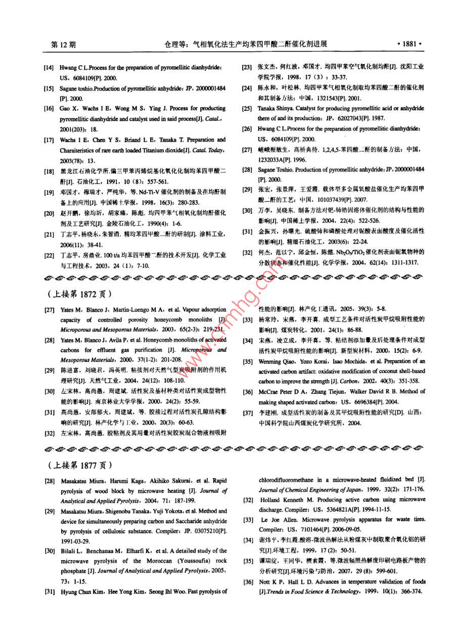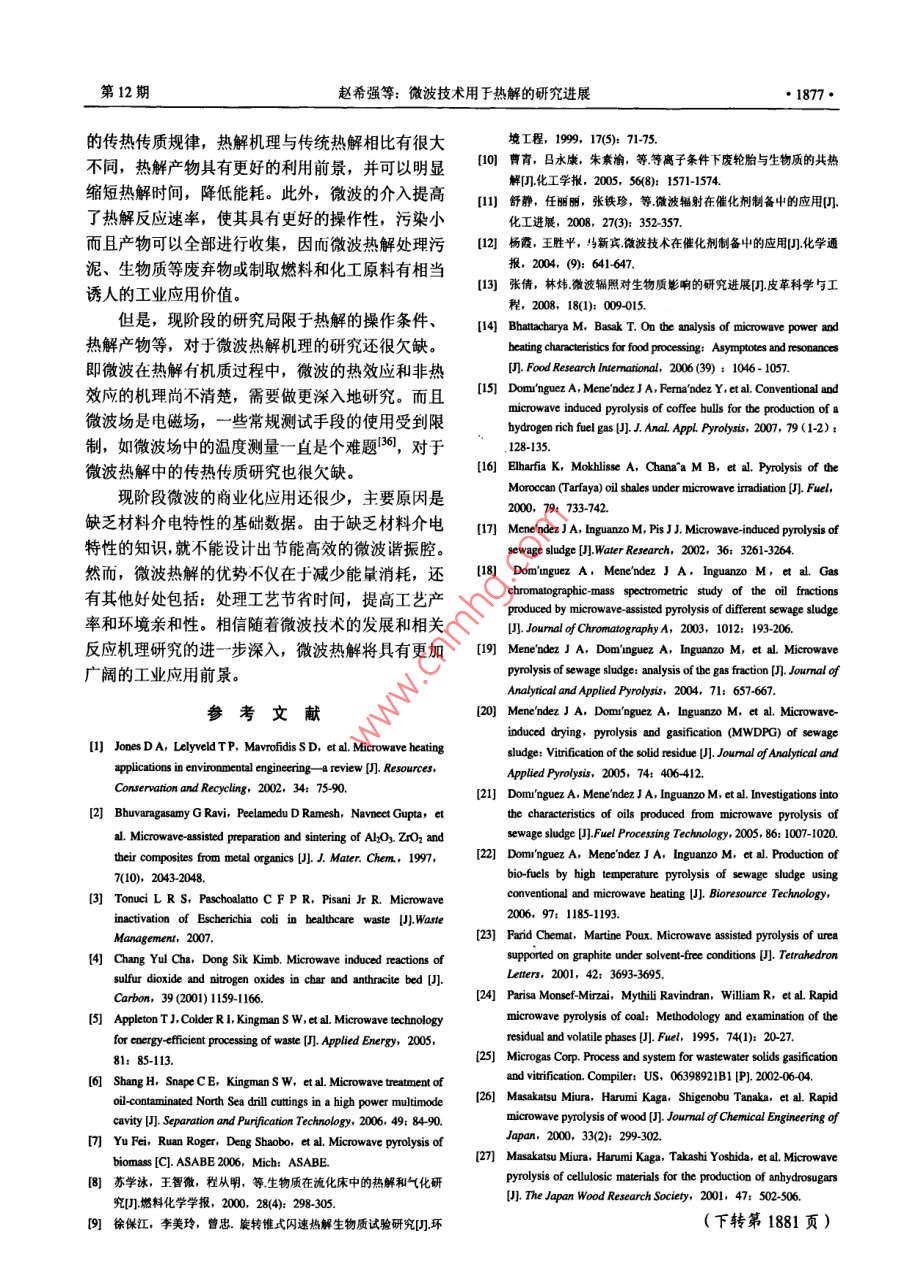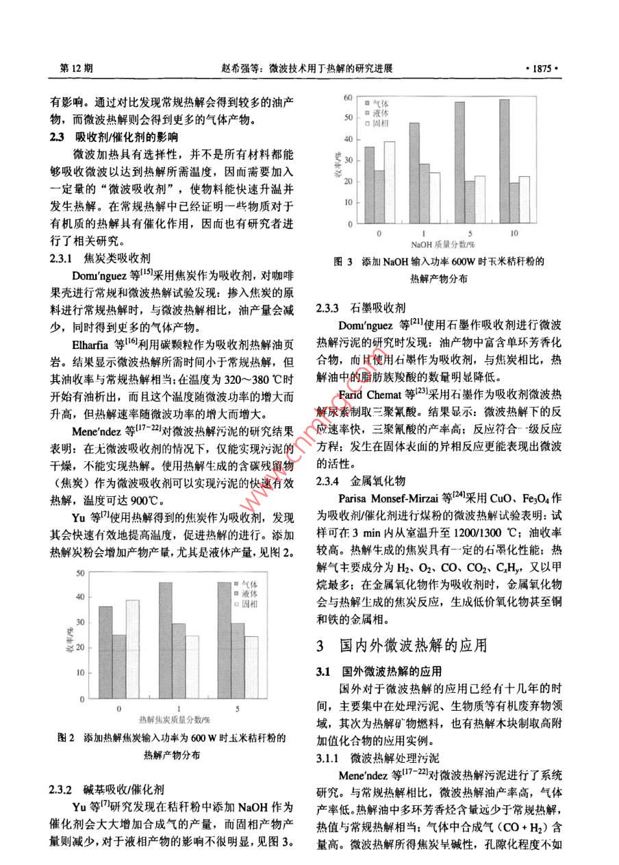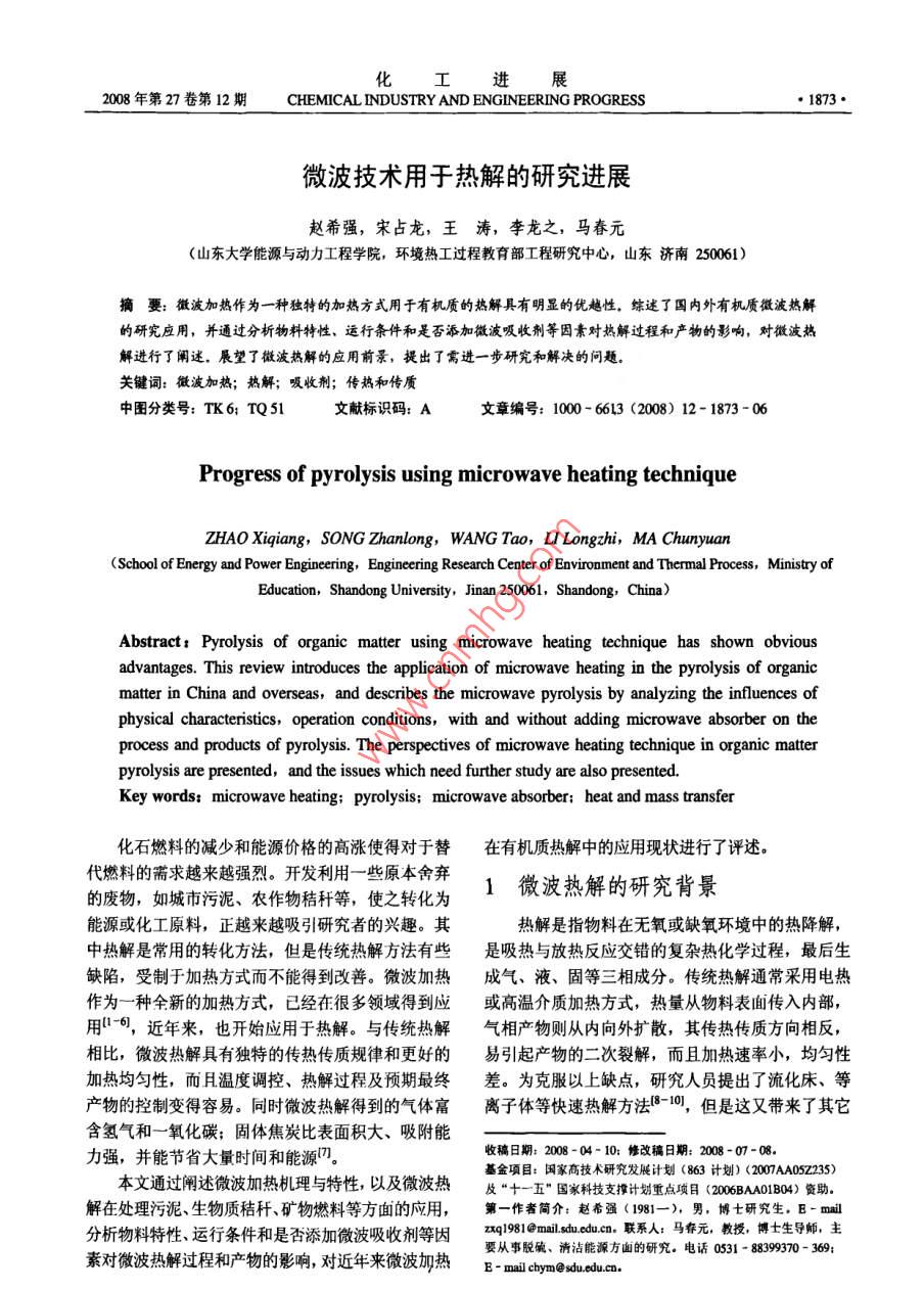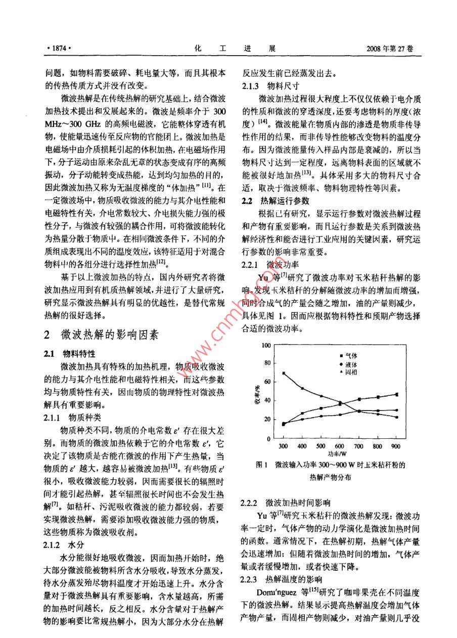 化工進展2008年第27卷第12期 CHEMICAL INDUSTRY AND ENGINEERING PROGRESS微波技術用于熱解的研究進展趙希強,宋占龍,王濤,李龍之,馬春元(山東大學能源與動力工程學院,環(huán)境熱工過程教育部工程研究中心,山東濟南250061)摘要:微波加熱作為一種獨特的加熱方式用于有機質的熱解具有明顯的優(yōu)越性,綜逑了國內外有機質微波熱解的研究應用,并通過分析物料特性、運行條件和是否添加微波吸收劑等因素對熱解過程和產物的影響,對微波熱解進行了闡述,展望了微波熱解的應用前景,提出了需進一步研究和解決的問題關鍵詞:微波加熱;熱解;吸收劑;傳熱和傳質中圖分類號:TK6;TQ51文獻標識碼:A文章編號:1000-6613(2008)12-1873-06Progress of pyrolysis using microwave heating techniqueZHAo Xiqiang, SONG Zhanlong, WANG Tao, LI Longzhi, MA Chunyuan(School of Energy and Power Engineering, Engineering Research Center of Environment and Thermal Process, Ministry ofEducation, Shandong University, Jinan 250061, Shandong, China)Abstract: Pyrolysis of organic matter using microwave heating technique has shown obviousadvantages. This review introduces the application of microwave heating in the pyrolysis of organimatter in China and overseas, and describes the microwave pyrolysis by analyzing the influences ofhysical characteristics, operation conditions, with and without adding microwave absorber on theprocess and products of pyrolysis. The perspectives of microwave heating technique in organic matterpyrolysis are presented, and the issues which need further study are also presented.Key words: microwave heating; pyrolysis; microwave absorber: heat and mass transfer化石燃料的減少和能源價格的高漲使得對于替在有機質熱解中的應用現狀進行了評述。代燃料的需求越來越強烈。開發(fā)利用一些原本舍棄的廢物,如城市污泥、農作物秸稈等,使之轉化為1微波熱解的研究背景能源或化工原料,正越來越吸引研究者的興趣。其熱解是指物料在無氧或缺氧環(huán)境中的熱降解,中熱解是常用的轉化方法,但是傳統(tǒng)熱解方法有些是吸熱與放熱反應交錯的復雜熱化學過程,最后生缺陷,受制于加熱方式而不能得到改善。微波加熱成氣、液、固等三相成分。傳統(tǒng)熱解通常采用電熱作為一種全新的加熱方式,已經在很多領域得到應或高溫介質加熱方式,熱量從物料表面?zhèn)魅雰炔坑每?近年來,也開始應用于熱解。與傳統(tǒng)熱解氣相產物則從內向外擴散,其傳熱傳質方向相反,相比,微波熱解具有獨特的傳熱傳質規(guī)律和更好的易引起產物的二次裂解,而且加熱速率小,均勻性加熱均勻性,而且溫度調控、熱解過程及預期最終差。為克服以上缺點,研究人員提出了流化床、等產物的控制變得容易。同時微波熱解得到的氣體富離子體等快速熱解方法-10,但是這又帶來了其它含氫氣和一氧化碳;固體焦炭比表面積大、吸附能力強,并能節(jié)省大量時間和能源收稿日期:200804-10:修改稿日期:2008-07-08本文通過闡述微波加熱機理與特性,以及微波熱及“十一五“國家科技支撢計劃重點項目(2060A1)黃助解在處理污泥、生物質秸稈、礦物燃料等方面的應用,第一作者簡介:趙希強(1981一),男,博士研究生,E-mi分析物料特性運行條件和是否添加微波吸收劑等因2198m妯咖,聯系人:馬春元,教授,博士生導師,主要從事脫硫、清潔能源方面的研究。電話0531-88399370-369素對微波熱解過程和產物的影響對近年來微波加熱g- mail chym@.ed1874·化工進展2008年第27卷問題,如物料需要破碎、耗電量大等,而且其根本反應發(fā)生前已經蒸發(fā)出去的傳熱傳質方式并沒有改變。213物料尺寸微波熱解是在傳統(tǒng)熱解的研究基礎上,結合微波微波加熱過程很大程度上不僅僅依賴于電介質加熱技術提出和發(fā)展起來的。微波是頻率介于300的性質和微波的穿透深度,還要考慮物料的厚度(濃MHz~300GH的高頻電磁波,它能整體穿透有機度)。微波能量在物質內部的滲透是物質非傳導物,使能量迅速傳至反應物的官能團上。微波加熱是性作用的結果,而非傳導性能夠改變物料的溫度分電磁場中由介質損耗引起的體積加熱,在電磁場作用布。因為微波能量傳入樣品內部是衰減的,所以當下,分子運動由原來雜亂無章的狀態(tài)變成有序的高頻物料尺寸達到一定程度,遠離物料表面的區(qū)城就不振動,分子動能轉變成熱能,達到均勻加熱的月的,能被很好地加熱。其體采用多大的物料尺寸合因此微波加熱又稱為無溫度梯度的“體加熱”。在適,取決于微波頻率、物料物理特性等因素。定微波場中,物質吸收微波的能力與其介電性能和2.2熱解運行參數電磁特性有關,介電常數較大、介電損失能力強的極根據已有研究,顯示運行參數對微波熱解過程性分子,與微波有較強的耦合作用,可將微波能轉化和產物有重要影響,而運行參數是關系到微波熱為熱量分散于物質屮。在相同微波條件下,不同的介解經濟性和能否進行工業(yè)應用的關鍵因素,研究運質組成表現出不同的溫度效應,該特征適用于對混合行參數的影響非常重要物料屮的各組分進行選擇性加熱12。221微波功率基于以上微波加熱的特點,國內外研究者將微Yu等研究了微波功率對玉米秸稈熱解的影波加熱應用到有機質熱解領域,并進行了大量研究,響發(fā)現卡米秸稈的分解隨微波功率的增加而增強,研究顯示微波熱解具有明顯的優(yōu)越性,是替代常規(guī)同時合成氣的產量會隨之增加,油的產量則減少熱解的