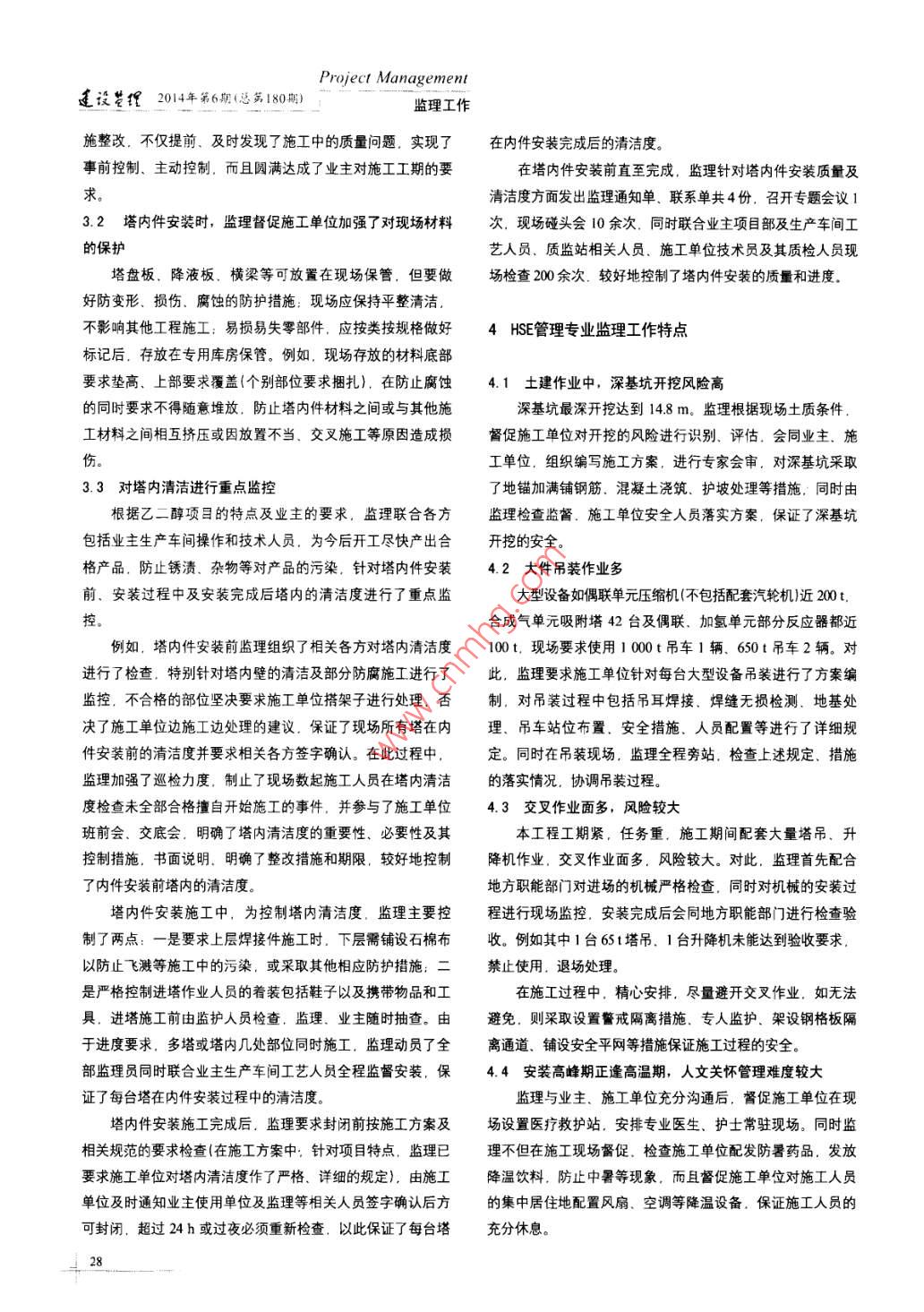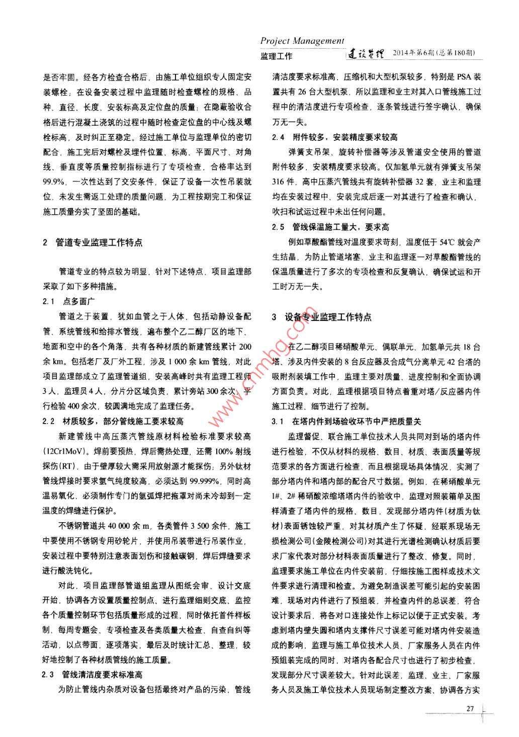 Project Management建設(shè)理2014年第6期(總第180期)監(jiān)理工作乙二醇項(xiàng)目相關(guān)專業(yè)監(jiān)理工作特點(diǎn)及實(shí)踐胡偉華,劉正元(荊門(mén)四方工程建設(shè)監(jiān)理有限責(zé)任公司,湖北荊門(mén)448000)摘要:通過(guò)荊門(mén)四方工程建設(shè)監(jiān)理有限責(zé)任公司枝江項(xiàng)目部在湖北化肥分公司20萬(wàn)t/a合成氣制乙二醇工業(yè)示范裝置建設(shè)中的監(jiān)理過(guò)程,總結(jié)了此示范裝置中監(jiān)理工作的特點(diǎn)和經(jīng)驗(yàn)關(guān)鍵詞:監(jiān)理;質(zhì)量管理;乙二醇工業(yè)示范裝置中圖分類號(hào):TU712文獻(xiàn)標(biāo)識(shí)碼:B文章編號(hào):1007-4104(20106-0026-040引言為8m,樁頂標(biāo)高為-7m~-1.5m等。由于石油化工裝置對(duì)設(shè)備基礎(chǔ)沉降差要求較嚴(yán)格,為防止基礎(chǔ)發(fā)生不均勻沉降造中國(guó)石油化工股份有限公司湖北化肥分公司20萬(wàn)ta合成管道之間.管道與設(shè)備之間拉裂而發(fā)生嚴(yán)重的安全事故,成氣制乙二醇工業(yè)示范裝置由中國(guó)石化上海工程公司等設(shè)項(xiàng)目監(jiān)理部土建專業(yè)組首先針對(duì)現(xiàn)場(chǎng)的實(shí)際情況,對(duì)施工單計(jì),中國(guó)石化第十建設(shè)有限責(zé)任公司總承包,荊門(mén)四方工程位編制的專項(xiàng)施工方案,對(duì)照設(shè)計(jì)圖紙和規(guī)范、勘察資料進(jìn)建設(shè)監(jiān)理有限責(zé)任公司監(jiān)理,投資概算約20億元,于2012行審查、提出相應(yīng)建議:督促施工單位組織施工試驗(yàn)段以驗(yàn)?zāi)?月30日開(kāi)工建設(shè),2013年11月28日完工。證方案的可行性,進(jìn)行優(yōu)化合格后才允許大面積展開(kāi)施工荊門(mén)四方工程建設(shè)監(jiān)理有限責(zé)任公司枝江項(xiàng)目部自2012同時(shí)加強(qiáng)對(duì)進(jìn)場(chǎng)材料、機(jī)具的檢查驗(yàn)收合格后才能用于施年8月正式成立以來(lái),負(fù)責(zé)湖北化肥分公司20萬(wàn)ta合成氣工。其次施工過(guò)程中監(jiān)理對(duì)每道工序嚴(yán)格把關(guān),驗(yàn)收合格后制乙二醇工業(yè)示范裝置的施工、竣工驗(yàn)收及質(zhì)保期各階段的方可進(jìn)入下道工序。通過(guò)監(jiān)理與施工單位的共同努力循環(huán)工程建設(shè)監(jiān)理工作。2013年12月乙二醇工業(yè)示范裝置共13水場(chǎng)涼水塔、合成氣壓縮機(jī)廠房、加氫反應(yīng)器、偶聯(lián)反應(yīng)器個(gè)單元全部中交,在此期間項(xiàng)目監(jiān)理部在質(zhì)量監(jiān)督站業(yè)主的最終沉降值為2cm,滿足設(shè)計(jì)和規(guī)范要求,現(xiàn)場(chǎng)設(shè)備安裝及監(jiān)理公司等有關(guān)領(lǐng)導(dǎo)的幫助下,獲得了一些經(jīng)驗(yàn)并由此在和配管達(dá)到合格標(biāo)準(zhǔn)監(jiān)理工作尤其是質(zhì)量管理方面取得了較明顯的成績(jī)和進(jìn)步。由于石油化工裝置設(shè)備種類多、體型大,平面形狀多種多樣,需預(yù)留、預(yù)埋的螺栓及埋件數(shù)量較大,在本項(xiàng)目中使1土建專業(yè)監(jiān)理工作特點(diǎn)用的此類螺栓有7000多套,最小直徑為A16.最大為A64精度要求偏差不大于2mm,對(duì)施工,監(jiān)理單位的質(zhì)量控制湖北化肥乙二醇項(xiàng)目由合成氣分離裝置、偶聯(lián)裝置、加工作提出了很高的要求。為保證螺栓及預(yù)埋件的預(yù)埋精度符氫裝置、稀硝酸裝置、管廊工程、循環(huán)水場(chǎng)、消防事故池、合要求,項(xiàng)目監(jiān)理部土建組結(jié)合圖紙、規(guī)范和實(shí)踐經(jīng)驗(yàn)建配電室及儀表間罐區(qū)等組成,占地約30余畝議業(yè)主要求設(shè)備生產(chǎn)廠家提供了配套的定位盤(pán)。定位盤(pán)進(jìn)場(chǎng)各類構(gòu)筑物(建筑物)的基礎(chǔ)依據(jù)地質(zhì)勘探資料和設(shè)計(jì)荷后,監(jiān)理與施工單位首先對(duì)定位盤(pán)對(duì)照?qǐng)D紙進(jìn)行了檢查.合載采用天然地基換填級(jí)配砂石)沖擊成孔、灌注樁基礎(chǔ)格后才同意施工單位使用。在定位盤(pán)安裝過(guò)程中監(jiān)理隨時(shí)跟組成。級(jí)配砂石換填地基厚度達(dá)到3.5m灌注孔的有效樁長(zhǎng)蹤檢查定位盤(pán)安裝的方位表面平整度以及定位盤(pán)支撐體系26 Project Management監(jiān)理工作設(shè)理2014年第6期(總第180期)是否牢固。經(jīng)各方檢查合格后,由施工單位組織專人固定安清潔度要求標(biāo)準(zhǔn)高,壓縮機(jī)和大型機(jī)泵較多,特別是PSA裝裝螺栓:在設(shè)備安裝過(guò)程中監(jiān)理隨時(shí)檢查螺栓的規(guī)格、品置共有26臺(tái)大型機(jī)泵,所以監(jiān)理和業(yè)主對(duì)其入口管線施工過(guò)種直徑、長(zhǎng)度、安裝標(biāo)高及定位盤(pán)的質(zhì)量:在隱蔽驗(yàn)收合程中的清潔度進(jìn)行專項(xiàng)檢查,逐條管線進(jìn)行簽字確認(rèn),確保格后進(jìn)行混凝土澆筑的過(guò)程中隨時(shí)檢查定位盤(pán)的中心線及螺萬(wàn)無(wú)一失栓標(biāo)高及時(shí)糾正至穩(wěn)定。經(jīng)過(guò)施工單位與監(jiān)理單位的密切2.4附件較多,安裝精度要求較高配合,施工完后對(duì)螺栓及埋件位置、標(biāo)高、平面尺寸、對(duì)角彈簧支吊架、旋轉(zhuǎn)補(bǔ)償器等涉及管道安全使用的管道線、垂直度等質(zhì)量控制指標(biāo)進(jìn)行了專項(xiàng)檢查合格