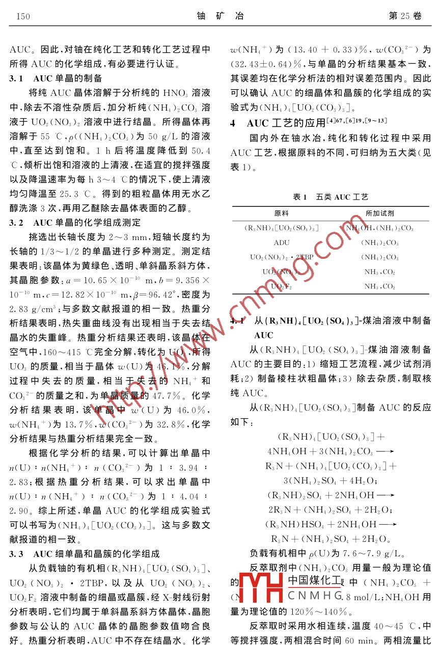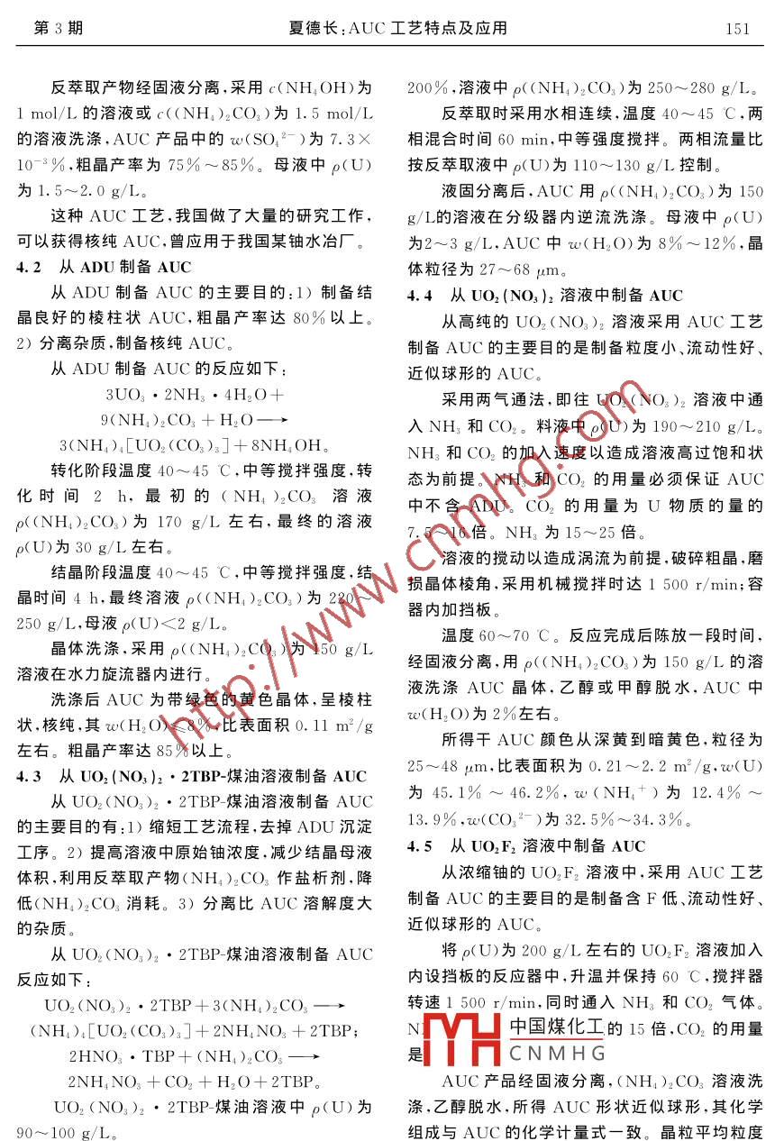 第25卷第3期鈾礦治Vol 25 No. 32006年8月URANIUM MINING AND METALLURGYAug.2006AUC工藝特點(diǎn)及應(yīng)用夏德長核工業(yè)北京化工冶金研究院,北京101149)摘要:綜合論述了AUC工藝的特點(diǎn);闡述了AUC工藝的凈化機(jī)制,列出了部分雜質(zhì)的凈化效率計(jì)算的百分值;認(rèn)證了AUC的化學(xué)組成為(NH4)4[UO2(CO3)3];介紹了AUC工藝在鈾水冶、純化和轉(zhuǎn)化過程中的應(yīng)用。關(guān)鍵詞:AUC工藝;純化;轉(zhuǎn)中圖分類號:TL213.1文獻(xiàn)標(biāo)識碼:A文章編號:1000-8063(2006)03-0148-05前言13,.45967,51,.616567有ADU法和AUC法。ADU法的顯著缺點(diǎn)是UO2含F(xiàn)高,目前它是國內(nèi)外生產(chǎn)濃縮鈾陶瓷級國內(nèi)外采用的鈾純化方法有:氟化物揮發(fā)法、UO2的主要工藝。AUC工藝的獨(dú)特優(yōu)點(diǎn)是UO2TBP萃取法和AUC(三碳酸鈾酰銨)法。氟化物含F(xiàn)低,只要強(qiáng)化洗滌AUC晶體,UO,含F(xiàn)就會揮發(fā)法的突出優(yōu)點(diǎn)是工藝全過程采用干法,不產(chǎn)極低。可以預(yù)計(jì),AUC工藝將取代ADU工藝生廢水。它的主要缺點(diǎn)是對原料黃餅質(zhì)量要求苛AUC工藝一直受到科研工作者和生產(chǎn)者的刻,來源少;純化作業(yè)分散于工藝過程的每一道工重視,科研論文,生產(chǎn)經(jīng)驗(yàn)在有關(guān)刊物上經(jīng)常出序,給回收HF帶來麻煩,并使還原、氫氟化系統(tǒng)現(xiàn),但缺乏系統(tǒng)的綜合論述的設(shè)備、管道造成腐蝕。國際上只有美國麥楚波作者在引用原作者的數(shù)據(jù)、論述的基礎(chǔ)上,試?yán)箯S獨(dú)家應(yīng)用。TBP萃取法的優(yōu)點(diǎn)是純化效圖通過分析、計(jì)算,綜合和提高,給讀者提供一份率高原料來源廣,它的缺點(diǎn)是工藝廢水量大,產(chǎn)完整的資料。品是UO2(NO3)2溶液,還須有后續(xù)轉(zhuǎn)化工序AUC法的獨(dú)特優(yōu)點(diǎn)是產(chǎn)品AUC經(jīng)分解后所得1AUC工藝的特點(diǎn)[61819UO2的活性高,既適用于生產(chǎn)UF1,又適用制造AUC工藝的特點(diǎn)有:1)AUC工藝產(chǎn)品的化陶瓷元件芯塊;主要缺點(diǎn)是工藝廢水體積大,試劑學(xué)組成穩(wěn)定,實(shí)驗(yàn)分子式(NH4)1[UO2(CO3)3]。消耗多不論從ADU用(NH4)2CO3溶液轉(zhuǎn)化生產(chǎn)從純UO2(NO)2溶液轉(zhuǎn)化為鈾氧化合物的AUC,兩氣通法從UO2(NO3)2溶液制備AUC工藝有:脫硝法、ADU法和AUC法。脫硝法的或從UO2F2溶液所得AUC,化學(xué)組成一樣,物理特點(diǎn)是只需熱能,不產(chǎn)生工藝廢水,所得UO3比性質(zhì)穩(wěn)定,濕AUC室溫下不分解。2)AUC工藝表面積小(0.96~1.90m2/g),活性低。ADU法生產(chǎn)的產(chǎn)品重現(xiàn)性好,只要控制適量的NH2的特點(diǎn)是產(chǎn)品ADU既是生產(chǎn)UF4的原料,又是CO2、U的物質(zhì)的量比,或適當(dāng)?shù)?NH1)2CO3,生產(chǎn)陶瓷級UO2的原料。ADU煅燒所得UO,(NH1)2CO3+NHNO3,或(NH4)2CO3+比表面積為3~16m2/g,活性好,但壓制芯塊前NH4)2SO的質(zhì)量濃度,不會因間斷生產(chǎn)或連續(xù)要造粒,燒結(jié)后芯塊成品率低。AUC法的獨(dú)特優(yōu)操作而使AUC的化學(xué)組成、物理性質(zhì)發(fā)生變化。點(diǎn)是:AUC煅燒后比表面積大,例如在氫氣中3H中國煤化工有大量的NH+和200C所得UO3比表面積高達(dá)77m2/g,活性特CCNMHG中,每mol鈾會產(chǎn)生高,是生產(chǎn)陶瓷級UO2的理想原料NH3和CO2氣體總計(jì)7mol。如此大量的氣體從濃縮鈾的UF。生產(chǎn)陶瓷UO的濕法工藝使AUC分解時破碎,顆粒內(nèi)部的孔隙非常發(fā)育,收稿日期:2005-10-15作者簡鰲據(jù)長(1931-),男,湖南淑浦人,研究員級高級工程師,長期從事鈾的純化和轉(zhuǎn)化工作第3期夏德長:AUC工藝特點(diǎn)及應(yīng)用149使比表面積很大,因而活性很高。4)AUC工藝合離子狀態(tài)存在于溶液中,而某些雜質(zhì)則生成難采用兩氣通法生產(chǎn)的近似球形的產(chǎn)品是制備優(yōu)質(zhì)溶的氫氧化物、碳酸鹽或堿式碳酸鹽呈固體,通過陶瓷級UO的原料,這種UO2流動性能好,壓制固液分離除去。2)在上述體系中,當(dāng)NH4+芯塊前不需要造粒,壓制后芯塊重現(xiàn)性好,燒結(jié)后CO2過量大時,UO2+以(NH4)[UO2(CO3)芯塊成品率高。5)AUC工藝對雜質(zhì)具有較好的晶體形態(tài)從溶液中結(jié)晶析岀.而溶解度大的雜質(zhì)凈化能力。在轉(zhuǎn)化過程中可以除去在配合物或雜質(zhì)化合物則留于溶液中,通過固液分(NH)2CO3溶液中不溶解的雜質(zhì)化合物;在結(jié)晶離,洗滌AUC晶體,可以除去這部分雜質(zhì)。過程中可以除去(R3NH)4[UO2(SO4)3]、ADU、2.2AUC工藝的凈化能力[65-67UO2(NO3)2·2TBP、UO2(NO3)2或UO2F2帶AUC工藝凈化除去雜質(zhì)的機(jī)制可以分為4來的比AUC溶解大的雜質(zhì)化合物,例如除去類:1)生成難溶的氬氧化物、碳酸鹽或堿式碳酸SO42-、F的能力達(dá)99.9%。6)AUC工藝的適鹽,例如Ca、Zn、A1、Cr、RE、Mn和Th等雜質(zhì),除用范圍廣。在AUC結(jié)晶過程中,UO2+-NH4-雜質(zhì)效率達(dá)99%以上。2)大部分生成難溶化合CO32-H2O體系的過飽和程度是影響AUC的物,例如Fe,因大部分生成氫氧化鐵沉淀.故凈化晶粒形狀和晶體粗細(xì)、晶體流動性的重要因素。除Fe效率在98%左右。3)雜質(zhì)化合物的溶解度體系的過飽和度低時,晶體按其晶習(xí)性生長。遠(yuǎn)大于AUC的溶解度,屬于這一類的金屬離子AUC屬單斜晶系,各晶面具有不同的生長速度,有Cu)12、Na,非金屬離子有Cl得到長軸比較大的棱柱狀晶體。體系旳過飽和度SO12、Fˉ。Cuˉ由于