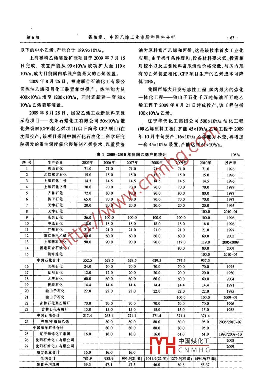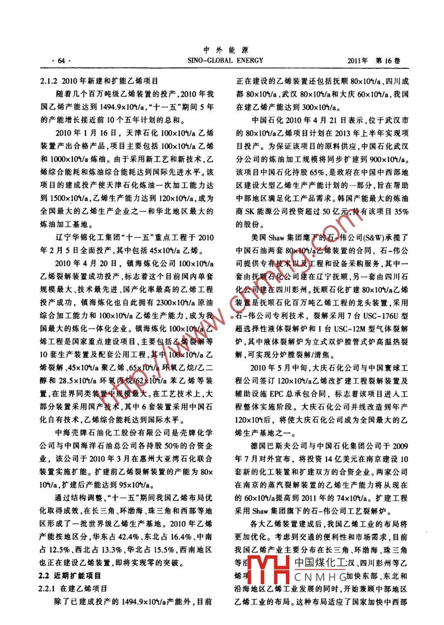 中外能源第16卷第6期●62.SINO-GL0BAL ENERGY2011年6月《煉油與化工技術(shù)>中國乙烯工業(yè)市場(chǎng)和原料分析錢伯章(上海擎督信息科技公司金秋能源石化T.作室,上海200127)摘要近年來我國乙烯T.業(yè)發(fā)展迅猛,2010年乙烯產(chǎn)能達(dá)到1494.9x10t/a,巳投產(chǎn)的27套乙嬌裝置平均規(guī)模達(dá)到55.37x10t/a;在建乙烯產(chǎn)能達(dá)到300x10%/a ;2010年乙烯產(chǎn)量為1418.78x104. 節(jié)能降耗.T.作也取得成效.2011年1月中國石化乙烯能耗首次降至592kg標(biāo)油/1,與2010年乙烯能耗水平相比,1個(gè)月可降低成本2400萬元。2010年我國乙烯表觀消費(fèi)址達(dá)到1496.88x101,乙烯當(dāng)量消費(fèi)也快速增長(zhǎng),2010年達(dá)到約3315x10*.預(yù)計(jì)2015年將達(dá)到4003x10+.乙烯當(dāng)量消費(fèi)缺口較大,表明我國乙烯T.業(yè)仍有一定發(fā)展?jié)摿?。與此同時(shí),乙烯裝暨國產(chǎn)化率正在提高,乙烯三機(jī)等關(guān)鍵設(shè)備“十一五"期間陸續(xù)實(shí)現(xiàn)國產(chǎn)化,目前乙烯裝置國產(chǎn)化率已達(dá)到75%左右。但與國際先進(jìn)水平相比.還存在較大技術(shù)差距,裝備的可靠性和穩(wěn)定性還有待進(jìn)-步提高。在快速發(fā)展的同時(shí),也要清醒地看到我國乙烯行業(yè)發(fā)展正面臨全球乙烯產(chǎn)能過剩、存在步人周期性下降趨勢(shì)的預(yù)期和潛在風(fēng)險(xiǎn)、中東石化產(chǎn)品對(duì)我國市場(chǎng)構(gòu)成巨大壓力等。我國大部分乙烯產(chǎn)能都以石腦油為原料.正面臨原料資源供應(yīng)日趨緊張的問題,預(yù)計(jì)2011年中國將成為亞洲最大的石腦油消費(fèi)國。對(duì)此,應(yīng)密切關(guān)注以煤作為替代原料采用MTO技術(shù)的T.業(yè)化進(jìn)程,同時(shí)要加快開發(fā)新的乙烯生產(chǎn)技術(shù)路線,盡可能以天然氣、干氣為原料,開發(fā)用甲烷,乙烷、丙烷和丁烷為主要原料的低成本乙烯生產(chǎn)技術(shù)路.線。甲醇制烯烴.重油催化熱裂解制乙烯.生物質(zhì)乙醇脫水制乙烯等將面臨發(fā)展機(jī)遇。.關(guān)鍵詞乙烯產(chǎn)能能耗當(dāng)量消費(fèi)國產(chǎn)化原料生物質(zhì)1前言產(chǎn)能785.9x10*/a , 2009年為1279.9x10%/a ,2010年乙烯主要用于生產(chǎn)聚乙烯(高密度聚乙烯、低達(dá)到1494.9x10%/a, 已投產(chǎn)的27套乙烯裝置平均密度聚乙烯、線性低密度聚乙烯)、環(huán)氧乙烷、二氯規(guī)模達(dá)到55.37x104/a,見表1。乙烷/氯乙烯單體和乙苯。截至2011年1月底,高2.1.1 2009 年新建和擴(kuò)能乙烯項(xiàng)目密度聚乙烯為乙烯最大消費(fèi)領(lǐng)域,約占乙烯需求的福建聯(lián)合石油化工公司80x104/a、 上海賽科石1/3,其次是線性低密度聚乙烯和低密度聚乙烯。另油化工有限公司擴(kuò)能29xl0t/a.沈陽石蠟化工有限外,環(huán)氧乙烷消費(fèi)約占全球乙烯需求的11%,二氯公司催化熱裂解制乙烯50x104/a(乙烯15x10/a).乙烷和乙苯次之,其他占7%。德國咨詢公司塞日獨(dú)山子石化公司100x10/a、遼寧華錦化工集團(tuán)公薩拿(Ceresana)的研究報(bào)告稱,到2017年需求增幅司擴(kuò)能45x10/a--新建3套、擴(kuò)能2套,使產(chǎn) 能最大的將是環(huán)氧乙烷,線性低密度聚乙烯和高密度達(dá)到1279.9x10%/ao 2009年我國共有23家乙烯生聚乙烯預(yù)計(jì)將以年均3.5%~4.5%的速度增長(zhǎng)。產(chǎn)企業(yè),25套裝置,裝置平均規(guī)模50.80x10%/a。其經(jīng)過數(shù)十年的發(fā)展,特別是在“十一五”期間,中單套規(guī)模達(dá)到80x104/a以上的有3套,產(chǎn)能合我國乙烯工業(yè)取得了舉世矚目的進(jìn)步,同期世界新計(jì)319x10Y/a;單套規(guī)模在60x10*~80x10t/a的有建的乙烯裝置大多集中在中國。隨著一系列乙烯裝11套,產(chǎn)能合計(jì)772x10%/a;其余11 套為60x10%/a置的建成投產(chǎn),到2010年底我國乙烯總產(chǎn)能達(dá)到1494.9x104/a,成為全球僅次于美國(2755.4x 10t/a)的第二大乙烯生產(chǎn)國。中國煤化工作-98年畢業(yè)于華東理工2中國乙烯產(chǎn)能和產(chǎn)量大MHCNMH G東高橋分公司,現(xiàn)主要2.1產(chǎn)能從事石油化工技術(shù)和經(jīng)濟(jì)信息調(diào)研工作。近年來,我國乙烯工業(yè)發(fā)展迅猛,2005年乙烯E-mail:be cqian@163.com第6期錢伯章,中國乙烯工業(yè)市場(chǎng)和原料分析●63以下的中小乙烯,產(chǎn)能合計(jì)189.9x10t/ao油為原料富產(chǎn)乙烯和丙烯,這是該技術(shù)首次工業(yè)化上海賽科乙烯裝置擴(kuò)能項(xiàng)目于2009年7月15應(yīng)用。由于操作條件緩和、設(shè)備材料要求低、投資相日完成,裝置產(chǎn)能從90x10%/a成功擴(kuò)大至119x對(duì)較小以及主要原料常壓渣油價(jià)格較低,與國內(nèi)現(xiàn)10t/a,成為目前國內(nèi)單線產(chǎn)能最大的乙烯裝置。有的乙烯裝置相比,CPP項(xiàng)目生產(chǎn)的乙烯成本可降2009年8月26日,福建聯(lián)合石油化工有限公低20%。司煉油乙烯項(xiàng)目化工裝置相繼投產(chǎn),煉油能力從我國西部大開發(fā)標(biāo)志性工程.國內(nèi)最大的煉化400x104/a增至1200x104/a,同時(shí)還新建一套80x一體化工程-一獨(dú)山 子石化千萬噸煉油百萬噸乙10%/a乙烯裂解裝置。烯工程于2009年9月21日建成投產(chǎn),該工程包括2009年8月28日,國家乙烯工業(yè)新原料來源100x10%/a乙烯。示范項(xiàng)目一沈陽石蠟化工有限公司50x10%/a催遼寧華錦化工集團(tuán)公司500x10%/a油化工程化熱裂解(CPP