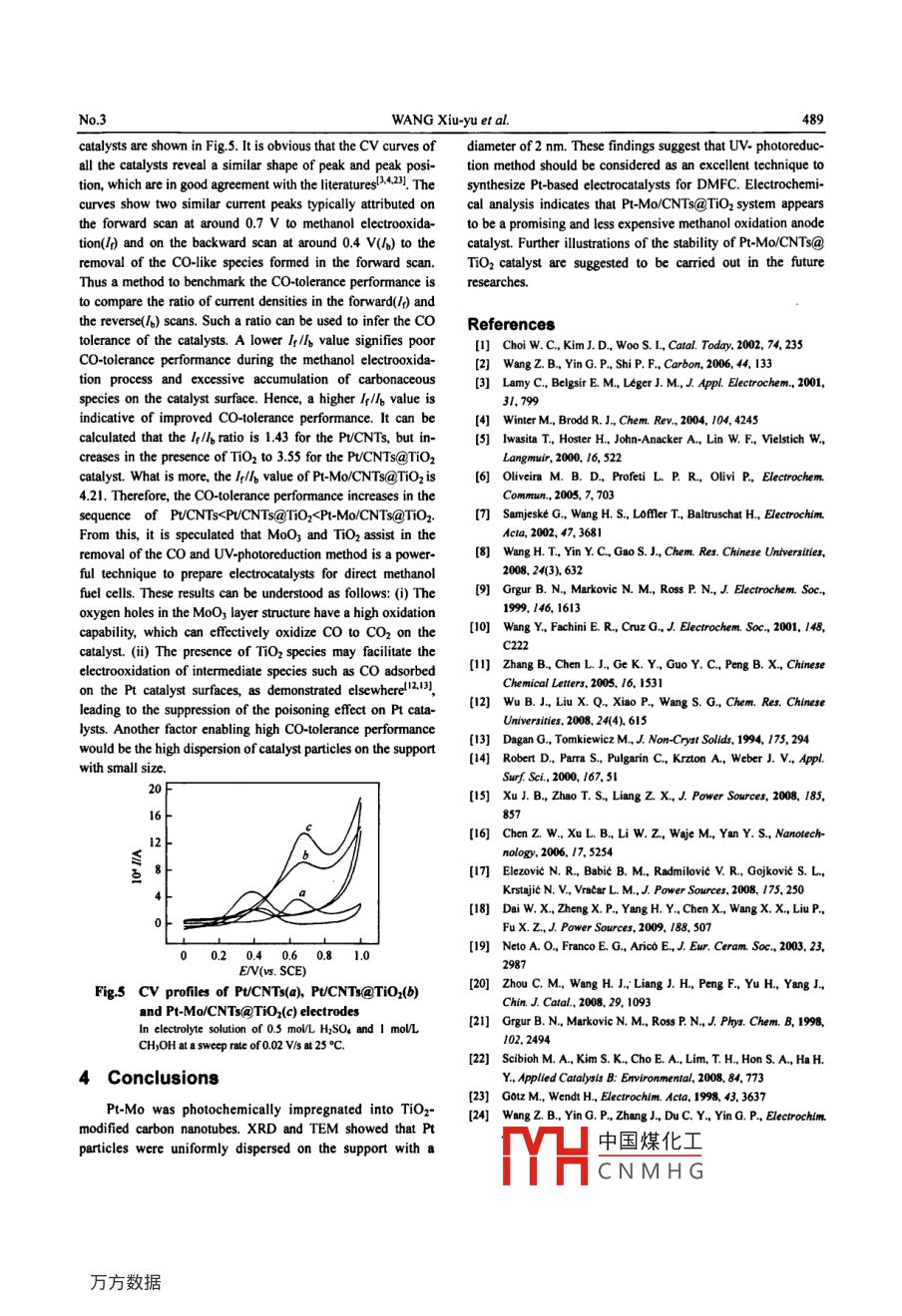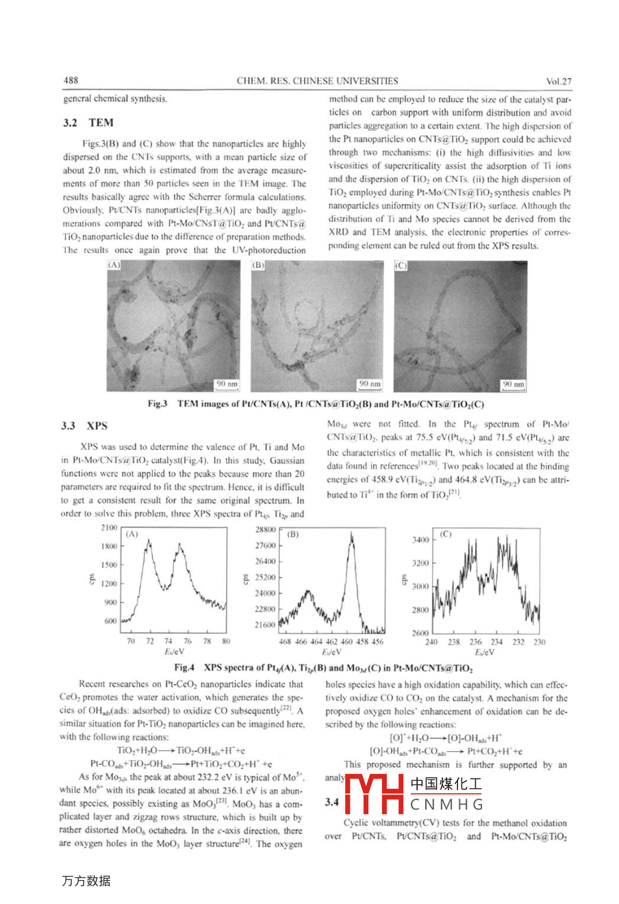 CHEM. RES. CHINESE UNIVERSITIES 2011, 27(3), 486- -489Methanol Oxidation over TiO2-modified Multi-walled CarbonNanotubes Supported Pt-Mo ElctrocatalystWANG Xiu-yu', JIANG Yuan-sheng, ZHU Hong' and ZHANG Jing- chang'1. Institute of Modern Catalyst, Bejing University of Chemical Technology,Beijing 100029, P. R. China; 2. School of Chemistry and Chemical Engineering,Nanjing University, Nanjing 210093, P. R. ChinaAbstract In order to develop a novel and high-performance catalytic material for direct methanol fuel cells(DMFC),molybdenum oxide as a co-catalyst with Pt on multi-walled carbon nanotubes which were modified by titanium dio-xide(denoted as CNTs@TiO2) was investigated. The physicochemical characterizations of the catalysts were carriedout via X-ray diffraction(XRD), transmission ectron microscopy(TEM) and X ray pholoelectron spectroscopy(XPS).Cyclic voltammetry(CV) showed that the CO-tolerance performance increased in the sequence of PU/CNTs