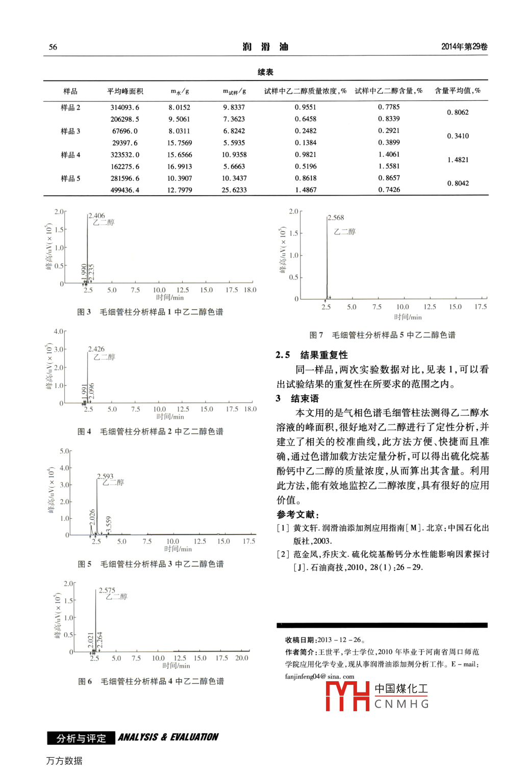 2014年12月潤滑油第29卷第6期Dec 2014LUBRICATING OILVol29. No 6文章編號:10023119(2014)06005403硫化烷基酚鈣中乙二醇含量的測定王世平,范金鳳新鄉(xiāng)市瑞豐化工有限責任公司,河南新鄉(xiāng)453700)摘要:采用氣相色譜法檢測硫化烷基酚鈣中的乙二醇含量,并利用外標法,建立了乙二醇質量濃度與平均峰面積的標準曲線結果表明,乙二醇質量濃度與相應的峰面積有很好的線性關系,由此可以定量定性分析硫化烷基酚鈣等潤滑油添加劑中乙二醇的含量,從而有效避免在使用過程中因乙二醇含量過多而積累形成的沉淀對發(fā)動機造成不同程度的磨損關鍵詞:硫化烷基酚鈣;乙二醇;氣相色譜中圖分類號:TE622,14文獻標識碼:ADetermination of Ethylene Glycol Content in Sulfurized Calcium Alkyl PhenolateWANG Shi-ping, FAN Jin-fengXinxiang City Ruifeng Chemical Co, Ltd, Xinxiang 453700, China)Abstract: The ethylene glycol content in sulfurized calcium alkyl phenolate was determined by gas chromatography, analyzed by capillary column chromatography, quantified by the external calibration method, a standard curve between massconcentration of ethylene glycol and the average peak area was established. The experimental results show that there isgood linear relationship between mass concentration of ethylene glycol and the corresponding peak area, and the ethyleneglycol content in lubricating oil additives such as sulfurized calcium alkyl phenolate can be analyzed quantitatively and qualita-tively by the standard curve, effectively avoiding the attrition harm of different degrees to the engine caused by the exces-sive accumulation of ethylene glycol during usingKey words: sulfurized calcium alkyl phenolate; ethylene glycol; gas chromatography引言蒸汽壓為109.8kPa,沸點較高,飽和蒸汽壓較低,隨著現(xiàn)代工業(yè)的發(fā)展,特別是各種內燃機的不不容易蒸餾脫除。倘若硫化烷基酚鈣中的乙二醇殘斷改進,對內燃機潤滑油的質量要求越來越高,因此留過多,會削弱潤滑油的清靜能力,還會影響其分水潤滑油添加劑在潤滑油中的應用越來越廣泛,發(fā)性2,并且會被氧化形成乙二酸,進一步氧化成醛、展速度也越來越快。目前,潤滑油添加劑以提高內酮等最終形成沉淀,對發(fā)動機造成一定的磨損。所燃機油的性能為主,按功能分主要有清凈劑、抗氧化以通過檢測硫化烷基酚鈣中乙二醇殘留量,在生產劑、抗磨劑、分散劑、泡沫抑制劑、防腐防銹劑、流點硫化烷基酚鈣過程中有效監(jiān)控乙二醇的殘留量,具改善劑、黏度指數增進劑等。而清凈劑是應用比較有重要意義廣泛的一種潤滑油添加劑,用量多,作用大,從一定1實驗部分意義上說,對潤滑油質量具有重要影響,硫化烷基酚1.1實驗原理鈣是一種性能極佳的清凈劑,具有較好的清凈性及將準確稱量的硫化烷基酚鈣用正己烷完全溶解酸中和能力,并兼具極佳的抗磨性和抗氧化性,與多后,乙二醇不溶于正己烷,溶于水,加人入一定量的純種添加劑有較好的相容性,是多種內燃機潤滑油的水萃取出乙二醇,采用氣相色譜法-FD檢測法,選凊凈劑。在國內外的文獻報道中,硫化烷基酚鈣的定一定色譜條件,以保留時間定性,峰面積定量,建合成均采用工業(yè)乙二醇作為促進劑,合成結束再將立乙二醇質均峰而和的校正曲線,借助乙二醇脫除,乙二醇的沸點197.4℃,200℃下飽和校正曲線,THE中國煤化工CNMHG分析與評定 ANALYS/S EVALUAnDl第6期王世平等硫化烷基酚鈣中乙二醇含量的測定1.2儀器和試劑中,加入一定量的正己烷,將試樣完全溶解,再加入儀器:島津GC-2014C色譜儀,氫火焰離子檢m2g水(精確至0.0001g),塞緊塞子,搖蕩5min,靜測器,GC- solutin工作站,島津自動進樣器,毛細柱:置后會出現(xiàn)分層現(xiàn)象。AC5(弱極性),離心機,具塞離心管,巴氏吸管。將離心管放入離心機中,調至離心力(RCF)為試劑:正己烷(分析純),蒸餾水,乙二醇(色譜級)。700g,離心30min。取出后,如果水層不清晰,則棄1.3實驗步驟除上層的油液,再加入一定量的正己烷,震蕩5min,1.3.1標準曲線繪制繼續(xù)離心30min,反復此操作,直至出現(xiàn)清晰的水選擇配制質量濃度的乙二醇水溶液作為標準樣層。品,在相同的色譜條件下重復進樣3次,測得相應的用一次性吸管吸取離心管中清晰的水層溶液乙二醇水溶液的峰面積,并求出峰面積的平均值,通加入到1.5m的進樣瓶中,設定相同的氣相色譜條過乙二醇水溶液的質量濃度和峰面積的擬合,繪制件,開始進樣分析,同一樣品重復進樣3次。標準曲線,保留時間為定性指標,見圖1,建立線性采樣分析結束后,可以得出試樣中乙二醇的平回歸方程,見圖2。均峰面積,根據標準曲線,再求出試樣中乙二醇的質1.3.2步驟量濃度。稱取試樣m1g(精確至0.0001g)于帶塞離心管1.3.3計算公式試樣中乙二醇含量=試樣中乙二醇的質量濃度x純水的質量×100%2結果與討論因為FD氫火焰離子檢測器檢測不出水的峰,21氣相色譜分析條件沒有響應因子,所以在保留時間為2.412mn左右色譜柱選擇:熔融石英毛細管柱(長30m,內徑的峰是乙二醇峰,由此可以定性為乙二醇峰。0.53mm,膜厚1.0μm),柱溫(初始):120℃,升溫2.3建立標準曲線(見圖2)速率:10℃/min,柱溫(終止):200℃,終點保留時間:10min,進樣口溫度:250℃,檢測器溫度:270℃,載氣氮氣流速:3mL/min,氫氣流速:40ml/min,空氣流速:400mL/min,自動進樣,進樣量:0.5μL,5.0分流進樣,分流比:60。4.0此條件得出的譜圖峰行比較對稱,重合性較好,2.0有利于峰面積的定性定量分析。2.2乙二醇的定性分析00.250500751001.251.501.752002252502%乙二醇水