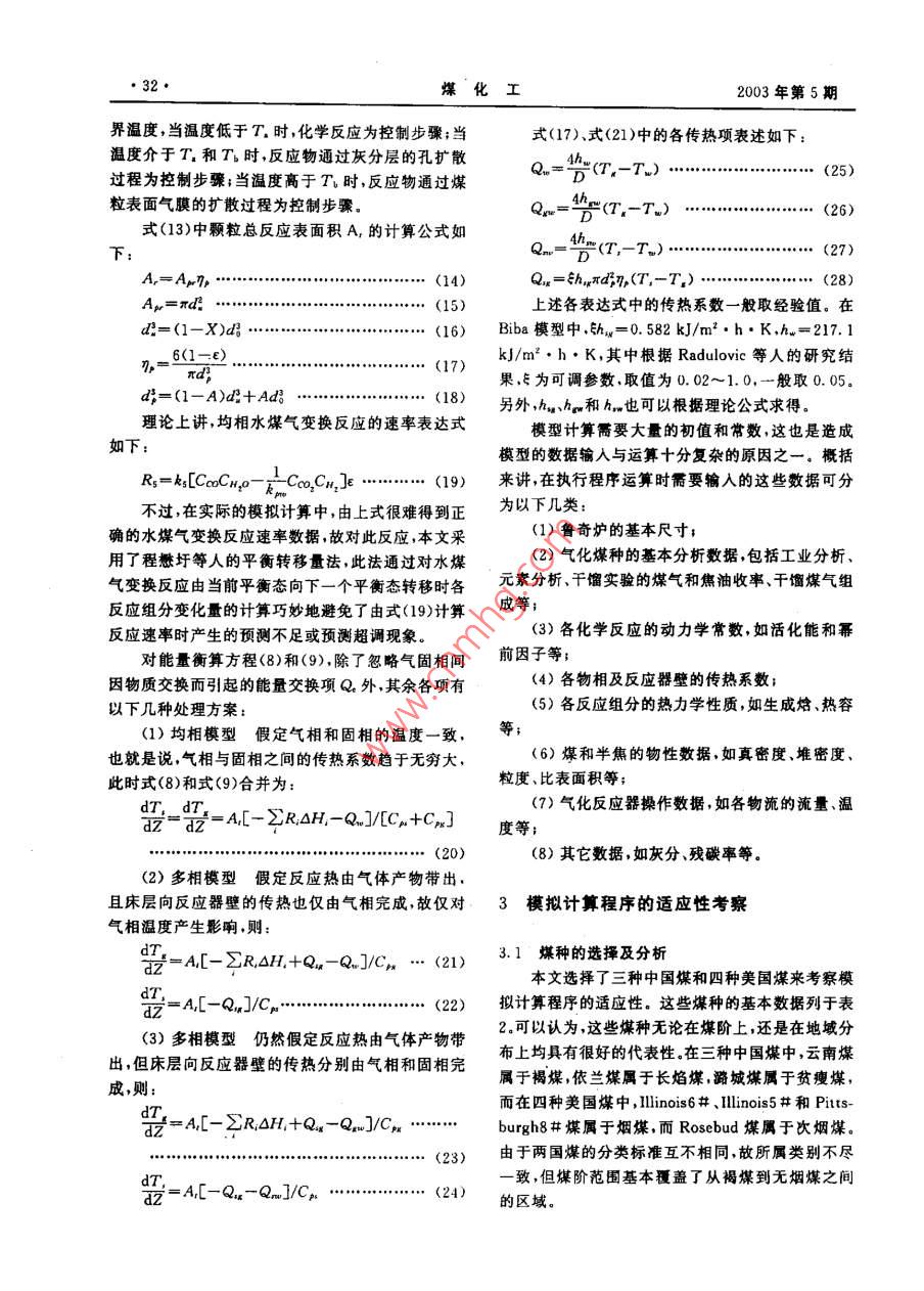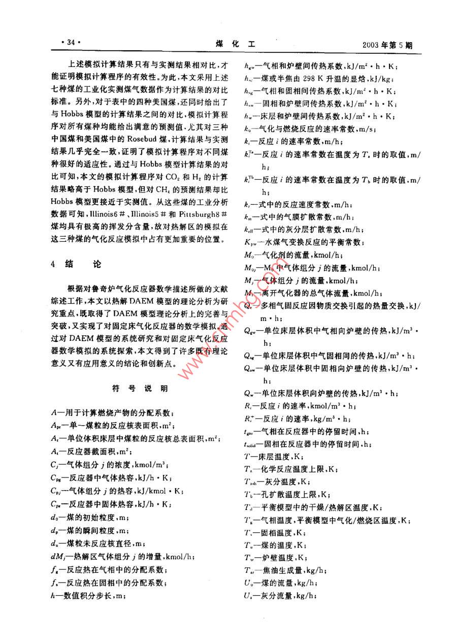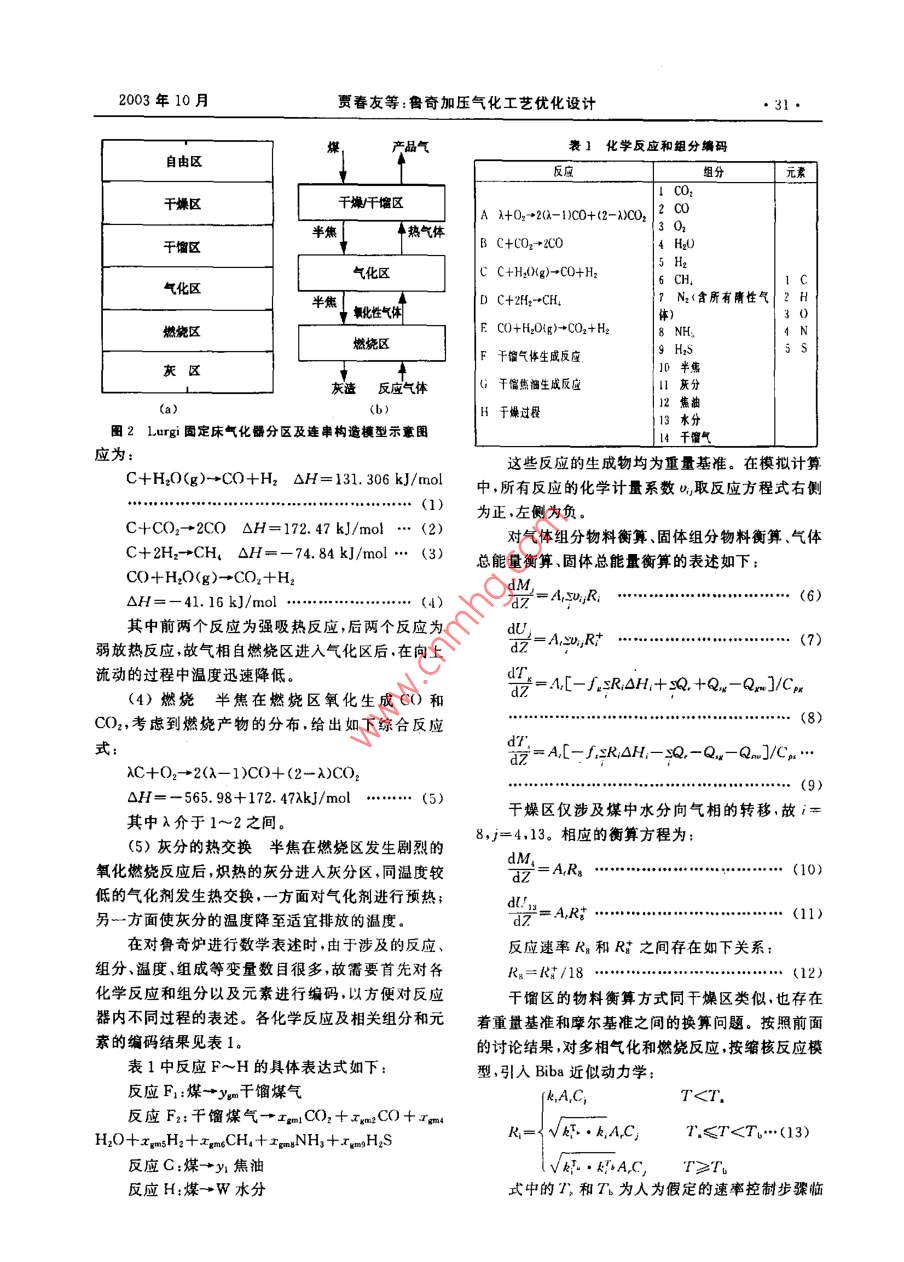 第5期(總第108期)煤化工No.5(Total No. 108)_2003年 10月Coal Chemical IndustryOet.2003魯奇加壓氣化工藝優(yōu)化設計賈春友魏利棹(化學工業(yè)第二設計院.太原030001)摘要對魯奇爐氣化進行了數(shù)學模擬,通過了工程實際數(shù)據(jù)的檢驗.可對各型號的餐奇爐進行優(yōu)化設計.關鍵詞魯奇爐氣化模擬文章編號1005-9598(2003)05-0030-06中國分類號:TQ546.2 文獻標識碼:A以人為假定- -些邊界條件,將整個床層劃分為由不1魯奇氣化工藝簡介同反應區(qū)構成的連串反應器構造,見圖2(a)和(b),比如將燃燒反應開始(650K)直到氧氣耗盡之間的用O2/H2O、Air/H2O等氣化劑將煤轉化為合區(qū)域定為燃燒區(qū),之后是氣化區(qū),當溫度低到氣化反成氣的過程稱為煤的氣化。煤氣化反應中的氣化劑應可以忽略不計時,氣化區(qū)結束。一般包括02、H2O、CO2和H2.產(chǎn)物一般為CO.H:和CH。煤炭氣化是煤炭轉化中實現(xiàn)煤的清潔高效利用的重要過程之一,對其進行精確的定量描述是過程設計與控制最優(yōu)化的先決條件。煤氣化過程不同于簡單的化學反應體系,它不僅涉及到復雜的化學反應體系,還包括了物理過程干燥千350-10100T-酒TD煤一→半焦+揮發(fā)分的脫水干燥和半物理半化學過程的熱解干餾。僅就氣化100-1500CtCocu氣化反應而言,既有多個平行反應,又有連申反應和燃燒0002000KOY _二次氣相反應。由于反應速率上的差異,較慢的一些4灰406004..1... 200反應要用動力學方程來描述,較快的氣固反應要由*0-H;O2-H擴散傳質方程來描述,較快的均相反應則可用熱力3-C0學平衡方程來描述。龐大的反應體系和繁雜的傳熱④-其他過程使得對氣化反應器的數(shù)學描述十分困難,然而灰鎖魯奇爐的廣泛應用也促進了其數(shù)學模擬的不斷發(fā)圈1 Lorgi 加壓固定床氣化反應器示意圈展.反應器的設計、生產(chǎn)過程的控制和產(chǎn)物組成的預測不斷向數(shù)學模擬提出更高的要求.魯奇爐的示意圖見圖1.從基本概念上講,固定2魯奇爐的數(shù)學表述床層由上而下可分為干燥區(qū)、千餾區(qū)、氣化區(qū)燃燒在對魯奇爐進行數(shù)學表述時,認為煤進入反應區(qū)和灰渣區(qū)五部分。在實際反應過程中.除了燃燒區(qū)器后自上而下依次經(jīng)歷以下過程:和氣化區(qū)之間是以O;依度為零來劃分外,其余各(1)干燥煤被來自熱解區(qū)的熱氣體加熱并失區(qū)并無明確的邊界定義,各區(qū)之間可以重疊覆蓋。不去水分。過,在數(shù)學模擬過程中,為了簡化問題、方便求解,可.(2)干餾干燥煤進一步 受熱發(fā)生熱解反應生成半焦,焦油和氣體產(chǎn)物。為簡化計算.假定半焦組收稿日期:2003-05-18作者簡介;賈春友.男,1974年生.工程師。1996年畢業(yè)于天成為C.其余元素H、N.O.S全部進人氣體和液體律大學化工系.后從中國人民大學研究生班畢業(yè),現(xiàn)從事化產(chǎn)物.有關千餾產(chǎn)物的計算將在下一部分詳細討論。(3)氣化多相氣化反應 和均相水煤氣變換反工工程設計與管理工作。2003年10月賈春友等:魯奇加壓氣化工藝優(yōu)化設計,31●謀,產(chǎn)晶氣表]化學反應和組分編碼自由區(qū)反座組分元素II CO2干燥區(qū)干爆/干餾區(qū)A 1+02→+2(2-1)C0+(2-CO2? C0半焦熱氣體.”3 O2干餾區(qū)B C+CO2 +200H20氣化區(qū)c C+H20(g)-+C0+H21C|半熊D C+2H→CH7 N2(含所有隋性氣|2 H{↓靴性氣體$)30|燃施區(qū)E C0+H20(g)+C02+H2, NH、4 N|燃燒區(qū)H2SF干館氣體生成反座,矢區(qū)0半焦灰渣反應氣體;干餾焦溜生成反應11灰分a)(b)|H于燥過程3水分圈2Lurgi固定床氣化器分區(qū)及連串構造橫型示意圖14干餾氣應為:這些反應的生成物均為重量基準。在模擬計算C+H20(g)→CO+Hz AH= 131.306 kJ/mol中,所有反應的化學計量系數(shù).,取反應方程式右側............................... (1)為正,左側為負。C+CO2→2CO OH=172. 47 kJ/mol .. (2)對氣體組分物料衡算、固體組分物料衡算、氣體C+2H:-→CH,0H=-74. 84 kJ/mol ... (3)總能量衡算.固體總能量衡算的表述如下:C0+ H2O(g)→CO.+H2=A,SUR,................ (6)△H=-41. 16 kJ/mol●d7"其中前兩個反應為強吸熱反應,后兩個反應為弱放熱反應,故氣相自燃燒區(qū)進入氣化區(qū)后,在向上流動的過程中溫度迅速降低。出-[-/sROH,+se. +Q.- Q.m]/Cr(4)燃燒半焦在燃燒區(qū)氧化生成CO和CO,考慮到燃燒產(chǎn)物的分布,給出如下綜合反應i= A.[- f,sR,0H,-sQ, -Q.- Q]/Cp .XC+O2-→2(λ-1)C0+ (2- X)CO2................................ (9)OH= - 565.98+ 172.47AkJ/mol ..... (5)干燥區(qū)僅涉及煤中水分向氣相的轉移,故i=其中λ介于1~2之間。(5)灰分的熱交換半焦在燃燒區(qū)發(fā)生劇烈的8,j=4,13。相應的衡算方程為:dM,氧化燃燒反應后,熾熱的灰分進入灰分區(qū),同溫度較.... (10)低的氣化劑發(fā)生熱交換,一方面對氣化劑進行預熱;dU!.另一方面使灰分的溫度降至適宜排放的溫度。在對魯奇爐進行數(shù)學表述時,由于涉及的反應、反應速率R。和R:之間存在如下關系:組分、溫度、組成等變量數(shù)目很多,故需要首先對各Rs=Rt/18 .....化學反應和組分以及元素進行編碼,以方便對反應干餾區(qū)的物料衡算方式同干燥區(qū)類似,也存在器內不同過程的表述。各化學反應及相關組分和元著重量基準和摩爾基準之間的換算問題。按照前面素的編碼結果見表1。的討論結果,對多相氣化和燃燒反應,按縮核反應模表1中反應F~H的具體表達式如下:型,引入Biba近似動力學:反應F:煤→yem干餾煤氣(k,A,C,T、水蒸氣分解率