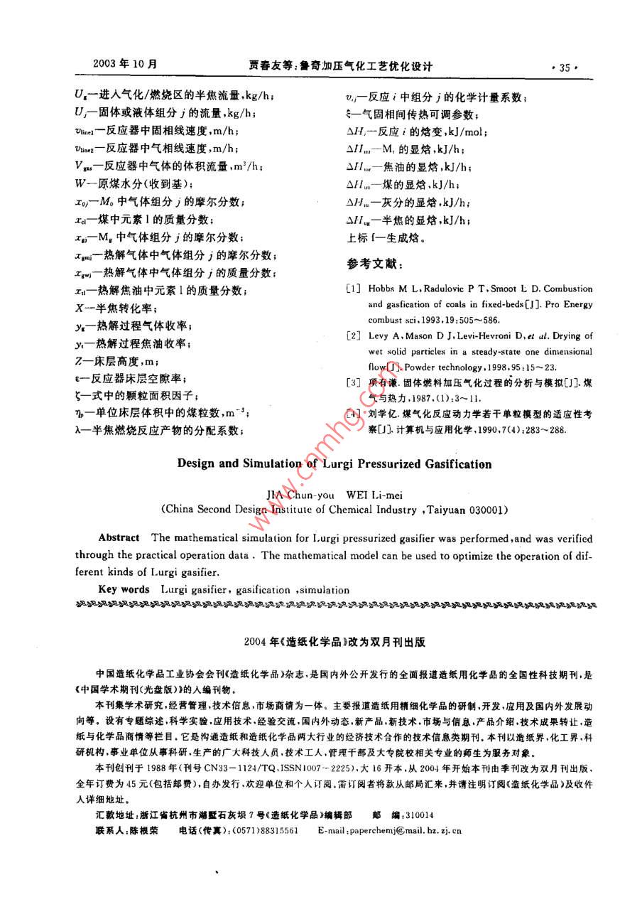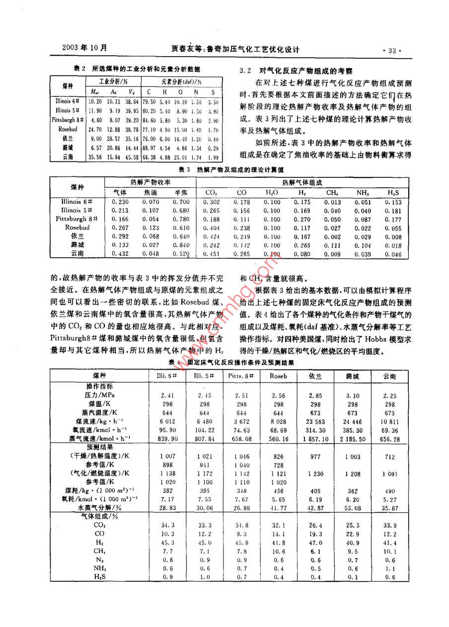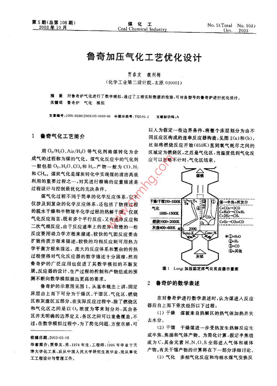 第5期(總第108期)煤化工No.5(Total No. 108)_2003年 10月Coal Chemical IndustryOet.2003魯奇加壓氣化工藝優(yōu)化設計賈春友魏利棹(化學工業(yè)第二設計院.太原030001)摘要對魯奇爐氣化進行了數(shù)學模擬,通過了工程實際數(shù)據(jù)的檢驗.可對各型號的餐奇爐進行優(yōu)化設計.關鍵詞魯奇爐氣化模擬文章編號1005-9598(2003)05-0030-06中國分類號:TQ546.2 文獻標識碼:A以人為假定- -些邊界條件,將整個床層劃分為由不1魯奇氣化工藝簡介同反應區(qū)構成的連串反應器構造,見圖2(a)和(b),比如將燃燒反應開始(650K)直到氧氣耗盡之間的用O2/H2O、Air/H2O等氣化劑將煤轉化為合區(qū)域定為燃燒區(qū),之后是氣化區(qū),當溫度低到氣化反成氣的過程稱為煤的氣化。煤氣化反應中的氣化劑應可以忽略不計時,氣化區(qū)結束。一般包括02、H2O、CO2和H2.產(chǎn)物一般為CO.H:和CH。煤炭氣化是煤炭轉化中實現(xiàn)煤的清潔高效利用的重要過程之一,對其進行精確的定量描述是過程設計與控制最優(yōu)化的先決條件。煤氣化過程不同于簡單的化學反應體系,它不僅涉及到復雜的化學反應體系,還包括了物理過程干燥千350-10100T-酒TD煤一→半焦+揮發(fā)分的脫水干燥和半物理半化學過程的熱解干餾。僅就氣化100-1500CtCocu氣化反應而言,既有多個平行反應,又有連申反應和燃燒0002000KOY _二次氣相反應。由于反應速率上的差異,較慢的一些4灰406004..1... 200反應要用動力學方程來描述,較快的氣固反應要由*0-H;O2-H擴散傳質方程來描述,較快的均相反應則可用熱力3-C0學平衡方程來描述。龐大的反應體系和繁雜的傳熱④-其他過程使得對氣化反應器的數(shù)學描述十分困難,然而灰鎖魯奇爐的廣泛應用也促進了其數(shù)學模擬的不斷發(fā)圈1 Lorgi 加壓固定床氣化反應器示意圈展.反應器的設計、生產(chǎn)過程的控制和產(chǎn)物組成的預測不斷向數(shù)學模擬提出更高的要求.魯奇爐的示意圖見圖1.從基本概念上講,固定2魯奇爐的數(shù)學表述床層由上而下可分為干燥區(qū)、千餾區(qū)、氣化區(qū)燃燒在對魯奇爐進行數(shù)學表述時,認為煤進入反應區(qū)和灰渣區(qū)五部分。在實際反應過程中.除了燃燒區(qū)器后自上而下依次經(jīng)歷以下過程:和氣化區(qū)之間是以O;依度為零來劃分外,其余各(1)干燥煤被來自熱解區(qū)的熱氣體加熱并失區(qū)并無明確的邊界定義,各區(qū)之間可以重疊覆蓋。不去水分。過,在數(shù)學模擬過程中,為了簡化問題、方便求解,可.(2)干餾干燥煤進一步 受熱發(fā)生熱解反應生成半焦,焦油和氣體產(chǎn)物。為簡化計算.假定半焦組收稿日期:2003-05-18作者簡介;賈春友.男,1974年生.工程師。1996年畢業(yè)于天成為C.其余元素H、N.O.S全部進人氣體和液體律大學化工系.后從中國人民大學研究生班畢業(yè),現(xiàn)從事化產(chǎn)物.有關千餾產(chǎn)物的計算將在下一部分詳細討論。(3)氣化多相氣化反應 和均相水煤氣變換反工工程設計與管理工作。2003年10月賈春友等:魯奇加壓氣化工藝優(yōu)化設計,31●謀,產(chǎn)晶氣表]化學反應和組分編碼自由區(qū)反座組分元素II CO2干燥區(qū)干爆/干餾區(qū)A 1+02→+2(2-1)C0+(2-CO2? C0半焦熱氣體.”3 O2干餾區(qū)B C+CO2 +200H20氣化區(qū)c C+H20(g)-+C0+H21C|半熊D C+2H→CH7 N2(含所有隋性氣|2 H{↓靴性氣體$)30|燃施區(qū)E C0+H20(g)+C02+H2, NH、4 N|燃燒區(qū)H2SF干館氣體生成反座,矢區(qū)0半焦灰渣反應氣體;干餾焦溜生成反應11灰分a)(b)|H于燥過程3水分圈2Lurgi固定床氣化器分區(qū)及連串構造橫型示意圖14干餾氣應為:這些反應的生成物均為重量基準。在模擬計算C+H20(g)→CO+Hz AH= 131.306 kJ/mol中,所有反應的化學計量系數(shù).,取反應方程式右側............................... (1)為正,左側為負。C+CO2→2CO OH=172. 47 kJ/mol .. (2)對氣體組分物料衡算、固體組分物料衡算、氣體C+2H:-→CH,0H=-74. 84 kJ/mol ... (3)總能量衡算.固體總能量衡算的表述如下:C0+ H2O(g)→CO.+H2=A,SUR,................ (6)△H=-41. 16 kJ/mol●d7"其中前兩個反應為強吸熱反應,后兩個反應為弱放熱反應,故氣相自燃燒區(qū)進入氣化區(qū)后,在向上流動的過程中溫度迅速降低。出-[-/sROH,+se. +Q.- Q.m]/Cr(4)燃燒半焦在燃燒區(qū)氧化生成CO和CO,考慮到燃燒產(chǎn)物的分布,給出如下綜合反應i= A.[- f,sR,0H,-sQ, -Q.- Q]/Cp .XC+O2-→2(λ-1)C0+ (2- X)CO2................................ (9)OH= - 565.98+ 172.47AkJ/mol ..... (5)干燥區(qū)僅涉及煤中水分向氣相的轉移,故i=其中λ介于1~2之間。(5)灰分的熱交換半焦在燃燒區(qū)發(fā)生劇烈的8,j=4,13。相應的衡算方程為:dM,氧化燃燒反應后,熾熱的灰分進入灰分區(qū),同溫度較.... (10)低的氣化劑發(fā)生熱交換,一方面對氣化劑進行預熱;dU!.另一方面使灰分的溫度降至適宜排放的溫度。在對魯奇爐進行數(shù)學表述時,由于涉及的反應、反應速率R。和R:之間存在如下關系:組分、溫度、組成等變量數(shù)目很多,故需要首先對各Rs=Rt/18 .....化學反應和組分以及元素進行編碼,以方便對反應干餾區(qū)的物料衡算方式同干燥區(qū)類似,也存在器內不同過程的表述。各化學反應及相關組分和元著重量基準和摩爾基準之間的換算問題。按照前面素的編碼結果見表1。的討論結果,對多相氣化和燃燒反應,按縮核反應模表1中反應F~H的具體表達式如下:型,引入Biba近似動力學:反應F:煤→yem干餾煤氣(k,A,C,T、水蒸氣分解率