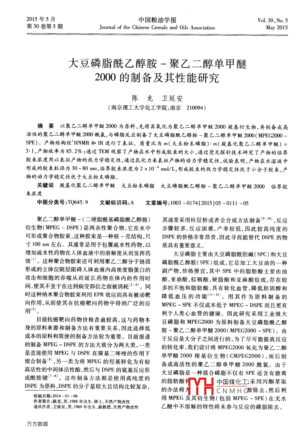 大豆磷脂酰乙醇胺-聚乙二醇單甲醚2000的制備及其性能研究
