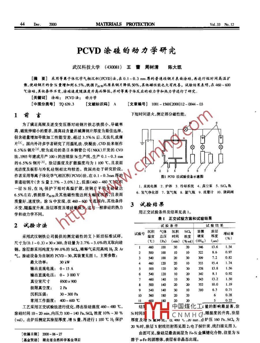 44De.2000MATERIALS PROTECTIONvd.33No.12PCⅴD馀硅的動力學(xué)研究武漢科技大學(xué)(430081)王瞢周樹清陳大凱[擴(kuò)要]采用等離子體化學(xué)氣相沉積(r℃ⅦD)法,在0.1~0.3mm厚的普通硅鋼片裹面涂硅,再進(jìn)行短時間高溫?cái)U(kuò)散,使珪鋼片的含S量增加到6.5%,鐵損P比原來鋼片降低50%,其他磁性能也大有改善。試驗(yàn)結(jié)果表明,在460-600℃涂硅,他條件不變,涂珪速度隨漒度升髙而降低,并對等離子體反應(yīng)的動力學(xué)和熱力學(xué)進(jìn)行了研究。[關(guān)詞]涂硅;PCVD法;動力學(xué)[中圖分類號]1Q639.3[文獻(xiàn)標(biāo)識碼]A[文章編號]1001-1560(20012-004-031前言書下短時間退火,測定部分磁性能為了滿足高頻及逆變變壓器對硅鋼片鐵芯鐵損小、導(dǎo)磁率高、磁致伸縮小的要求提高硅含量并減薄鋼片厚度為最佳選擇。但含硅盤增加導(dǎo)致加工性能變差,超過35%S后,無法軋成薄片。國內(nèi)外許多學(xué)者研究了用溫軋法快凝法、CvD法來制作6.5%S鋼片2,較為成功的是日本鋼管公司(NKK)開發(fā)的CvD法,1993年建成月產(chǎn)100t的連續(xù)涂S生產(chǎn)線,生產(chǎn)01-0.3mm的65%5鋼片3。涂層溫度及擴(kuò)散溫度均為1100℃,且表面光潔度及板形與冷軋硅鋼相比均較差。我國尚處于研究階段。作者采用等離子體化學(xué)氣相沉積(PCVD)法,在0.1-0.3mm厚的圖 I PCVD法試驗(yàn)設(shè)備示意圖普通硅鋼片(含S量2.7%-3.0%)上,低溫(460~480℃)沉積層S后,在保護(hù)下短時高溫?cái)U(kuò)散,使鋼片平均含硅量達(dá)直流電源2.爐體3.冷卻系統(tǒng)4.真空泵5.SiC瓶65%左右鐵損部P、及其他磁性能達(dá)到大幅度改善,且表面6.氫氣凈化器7.氫氣瓶8.氫氣瓶9.流量計(jì)10.微調(diào)閥質(zhì)量好速度快。涂S中發(fā)現(xiàn),在460~600℃范圍內(nèi),其他條件不變隨溫度升高涂層厚度及增硅量減少,這與一般滲硅的熱力3試驗(yàn)結(jié)票學(xué)和動力學(xué)不同用正交試驗(yàn)條件及結(jié)果見表1表I正交試驗(yàn)方案和試驗(yàn)結(jié)果2試發(fā)方法試驗(yàn)條件試驗(yàn)結(jié)果采用武漢鋼鐵公司提供的測定磁性的艾卜斯坦標(biāo)準(zhǔn)試樣驗(yàn)號沉積氣體沉積S顯微涂層溫度總壓時間濃度硬度厚度增硅尺寸為(01-03)×30×300,含硅量為27%-30%的無取向硅(℃)(R)(min)(%w(H){(鋼。涂層源采用純度為99.0%的S,稀釋氣采用高純H2及Ar1460100302034613.61.548.6氣。涂硅設(shè)備為自制的PCVD-30,其裝置見圖1。主要參數(shù)5401002030最大功率:30 kW4460120201035515.41.74輸出直流電流:0~15A輸出直流電壓:0-3000V654012010203428.10.92真空室尺寸500X9007460140103013.21.5001.19極限真空度:2Pa沉積壓強(qiáng)105601202028常用工作溫度:400~600℃工藝采用正交試驗(yàn)法進(jìn)行優(yōu)化,得出涂硅溫度460~480℃,中國煤化工量的影響最顯著涂涂硅時間10-20min,內(nèi)壓力100-~140Pa,SiC濃度10%~30%S時間CNMHG,隨溫度的升高涂層(vol)。出爐后測定其涂層厚度、增S量再進(jìn)行1100℃保護(hù)厚度及增sk陣低。仕400飛、Umn、總爐壓160P、SiCL4為0%時涂層X射線衍射圖見圖2;電子探針面線掃描見圖3。[收稿日期]2000-06-27由圖可見涂硅層最表面層為FeS金屬鍵化合物往里為S基金資助]湖北省自然科學(xué)基金項(xiàng)目溶于aFe的固溶體,表層有非晶態(tài)出現(xiàn)。2000年12月材料保護(hù)33卷第12期45一非態(tài)式中K—波爾茲曼常數(shù)電子電量m—電子密度—絕對溫度當(dāng)?shù)掳萸騼?nèi)有許多粒子時,參數(shù)g就是個小量,并且等離子體中粒子的平均勢能遠(yuǎn)小于平均動能,當(dāng)粒子間的相互作用達(dá)到可忽略的程度時,等離子體的行為就和理想氣體一樣,熱力2/()學(xué)函數(shù)可以用麥克斯韋分布來描述。等離子體中粒子的速度函圖2X射線荷射圖數(shù)為:dN/N=4m2(5akT 2e aTdt=f() de式中m粒子質(zhì)量波爾茲曼常數(shù)7—絕對溫度速度由(3)式可求出最大概率速度,即收n)/dh=0時的速度rm2N(a)線掃描(b)面打描圖3涂硅層電子探針掃描圖平均速度為對0.1-0.3mm厚本底硅為3%的鋼片,經(jīng)涂硅退火后,進(jìn)行ufl r)dr8AT)t(5)了部分磁性能對比測試,結(jié)果見表2表2涂硅試樣磁性能測試結(jié)果均方根速度被定為12的平均平方根鋼片Px(w/kg)P1(w/kg)B 251(6)厚(m)未涂S涂S未涂S涂s未涂S涂S等離子體中的粒子碰撞分為內(nèi)能不變的彈性碰撞和內(nèi)能改0.102.2501.200變的非彈性碰撞,在PCD制備薄膜過程中,希望活性粒子發(fā)生0.102.0000.9000.351.7600,6951.590,681s1m1非彈性碰撞,并且次數(shù)盡可能的多。當(dāng)半徑為n和n2的剛體球0.351.1800,621.290.70發(fā)生碰撞時,其碰撞的截面積為0.351.0310.7251.200.79S=x(n1+n2)20.350.8500.6890.920.64具有等溫的麥克斯韋分布的兩種氣體分子,每單位時間、單4討論位體積中碰撞次N為:N2=n1n2(n1+n2)2式中n,n2分別為兩種氣體的粒子密度,是兩種氣體分子的實(shí)驗(yàn)結(jié)果表明溫度對涂硅速度的影響最顯著,隨溫度的升平均相對速度。在同種氣體中,如果把作為一次平均速度,則高,除層厚度及增硅且減少。這種現(xiàn)象,正好與常規(guī)的滲涂規(guī)律2,若21=4,則相反,可從等離子體粒子間相互作用、與基體的相互作用來分析W=N2rn'd't(8)等離子涂S過程在試樣表面的反應(yīng)為:因?yàn)榕鲎差l率y.可用M/n表示,所以對于同種氣體有:沉積+射從某粒子同另一粒子發(fā)生碰撞開始,到與下一粒子發(fā)生碰該反應(yīng)均隨溫度升高而加速,高溫有利于濺射速度的增加,撞為
