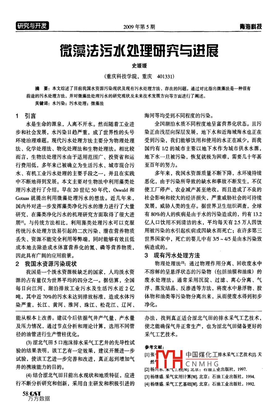 研究與開發(fā)2009年第5期青??萍嘉⒃宸ㄎ鬯幚硌芯颗c進(jìn)展史媛媛(重慶科技學(xué)院,重慶401331)摘要:本文綜述了目前我國水資源污染現(xiàn)狀及現(xiàn)有污水處理方法,存在的問題。通過對(duì)比指出微藻法是-種很有前途的污水處理方法,并對(duì)微藻法處理污水的研究現(xiàn)狀及未來技術(shù)發(fā)展方向等方面進(jìn)行了闡述。關(guān)鍵詞:水污染;污水處理;微藻法1引言海河等均受到不同程度的污染。水是生命的源泉,人離不開水。然而隨著工業(yè)進(jìn)全國湖泊水質(zhì)不同程度地呈富營養(yǎng)化狀態(tài)。且污步和社會(huì)發(fā)展,水污染日趨嚴(yán)重,成了世界性的頭號(hào)染正由淺層向深層發(fā)展,地下水和近海域海水也正在環(huán)境治理難題?,F(xiàn)代污水處理方法主要分為物理處理受到污染,我們能夠飲用和使用的水正在減少。而我法、化學(xué)處理法、物化處理法和生物處理法。相比較國約有12的城市主要以地下水作為城市供水水源,而言,生物法處理污水由于適用范圍廣、投資省和運(yùn)地下水- -旦被污染,恢復(fù)就極為困難,需要幾十年甚行費(fèi)用低,多年來已被確立為生活污水、城市混合污至百年的努力。.水、有機(jī)工業(yè)污水處理的主要手段之-,并且在實(shí)踐多年來,我國水資源質(zhì)量不斷下降,水環(huán)境持續(xù)中不斷地得到發(fā)展。本文主要對(duì)生物法中利用藻類處惡化,由于污染所導(dǎo)致的缺水和事故不斷發(fā)生,不僅理污水進(jìn)行了介紹。早在20世紀(jì)50年代,Oswald 和使工廠停產(chǎn)、農(nóng)業(yè)減產(chǎn)甚至絕收,而且造成了不良的Gotaas就提出利用微藻處理污水的想法。近幾年來,社會(huì)影響和較大的經(jīng)濟(jì)損失,嚴(yán)重威脅社會(huì)的可持續(xù)國內(nèi)外對(duì)進(jìn)一步發(fā)揮藻類凈化污水的潛力進(jìn)行了大量發(fā)展,威脅人類的生存。據(jù)世界衛(wèi)生組織調(diào)查,全球研究,在藻類凈化污水的機(jī)理研究方面取得了很大進(jìn)有80%的人的疾病是由于水的污染造成的,約有13.2展"。與傳統(tǒng)方法相比,利用藻類處理污水可以克服億人口飲用不到清潔的水,平均每天有2.5萬人因飲傳統(tǒng)污水處理方法易引起的二次污染、潛在營養(yǎng)物質(zhì)用被污染的水引起疾病或因缺水而死亡;在許多第三丟失、資源不能完全利用等弊端,同時(shí)能夠有效且低世界國家中,死亡的嬰兒中有3/5 ~ 4/5是由水污染致成本地去除造成水體富營養(yǎng)化的氮、磷等營養(yǎng)物質(zhì),病造成的。因此具有廣闊的應(yīng)用前景。3現(xiàn)有污水 處理方法2我國水 資源污染現(xiàn)狀物理處理法叫:通過物理作用分離、回收廢水中我國是-一個(gè)淡水資源極缺乏的國家,人均淡水資不溶解的呈懸浮狀態(tài)的污染物(包括油膜和油珠)的源的占有量僅為世界平均的四分之一-。據(jù)估算,全國廢水處理法。通常采用沉淀、過濾、離心分離、氣每日向江河、湖泊排放工業(yè)污水及生活污水近2億浮、蒸發(fā)結(jié)晶、反滲透等方法,將廢水中懸浮物、膠噸,其中近70%的污水未達(dá)到排放標(biāo)準(zhǔn),造成水體污體物和油類等污染物分離出來,從而使廢水得到初步染嚴(yán)重,長江、黃河、淮河、珠江、松花江、遼河、凈化。能從根本上改善。建議今后依據(jù)氣井產(chǎn)氣量、產(chǎn)水量辦法,找到真正適合澀北氣田的排水采氣工藝技術(shù),及壓力情況,通過節(jié)點(diǎn)分析和理論計(jì)算,選用不同管使之能確保氣井正常生產(chǎn),也為澀北氣田儲(chǔ)備更好的徑的油管進(jìn)行生產(chǎn)管柱優(yōu)化。采氣工藝技術(shù)。(3) 澀北氣田5口泡沫排水采氣工藝井的先導(dǎo)性試參考文獻(xiàn):驗(yàn)的結(jié)果表明,該工藝有一定效果, 建議開展進(jìn)-步試驗(yàn),使該工藝進(jìn)一步完善和改進(jìn),真正起到增加氣(1張中國煤化工排水采氣工藝技術(shù)辦,天井的攜液能力的目的。CHCNMHG[2]楊川樂米氣山.程M].北京:口調(diào)⊥業(yè)出版社,1997.(4)結(jié)合澀北氣田目前出水現(xiàn)狀和地質(zhì)特征,應(yīng)進(jìn)[3]楊繼盛采氣實(shí)用計(jì)算M.北京:石油工業(yè)出版社,1994.行不斷分析研究和創(chuàng)新,采用自主研發(fā)和積極引進(jìn)的[4]楊繼盛采氣工藝基礎(chǔ)[M]北京:石油工業(yè)出版社,1992.58 CST青海科技.2009年第5期研究與開發(fā))化學(xué)處理法叫:通過向污水中投加化學(xué)試劑,使發(fā)展。其與污水中污染物質(zhì)發(fā)生化學(xué)反應(yīng),去除污染物,或20世紀(jì)60年代,出現(xiàn)了高速率藻塘,它通過形使污水達(dá)到排放水水質(zhì)要求的方法。通常采用的方法成藻菌共生系統(tǒng)來凈化污水。廖敏等間通過實(shí)驗(yàn)發(fā)現(xiàn)有:中和、混凝、氧化還原、萃取、汽提、吹脫、吸藻菌共生體對(duì)砷有良好的去除作用。此工藝既有傳統(tǒng)附、離子交換以及電滲透等。氧化塘工藝投資省、運(yùn)行費(fèi)用低、易管理等特點(diǎn),較以上兩種方法雖然效果顯著,但由于廢水處理設(shè)普通氧化塘,它又能承受更高負(fù)荷的污水,塘更淺。施的運(yùn)行管理專業(yè)性強(qiáng),技術(shù)要求高,因而管理難度但由于其主要依靠自然生長的藻類和半人工控制手大。而且受重經(jīng)濟(jì)、輕環(huán)境的舊觀念影響,壓低環