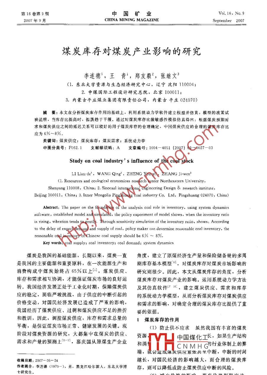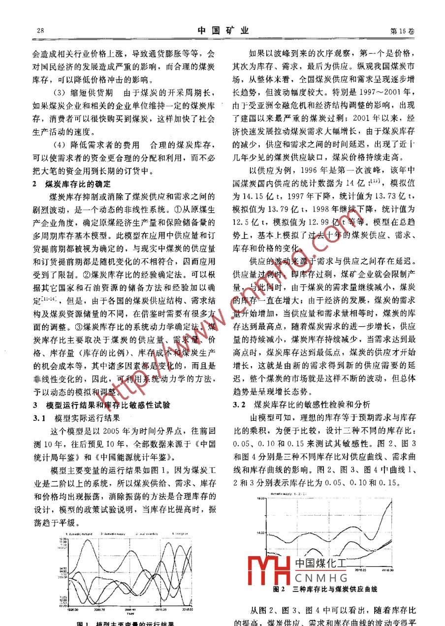 第16卷第9期中國礦業(yè)Vol. 16, No. 92007年9月CHINA MINING MAGAZINESeptember 2007煤炭庫存對煤炭產(chǎn)業(yè)影響的研究李連德’,王青',鄭友毅’,張繼文(1.東北大學(xué)資源與生態(tài)經(jīng)濟(jì)研究中心,遼寧沈陽110004;2.中煤國際工程設(shè)計研究總院,北京100011;3.內(nèi)蒙古平莊煤業(yè)集團(tuán)有限責(zé)任公司,內(nèi)蒙古平莊021070)摘要:本文在分析煤炭庫存作用的基礎(chǔ)上,利用系統(tǒng)動力學(xué)軟件建立模型并仿真,模型的政策試.驗(yàn)說明,當(dāng)庫存比提高時,振蕩趨于平緩。通過對煤炭庫存比做敏感性模擬仿真得出:根據(jù)煤炭預(yù)期省求和煤炭供應(yīng)之間的延遲關(guān)系可以較好的用于煤炭庫存的臺理確定,中國煤炭供應(yīng)的合理的煤炭庫存比應(yīng)為6%~8%。關(guān)鍵詞:煤炭供應(yīng);煤炭庫存;煤炭需求;系統(tǒng)動力學(xué)中圖分類號: F062.1文獻(xiàn)標(biāo)識碼: A文章編號: 1004- 4051 (2007) 09-0027 - 03Study on coal industry' s influence of the coal stockLI Liar-de',WANG Qing',ZHENG You-yie,ZHANG Ji-wen'(1. Resources and ccological economices researcb cenler Northcastern University,Shenyang 10008,China; 2. Sinocaal international cnginccring Design & research institule, .Bejing 100011, China; 3. Inner Mongolia Pingzhuang coal industry Co. Ltd, Pingzhuang 024070, China)Abstract: The paper on the foundation of the analysis cal role in inventory, using system dynamicssoftwarc, cstablished model and simulated, the policey experiment of model shows, when the inventory ratiois rising, vibration tends to gently. Through sensitivity simulation of the inventory ratio, shows: According10 the delay of expect dernand and supply of coal, policy maker can determine reasonablc coal inventory, thereasonable coal inventory of Chinese coal supply should be 6% ~ 8%.Key words; coal supply; coal inventory; coal demand; systen dynamics煤炭是我國的基礎(chǔ)能源,長期以來,煤炭-直角度,建立了原煤經(jīng)濟(jì)生產(chǎn)量和保險儲備量的多周是我國的主要能源和重要原料,在一次能源生產(chǎn)和期庫存基本模型6],對煤炭庫存對煤炭市場影響的消費(fèi)構(gòu)成中煤炭始終占65%以上,煤炭供應(yīng)、研究則很少。因此,本文從煤炭庫存的角度,分析庫存和需求相互協(xié)調(diào),才能保證煤發(fā)市場的良好運(yùn)煤炭庫存對煤炭產(chǎn)業(yè)的影響。運(yùn)用系統(tǒng)動力學(xué)方法轉(zhuǎn)。我國經(jīng)濟(jì)發(fā)展正處于工業(yè)化時期,保障煤炭供及其仿真軟件[”10~, 建立煤炭供應(yīng)、需求和庫存應(yīng)的穩(wěn)定,面臨嚴(yán)峻挑戰(zhàn),由于供應(yīng)的中斷引起的的系統(tǒng)動力學(xué)模型,從而分析煤炭庫存對煤炭供應(yīng)價格變動,對國民經(jīng)濟(jì)發(fā)展已造成了嚴(yán)重的影響,和需求的影響,對確定合理的煤炭庫存比提供了重我國經(jīng)歷了煤炭供應(yīng)、過剩和煤炭供應(yīng)不足的挫折要的依據(jù)。和教訓(xùn),因此,調(diào)控煤炭供應(yīng),庫存和需求總量的1煤炭庫存的作用平衡,是保證煤炭市場正常、健康發(fā)展的關(guān)鍵。現(xiàn)(1)防止供不應(yīng)求雖然我國有 豐富的煤炭階段對煤炭資源的研究,大都集中在煤炎的供應(yīng)、資源:中國煤化工長,如果生產(chǎn)結(jié)構(gòu)需求和產(chǎn)量的預(yù)測上「°≈-5],慕慶國從原煤生產(chǎn)企業(yè)和消CN M H G的行業(yè)體制上的弊端,就公道成煤灰供應(yīng)緊張甚¥中斷,中斷的時間收稿日期: 2007-05- 24越長,對國民經(jīng)濟(jì)的影響越大,而合理的煤炭庫作者簡介:李連德(1970-), 男,黑龍江哈爾濱人,東北大學(xué)博存,則可以降低或防止煤炭供應(yīng)中斷的風(fēng)險。十研究生。(2)臧少價格的影響煤炭價格劇烈變動,.28中國礦業(yè)第16卷會造成相關(guān)行業(yè)價格上漲,導(dǎo)致通貨膨脹等等,會如果以波峰到來的次序觀察,第一個是價格,對國民經(jīng)濟(jì)的發(fā)展造成嚴(yán)重的影響,而合理的煤炭其次為庫存、需求,最后為供應(yīng)??v觀我國煤炭市庫存,叮以降低價格沖出的影響。場,從整體米看,全國煤炭供應(yīng)和需求呈現(xiàn)逐步增(3)縮短供貨期由于煤炭的開采周期長,長趨勢,但波動幅度較大。特別是1997~2001年,如果煤炭企業(yè)和相關(guān)的企業(yè)單位維持一定的煤炭庫由于受亞洲金融危機(jī)和經(jīng)濟(jì)結(jié)構(gòu)調(diào)整的影響,出現(xiàn)存,消費(fèi)者可以很快購買到煤炭,這樣加快了社會了建國以來最嚴(yán)重的煤炭過剩; 2001 年以來,經(jīng)生產(chǎn)活動的速度。濟(jì)快速發(fā)展拉動煤炭需求大幅增長,由于煤炭庫存(4)降低需求者的費(fèi)用 合理的煤炭庫存,的減少,供應(yīng)和需求之間的時間延遲,出現(xiàn)了近I可以使需求者的資金更合理的分配和利用,而不必幾年少見的煤炭供應(yīng)缺口,煤炎價格持續(xù)走高。把大筆的資金用到長期的訂貨中。以供應(yīng)為例,1996 年是第-次波峰,該年中2煤炭庫存比的確定國煤炭國內(nèi)供應(yīng)的統(tǒng)計數(shù)據(jù)為14億間,模擬值煤炭庫存抑制或消除了煤炭供應(yīng)和需求之問的為14.15億t,1997 年下降,統(tǒng)計值為13. 73億t,劇烈波動,是一個動態(tài)的非線性系統(tǒng)。①從原煤生模擬值為13. 79億t,1998 年繼續(xù)下降,統(tǒng)計值為產(chǎn)企業(yè)角度,確定原煤經(jīng)濟(jì)生產(chǎn)量和保險儲備量的12.5億t,模擬值為12.99億t等等。模型在總趨多周期