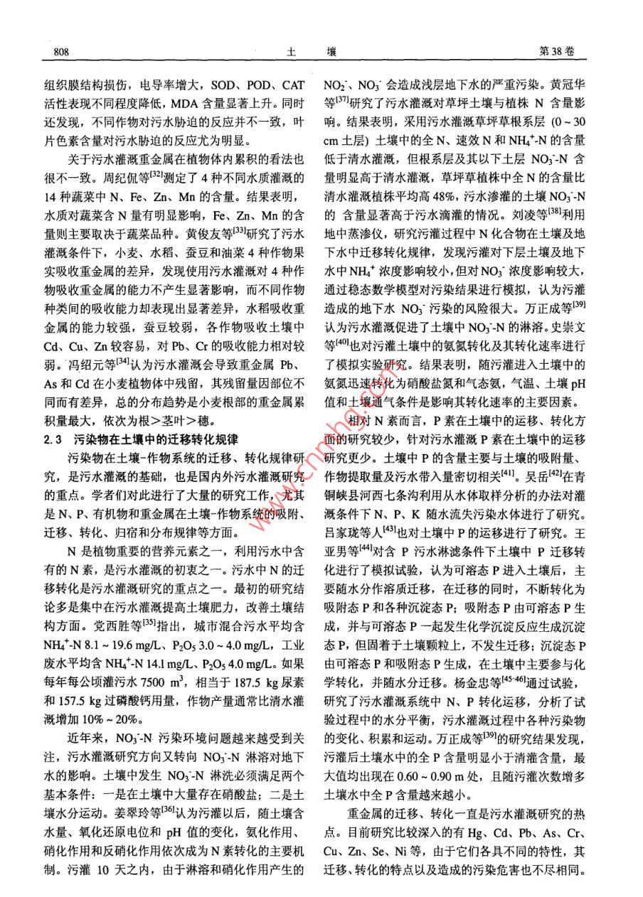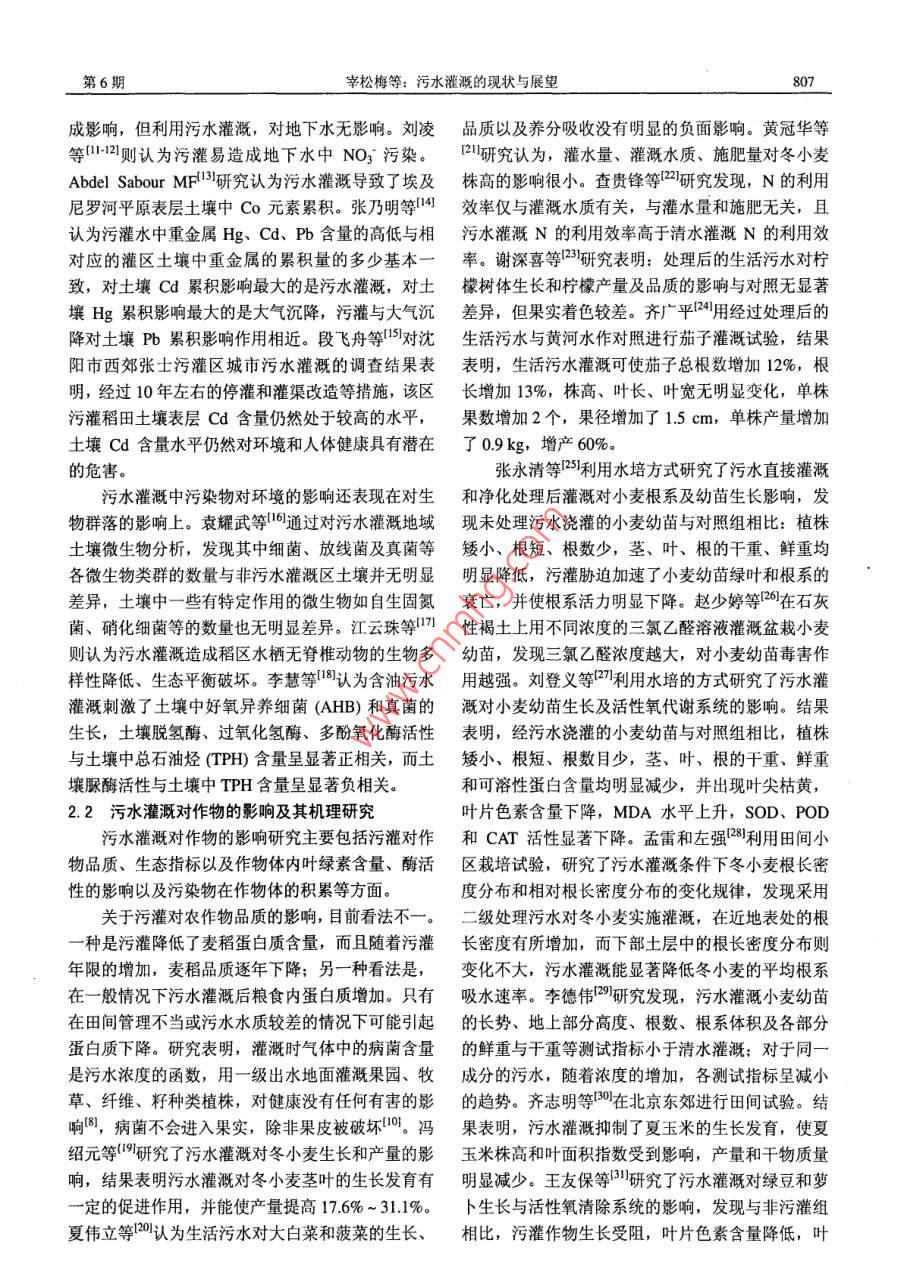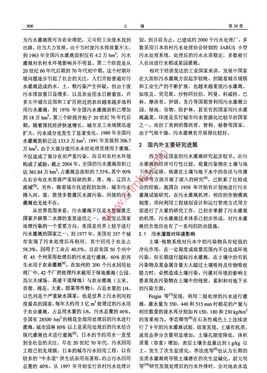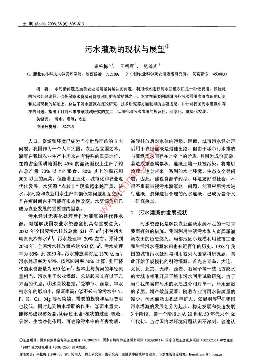 土壤( Soils),2006,38(6:805-813污水灌溉的現(xiàn)狀與展望宰松梅“,王朝輝',龐鴻賓(1西北農(nóng)林科技大學資環(huán)學院,陜西楊凌712100;2中國農(nóng)業(yè)科學院農(nóng)田灌溉研究所,河南新鄉(xiāng)453003)摘要:水污染問題是當前農(nóng)業(yè)發(fā)展亟待解決的問題。利用污水進行污水回灌農(nóng)田是一種低費用、低能耗的污水處理途徑,也是保障水資源可持續(xù)利用的有效措施之一。本文在簡要回顧國內(nèi)外污水回用灌溉農(nóng)田的歷史和發(fā)展現(xiàn)狀的基礎上,總結(jié)了污水灌溉在理論研究、技術研究等方面取得的主要成果,并針對我國污水灌溉中存在的問題,指出了目前和未來該領域研究的重點,以期推動污水灌溉的規(guī)范化、科學化、健康化發(fā)展關鍵詞:污水;灌溉;農(nóng)田中圖分類號:S273.5人口、資源和環(huán)境已成為當今世界面臨的3大減輕排放后對水體的污染。因而,城市污水經(jīng)處理問題。我國作為一個人口大國,農(nóng)業(yè)是立國之本。后用于農(nóng)田灌溉是最佳出路。但由于城市污水排放灌溉在我國農(nóng)業(yè)生產(chǎn)中歷來占有特殊的重要地位,與灌溉需求間存在時空上的矛盾,且因為成份復雜,在約占全國耕地面積45%的灌溉面積上生產(chǎn)了約易造成重金屬累積。灌溉土壤一旦被污染,將難以占總產(chǎn)量70%以上的糧食、80%以上的棉花和治理,也會帶來一系列的水土環(huán)境、生態(tài)安全等問90%以上的蔬菜。但隨著工業(yè)化、城市化和農(nóng)業(yè)現(xiàn)題。因此,建設資源節(jié)約型、環(huán)境友好型社會,不代化發(fā)展,水資源“農(nóng)轉(zhuǎn)非”現(xiàn)象越來越嚴重,缺得不重新審視污水灌溉這一問題,能否應用污水進水、水污染和農(nóng)業(yè)用水生產(chǎn)率偏低等問題相互交織,行灌溉,怎樣進行合理的污水灌溉,已成為當今又且在短時間內(nèi)不可能有根本性改變。水資源危機已研究熱點。成為農(nóng)業(yè)發(fā)展的重要制約因素。污水經(jīng)過無害化處理后作為灌溉的替代性水1污水灌溉的發(fā)展現(xiàn)狀源,對緩解我國農(nóng)業(yè)水資源危機具有重要意義污水資源化是解決農(nóng)業(yè)灌溉水源不足的一項重2002年全國廢污水排放總量631億m3(不包括火要而有效的措施。我國利用生活污水和人畜糞尿灌電直流冷卻水,污水處理率20%左右。預計到溉農(nóng)田的歷史悠久。局部地區(qū)小規(guī)模利用城市工業(yè)2030年,全國污水排放量將達963億m,污水處理和生活污水灌溉農(nóng)田也有近百年的歷史。1958年我率為80%;到2050年,污水排放量將達1370億m3,國的城市污水處理與利用被列入國家科研課題,自污水處理率為95%,按照回用率50%計算,則可替此開始了規(guī)?;囊酃喔取J紫仍谇鄭u、大連代的水資源量為650億m3,基本上與黃河的年徑流太原、北京、天津、西安、石河子等一些北方缺水量相當。污水用于農(nóng)業(yè)灌溉,總結(jié)起來具有以下幾的大城市相繼開展了城市污水回用試驗研究。由于方面的優(yōu)點:①水量較穩(wěn)定,受季節(jié)、雨量、豐水當時我國城市污水的水質(zhì)成分相對單一,污水灌溉枯水年的影響小,保證率高;②不必去除污水中N、的節(jié)肥、增產(chǎn)效益顯著。隨著農(nóng)業(yè)可用水資源量的P、K、Ca、Mg等污染物,需要的投資和運行費用減少,污水灌溉面積逐年擴大。張展羽等把我國也較低,同時起到增水增肥的作用;③需水量大,污水灌溉的發(fā)展劃分為起步、穩(wěn)定發(fā)展和快速發(fā)展能夠形成規(guī)模效益;④經(jīng)過土壤-植物的過濾、吸收、3個階段。第一個階段是從20世紀50年代末至60吸附、生物凈化作用,可去除污水中的有害物質(zhì),年代初。當時國內(nèi)對環(huán)境問題認識不深刻,普遍認①基金項目:國家自然基金青年基金項目(40201028)、國家自然科學基金面上項目(30370843)、國家自然基金重點項目(30230230)和農(nóng)業(yè)部“948”重大研究項目(2003-Z53)共同資助作者簡介:宰松梅(10-),女,河南人,博士研究生,副研究員,主要從事區(qū)域綜合治理、節(jié)水灌溉理論研究。E-mail:zsm@firi.org.cn806第38卷為污水灌溉既可為農(nóng)業(yè)增肥,又可給工業(yè)廢水找到劃,到目前為止,已建成約2000個污水處理廠,多出路,應當大力發(fā)展。由于當時廢污水排放量不大,數(shù)采用日本農(nóng)村污水處理協(xié)會研制的 JARUS小型到1963年全國污水灌溉面積僅有42萬hm2,污水污水處理系統(tǒng),處理后的污水水質(zhì)穩(wěn)定,多數(shù)被引灌溉對農(nóng)村水環(huán)境影響并不明顯。第二個階段是從入農(nóng)田進行水稻或果園灌溉。20世紀60年代后期到70年代初中期。這個時期環(huán)相對于經(jīng)濟發(fā)達的工業(yè)國家來講,發(fā)展中國家境問題逐步引起了社會的關注,人們開始普遍對污在大面積污水灌溉方面起步較晚。但隨著城市規(guī)模水灌溉造成的水、土、糧污染產(chǎn)生懷疑。但由于廢和工業(yè)生產(chǎn)的不斷擴展,也越來越重視污水灌溉。污水排放量日益增多,以及農(nóng)業(yè)用水日漸緊張,許如埃及、突尼斯、沙特阿拉伯、阿曼、科威特、巴多大中城市近郊和工礦區(qū)附近的農(nóng)田越來越多地利林、摩洛哥、伊朗、蘇丹等國都曾利用污水灌溉公用污水灌溉,到1976年全國污水灌溉面積已增加園、綠地、谷