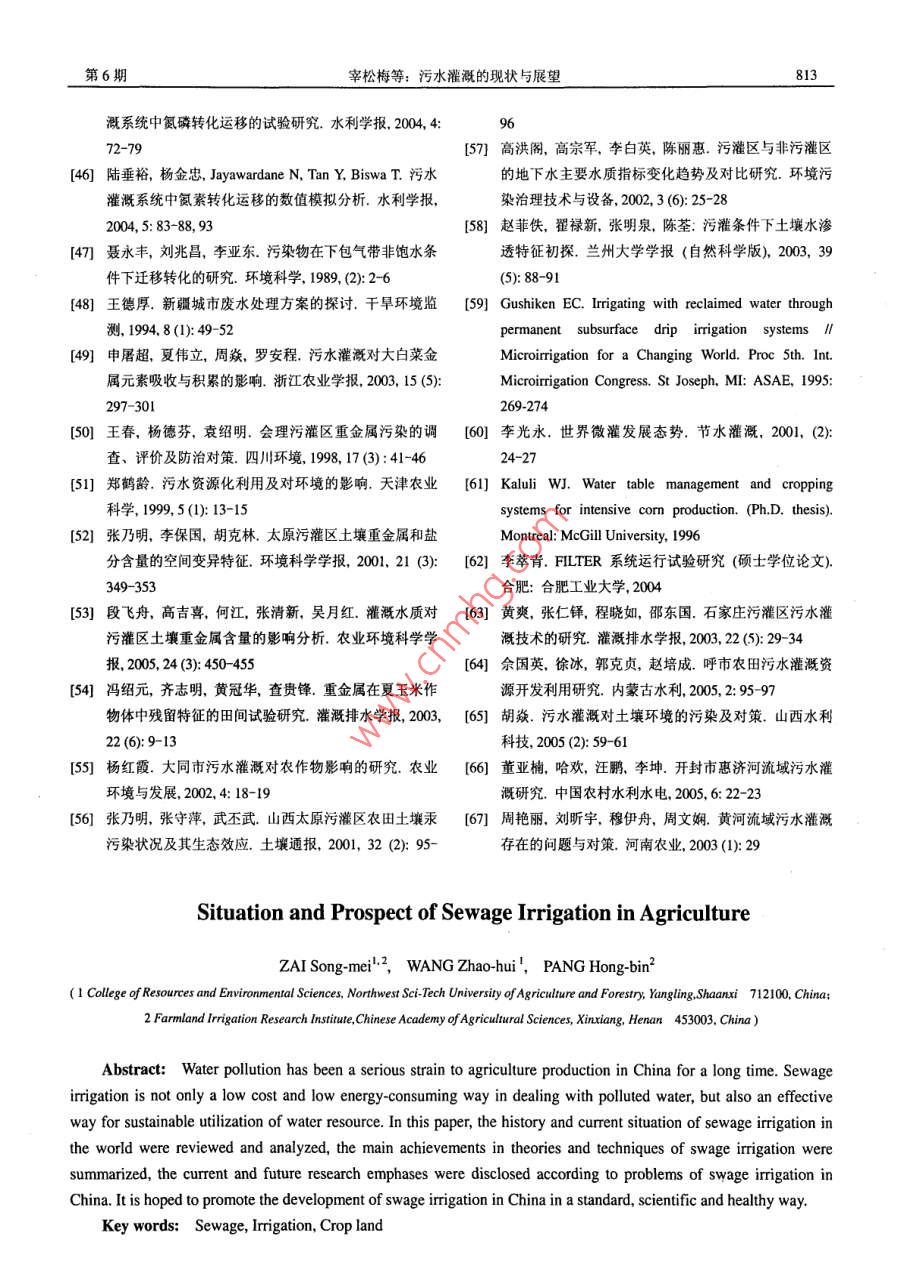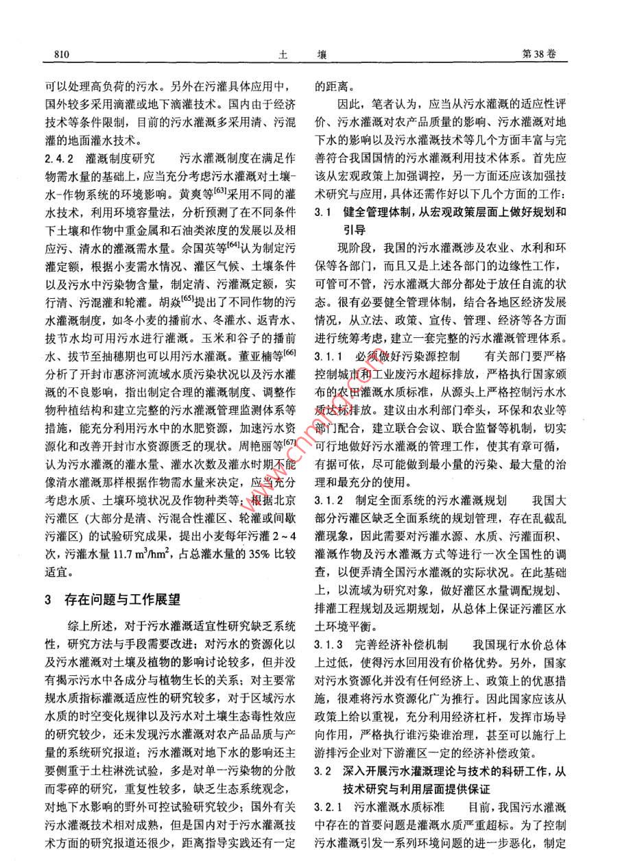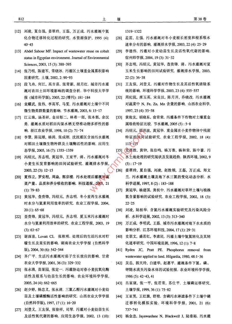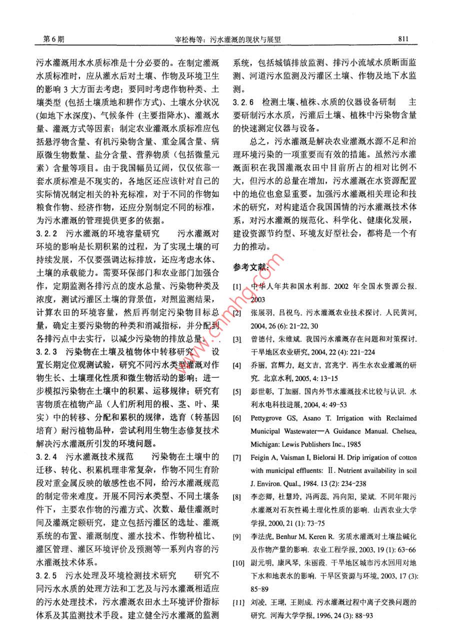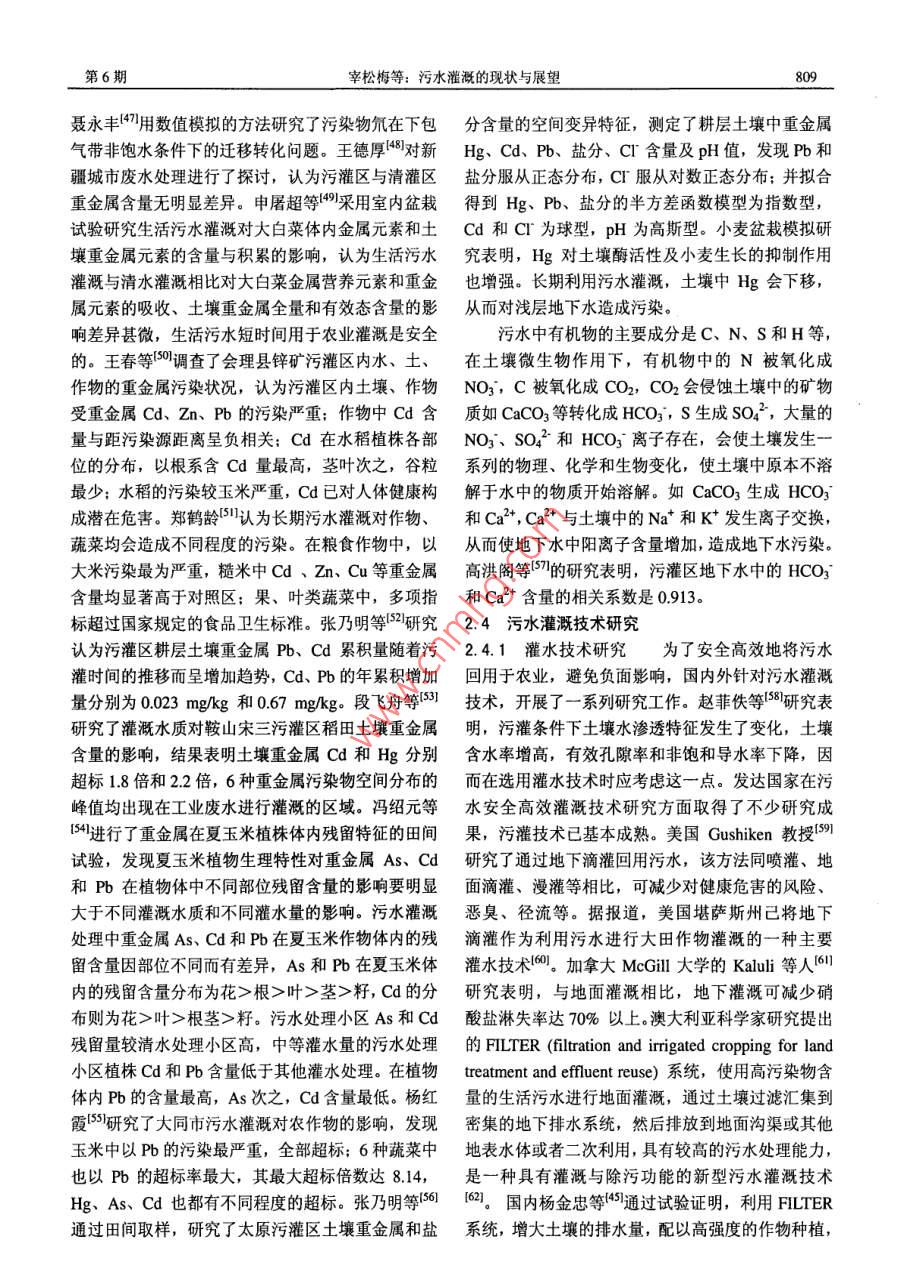 土壤( Soils),2006,38(6:805-813污水灌溉的現(xiàn)狀與展望宰松梅“,王朝輝',龐鴻賓(1西北農(nóng)林科技大學資環(huán)學院,陜西楊凌712100;2中國農(nóng)業(yè)科學院農(nóng)田灌溉研究所,河南新鄉(xiāng)453003)摘要:水污染問題是當前農(nóng)業(yè)發(fā)展亟待解決的問題。利用污水進行污水回灌農(nóng)田是一種低費用、低能耗的污水處理途徑,也是保障水資源可持續(xù)利用的有效措施之一。本文在簡要回顧國內(nèi)外污水回用灌溉農(nóng)田的歷史和發(fā)展現(xiàn)狀的基礎上,總結(jié)了污水灌溉在理論研究、技術研究等方面取得的主要成果,并針對我國污水灌溉中存在的問題,指出了目前和未來該領域研究的重點,以期推動污水灌溉的規(guī)范化、科學化、健康化發(fā)展關鍵詞:污水;灌溉;農(nóng)田中圖分類號:S273.5人口、資源和環(huán)境已成為當今世界面臨的3大減輕排放后對水體的污染。因而,城市污水經(jīng)處理問題。我國作為一個人口大國,農(nóng)業(yè)是立國之本。后用于農(nóng)田灌溉是最佳出路。但由于城市污水排放灌溉在我國農(nóng)業(yè)生產(chǎn)中歷來占有特殊的重要地位,與灌溉需求間存在時空上的矛盾,且因為成份復雜,在約占全國耕地面積45%的灌溉面積上生產(chǎn)了約易造成重金屬累積。灌溉土壤一旦被污染,將難以占總產(chǎn)量70%以上的糧食、80%以上的棉花和治理,也會帶來一系列的水土環(huán)境、生態(tài)安全等問90%以上的蔬菜。但隨著工業(yè)化、城市化和農(nóng)業(yè)現(xiàn)題。因此,建設資源節(jié)約型、環(huán)境友好型社會,不代化發(fā)展,水資源“農(nóng)轉(zhuǎn)非”現(xiàn)象越來越嚴重,缺得不重新審視污水灌溉這一問題,能否應用污水進水、水污染和農(nóng)業(yè)用水生產(chǎn)率偏低等問題相互交織,行灌溉,怎樣進行合理的污水灌溉,已成為當今又且在短時間內(nèi)不可能有根本性改變。水資源危機已研究熱點。成為農(nóng)業(yè)發(fā)展的重要制約因素。污水經(jīng)過無害化處理后作為灌溉的替代性水1污水灌溉的發(fā)展現(xiàn)狀源,對緩解我國農(nóng)業(yè)水資源危機具有重要意義污水資源化是解決農(nóng)業(yè)灌溉水源不足的一項重2002年全國廢污水排放總量631億m3(不包括火要而有效的措施。我國利用生活污水和人畜糞尿灌電直流冷卻水,污水處理率20%左右。預計到溉農(nóng)田的歷史悠久。局部地區(qū)小規(guī)模利用城市工業(yè)2030年,全國污水排放量將達963億m,污水處理和生活污水灌溉農(nóng)田也有近百年的歷史。1958年我率為80%;到2050年,污水排放量將達1370億m3,國的城市污水處理與利用被列入國家科研課題,自污水處理率為95%,按照回用率50%計算,則可替此開始了規(guī)?;囊酃喔取J紫仍谇鄭u、大連代的水資源量為650億m3,基本上與黃河的年徑流太原、北京、天津、西安、石河子等一些北方缺水量相當。污水用于農(nóng)業(yè)灌溉,總結(jié)起來具有以下幾的大城市相繼開展了城市污水回用試驗研究。由于方面的優(yōu)點:①水量較穩(wěn)定,受季節(jié)、雨量、豐水當時我國城市污水的水質(zhì)成分相對單一,污水灌溉枯水年的影響小,保證率高;②不必去除污水中N、的節(jié)肥、增產(chǎn)效益顯著。隨著農(nóng)業(yè)可用水資源量的P、K、Ca、Mg等污染物,需要的投資和運行費用減少,污水灌溉面積逐年擴大。張展羽等把我國也較低,同時起到增水增肥的作用;③需水量大,污水灌溉的發(fā)展劃分為起步、穩(wěn)定發(fā)展和快速發(fā)展能夠形成規(guī)模效益;④經(jīng)過土壤-植物的過濾、吸收、3個階段。第一個階段是從20世紀50年代末至60吸附、生物凈化作用,可去除污水中的有害物質(zhì),年代初。當時國內(nèi)對環(huán)境問題認識不深刻,普遍認①基金項目:國家自然基金青年基金項目(40201028)、國家自然科學基金面上項目(30370843)、國家自然基金重點項目(30230230)和農(nóng)業(yè)部“948”重大研究項目(2003-Z53)共同資助作者簡介:宰松梅(10-),女,河南人,博士研究生,副研究員,主要從事區(qū)域綜合治理、節(jié)水灌溉理論研究。E-mail:zsm@firi.org.cn806第38卷為污水灌溉既可為農(nóng)業(yè)增肥,又可給工業(yè)廢水找到劃,到目前為止,已建成約2000個污水處理廠,多出路,應當大力發(fā)展。由于當時廢污水排放量不大,數(shù)采用日本農(nóng)村污水處理協(xié)會研制的 JARUS小型到1963年全國污水灌溉面積僅有42萬hm2,污水污水處理系統(tǒng),處理后的污水水質(zhì)穩(wěn)定,多數(shù)被引灌溉對農(nóng)村水環(huán)境影響并不明顯。第二個階段是從入農(nóng)田進行水稻或果園灌溉。20世紀60年代后期到70年代初中期。這個時期環(huán)相對于經(jīng)濟發(fā)達的工業(yè)國家來講,發(fā)展中國家境問題逐步引起了社會的關注,人們開始普遍對污在大面積污水灌溉方面起步較晚。但隨著城市規(guī)模水灌溉造成的水、土、糧污染產(chǎn)生懷疑。但由于廢和工業(yè)生產(chǎn)的不斷擴展,也越來越重視污水灌溉。污水排放量日益增多,以及農(nóng)業(yè)用水日漸緊張,許如埃及、突尼斯、沙特阿拉伯、阿曼、科威特、巴多大中城市近郊和工礦區(qū)附近的農(nóng)田越來越多地利林、摩洛哥、伊朗、蘇丹等國都曾利用污水灌溉公用污水灌溉,到1976年全國污水灌溉面積已增加園、綠地、谷
