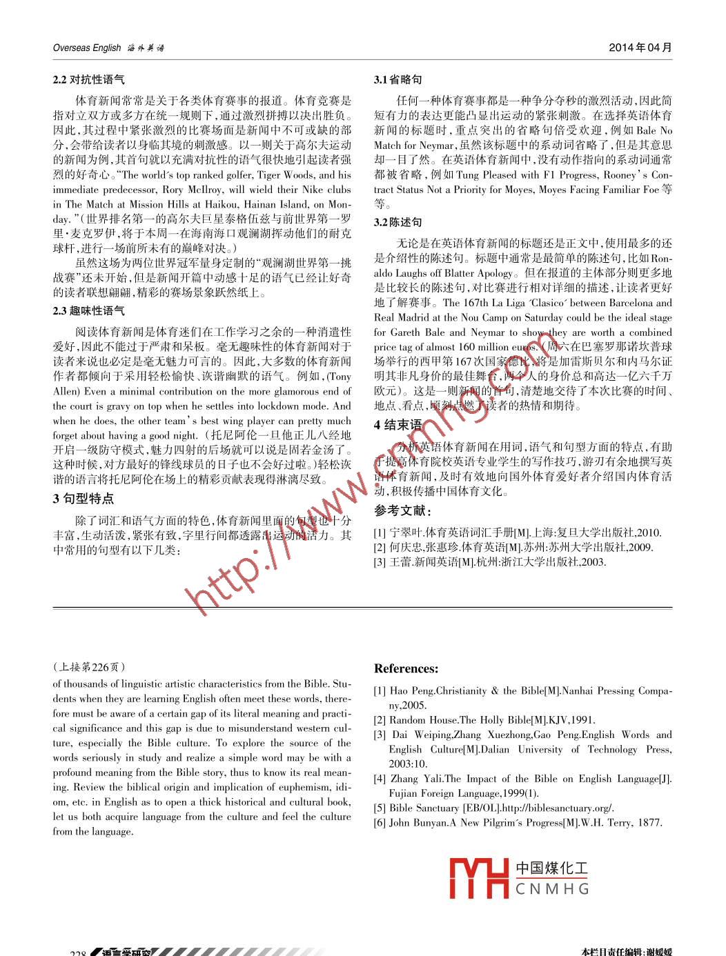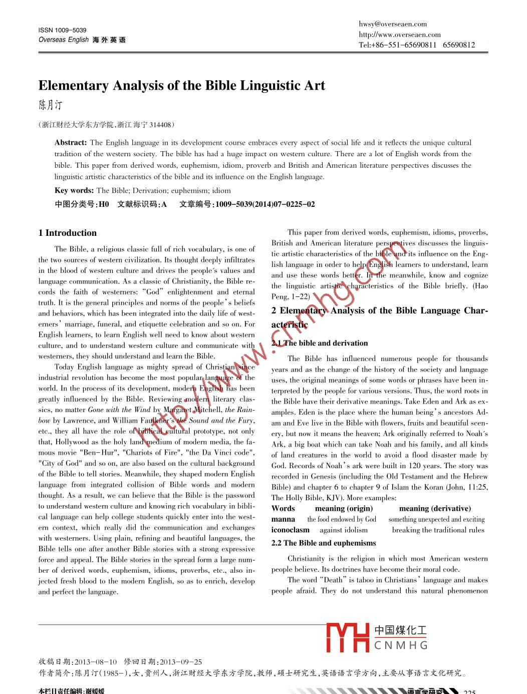 hwsy@overseaen.comISSN 1009- -5039htp://ww.overseaen.conOverseas English海外英語Tel:+86-551-65690811 65690812Elementary Analysis of the Bible Linguistic Art陳月汀(浙江財經(jīng)大學東方學院.浙江海寧314408)Abstract: The English language in its development course embraces every aspect of social life and it reflects the unique culturalculture. There are a lot of English wordbible. This paper from derived words, euphemism, idiom, proverb and British and American literature perspectives discusses thelinguistic artistic characteristics of the bible and its influence on the English language.Key words: The Bible; Derivation; euphemism; idiom中圖分類號:HO文獻標識碼:A 文 章編號:1009- -5039(2014)07-0225- -021 IntroductionThis paper from derived words, euphemism, idioms, proverbs,The Bible, a religious classic full of rich vocabulary, is one ofBritish and American literature perspectives discusses the linguis-the two sources of western civilization. Its thought deeply infiltratestic artistic characteristics of the bible and its influence on the Eng-lish language in order to help English learners to understand, learnin the blood of western culture and drives the people's values andand use these words better. In the meanwhile, know and cognizelanguage communication. As a classic of Christianity, the Bible re-the linguistic artistic characteristics of the Bible briely. (Haocords the faith of westerners: “God” enlightenment and eternalPeng, 1-22)truth. It is the general principles and norms of the people’s beliefsand behaviors, which has been integrated into the daily life of west-2 Elementary Analysis of the Bible Language Char-erners ’marriage, funeral, and etiquette celebration and so on. For acteristicEnglish learmners, to learn English well need to know about westernculture, and to undestand westem culure and communicate with 2.1 The bible and dervationwesterners, they should understand and learn the Bible.The Bible has influenced numerous people for thousandsToday English language as mighty spread of Christian since .years and as the change of the history of the society and languageindustrial revolution has become the most popular language of theuses, the original meanings of some words or phrases have been in-world. In the process of its development, modern English has beenterpreted by the people for various versions. Thus, the word roots ingreatly influenced by the Bible. Reviewing modern literary clas-the Bible have their derivative meanings. Take Eden and Ark as ex-sics, no matter Gone with the Wind by Margaret Mitchell, the Rain-amples. Eden is the place where the human being”s ancestors Ad-bow by Lawrence, and W iliam Faulkner's the Sound and the F'ury,am and Eve live in the Bible with flowers, fruits and beautiful scen-etc., they all have the role of biblical cultural prototype, not onlyery, but now it means the heaven; Ark originally referred to Noah'sthat, Hollywood as the holy land medium of modern media, the fa-Ark, a big boat which can take Noah and his family, and all kindsmous movie "Ben- Hur", "Chariots of Fire", "the Da Vinei code",of land creatures in the world to avoid a flood disaster made by"City of God" and so on, are also based on the cultural backgroundGod. Records of Noah' s ark were built in 120 years. The story wasof the Bible to tell stories. Meanwhile, they shaped modern Englishrecorded in Genesis (including the Old Testament and the Hebrewlanguage from integrated cllisionin of Bible words and modern Bible) and chapter 6 to chapter 9 of Islam the Koran (John, 11:25,thought. As a result, we can believe that the Bible is the passwordThe Holly Bible, KJV). More examples:to understand western culture and knowing rich vocabulary in bibli-Wordsmeaning (origin)meaning (derivative)cal language can help college students quickly enter into the west- mannathe food endowed by God something unexpected and excitingern context, which really did the communication and exchangesiconoclasm against idolismbreaking the traditional ruleswith westerners. Using plain, refining and beautiful languages, the2.2 The Bible and euphemismsBible tells one after another Bible stories with a strong expressiveforce and appeal. The Bible stories in the spread form a large num-Chrstianity is the religion in which most American westernber of derived words, euphemism, idioms, proverbs, etc., also in-people believe. Its doctrines have become their moral code.jected fresh blood to the moderm English, so as to enrich, developThe word“Death" is taboo in Christians' language and makesand perfect the language.people afraid. They do not understand this natural phenomenon中國煤化工TYHCNMHG收稿日期:2013-08- 10修回日期:2013-09-25作者簡介:陳月汀(1985-),女,貴州人,浙江財經(jīng)大學東方學院,教師,碩士研究生,英語語言學方向,主要從事語言文化研究。本欄目責任編輯:謝嬡嬡XU 225Overseas English海外英語2014年04月and try to avoid the unpleasantness. This has given rise to a lot ofPride goes before destruction.euphemisms related to death: “Return to dust”is from the BibleThe Sabbath was made for man. Not man for Sabbath.which implies that the human body is made of mud and should re-The lip of truth shall be established for ever; but a lyingturn to dust when they die.tongue is but for a moment. (The truth will last forever while liesIn the Old Testament God told Adam, “thou come from dust, exist for a second.)and shalt retur to dustThe Holly Bible, KJV). That means hu-man is borm evil, people should atone for their crime. Thus peo- be filled xwith mischief. (Good man won' t suffer from disasters butple’s death is also called“to pay the debt of nature" or‘ 'go the the evil one will finally be punished).way of all flesh".Man proposes, but God disposes.In the multitude of words there wants not sin; but he thatmany as you can so that you can‘ 'go to Heaven/Paradise" and “be refrains his lips is wise.