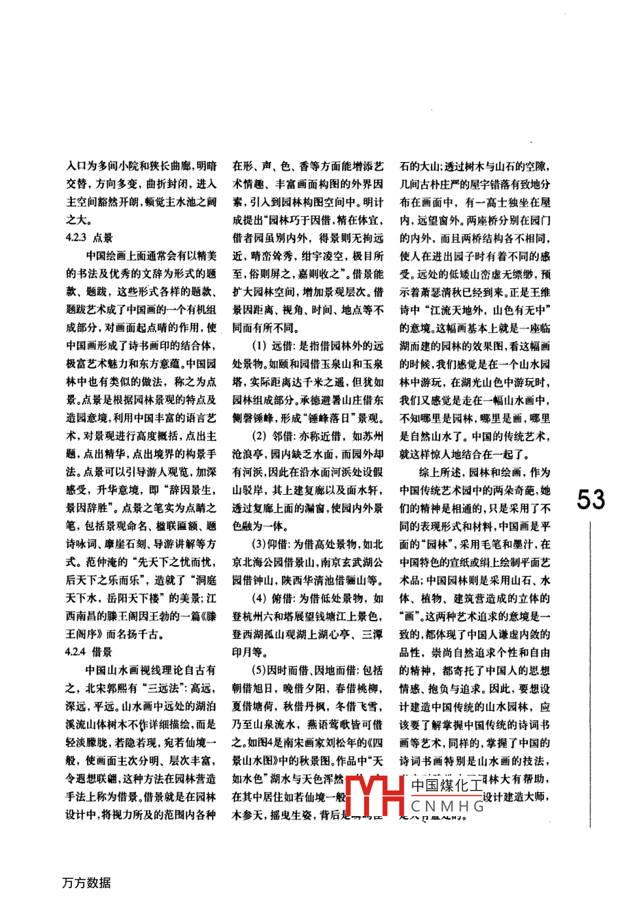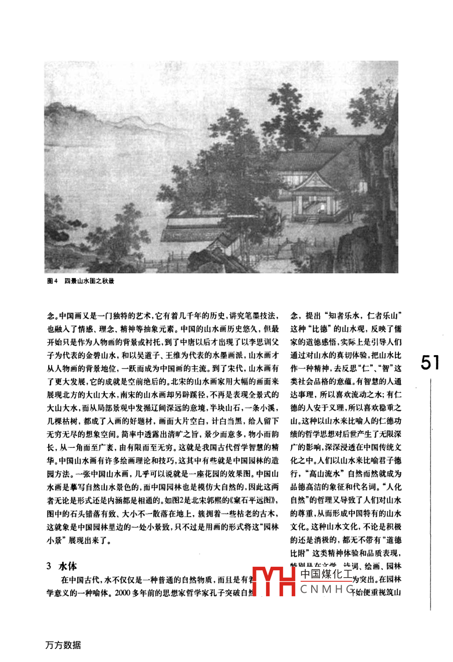 上海秋霞園中國(guó)畫(huà)與中國(guó)園林的關(guān)系張招旺1,李強(qiáng)華2,賴(lài)尚海3(1廣東省深圳市蛇口育才二中,518067;2廣東省深圳市四季青園林花卉有限公司518026;3廣東省深圳市地景園林綠化有限公司,51802949摘要:中國(guó)畫(huà)與中國(guó)園林都是中國(guó)傳統(tǒng)藝術(shù),兩者之間有著緊密的聯(lián)系。中國(guó)畫(huà)是平面的“園林”,采用毛筆和墨汁,在中國(guó)特色的宣紙或絹上繪制平面藝術(shù)品;中國(guó)園林則是釆用山石、水體、植物、建筑營(yíng)造成的立體的“畫(huà)”。這兩種藝術(shù)追求的意境是一致的,都體現(xiàn)了中國(guó)人謙虛內(nèi)斂的品性,崇尚自然追求個(gè)性和自由的精神。關(guān)鍵詞:中國(guó)畫(huà);中國(guó)園林;關(guān)系中華民族是世界上歷史最悠久著千絲萬(wàn)縷的關(guān)系。種寂寞中的自足,一種“凌寒獨(dú)自的民族之一,在悠遠(yuǎn)漫長(zhǎng)的歷史長(zhǎng)開(kāi)”的孤傲。它不屑與凡桃俗李在河中,中國(guó)人奮勇直前生生不息,1花草樹(shù)木春光中爭(zhēng)艷,而是在天寒地凍、萬(wàn)用勤勞的雙手、聰慧的大腦推動(dòng)著國(guó)人歷來(lái)愛(ài)種花,對(duì)花草樹(shù)木不禁寒風(fēng)時(shí),獨(dú)自傲然挺立,在世界文明不斷向前發(fā)展。中國(guó)人創(chuàng)木有著特殊的感情。其中花中四大雪中開(kāi)出繁花滿樹(shù),幽幽冷香,造的藝術(shù)在世界上獨(dú)樹(shù)一幟有著君子更是受到歷朝歷代文人雅士隨風(fēng)襲人。從梅花的這一品性中,獨(dú)特的東方魅力,而中國(guó)畫(huà)和中國(guó)的喜愛(ài)。了白己的哩想人格模式,園林,無(wú)疑又是東方藝術(shù)園中兩朵1.1梅中國(guó)煤化不求識(shí)賞瑰麗的奇葩。中國(guó)畫(huà)與中國(guó)園林有梅花最令人傾倒的氣厲CNMHG用“清逸”來(lái)寫(xiě)梅花的神韻,如宋代“梅妻鶴子”的林和靖那著名東坡說(shuō):“寧可食無(wú)肉,不可居無(wú)竹。無(wú)肉令人瘦,無(wú)的詩(shī)句:“疏彰橫斜水清淺,暗香浮動(dòng)月黃昏”。梅花竹令人俗。人瘦尚可肥,士俗不可醫(yī)?!睒銓?shí)直白的以清癯見(jiàn)長(zhǎng),象征隱逸淡泊,堅(jiān)貞自守。那“高標(biāo)獨(dú)語(yǔ)言,顯示出那悠久的文化精神已深入土人骨髓秀”的氣質(zhì),倜儻超拔的形象蘊(yùn)含著道德精神與人格14菊操守的價(jià)值,因而深為人們所珍視。梅梅的品格與氣歷來(lái)被視為孤標(biāo)亮節(jié)、高雅傲霜的象征,代表著節(jié)成了我們“龍的傳人”的精神寫(xiě)照和人格象征。名士的斯文與友情。菊花因其在深秋不畏秋寒開(kāi)放,1.2深受中國(guó)古代文人的喜歡,多有詩(shī)文加以贊美,如東空谷生幽蘭,蘭最令人傾倒之處是“幽”,因其生晉大詩(shī)人陶淵明著有“采菊東籬下,悠然見(jiàn)南山”的長(zhǎng)在深山野谷,才能洗凈那種綺麗香澤的姿態(tài),以清名句。如果說(shuō),冬梅斗霜冒雪,是一種烈士不屈不撓婉素淡的香氣長(zhǎng)葆本性之美。這種不以無(wú)人而不芳的的人格,春蘭空谷自適,是一種高士遺世獨(dú)立的情懷幽”,不只是屬于林泉隱士的氣質(zhì),更是一種文化通那么,秋菊兼有烈士與高士的兩種品格。性,一種“人不知而不慍”的君子風(fēng)格,一種不求仕對(duì)梅蘭竹菊詩(shī)一般的感受,是以深厚的民族文化途通達(dá)、不沾名釣譽(yù)、只追求胸中志向的坦蕩胸襟,精神為背景的。梅蘭竹菊,占盡春夏秋冬,中國(guó)文人象征著疏遠(yuǎn)污濁政治、保全自己美好人格的品質(zhì)。以其為“四君子”,正表現(xiàn)了文人對(duì)時(shí)間秩序和生命13竹意義的感悟。梅高潔傲岸,蘭幽雅空靈,竹虛心有節(jié),在清風(fēng)中簌簌的聲音,在夜月下疏朗的影子,都菊冷艷清貞。中國(guó)人在一花一草、一石一木中寄托了讓詩(shī)人深深感動(dòng),而竹于風(fēng)霜凌厲中蒼翠儼然的品自己的一片真情,從而使花木草石脫離或拓展了原有50格更讓詩(shī)人引為同道,圖面中國(guó)文的屠室宅中的意,而成為人格燃袍的象征和險(xiǎn)喻大凡生命華為永恒無(wú)限之美。梅蘭竹菊成為中國(guó)人感物喻志的象征、詠物詩(shī)和文人畫(huà)中最常見(jiàn)的題材,正是根源于對(duì)這種審美人格境界的神往除了花中“四君子”,對(duì)于許多優(yōu)美的花草樹(shù)木國(guó)人也十分喜歡,如松樹(shù)、芭蕉、楊柳等。中國(guó)畫(huà)中的這些花草樹(shù)木,無(wú)一不是中國(guó)園林中布景的好素材。在粉墻黛瓦邊種上幾棵秀竹,在皎潔的月光下,白墻上黑色的竹影,仿佛一幅中國(guó)墨竹迎風(fēng)搖曳,瀟灑臨空;在石階邊,假山旁,布上幾叢幽蘭,清香遠(yuǎn)送,高雅秀麗;“雨打芭蕉”是一種美麗的景致,充滿音樂(lè)的節(jié)奏與韻律;回廊、院落、景圖2窠石平遠(yuǎn)圖墻后種些梅花、松樹(shù),總能使整個(gè)園林充滿東方韻味如圖1是建于明代的上海秋霞園,園中竹影婆娑,粉墻黛瓦,是典型的淡雅清幽的東方園林。2山石山石是中國(guó)園林中很重要的造景材料,只有用石頭才能營(yíng)造出山川石徑等大自然的景觀。而在中國(guó)畫(huà)中,以大自然山林景色為題材的山水畫(huà),對(duì)中國(guó)人來(lái)說(shuō)有著中國(guó)煤化工與西方的風(fēng)景畫(huà)之CNMHG則重于自然風(fēng)光圖3四景山水圖之冬景的描繪八心日中卻是家國(guó