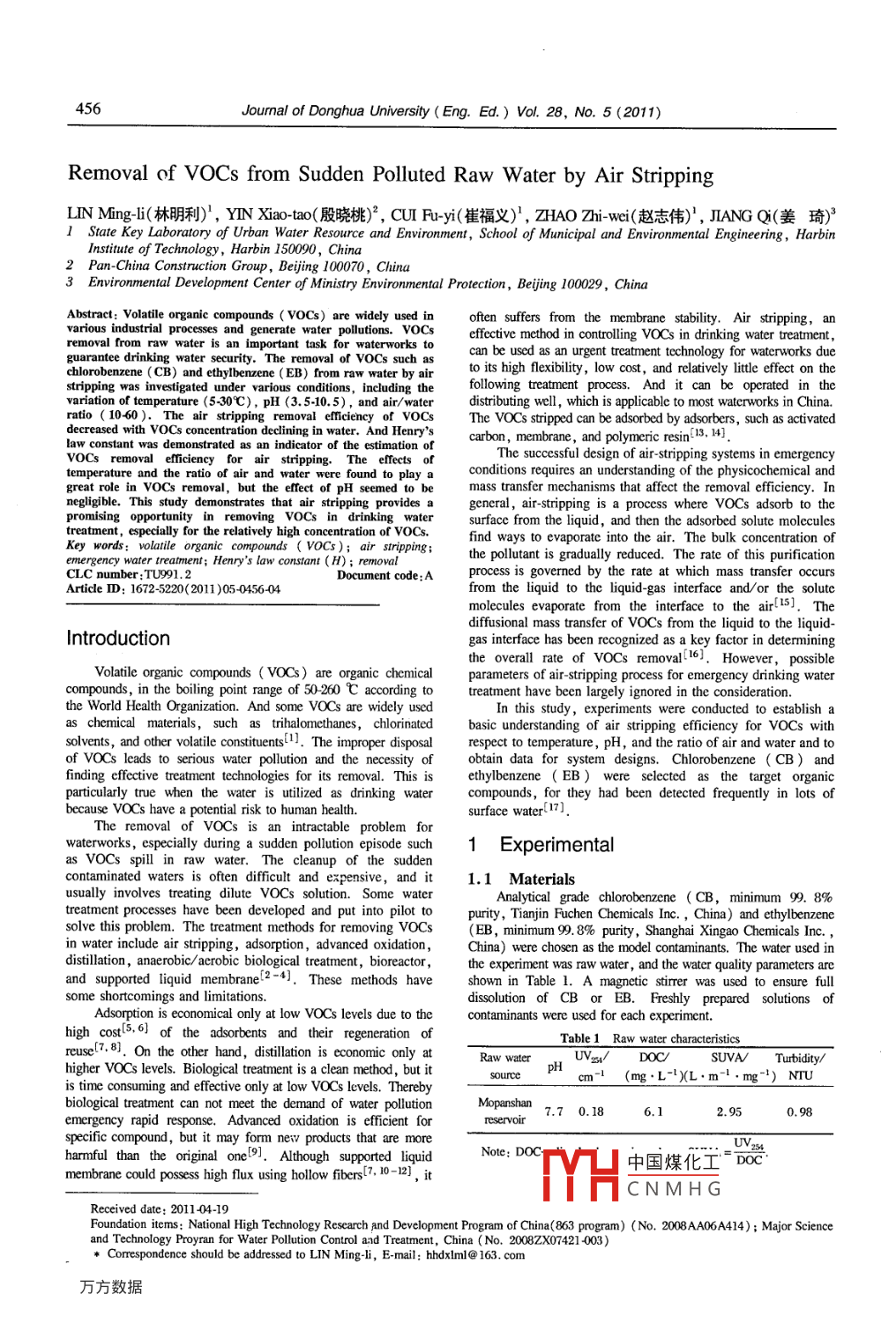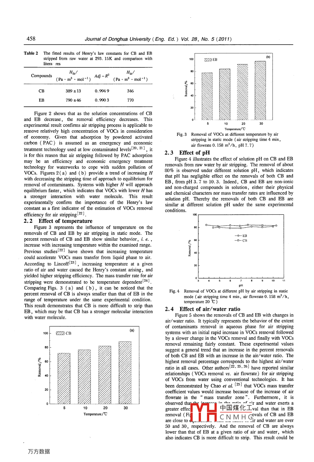 456Jourma/ of Donghua University(Eng. Ed.) Vol. 28, No. 5 (2011)Removal of VOCs from Sudden Polluted Raw Water by Air StrippingLIN Ming li(林明利)',YIN Xiao-tao(殷曉桃)*, CUI Fu-yi(崔福義)' , ZHAO Zhi-wei(趙志偉) , JIANGQi(姜琦)State Key Laboratory of Urban Water Resource and Environment, School of Municipal and Environmental Engineering, Harbin .Institute of Technology, Harbin 150090, China2 Pan-China Construction Group, Beijing 100070, China3 Environmental Development Center of Ministry Environmental Protection, Bejing 100029, ChinaAbstract: Volatile organic compounds ( VoCs) are widely used inoften suffers from the membrane stability. Air stipping, anvarious industrial processes and generate water pollutions. VOCsefctive method in ontrolling VOCs in drinking water treatment,removal from raw water is an important task for waterworks tocan be used as an urgent treatment technology for waterworks dueguarantee drinking water security. The removal of VOCs such aschlorobenzene (CB) and ethylbenzene (EB) from raw water by airto its high flexibility, low cost,and relatively little effect on thestripping was investigated under various conditions ,including thefollowing treatment process. And it can be operated in thevariation of temperature (5-30C), pH (3. 5-10.5), and air/ waterditributing well, which is applicable to most waterworks in China.ratio ( 10-60). The air stripping removal efficiency of VOCsThe VOCs stipped can be adsorbed by adsorbers, such as activateddecreased with VOCs concentration delining in water. And Henry'scarbon, membrane , and polymeric resin[13, 14] .law constant was demonstrated as an indicator of the estimation ofVOCs removal eficiency for air stripping. The efects ofThe successful design of air stripping systems in emergencytemperature and the ratio of air and water were found to play aconditions requires an understanding of the physicochemical andgreat role in VOCs removal, but the effect of pH seemed to bemass transfer mechanisms that affect the removal efficiency. Innegligible. This study demonstrates that air stripping provides agencral, ar-stripping is a process where VOCs adsorb to thepromising opportunity in removing VOCs in drinking watersurfacc from the liquid, and then the adsorbed solute moleculestreatment, especially for the relatively high concentration of VOCs.find ways to evaporate into the air. The bulk concentration ofKey words: volaile organic compounds' ( VoCs); air sripping ;emergency water treatment; Henry's law constant ( H) ; removalthe pollutant is gradually reduced. The rate of this purificationCLC number:TU991.2Document code:Aprocess is governed by the rate at which mass transfer occursArticle ID: 1672-5220( 2011 )05-0456-04from the liquid to the liquid-gas interface and/or the solutemolecules evaporate from the interface to the air[1s]. Thediffusional mass transfer of VOCs from the liquid to the liquid-Introductiongas interface has been recognized as a key factor in determiningthe overall rate of VOCs removal[16]. However, possibleVolatile organic compounds ( VoCs ) are organic chemicalparameters of air-stripping process for emergency drinking watercompounds, in the boiling point range of 50 260 C according totreatment have been largely ignored in the consideration.the World Health Organization. And some VOCs are widely usedIn this study, experiments were conducted to establish a; chemical materials, such as trihalomethanes, chlorinatedbasic understanding of air stripping efciency for VOCs withsolvents, and other volatile constituents'11. The improper disposalrespect to temperature, pH, and the ratio of air and water and toof VOCs leads to serious water pollution and the necessity ofobtain data for system designs. Chlorobenzene ( CB ) andfinding effective treatment technologies for its removal. This isethylbenzene ( EB) were selected as the target organicparticularly true when the water is utilized as drinking watercompounds, for they had been detected frequently in lots ofbecause VOCs have a potential risk to human health.surface water(17].The removal of VOCs is an intractable problem forwaterworks, especially during a sudden pollution episode suc1 Experimental; VOCs spill in raw water. The cleanup of the suddencontaminated waters is often difficult and expensive, and it1.1 Materialsusually involves treating dilute VOCs solution. Some waterAnalytical grade chlorobenzene ( CB,minimum 99. 8%treatment processes have been developed and put into pilot topurity, Tianjin Fuchen Chemicals Inc. ,China) and ethylbenzenesolve this problem. The treatment methods for removing VOCs( EB , minimum 99. 8% purity, Shanghai Xingao Chemicals Inc. ,in water include air stripping, adsorption, advanced oxidation,China) were chosen as the model contaminants. The water used inditillation , anaerobic/ acrobic biological treatment, bioreactor,the experiment was raw water, and the water quality parameters areand supported liquid membranel2 -4These methods haveshown in Table 1. A magnetic strrer was used to ensure fullsome shortcomings and limitations.dissolution of CB or EB. Freshly prepared solutions oAdsorption is economical only at low VOCs levels due to thecontaminants were used for each experiment.high cost[5,6] of the adsorbents and their regeneration ofTable1_ Raw water characteristicsreusel7.8l. On the other hand, dillation is economic only ;Raw waterUVss/ DOCSUVAvTurbidity/higher VOCs levelsBiological treatment is a clean method, but itcm-1(mg:L-')(L.m-1.mg~) NTUis time consuming and effective only at low VOCs levels. Therebybiological treatment can not meet the demand of water pollutionMopanshan7.7 0.186.12.950.98emergency rapid response. Advanced oxidation is efficient forreservoirspecific compound, but it may form new products that are moreharmful than the original one[9]. Although supported liquidNote: DOC中國(guó)煤化工”DOCmembrane could possess high flux using hollow fibers[7,10-12], it .TYHCNMHGReceived date: 2011-04-19Foundatio