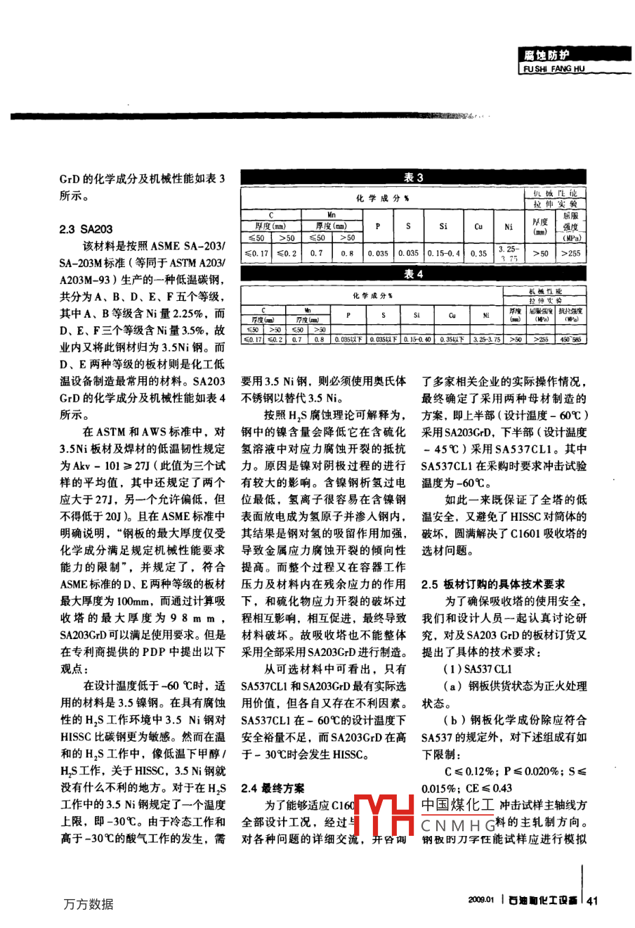 腐蝕防護NG HUC1601低溫甲醇洗吸收塔的材料選擇馬洪光孫緒軍侯欽利(兗州煤業(yè)榆林能化有限公司陜西榆林719000)【摘要】本文簡要介紹了甲醇生產(chǎn)工藝中關(guān)鍵設備甲醇吸收塔的結(jié)構(gòu)特點和該設備在甲醇生產(chǎn)中的作用,重點介紹了如何進行吸收塔的材料選擇,對吸收塔板材的選用作了詳細的對比?!娟P(guān)鍵詞】吸收塔材料選用低溫材料1吸收塔在工藝流程中的作高,再生熱耗少,操作費用低,能用和結(jié)構(gòu)特點綜合脫除氣體中的H2S、COS、CO2溶液不起泡、不腐蝕,H,S濃縮簡工藝氣體凈化是甲醇生產(chǎn)過單等優(yōu)點,屬于先進的凈化技術(shù)程中的重要環(huán)節(jié),目前國內(nèi)甲醇目前被大型甲醇廠普遍采用。生產(chǎn)所采用的主要凈化工藝主要吸收塔作為低溫甲醇洗系統(tǒng)的關(guān)鍵核心設備,承擔著脫除工有低溫甲醇洗法( Rectisol)、聚乙二藝氣體中HS、CO2的任務,結(jié)構(gòu)圖醇二甲醚法( Selexol法、NHD法)MEDA法、栲膠法V法)、惠醌二見圖1。段I、Ⅱ、Ⅲ為CO2吸收磺酸鈉法(ADA法)等。低溫甲醇牲段,段Ⅳ、Ⅴ為HS吸收段。法使用冷甲醇作為酸性氣體吸收液利用甲醇在-60℃左右的低溫2材料選擇下對酸性氣體溶解度極大的物理特性,同時分段選擇性地吸收原吸收塔設備數(shù)據(jù)表如下表1所料氣中的H2S、CO2及各種有機碗示。從表1可以看出,吸收塔的操等雜質(zhì)。該法具有溶劑吸收能力作壓力高、操作溫度低,工作介質(zhì)大,溶液循環(huán)量小,氣體凈化度復雜、均為易燃易爆,中度危害介質(zhì)。因此該設備的材料選擇是合適將直接影響到設備的安全運行。在目前中國煤化工低溫容器作者簡介制造材料主要有國標牌號中國煤化工NDR,AME牌號的馬洪光(1976一)工程師,主要從事化工設備管理工以及SS304等奧氏體CNMH可供選擇,除了200901百油畫化工迎高39{蝕防護表鋼板在-70℃的溫度下可證Akv≥設備總高■同時,根據(jù)GB150-98第1號修塔體分段改單,“09 MnNiDR厚度上限由60mm塔體段數(shù)段I+II段段IV分段定義C02洗C2冷洗段脫硫段改為100mm(鋼板)預洗段從以上各方面來看,O9 MnNiDR介質(zhì)富甲醇,凈化氣富甲醇凈化氣富S甲醇,變換氣富憶S甲變換氣是可以滿足C601吸收塔的選材要分段高度m求的,但是,設計方考慮到該材質(zhì)內(nèi)徑m在-60℃的工作環(huán)境下,已經(jīng)接近操作溫度(最低,362857141.0061863.636821其理論的極限低溫-70℃,安全裕最畫.)·C4.014285714量不足,且業(yè)主對國產(chǎn)09 MnNiDR操作壓力(最厚板的質(zhì)量抱有少量顧慮,所以低/最高)5.63/5.645.65/556/570570/57最終并未以09 MnNiDR作為c601MPa(g吸收塔的主體承壓材料。設計溫度(最低最高)℃0.3750.37522SA537腐蝕成分HCN,H2S, C02, HCN,該材料是一種壓力容器用并NH3, COS經(jīng)過熱處理的碳錳硅鋼板,分為氫蝕壓力Pa(a)3.80年-39·c3.051在-21·c2.506在-16·c2.523在-14·cCl、C2、CB3三個等級,已經(jīng)在化表2工行業(yè)得到了廣泛的應用,Cl1的化學成分(%)沖擊試驗熱處理狀態(tài)為正火,Cl2、Cl3的熱標準鋼號S板厚溫度A處理狀態(tài)為淬火+回火。在低溫容器行業(yè)中,Cll、C2應用的最為廣GB3531-19960 MnNiDr≤0.025≤0.0206~60≥27泛,而其中又以SA537C12居多。GB3531-1996第1號修改單0 MnNIDR≤0.020≤0.0156-60低溫甲醇洗技術(shù)的專利商為≥27業(yè)主提供的PDP中C601吸收塔的Q/WG(ZB)05KGD4≤0.020≤0.010≤60≥31主材就推薦選用SA537Cl1。根據(jù)ASME標準,SA537在厚度64mm<8l6MnDR因使用溫度限制(30mm以GB3531-1996《低溫壓力容器用低≤75mm時,工作溫度可達到-60℃,上時僅能使用到-30℃)外,其余合金鋼鋼板》及第1號修改單的差在厚度75mm<6≤100mm時,工作材料在適當狀態(tài)下均可以作為本別中,同時對比國外標準,我們已溫度可達到-46℃,如果高沖擊功設備的承壓主材。經(jīng)可以看到,目前國產(chǎn)09 MnNiDr值,可用到-68℃。的主要性能指標已經(jīng)優(yōu)于國外同業(yè)主及設計方均認為該材料2.1 09MnNiDR類鋼號(表2)。同時,在容標委的在C1601吸收塔的使用環(huán)境下低溫0 9Mn NiDR鋼板已經(jīng)是我國于建議下,武漢鋼鐵公司、舞陽鋼鐵安全裕量不足,且如果單獨定制1991年自行研制成功的-70℃級的公司、重慶鋼鐵公司等鋼板生產(chǎn)高沖擊功值的鋼板,國產(chǎn)成品率低溫壓力容器用鋼板,目前在國廠均制訂了技術(shù)指標優(yōu)于GB講囗刷相對成本相對過高,故內(nèi)得到了廣泛使用,性能優(yōu)良。經(jīng)標準的企業(yè)標準。以09MnN中國煤化工議的整個塔體過多年的生產(chǎn)應用及改進,在板為例,在武鋼的企業(yè)標準CNMH方案。SA203丹要設酯2a001腐蝕防護LRUSHIFANG地GrD的化學成分及機械性能如表3所示?;瘜W成分%U飯性能拉仲實23SA203厚度(m)■厚度(m)Ps≤50>50≤50>50該材料是按照 ASME SA20/kn≤0.7|。.0.0350050.150.40.35325-|>5sA-203M標準(等同于 ASTM A203A203M-93)生產(chǎn)的一種低溫碳鋼,共分為A、B、D、E、F五個等級,化學成分其中A、B等級含N量225%,而P度(mD、E、F三個等級含N量35%,故[>6業(yè)內(nèi)又將此鋼材歸為35N鋼。而0s20708005以下00以下0403以下3235>0>5450D、E兩種等級的板材則是化工低溫設備制造最常用的材料。SA203要用35N鋼,則必須使用奧氏體了多家相關(guān)企業(yè)的實際操作情況GrD的化學成分及機械性能如表4不銹鋼以替代35Ni。最終確定了采用兩種母材制造的所示按照H2S腐蝕理論可解釋為,方案,即上半部(設計溫度-60℃)在ASTM和AWS