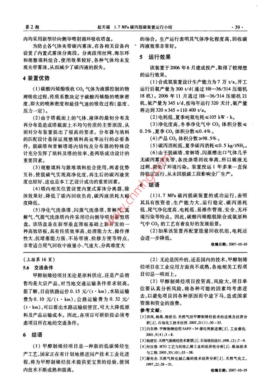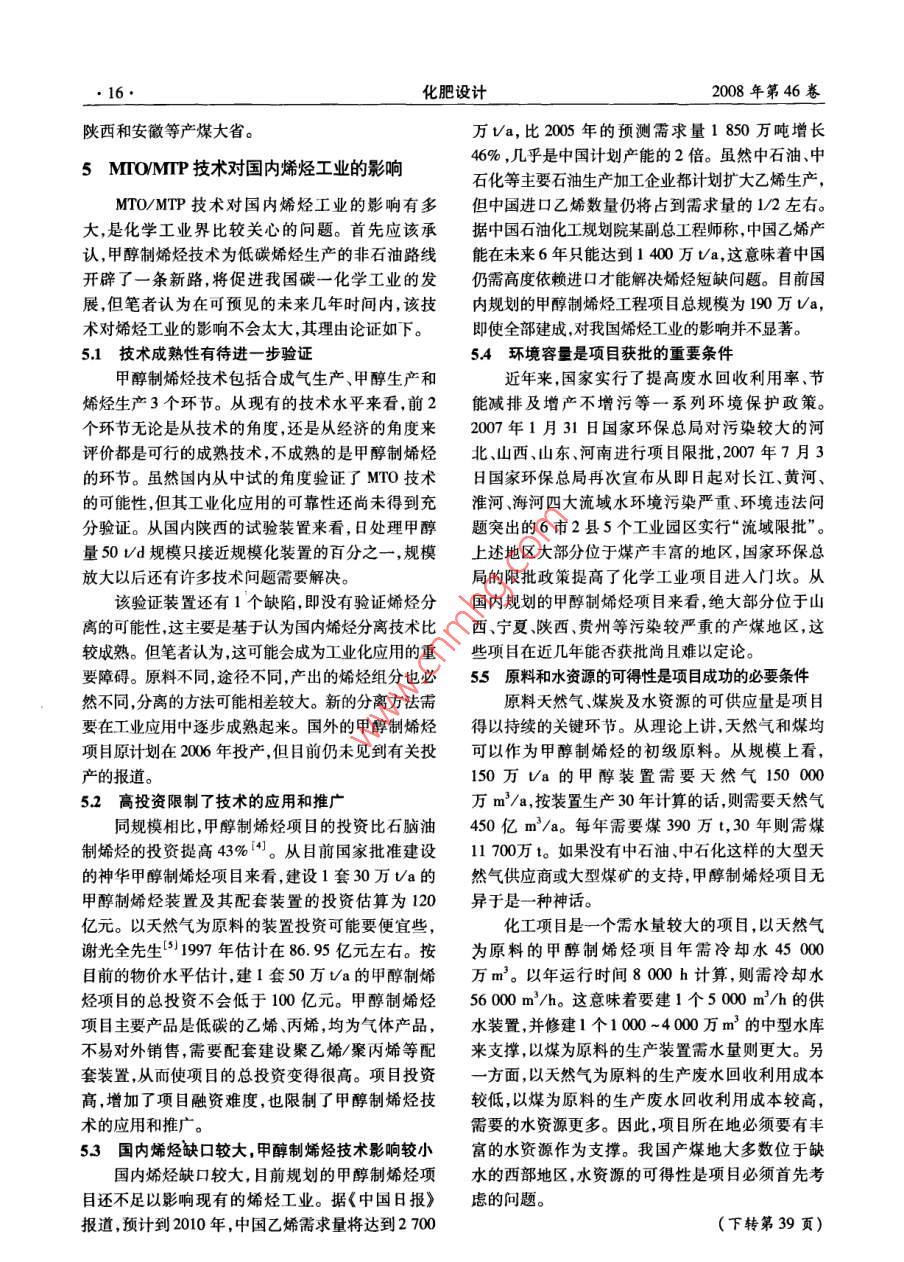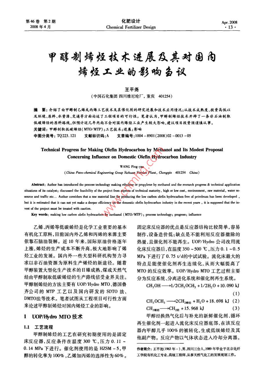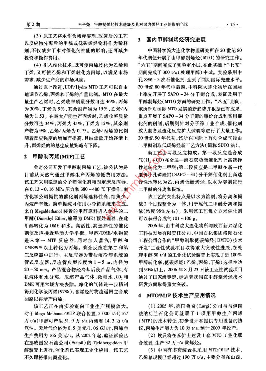 第46卷第2期化肥設(shè)計(jì)Apr. 20082008年4月Chemical Fertilizer Design●13●甲醇制烯烴技術(shù)進(jìn)展及其對(duì)國(guó)內(nèi)烯烴工業(yè)的影響芻議王平堯(中國(guó)石化集團(tuán)四川維尼綸廠,重慶401254)摘要:介紹了 由甲醇制乙烯或丙烯工藝技術(shù)及其催化劑的研究進(jìn)展和技術(shù)應(yīng)用情況;從技術(shù)成熟度、投資高低以及環(huán)境、原料、水資源、交通等方面論述了工程項(xiàng)目的可行性。筆者認(rèn)為,甲醇制烯烴技術(shù)開(kāi)辟了一條非石油制取低碳烯烴的原料路線,但預(yù)計(jì)近幾年內(nèi)尚不會(huì)對(duì)國(guó)內(nèi)烯烴工業(yè)產(chǎn)生較大影響,建議項(xiàng)目投資須謹(jǐn)慎從事。關(guān)鍵詞:甲醇制取低碳烯烴( MTO/MTP);工藝技術(shù);進(jìn)展;影響中國(guó)分類號(hào): TQ223. 121文獻(xiàn)標(biāo)識(shí)碼:A文章編號(hào):1004 - 8901(2008)02 -0013 -05Technical Progress for Making Olefin Hydrocarbon by Methanol and Its Modest ProposalConcerning Infuence on Domestic Olefin Hydrocarbon IndustryWANG Ping-yao .( China Petro-chemical Enginering Group Sichuan Vinylon Plant, Chongqin 401254 China)Abstract: Author has introduced the process technology making ethylene or propylene by methanol and the reserch progress & tchnical applieationsituations of it catalyst; discussed the feasibility of the project from aspects of technical maturity, high or low coet, environment, row material, water吧source and taffe etc. . Author considers that a raw materil line for producing the low carbon olefn hydrocarbon free of petroleum has been developed,but it is estimated that it can not yet make a deeper efciency on the domestic olefin hydrocarbon industry in the recent years,it is supposed that the in-vet of the project must be treated with caution.Key words: making low carbon olefn hydroearbon by methanol (MTO/MTP); process tchnology; proree; influence乙烯、丙烯等低碳烯烴是化學(xué)工業(yè)重要的基本固定床反應(yīng)器的優(yōu)點(diǎn)是反應(yīng)器結(jié)構(gòu)比較簡(jiǎn)單,容易有機(jī)化工原料,目前國(guó)內(nèi)外乙烯和丙烯的來(lái)源主要制作,設(shè)備造價(jià)低;缺點(diǎn)是不能利用反應(yīng)器撤除的依靠石腦油裂解。近10年來(lái),國(guó)際原油價(jià)格逐年熱量,且催化劑不能再生。UOP/Hydro 公司改用流上漲,烯烴的生產(chǎn)成本不斷升高,極大地影響了烯化床反應(yīng)器后,在溫度350 ~500 C ,壓力0.1 ~0.5烴工業(yè)的發(fā)展。國(guó)內(nèi)外一些大型科研機(jī)構(gòu)努力尋MPa下進(jìn)行了0. 75 Vd的中試試驗(yàn)。流化床最大的求以非石油資源為原料生產(chǎn)烯烴的新途徑。隨著特點(diǎn)是能使催化劑再生連續(xù)化,從而大幅提高了甲醇裝置大型化生產(chǎn)技術(shù)的日臻成熟,煤或天然氣MTO的反應(yīng)效率。U0P/Hydro MTO工藝過(guò)程主要經(jīng)由甲醇制取低碳烯烴的生產(chǎn)路線倍受業(yè)界關(guān)注。分為反應(yīng)系統(tǒng)、分離進(jìn)化系統(tǒng)和催化劑再生系統(tǒng)。甲醇制烯烴的方法主要有UOP/Hydro MTO .德國(guó)魯CH,OH一→l/2CH3OCH, + 1/2H20 + 10.090 kJ齊公司的MTP工藝以及國(guó)內(nèi)研發(fā)的SDTO法、(1)DMTO法等技術(shù)。筆者試圖從工程項(xiàng)目可行性方面CH,OCH,一→+2CH2烴+H20 +18.698 kJ (2)來(lái)論述甲醇制烯烴對(duì)國(guó)內(nèi)烯烴工業(yè)的影響。CH燒一→CH2橋 +15. 968 kJ(3)1 UOP/Hydro MTO技術(shù)甲醇經(jīng)換熱氣化后與補(bǔ)充的新鮮催化劑、循環(huán)再生催化劑- -起進(jìn) 人流化床反應(yīng)器底部,在該反應(yīng)1.1工藝流程甲醇制烯烴的工藝在研究初期使用的是固定器內(nèi)甲醇幾乎100%的被轉(zhuǎn)化,生成低級(jí)烯烴及其床反應(yīng)器,反應(yīng)條件在溫度300 C,壓力0.11 ~他副產(chǎn)物。反應(yīng)產(chǎn)物以氣體狀態(tài)進(jìn)人拎卻分離器。0.14 MPa下進(jìn)行。催化劑使用的是HZSM -5,甲作者簡(jiǎn)介:王平堯(1963年- ),男,四川三臺(tái)人,1989年畢業(yè)于北京化纖醇的轉(zhuǎn)化率為100% ,乙烯加丙烯的選擇性為60%。工學(xué)院有機(jī)化工專業(yè),高級(jí)I程師,從事天然氣化工的發(fā)展規(guī)劃工作?;试O(shè)計(jì)2008年第46卷反應(yīng)熱由反應(yīng)生成的水以蒸汽形式帶走一部分,其其合成方法是按通常的水熱法直接合成。理余的熱量由設(shè)置在反應(yīng)器內(nèi)部的冷卻盤管移出。想的硅源、鋁源和磷源分別為硅溶膠、水鋁石及正催化劑再生器與反應(yīng)器-起構(gòu)成-一個(gè)完整的MTO磷酸。常用的模板劑為四乙基氫氧化銨(TEAOH)。反應(yīng)系統(tǒng),使催化劑及時(shí)再生循環(huán)使用,反應(yīng)系統(tǒng)按照關(guān)系式(0.5~ 10)R: (0. 05 ~ 10)Si02:(0.2~得以連續(xù)運(yùn)行。失活的廢催化劑進(jìn)人再生器后,加3)AI20; (0.2 ~3)P20; (20 ~ 200)H20(R為模板人空氣進(jìn)行鍛燒,以除去催化劑上的積碳,恢復(fù)活劑)確定原料組成。在攪拌的同時(shí),將原料按一定性后又回到反應(yīng)器內(nèi)。催化劑表面的積碳在再生順序混合,充分?jǐn)嚢璩赡z,裝人不銹鋼高壓釜中,器內(nèi)燃燒放出的熱量經(jīng)回收后供其他單元使用。封閉加熱到150~250C,在自身壓力下進(jìn)行恒溫晶反應(yīng)生成物(氣體)在冷卻分離器中經(jīng)回收熱化反應(yīng),待晶化完成后,將固體產(chǎn)物過(guò)濾或離心分量后被冷卻,水及部分重組分被冷凝分離出來(lái),氣離,水洗干燥即得SAP0 -34分子篩原粉(2]。相