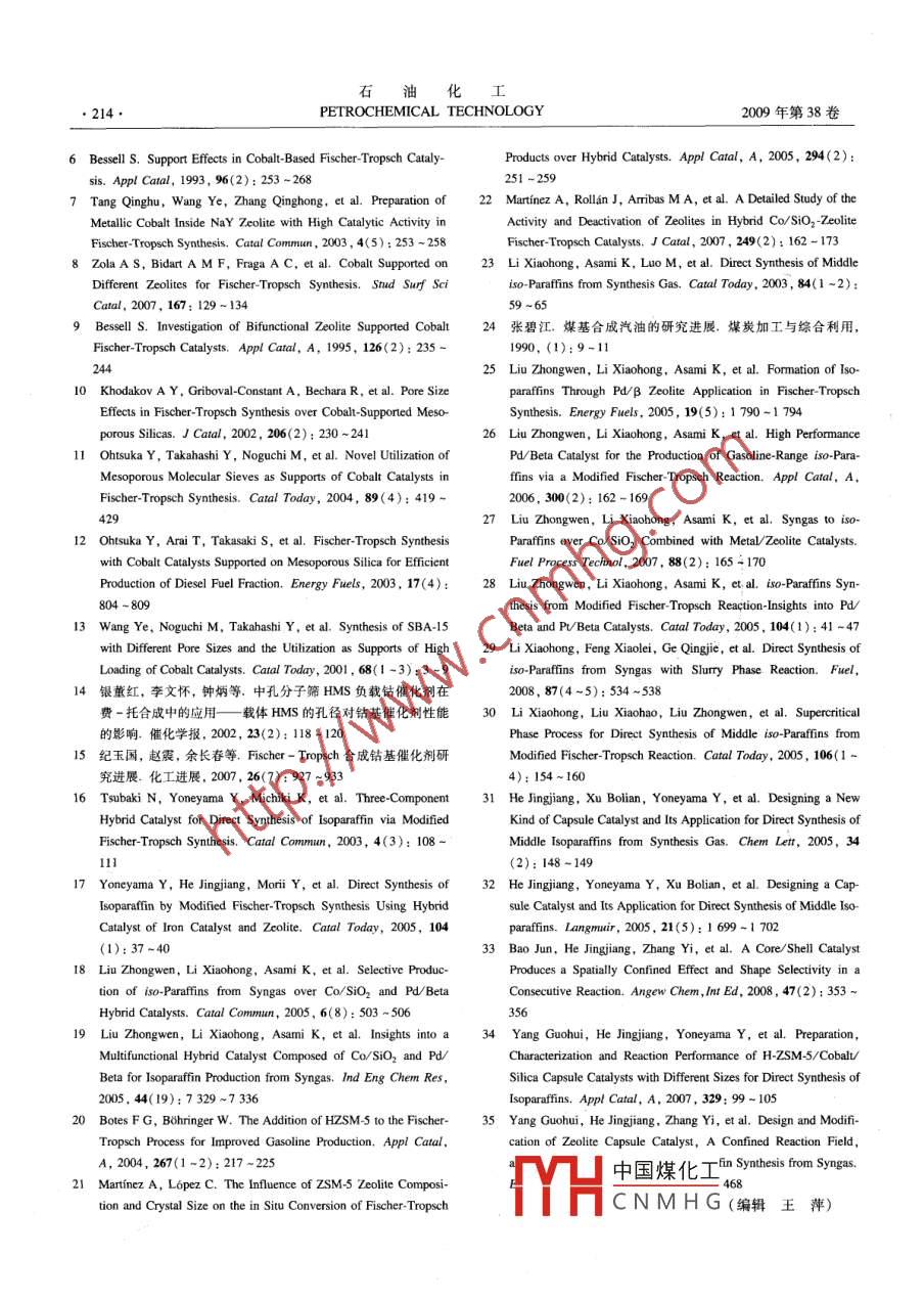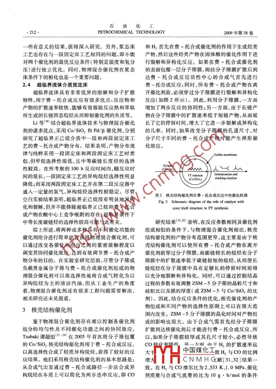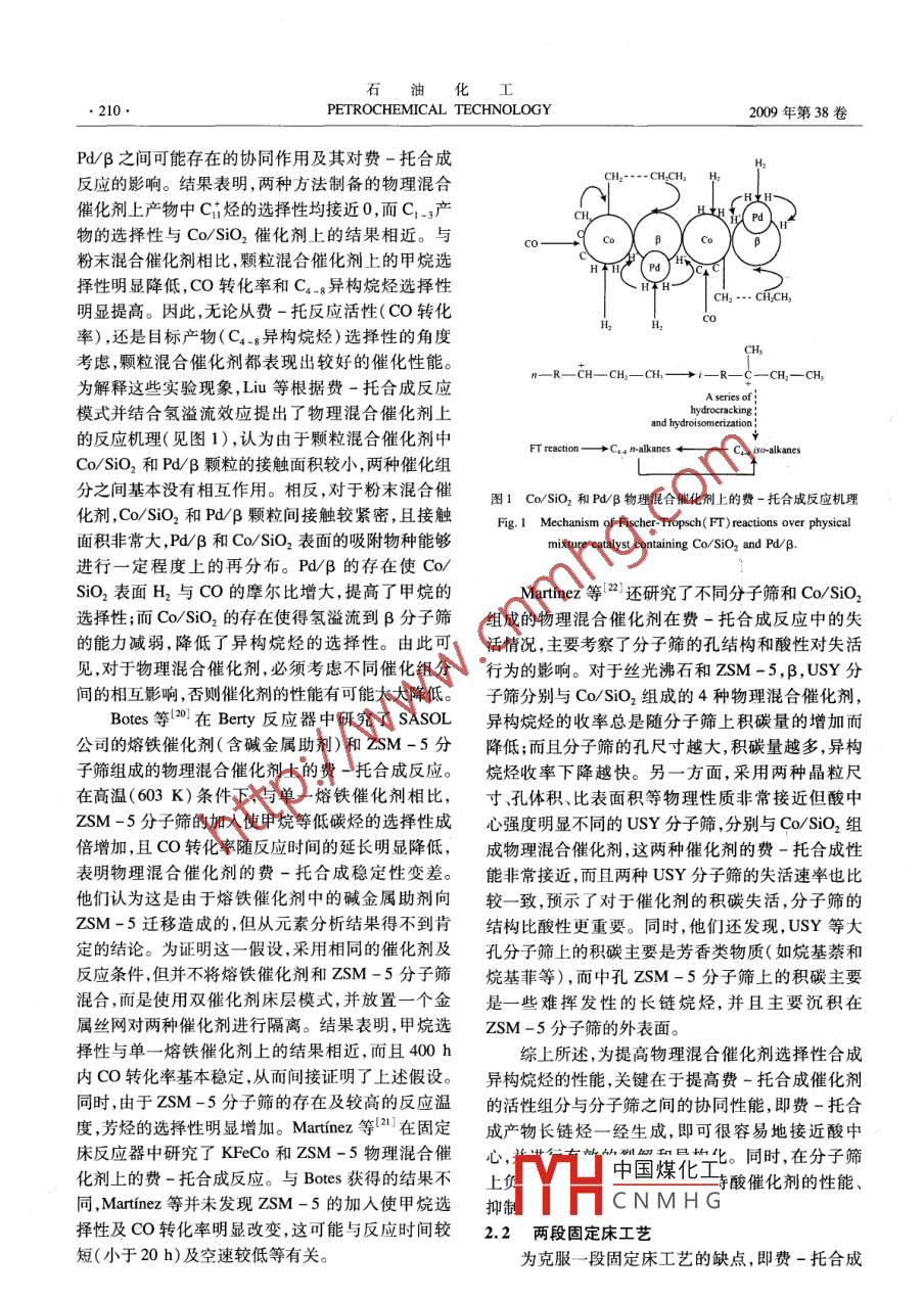 石油化工2009年第38卷第2期PETROCHEMICAL TECHNOLOGY進(jìn)展與述評合成氣一步法合成清潔汽油的研究進(jìn)展郝青青12,胥娜2,劉昭鐵2,呂劍!,劉忠文121.應(yīng)用表面與膠體化學(xué)教育部重點(diǎn)實(shí)驗(yàn)室,陜西西安710062;2.陜西師范大學(xué)化學(xué)與材料科學(xué)學(xué)院陜西西安710062[摘要]綜述了以合成氣為原料經(jīng)費(fèi)-托合成一步法生產(chǎn)以異構(gòu)烷烴為主的清潔汽油工藝的研究進(jìn)展。介紹了不同工藝條件下負(fù)載型、物理混合型及核殼結(jié)構(gòu)型雙功能催化劑上費(fèi)-托合成產(chǎn)物的分布規(guī)律,特別是汽油餾分中異構(gòu)烷烴的選擇性。分析了各類催化劑及相關(guān)工藝存在的問題,并指出如何提高費(fèi)-托合成催化劑與分子篩或負(fù)載貴金屬分子篩的復(fù)合效果,從而增強(qiáng)不同功能催化劑組分間的協(xié)同作用,以降低甲烷等低碳烴的選擇性是進(jìn)一步研究的主要方向。[關(guān)鍵詞]費(fèi)-托合成;合成氣;異構(gòu)烷烴;清潔汽油;雙功能催化劑[文章編號]1000-81442009)02-0207-08中圖分類號]TQ5292文獻(xiàn)標(biāo)識(shí)碼]ARecent Advances in One-Step Synthesis of Clean Gasoline from SyngasHao Qingqing., Xu Na"2, Liu Zhaotie Lii Jian, Liu Zhongwen"2(I. Key Laboratory of Applied Surface and Colloid Chemistry, Ministry of Education, Xi an Shaanxi 710062, China;2. School of Chemistry Material Science, Shaanxi Normal University, Xi an Shaanxi 710062, China)Abstract Fischer-Tropsch( FT )synthesis is an effective process to produce liquid fuels and highvalue added fine chemicals from syngas originated from coal, natural gas and biomass. Due to thelimitation of Anderson-Schulz-Flory distribution, FT products are very complicated hydrocarbonsmixture. To date, it is commonly believed that a second catalytic function besides the FT active centeris essential for selective synthesis of desired products by FT synthesis. Since branched alkanes areenvironmentally more acceptable in boosting the octane number of gasoline, the up-to-date advancesfor one-step synthesis of clean gasoline (mainly iso-paraffins from syngas over bifunctional catalystvia Fr synthesis are reviewed. Under different reaction procproduct distributions, especiallyselectivity to iso-paraffins in gasoline cut, over bifunctional catalysts including supported form,physical mixture and core/shell type are comparatively introduced in detail. Applicatioencapsulated catalyst of zeolite membrane in this reaction is highlighted. Finally, the problems to besolved in future, and development trends for further works, e. g., how to prepare bifunctional catalystto strengthen the synergetic effect between different catalytic functions, are statedI Keywords] Fischer-Tropsch synthesis; syngas; isoparaffin; clean gasoline; bifunctional catalyst作為高效、清潔利用煤炭、天然氣和生物質(zhì)資的研究,形成了較為一致的觀點(diǎn),即如果不引入新源的重要途徑,由合成氣(H2+CO)生產(chǎn)液體燃料的催化功能,而僅僅對費(fèi)-托合成催化劑的活性組和化學(xué)品的費(fèi)一托合成技術(shù),無論從能源還是環(huán)境此,人們對費(fèi)一托合成技術(shù)進(jìn)行了大量的研究開發(fā)2的角度,對社會(huì)的可持續(xù)發(fā)展都具有重要意義。因收稿修改蘊(yùn)日加12008-11-04。中國煤化工順平縣人,碩土生,電話工作2)。然而,費(fèi)-托合成產(chǎn)物的組成非常復(fù)CNMHG咖cn。聯(lián)系人:劉忠文,電電即 zwIng nnu.cdu.cn。雜23。為了能夠通過一步法高選擇性地合成目的[基金項(xiàng)目]陜西省自然科學(xué)基金項(xiàng)日(20712)寧夏大學(xué)能源化產(chǎn)物(如汽油、柴油等),各國科研人員進(jìn)行了大量工自治區(qū)重點(diǎn)實(shí)驗(yàn)室開放課題(2000石化工PETROCHEMICAL TECHNOLOGY200年第38卷分進(jìn)行設(shè)計(jì),很難有效改變費(fèi)-托合成產(chǎn)物的分布關(guān)。對于硅藻土、SiO2、Al2O3及膨潤土等酸性較弱規(guī)律、達(dá)到高選擇性合成目的產(chǎn)物的目標(biāo)的載體,產(chǎn)物分布基本符合傳統(tǒng)費(fèi)-托合成的產(chǎn)物近年來,將固體酸或負(fù)載貴金屬的固體酸與分布規(guī)律;然而,酸性較高的Y型分子篩、絲光沸石費(fèi)-托合成催化劑的活性組分有效結(jié)合,形成雙功和ZSM-5分子篩負(fù)載的Co催化劑上費(fèi)一托合成能催化劑成為該領(lǐng)域的研究熱點(diǎn)。雙功能催化劑產(chǎn)物中汽油餾分的選擇性顯著提高。其中,ZSM上主要進(jìn)行兩類反應(yīng):一類是生成烴類產(chǎn)品的傳統(tǒng)5分子篩負(fù)載的Co催化劑的性能最為突出,但它的費(fèi)-托合成反應(yīng);另一類是經(jīng)費(fèi)-托合成生成的烴穩(wěn)定性和異構(gòu)烷烴的選擇性較低。類產(chǎn)物在酸催化作用下進(jìn)行(加氫)裂解、(加氫)異鑒于分子篩優(yōu)異的酸催化功能,對不同分子篩構(gòu)化等反應(yīng)。雙功能催化劑的組合方式主要有3負(fù)載Co催化劑進(jìn)行了較多的研究9。通常,將種:費(fèi)-托合成催化劑的活性組分直接負(fù)載到固體Co和分子篩制成負(fù)載型雙功能催化劑的方法有浸酸上(負(fù)載型催化劑)、費(fèi)-托合成催化劑與固體酸漬法和離子交換法。浸漬法的主要缺點(diǎn)是大部分或負(fù)載貴金屬的固體酸催化劑按一定比例機(jī)械混Co處于分子篩的外表面,因而顆粒尺寸大、費(fèi)-托合(物理混合催化劑)以及在費(fèi)-托合成催化劑的合成反應(yīng)活性低、甲烷選擇性高;另外,酸中心和金活性組分表面沉積固體