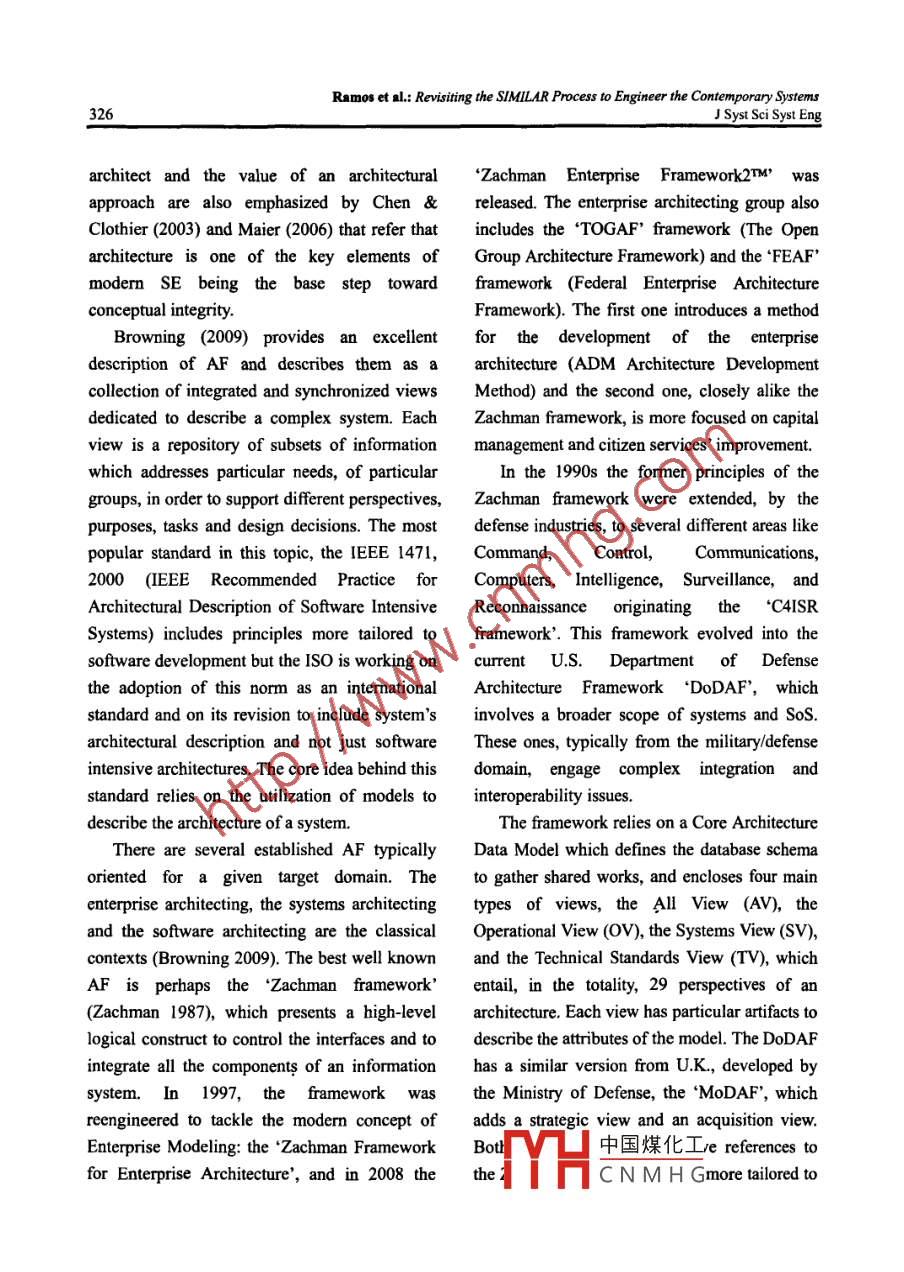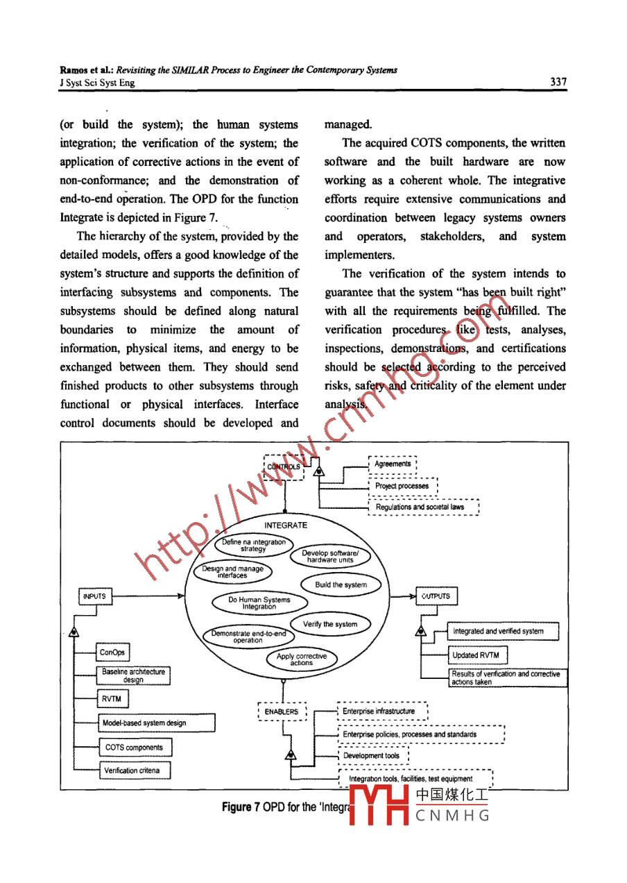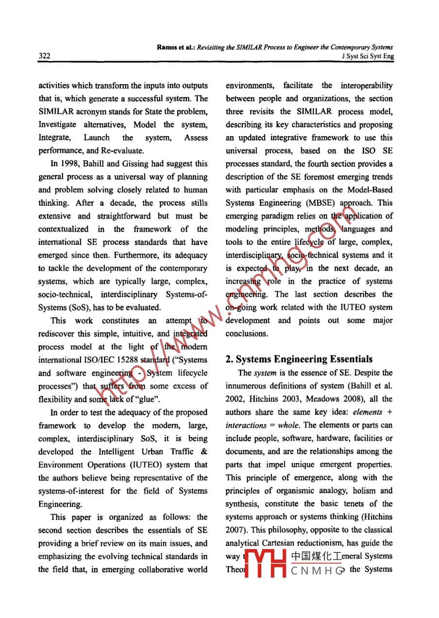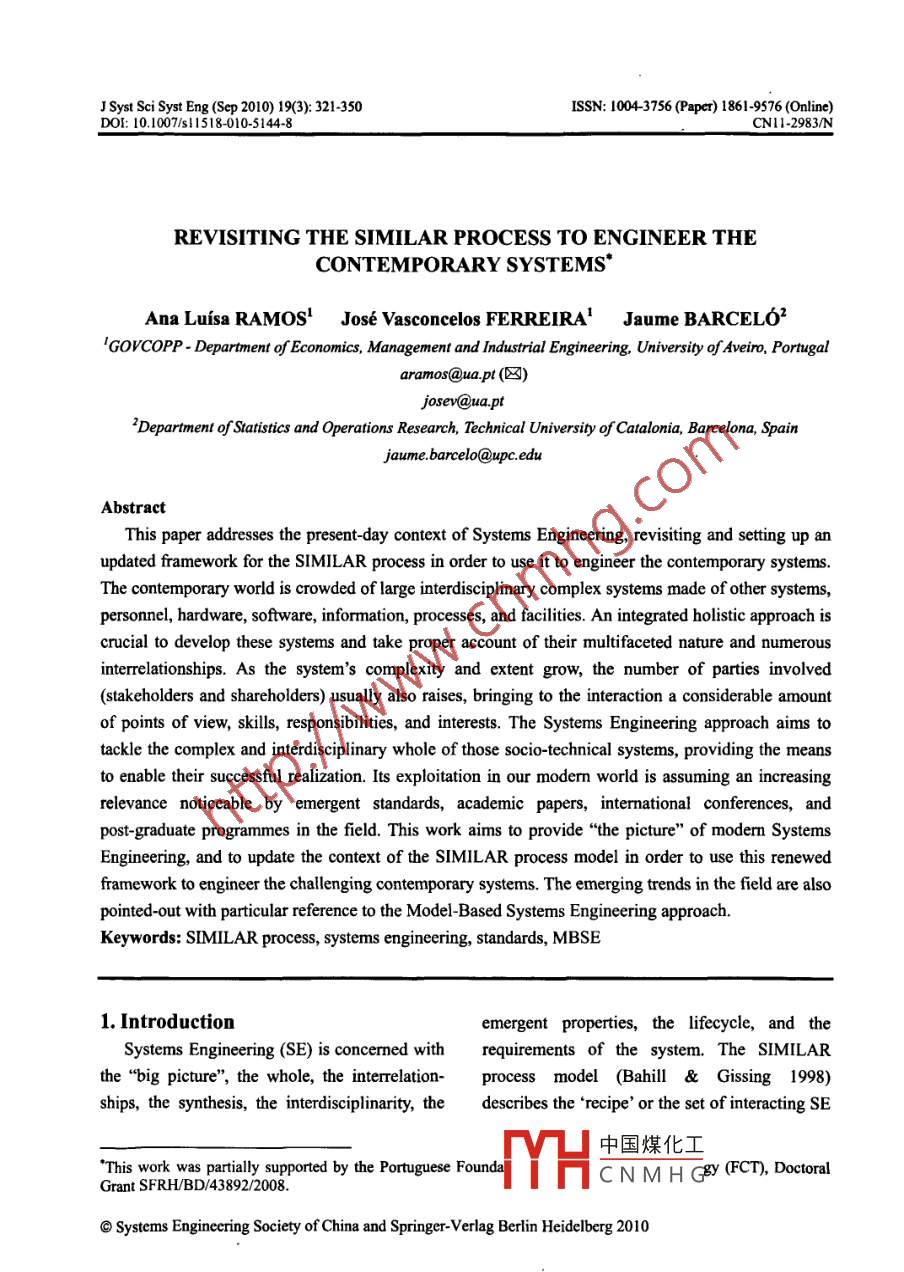J Syst Sci Syst Eng (Sep 2010) 19(3): 321-350ISSN: 1004-3756 (Paper) 1861-9576 (Online)DOI: 10.1007/s11518-010-5144-8CN11-2983/NREVISITING THE SIMILAR PROCESS TO ENCINEER THECONTEMPORARY SYSTEMS*Ana Luisa RAMOS'Jose Vasconcelos FERREIRA'Jaume BARCELO2'GOVCOPP- Department of Economics, Management and Industral Engineering, Universiy ofAveir, Portugalaramos@ua.pt (8)josev@ua.pt'Department of Statistics and Operations Research, Technical University ofCatalonia, Barcelona, Spainjaume.barcelo@upc.eduAbstractThis paper addresses the present-day context of Systems Engineering, revisiting and setting up anupdated framework for the SIMILAR process in order to use it to engineer the contemporary systems.The contemporary world is crowded of large interdisciplinary complex systems made of other systems,personnel, hardware, software, information, processes, and facilities. An integrated holistic approach iscrucial to develop these systems and take proper account of their multifaceted nature and numerousinterrelationships. As the system's complexity and extent grow, the number of parties involved(stakeholders and shareholders) usually also raises, bringing to the interaction a considerable amountof points of view, skills, responsibilities, and interests. The Systems Engineering approach aims totackle the complex and interdisciplinary whole of those socio-technical systems, providing the meansto enable their successful realization. Its exploitation in our modern world is assuming an increasingrelevance noticeable by emergent standards, academic papers, international conferences, andpost-graduate programmes in the field. This work aims to provide“the picture" of modern SystemsEngineering, and to update the context of the SIMILAR process model in order to use this renewedframework to engineer the challenging contemporary systems. The emerging trends in the field are alsopointed-out with particular reference to the Model-Based Systems Engineering approach.Keywords: SIMILAR process, systems engineering, standards, MBSE1. Introductionemergent properties, the lifecycle, and theSystems Engineering (SE) is concerned withrequirements of the system. The SIMILARthe“big picture", the whole, the interrelation-process model (Bahill & Gissing 1998)ships, the synthesis, the interdisciplinarity, thedescribes the 'recipe' or the set of interacting SE中國(guó)煤化工*This work was partially supported by the Portuguese Foundal.MYHCN M H G&Y (FCD, DoctralGrant SFRH/BD/43892/2008.⑥Systems Engineering Society of China and Springer-Verlag Berlin Heidelberg 2010Ramos et aL: Revisiting the SIMILAR Process to Engineer the Contemporary Systems322J Syst Sci Syst Engactivities which transform the inputs into outputsenvironments, facilitate the interoperabilitythat is, which generate a successful system. Thebetween people and organizations, the sectionSIMILAR acronym stands for State the problem,three revisits the SIMILAR process model,Investigate altermatives, Model the system,describing its key characteristics and proposingIntegrate, Launchthesystem, Assessan updated integrative framework to use thisperformance, and Re-evaluate.universal process, based on the ISO SEIn 1998, Bahill and Gissing had suggest thisprocesses standard, the fourth section provides ageneral process as a universal way of planningdescription of the SE foremost emerging trendsand problem solving closely related to humanwith particular emphasis on the Model-Basedthinking. After a decade, the process stillsSystems Engineering (MBSE) approach. Thisextensive and straightforward but must beemerging paradigm relies on the application ofcontextualized in the framework of themodeling principles, methods, languages andintermational SE process standards that havetools to the entire lifecycle of large, complex,emerged since then. Furthermore, its adequacyinterdisciplinary, socio-technical systems and itto tackle the development of the contemporaryis expected to play, in the next decade, ansystems, which are typically large, complex,increasing role in the practice of systemssocio-technical, interdisciplinary Systems-of-engineering. The last section describes theSystems (SoS), has to be evaluated.on-going work related with the IUTEO systemThis work constitutes an attempt todevelopment and points out some majorrediscover this simple, intuitive, and integratedconclusions.process model at the light of the modermintermational ISO/IEC 15288 standard (“Systems2. Systems Engineering Essentialsand software engineering - System lifecycleThe system is the essence of SE. Despite theprocesses") that suffers from some excess ofinnumerous definitions of system (Bahill et al.flexibility and some lack of“glue".2002, Hitchins 2003, Meadows 2008), all theIn order to test the adequacy of the proposedauthors share the same key idea: elements +framework to develop the moderm, large,interactions = whole. The elements or parts cancomplex,interdisciplinary SoS, it is beinginclude people, software, hardware, facilities ordeveloped the Intelligent Urban Traffic 8documents, and are the relationships among theEnvironment Operations (IUTEO) system thatparts that impel unique emergent properties.the authors believe being representative of theThis principle of emergence, along with thesystems-of-interest for the field of Systemsprinciples of organismic analogy, holism andEngineering.synthesis, constitute the basic tenets of theThis paper is organized as follows: thesystems approach or systems thinking (Hitchinssecond section describes the essentials of SE2007). This philosophy, opposite to the classicalproviding a brief review on its main issues, andanalytical Cartesian reductionism, has guide theemphasizing the evolving technical standards inway 1中國(guó)煤化I eneral Systemsthe field that, in emerging collaborative worldTheot|YHC NMH G the SystemsRamos et aL: Revisiting the SIMILAR Process to Engineer the Contemporany SystemsJ Syst Sci Syst Eng323Science.old Systems Engineering" (o