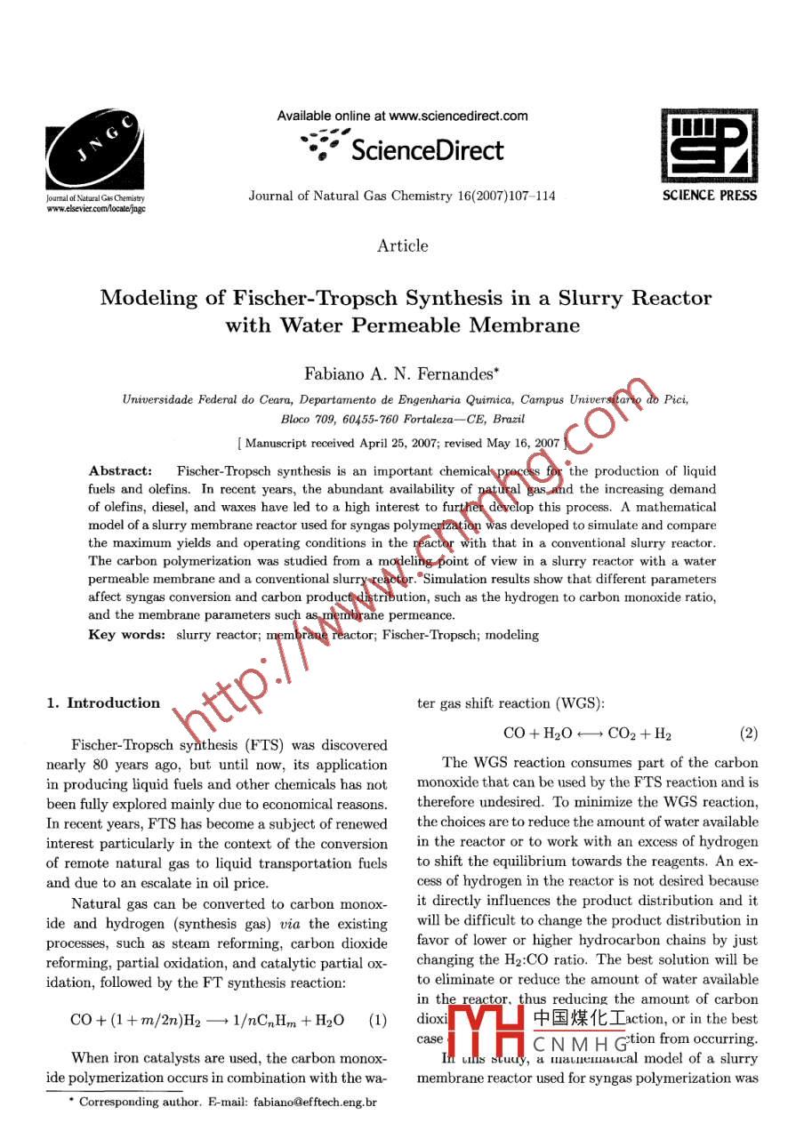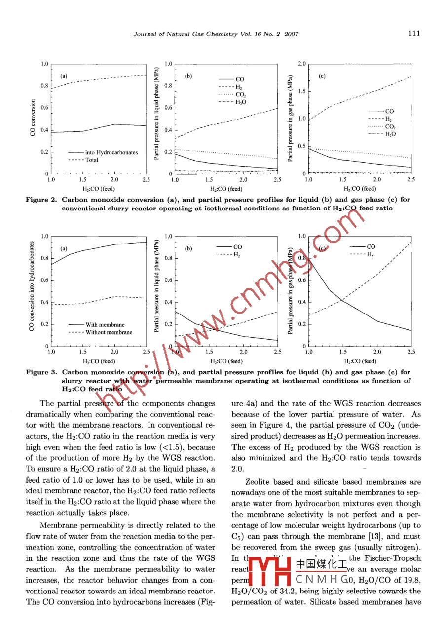 Available online at www.sciencedirect.comScienceDirect罵PJournal of NaturnlGs CemistyJournal of Natural Gas Chemistry 16(2007)107- 114SCIENCE PRESSArticleModeling of Fischer- Tropsch Synthesis in a Slurry Reactorwith Water Permeable MembraneFabiano A. N. Fernandes*Universidade Federal do Ceara, Departamento de Engenharia Quimica, Campus Universitario do Pici,Bloco 709, 60455- 760 Fortaleza- CE, Brazil[ Manuscript received April 25, 2007; revised May 16, 2007 ]Abstract: Fischer -Tropsch synthesis is an important chemical process for the production of liquidfuels and olefins. In recent years, the abundant availability of natural gas and the increasing demandof olefins, diesel, and waxes have led to a high interest to further develop this process. A mathematicalmodel of a slurry membrane reactor used for syngas polymerization was developed to simulate and comparethe maximum yields and operating conditions in the reactor with that in a conventional slurry reactor.The carbon polymerization was studied from a modeling point of view in a slurry reactor with a waterpermeable membrane and a conventional slurry reactor. Simulation results show that different parametersaffect syngas conversion and carbon product distribution, such as the hydrogen to carbon monoxide ratio,and the membrane parameters such as merbrane permeance.Key words: slurry reactor; membrane reactor; Fischer-Tropsch; modeling1. Introductionter gas shift reaction (WGS):CO+H2O←→CO2+H2Fischer-Tropsch synthesis (FTS) was discoverednearly 80 years ago, but until now, its applicationThe WGS reaction consumes part of the carbonin producing liquid fuels and other chemicals has notmonoxide that can be used by the FTS reaction and isbeen fully explored mainly due to economical reasons.therefore undesired. To minimize the WGS reaction,In recent years, FTS has become a subject of renewedthe choices are to reduce the amount of water availableinterest particularly in the context of the conversionin the reactor or to work with an excess of hydrogenof remote natural gas to liquid transportation fuelsto shift the equilibrium towards the reagents. An ex-and due to an escalate in oil price.cess of hydrogen in the reactor is not desired becauseNatural gas can be converted to carbon monox-it directly influences the product distribution and itide and bydrogen (synthesis gas) via the existingwill be difficult to change the product distribution inprocesses, such as steam reforming, carbon dioxidefavor of lower or higher hydrocarbon chains by justreforming, partial oxidation, and catalytic partial ox-changing the H2:CO ratio. The best solution will beidation, followed by the FT synthesis reaction:to eliminate or reduce the amount of water availablein the reactor. thus reducing the amount of carbonCO+(1 + m/2n)H2-→1/nCnHm +H20 (1dioxi中國煤化工action, or in the bestcaseYHC N M H Gtion from ocurring.When iron catalysts are used, the carbon monox-In uls btuy, a lliieliaiucal model of a slurryide polymerization occurs in combination with the wa-membrane reactor used for syngas polymerization was* Corresponding author. E-mail: fabiano@efftech.eng.br108Fabiano A. N. Fernandes / Journal of Natural Gas Chemistry Vol. 16 No.2 2007developed and the carbon monoxide polymerizationvan der Laan et al. [5], Maretto and Krishna [6],was studied from a modeling point of view in a slurryand Krishna and Sie [7]. To this basic mathematicalreactor with a water permeable membrane and in a model, the equations for water permeation throughconventional slury reactor, comparing the maximumthe membrane were added and studied. The basicyields and operating conditions in both reactors.assumptions made for the reactor were: steady-stateoperation, isothermal conditions, large bubbles flow2. Membrane reactorin plug flow regime due to its velocity, constant slurryvelocity, hydrocarbon products in the gas and in theThe bubble column slurry reactor consists of aliquid phases assumed to be in equilibrium at the re-tower where the synthesis gas and liquid phase (liq-actor outlet, negligible mass and heat transfer resis-uid+catalyst) are fed through the bottom of the col-tances between the catalyst and the liquid, the gas-umnn. The liquid phase is fed at very low velocitiesliquid mass transfer limitation located in the liquidso that the liquid products can be continuously with-phase, intrinsic kinetics for Fischer-Tropsch synthesisdrawn. The synthesis gas goes through the reactor asand water-gas shift reactions.bubbles and exchanges mass with the liquid phase. InThe kinetic model for the FTS reaction on an irona commercial process, the velocity of the gas is highcatalyst and for the WGS reaction are given as:enough to produce large and small bubbles, and thereactor operates at a heterogeneous regime or churn-Rprs =k.Pco. PR:5(3)turbulent flow regime. The slurry reactor is also pro-(1 +a. Pco +b. Poo2)2vided with thousands of cooling tubes or cooling coils,with a heat exchange surface that can be as high asPco2 : Pr20 m2 per m3 of the reactor [1]. The cooling tubeshwes. ( Pco : Pr2oK()are used to remove the heat released by the FTS reac-RwGs =.(Pco + K2. PH2o)2tion and to control the reactor temperature, ensuringthe isothermal conditions inside the reactor, in spiteThe gas-phase mass balance for component i inof the high heat of reaction (△H=- 170 kJ/mol CO)the large bubbles and the gas phase balance for com-[2-5].ponent i in the small bubbles are:Water permeable membrane tubes can also be in-serted in the reactor to remove the water produced bythe FTS reaction and to prevent the WGS reactiond(Uc - Upr).C,c+ (kL .a).Cic=(from occurring. A dry sweep gas flows continuouslydH|mei -C.inside the membrane tube and water permeates to the(5)inner tube through the membrane. A schematic rep-resentation of the membrane is provided in Figure 1.UpF「C%.cH(Ct,G -Ci,c)=(kx.a)片mgt -Ci,L(6)The mass balance for component i in the com-pletely mixed liquid phase is:HH2CH (kr.a),c .HI( mGLMembrane