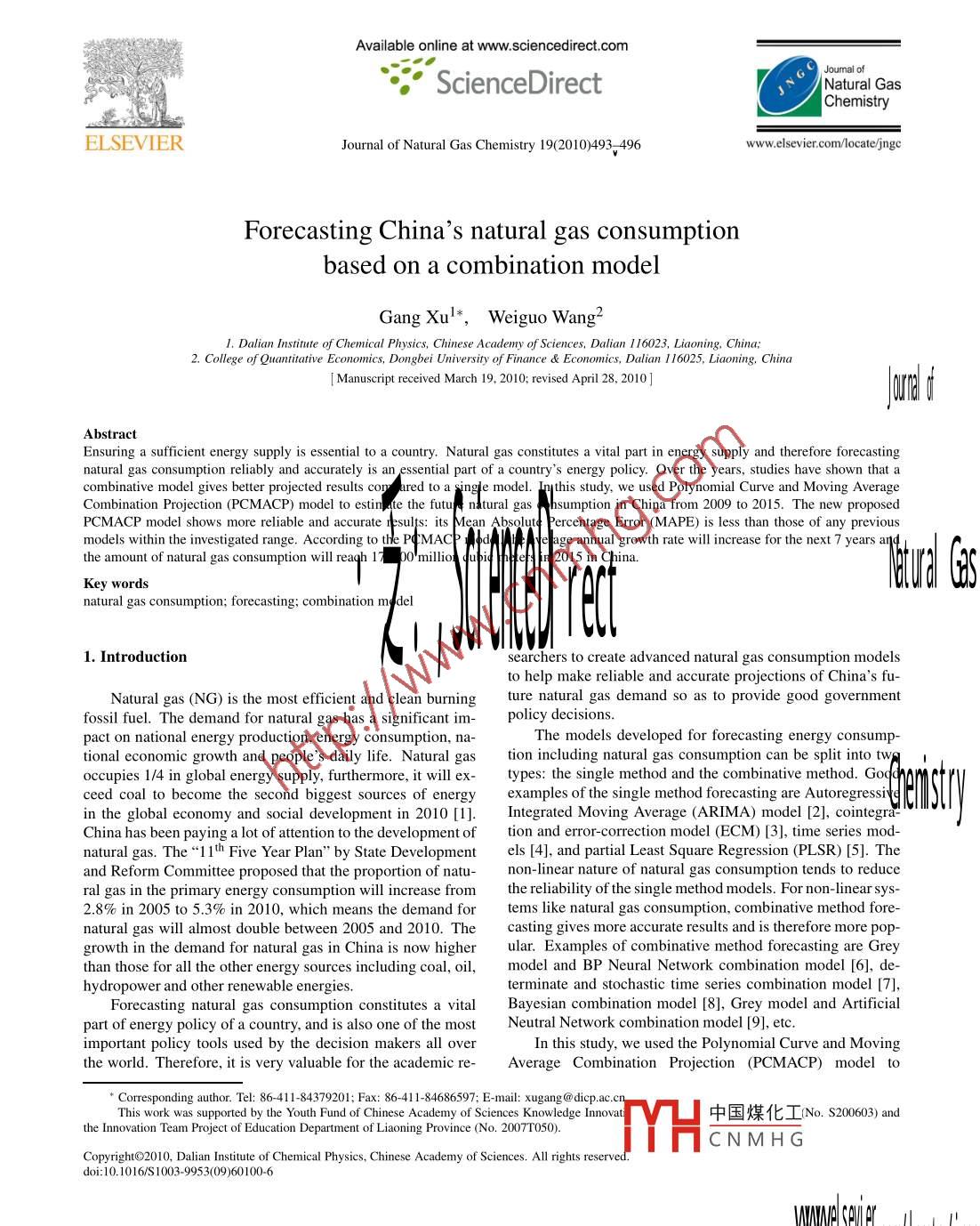 Availableonlineatwww.sciencedirect.comJoumal ofScience DirectNatural GasChemistryELSEVIERJournal of Natural Gas Chemistry 19(2010)493-496Forecasting China's natural gas consumptionbased on a combination modelGang Xu*, Weiguo Wang1. Dalian Institute of Chemical Physics, Chinese Academy of Sciences, Dalian 116023, Liaoning, China.2. College of Quantitative Economics, Dongbei University of Finance Economics, Dalian 116025, Liaoning, ChinaI Manuscript received March 19, 2010: revised April 28, 2010 1AbstractEnsuring a sufficient energy supply is essential to a country. Natural gas constitutes a vital part in energy supply and therefore forecastingnatural gas consumption reliably and accurately is an essential part of a countrys energy policy. Over the years, studies have shown that acombinative model gives better projected resultsed tomodel. Inthis study, we used Polynomial Curve and Moving AverageCombination Projection(PCMACP)model to esturalumption in China from 2009 to 2015. The new proposedPCMACP model shenore reliable and accurateItscentage Error (MAPE) is less than those of anymodels within the investigated range. accordingge annual growth rate will increase for the next 7 yearsthe amount of natural gas consunn will reagh 17 b0'millio2015 in CrKey wordsatural gas consumption; forecasting; combination mydel1. Introductionsearchers to create advanced natural gas consumption modelsto help make reliable and accurate projections of China,s fufossil fuel. The demand for natural gas has a significant im- policy decisione demand so as to provideNatural gas(NG)is the most efficient and clean burninggood governmentpact on national energy production, energy consumption, naThe models developed for forecasting energy consumptional economic growth and people's daily life. Natural gas tion including natural gas consumption can be split into tw:occupies 1/4 in global energy supply, furthermore, it will ex- types: the single method and the combinative method. Goddnaceed coal to become the second biggest sources of energy examples of the single method forecasting are Autoregresin the global economy and social development in 2010 [1]. Integrated Moving Average(ARIMA)model [2], cointegraChina has been paying a lot of attention to the development of tion and error-correction model (ECM)[3], time series modnatural gas. The"11th Five Year Plan"by State Development els [4], and partial Least Square Regression(PLSR)[5]. Theand Reform Committee proposed that the proportion of natu- non-linear nature of natural gas consumption tends to reduceral gas in the primary energy consumption will increase from the reliability of the single method models. For non-linearsys2.8% in 2005 to 5.3% in 2010, which means the demand for tems like natural gas consumption, combinative method fore-natural gas will almost double between 2005 and 2010. The casting gives more accurate results and is therefore more popgrowth in the demand for natural gas in China is now higher ular. Examples of combinative method forecasting are Greythan those for all the other energy sources including coal, oil, model and BP Neural Network combination model [6], dehydropower and other renewable energiesterminate and stochastic time series combination model [71Forecasting natural gas consumption constitutes a vital Bayesian combination model 181, Grey model and Artificialpart of energy policy of a country, and is also one of the most Neutral Network combination model [9],etcimportant policy tools used by the decision makers all overIn this study, we used the Polynomial Curve and Movingthe world. Therefore, it is very valuable for the academic re- Average Combination Projection (PCMACP)model toCorresponding author. Tel: 86-411-84379201; Fax: 86-411-84686597: E-mail: xugang@dicp acThis work was supported by the Youth Fund of Chinese Academy of Sciences Knowledge Innovat中國(guó)煤化工No.S2060andthe Innovation Team Project of Education Department of Liaoning Province(No. 2007T050)CNMHGCopyright@2010, Dalian Institute of Chemical Physics, Chinese Academy of Sciences. All rights reservedoi:10.1016S1003-9953(09)60100-6494Gang Xu et al Journal of Natural Gas Chemistry Vol. 19 No 5 201060enatural gas consumption in China based on histori- curve. Therefore, based on the trend extrapolation theory, weseries. The consumption data for natural gas cov- can establish the 2nd order Polynomial Curve model of naturers the periods 1995-2008. The 1995-2008 data are ob- gas consumption as followstained from Chinese Statistics Year book from 1996 to 2009and 2007-2008 data are used to evaluate the prediction abil-Gas=a+Bt+ot+sity. The rest of this paper is organized as follows: Section where, time is an independent variable, t= 1, 2,12 and"gas2 describes the used methodology; Section 3 presents the(gas consumption) is a dependent variable. We can also useforecasted results and compared them with the actual data ordinary least squares to estimate the parameter as follows(2007-2008)and those from previous studies; and the final5ooon describes the findings from the work and draws theGas=204.6630-18.33723t+3917498t2(2)Onclusions(12.99918)(-3.293087)(9.394953)[0.0000[0.0093]0.00002. MethodsThe figures in parentheses are t statistics and the figures in2. 1. Polynomial Curve modelthe square brackets are p values. Durbin-Watson statistic1.541523 and the adjusted R reaches 0.985368, which showAs one of the trend extrapolation methods, Polynomial that there is a very good fit between the predicted results of4@0e model is used widely and efficiently. As new meththe model and the original datatrend extrapolation methods were developed and detailedThe predicted results obtained by the 2 OPC are givenvaluations of forecast accuracy and utility were conducted. in Table 1. As seen from the table, thebsolute percentage error(MAPE) from 1995 to 2006 is 4.41%0, whichmethods particularly useful for small-area projections. The forecasting errors, But the 2nd opC only simulates the trenddefi
