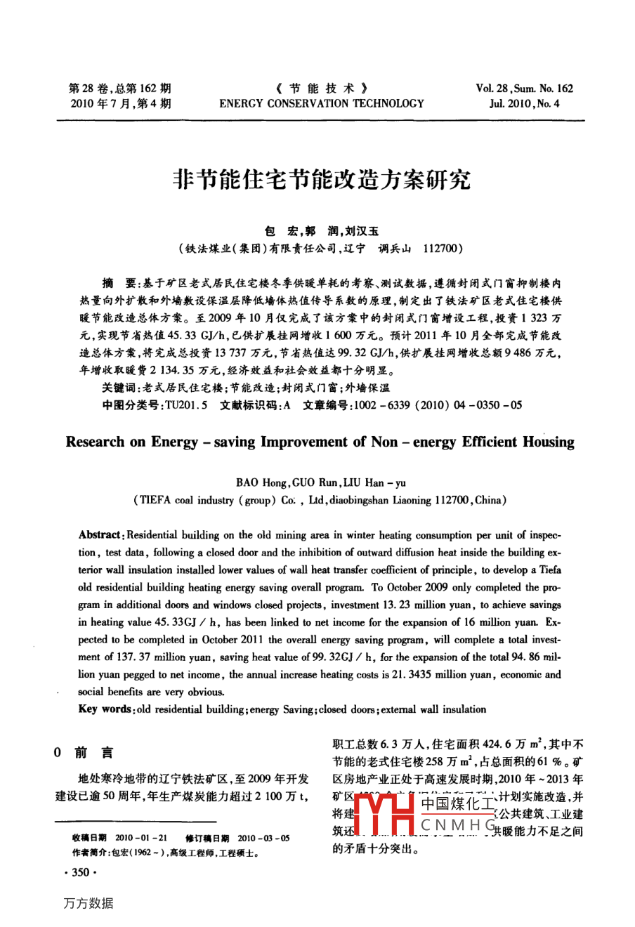 第28卷,總第162期〈節(jié)能技術(shù)》Vol 28 Sum. No, 1622010年7月,第4期ENERGY CONSERVATION TECHNOLOGYul. 2010. No. 4非節(jié)能住宅節(jié)能改造方案研究包宏,郭潤,劉漢玉(鐵法煤業(yè)(集團(tuán))有限責(zé)任公司,遼寧調(diào)兵山112700)摘要:基于礦區(qū)老式居民住宅樓冬季供暖單耗的考察、測試數(shù)據(jù),遵循封閉式門窗抑制樓內(nèi)熱量向外擴(kuò)散和外墻敷設(shè)保溫層降低墻體熱值傳導(dǎo)系數(shù)的原理,制定出了鐵法礦區(qū)老式住宅樓供暖節(jié)能改造總體方案。至2009年10月僅完成了該方案中的封閉式門窗增設(shè)工程,投資1323萬元,實(shí)現(xiàn)節(jié)省熱值45.33CJ/h,已供擴(kuò)展掛網(wǎng)增收1600萬元。預(yù)計(jì)2011年10月全部完成節(jié)能改造總體方案,將完成總投資13737萬元,節(jié)省熱值達(dá)9.32ωJh,供擴(kuò)展掛網(wǎng)增收總額9486萬元,年增收取暖費(fèi)2134.35萬元,經(jīng)濟(jì)效益和社會效益都十分明顯。關(guān)鍵詞:老式居民住宅樓;節(jié)能改造;封閉式門窗;外墻保溫中圖分類號:TU201.5文獻(xiàn)標(biāo)識碼:A文章編號:1002-6339(2010)04-0350-0Research on Energy -saving Improvement of Non-energy Efficient HousingBAO Hong, GUO Run, LIU Han-yu(TIEFA coal industry(group )Co., Ltd, diaobingshan Liaoning 112700, China)Abstract: Residential building on the old mining area in winter heating consumption per unit of inspec-tion, test data, following a closed door and the inhibition of outward diffusion heat inside the building exterior wall insulation installed lower values of wall heat transfer coefficient of principle, to develop a Tiefaold residential building heating energy saving overall program. To October 2009 only completed the pro-gram in additional doors and windows closed projects, investment 13. 23 million yuan, to achieve savingsin heating value 45. 33GJ/h, has been linked to net income for the expansion of 16 million yuan. Expected to be completed in October 2011 the overall energy saving program, will complete a total investment of 137. 37 million yuan, saving heat value of 99. 32GJ/h, for the expansion of the total 94. 86 mil-lion yuan pegged to net income, the annual increase heating costs is 21. 3435 million yuan, economic andsocial benefits are very obvious.Key words: old residential building; energy Saving; closed doors; extemal wall insulation0前言職工總數(shù)63萬人,住宅面積424.6萬m2,其中不節(jié)能的老式住宅樓258萬m2,占總面積的61%。礦地處寒冷地帶的遼寧鐵法礦區(qū),至2009年開發(fā)區(qū)房地產(chǎn)業(yè)正處于高速發(fā)展時期,2010年~2013年建設(shè)已逾50周年,年生產(chǎn)煤炭能力超過2100萬t,礦區(qū)中國煤化工計(jì)劃實(shí)漉改造并將建公共建筑、工業(yè)建收稿日期2010-01-21修訂稿日期2010-03-05筑CNMH共暖能力不足之間作者簡介:包宏(196-),高級工程師,工程碩士。的矛盾十分突出。350·為緩解上述矛盾,本文基于礦區(qū)老式居民住宅“封閉式對講機(jī)鐵門”,其余為開放式樓道單元門樓冬季供暖單耗考察、測試數(shù)據(jù)、從理論上論證,提口,毫無遮擋。336樓、37樓、338樓分別有20、出礦區(qū)非節(jié)能住宅樓實(shí)行大面積節(jié)能改造的總體方155個樓道窗戶破損,不能遮擋風(fēng)寒。案,為深入落實(shí)“節(jié)能減排”政策探索出了一條投人(2)測試方法。在被測試的3棟老式住宅的供少、收益多的有效途徑。暖支線中的進(jìn)熱管路上都安設(shè)1塊SN200型熱值1老式住宅樓冬季供暖單耗的考察與分析表,并通過金屬線連接回水管路。24h自動顯示住宅的供暖流量及供、回管路水溫差以及運(yùn)行時間,并在制定老式住宅樓節(jié)能改造方案之前,于2008在每天8點(diǎn)和16點(diǎn)記錄即時顯示的數(shù)據(jù),記錄后借年11月19日起對鐵法礦區(qū)6棟老式職工住宅樓進(jìn)助于AR350型測溫槍對各單元頂層及一層住戶的行了為期105天的能耗有關(guān)參數(shù)測試,獲得了大量室內(nèi)溫度進(jìn)行實(shí)測。當(dāng)實(shí)測發(fā)現(xiàn)不同單元的同一樓一手資料數(shù)據(jù),給分析、考察和計(jì)算老式住宅樓冬季層住戶室內(nèi)溫差超過2℃,則立即在進(jìn)戶端調(diào)整流熱量單耗奠定了基礎(chǔ)。量調(diào)節(jié)閥進(jìn)行平網(wǎng)工作,均衡分配熱流量。在同1.1樓梯門窗對住宅樓供熱單耗的影響樓層住戶室內(nèi)溫差不超2℃的條件下,所采集的數(shù)(1)房屋門窗狀況。被測試的老式住宅樓依次據(jù)為錄用數(shù)據(jù)。為336、337°、338樓。它們在結(jié)構(gòu)上基本相同,都(3)測試結(jié)果。在為期105天的有關(guān)能耗參數(shù)為6層樓,均有4個樓梯出口單元,墻體為普通粘土測試過程中,未發(fā)生過不同單元的同一樓層住戶室磚砌墻+砂漿水泥薄層。這3棟樓共有樓道單元門內(nèi)溫差超過2℃C的情形,每棟樓共采集210組數(shù)據(jù)???2個,其中,337樓1個樓道單元門口、338樓3其中,2008年12月18日采集的2組數(shù)據(jù)見表1個樓道單元門口,共計(jì)4個樓道單元門口安設(shè)了表1老式住宅樓能耗參數(shù)測試記錄號供暖累計(jì)流婕口家內(nèi)諶度,℃供回管路木溫差,℃供暖累計(jì)流量:m室內(nèi)溫度,℃供回管路水溫差,℃m956l18.610.4819631309.83考察被測試住宅的平均單耗和最冷天氣條件下Q—被測試住宅的累計(jì)供熱流量,m’;的單耗,以采集的數(shù)據(jù)為基礎(chǔ),用公式(1)計(jì)算求F——被測試住宅的建筑面積,m2得,其結(jié)果見表2。Δ——被測試