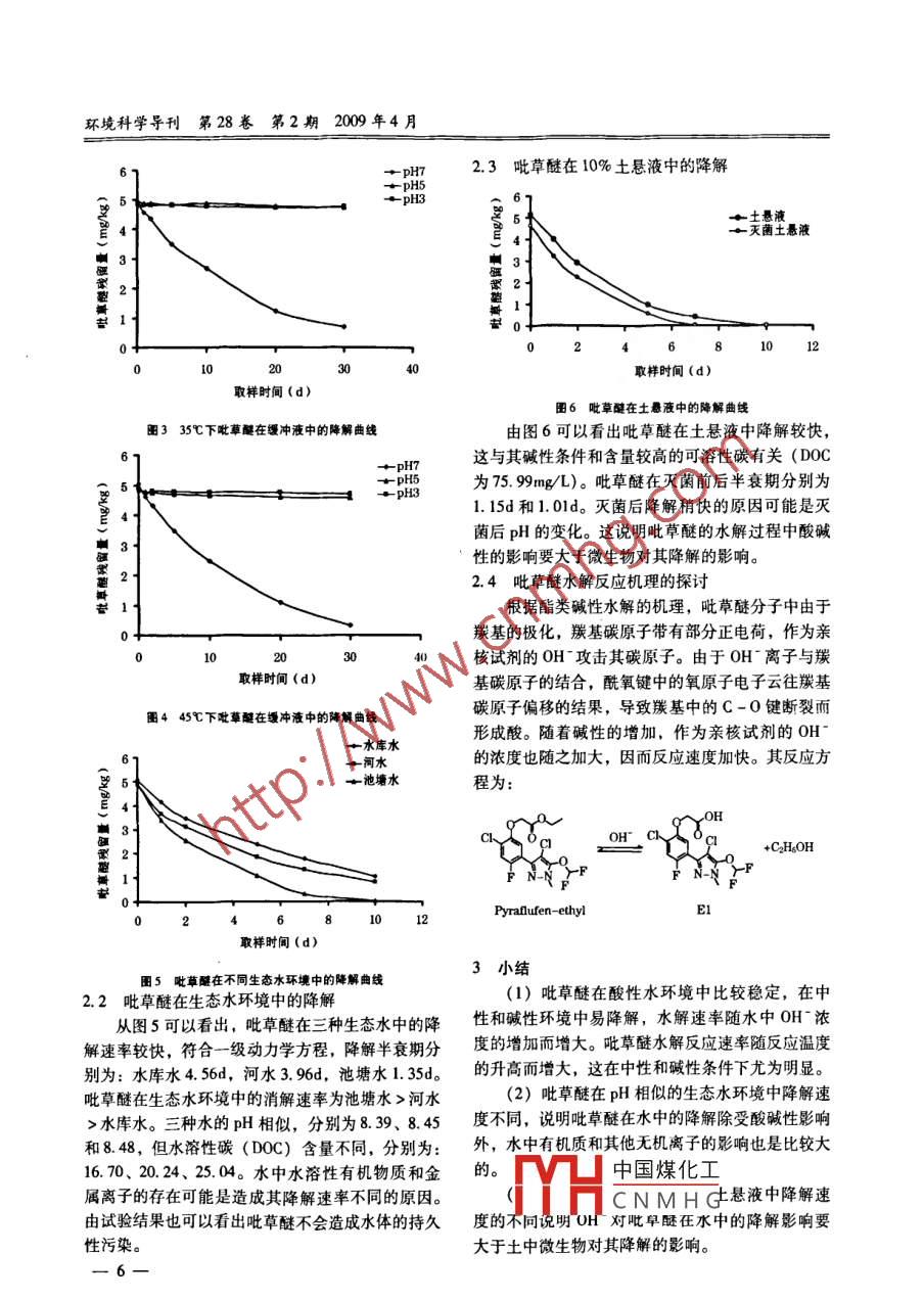環(huán)境科學(xué)導(dǎo)刊2009,28(2):4-7CN53-1205/ X ISSN1673-9655吡草醚水解動(dòng)力學(xué)的研究劉慧君,喬五忠,馮秀斌(北京北九環(huán)境技術(shù)實(shí)驗(yàn)室,北京102209)摘要:研究了吡草醚在不同p和溫度條件下的降解動(dòng)力學(xué)情況,以及在三種生態(tài)水樣和土懸液中的水解情況。結(jié)果表明,吡草醚在酸性水環(huán)境中比較穩(wěn)定,在中性和堿性環(huán)境中易降解;水解反應(yīng)速率隨水3%6d,池塘水135d;吡草醚在土懸液中降解較快,這與其堿性條件和含量較高的可溶性碳有疔反應(yīng)溫度的升高而增大;吡草醚在三種生態(tài)水中的降解速率較快,降解半衰期分別為:水庫(kù)水4.56d,關(guān)鍵詞:吡草醚;水解;動(dòng)力學(xué)中圖分類(lèi)號(hào):Ⅺ13文獻(xiàn)標(biāo)識(shí)碼:A文章編號(hào):1673-9655(2009)02-0004-04吡草醚( pyraflufen- ethyl)是取代苯基吡唑30.15%速草靈懸浮劑在我國(guó)取得登記,用于蘋(píng)果類(lèi)化合物,由日本 Nohyaku公司于1993年開(kāi)發(fā)的園、柑桔園和非耕地的雜草防除。為了全面了解吡芽后闊葉雜草除草劑。其化學(xué)結(jié)構(gòu)式為:草醚在環(huán)境中的持留、遷移、轉(zhuǎn)化情況,正確評(píng)價(jià)其環(huán)境安全性,研究吡草醚在不同水環(huán)境中的行為和歸宿是十分必要的。目前國(guó)內(nèi)外未檢索到公開(kāi)發(fā)OCHF2表的關(guān)于毗草醚環(huán)境行為方面的文章。本研究將為評(píng)價(jià)該藥劑使用后對(duì)不同水環(huán)境的安全性以及為合理使用農(nóng)藥提供科學(xué)依據(jù)C2HsOOCCHzO1材料與方法1.1儀器和試劑吡草醚是植物葉綠素生物合成過(guò)程中原卟啉原1100高效液相色譜儀、紫外檢測(cè)器(UVDe氧化酶(Poox)的抑制劑,通過(guò)植物細(xì)胞中原卟tcto)及色譜工作站(美國(guó) agilent公司);LRH啉原Ⅳ積累而發(fā)揮藥效。莖葉處理后,可被迅速吸250-G恒溫光照培養(yǎng)箱(廣東省醫(yī)療器械廠)收到植物組織中,使植物迅速壞死,或在剛光照射高壓滅菌鍋(浙江紹興醫(yī)療儀器廠); DELTA320下,使莖葉脫水干枯。小麥和 Galium rotund酸度計(jì)(瑞土梅特勒-托利多);N-1000旋轉(zhuǎn)蒸葉片對(duì)吡草醚沉積和吸收的數(shù)量以及兩者對(duì)其代謝發(fā)儀(日本 EYELA公司);SH-3(Ⅲ)循環(huán)水脫毒的效率的差異,是導(dǎo)致吡草醚選擇性的殺死多用真空泵(河南省予華儀器有限公司);LAC64Galium rotundus的主要原因23吡草醚主要用于電子分析太平(中國(guó)輕工業(yè)機(jī)械總公司常熟衡器防除闊葉雜草如豬殃殃、小野芝麻、繁縷、阿拉伯工業(yè)公司);12孔固相萃取裝置( Supelco公司);婆婆納、淡甘菊等,對(duì)豬殃殃(2-4葉期)活性Cs固相萃取柱,5ong/3ml(美國(guó) supelco公司)。尤佳。對(duì)禾谷類(lèi)作物具有很好的選擇性,雖有某些98.8%吡草醚標(biāo)準(zhǔn)品(日本農(nóng)藥株式會(huì)社)短暫的傷害,但對(duì)后茬作物無(wú)殘留影響,也作非選乙腈、鄰苯二甲酸氫鉀、磷酸二氫鉀、氫氧化鈉擇性除草劑。硼酸、氯化鉀等均為分析純(北京化學(xué)試劑公日本農(nóng)藥株式會(huì)社在我國(guó)于1998年取得原藥司);色譜純乙腈(DKMA公司);實(shí)驗(yàn)用水為二和2%吡草醚懸浮劑的登記,主要用于小麥田防治次蒸餾水和娃哈哈純凈水。闊葉雜草。200年吡草醚和草甘膦混配制劑12緩沖溶液的配制中國(guó)煤化工3、5:7、9的收稿日期:2008-08緩沖汽CNMHG器均在12℃高作者簡(jiǎn)介:劉慧君),女,碩士,主要從事環(huán)境毒理和環(huán)境行為方面的研究溫高壓下滅菌h,火菌后緩沖溶液需重新校正pH吡草醚水解動(dòng)力學(xué)的研究劉慧君1.3供試生態(tài)水樣2m,待HPLC分析。水庫(kù)水采于北京響潭水庫(kù),河水采于北京通州1.62液相色譜檢測(cè)條件區(qū)京密引水渠,池塘水采于北京郊區(qū)養(yǎng)色塘。水的色譜柱: GL Sciences Inc(250mm×4.6mm,pH分別為839、8.45、848;DOC分別為:5μm)C1柱;流速:lml/min;流動(dòng)相:乙腈:水16.70、20.24和25.04mg/L。=70:30(V/V);紫外檢測(cè)波長(zhǎng):207m;進(jìn)樣1.410%土懸液的制備量:20μ。吡草醚保留時(shí)間為12.7omin,采用外如,Og濕潤(rùn)土壤(凈重4g)和412m去離子水標(biāo)法峰面積定量。在該檢測(cè)條件下,吡草醚的最低加入100ml三角瓶中振蕩24h后過(guò)0.45μm膜得檢出量為1.6ng,最低檢出濃度為0.0lmg/L,水10%土懸液。其DOC為75.99mg/L。10%土懸液樣中添加不同濃度的吡草醚,每濃度設(shè)5次重復(fù)分成兩份,一份經(jīng)121℃高溫高壓滅菌1h,另一份平均回收率為912-101.6%,變異系數(shù)為29不滅菌。滅菌前后的pH分別為8.20和8.7855%,說(shuō)明該方法符合農(nóng)藥殘留分析的基本要1.5實(shí)驗(yàn)方法求1.5.1吡草醚在不同緩沖液溶液中不同溫度下的2結(jié)果與分析穩(wěn)定性21吡草醚在不同pH值緩沖溶液及不同溫度下取一定量的吡草醚乙腈標(biāo)準(zhǔn)溶液于250m棕色的化學(xué)水解容量瓶中,分別加入pH3.0、5.0、7.0、9.0的緩不同溫度下吡草醚在不同pH值緩沖溶液中的沖溶液至刻度,使水體中吡草醚的濃度為5mg/kg。降解曲線(xiàn)見(jiàn)圖1~4。助溶劑乙腈的含量為2%。每種pH條件兩次重復(fù)。將容量瓶塞緊,用封口膜封住,防止揮發(fā)。將容量瓶置于15、25、35、45℃的恒溫培養(yǎng)箱中,保持黑暗,進(jìn)行化學(xué)水解處理。按不同的時(shí)間分別取樣,每次取樣10ml,平行取樣2次。1.5.2生態(tài)水環(huá